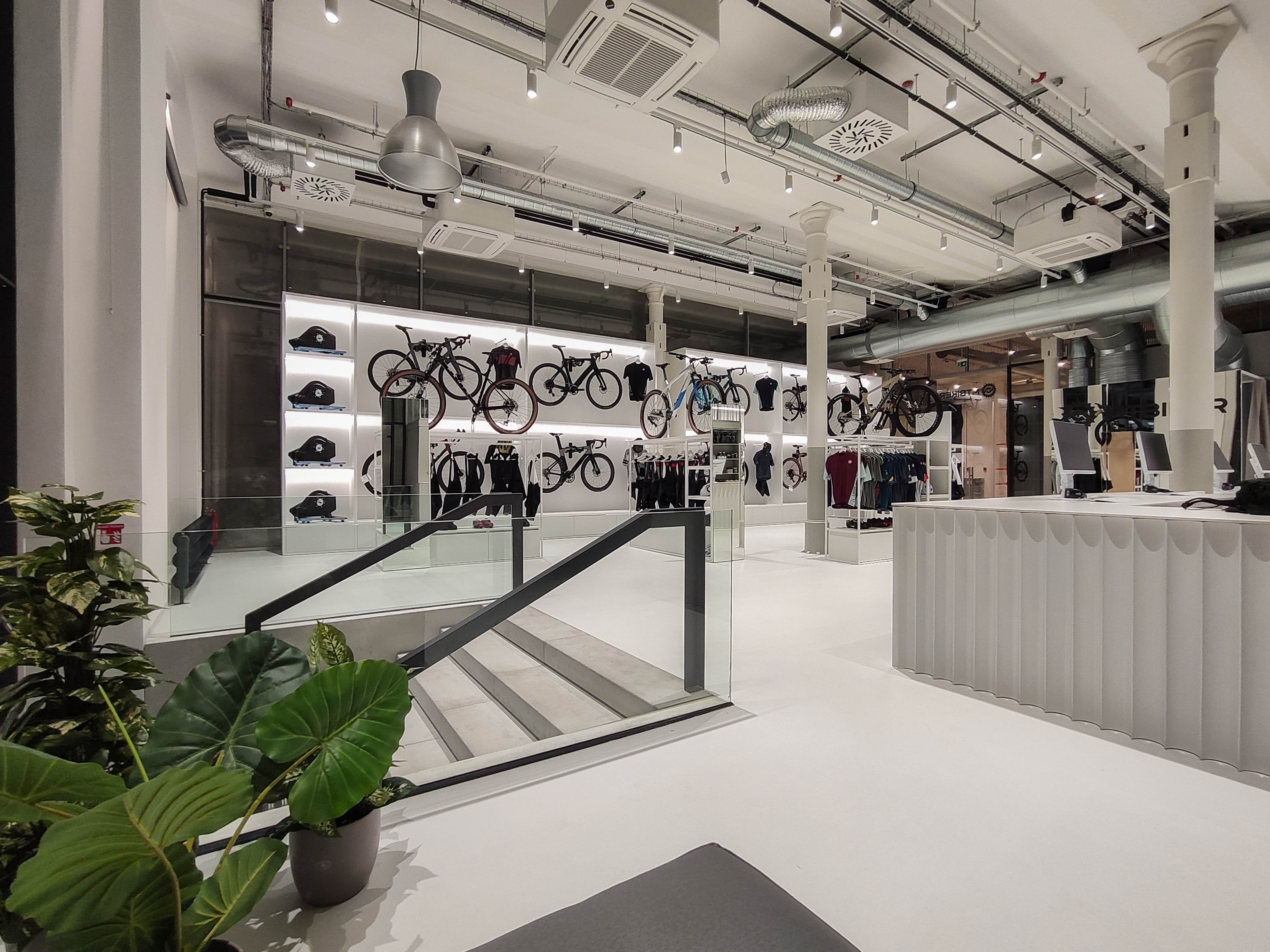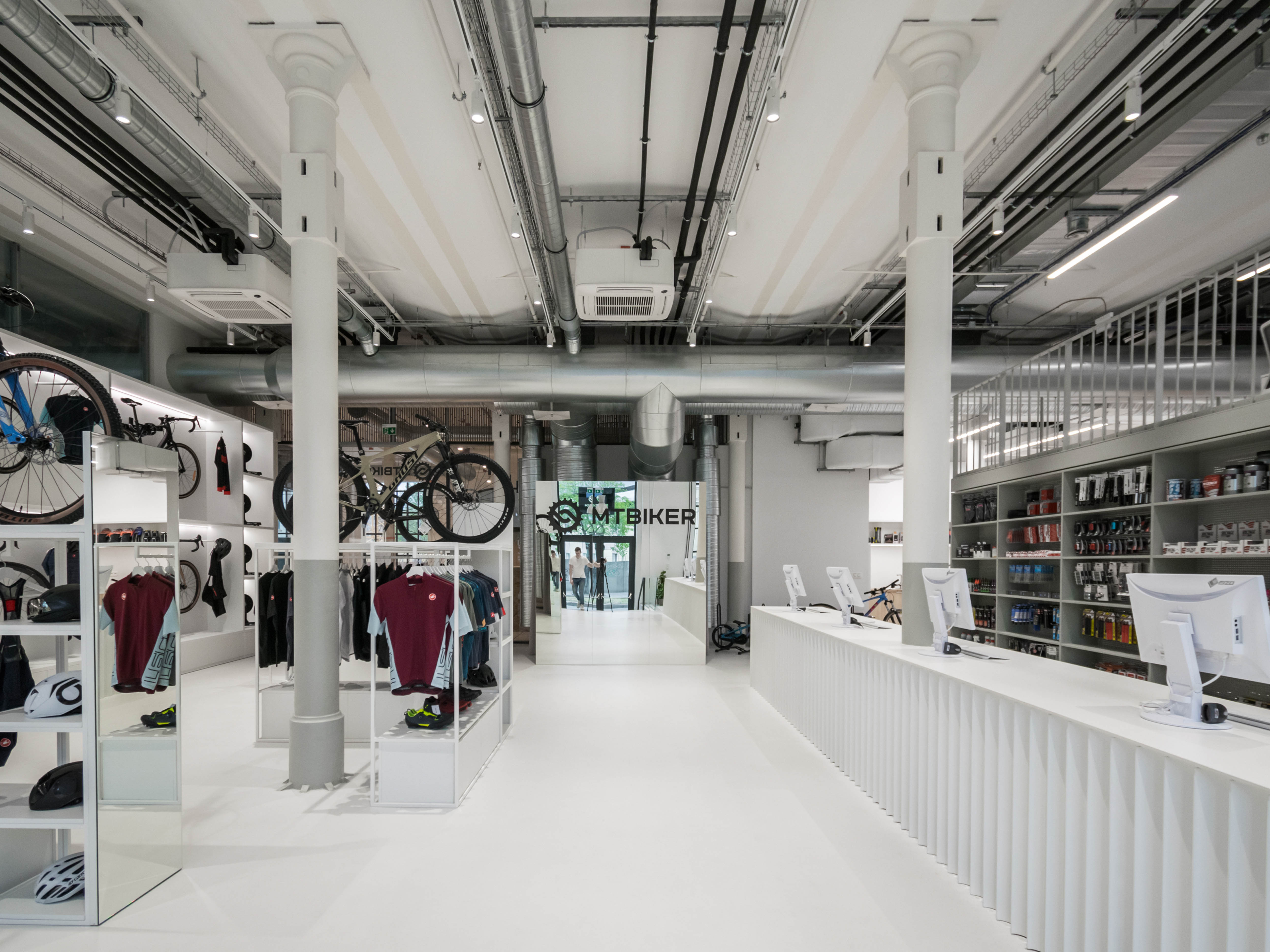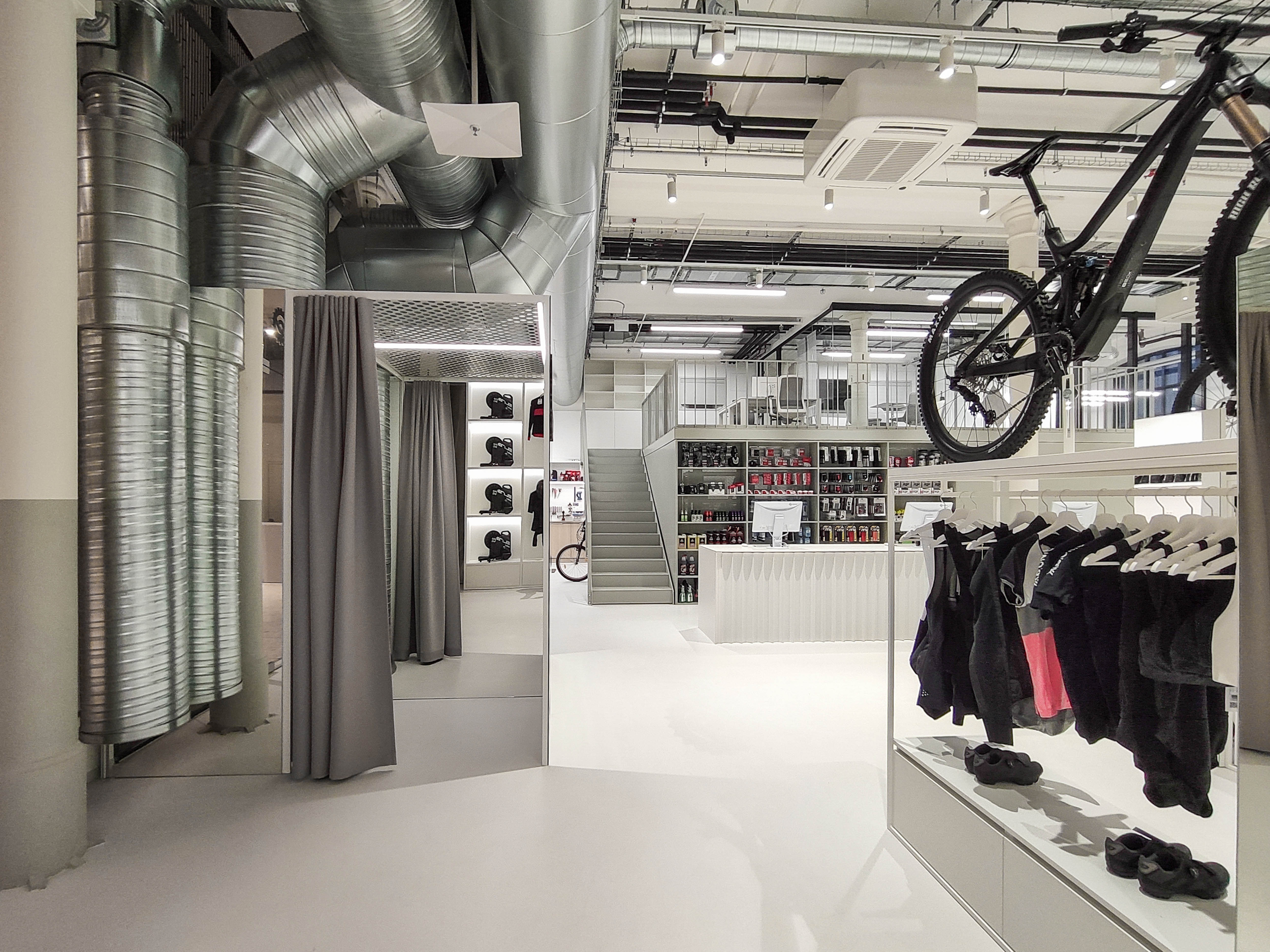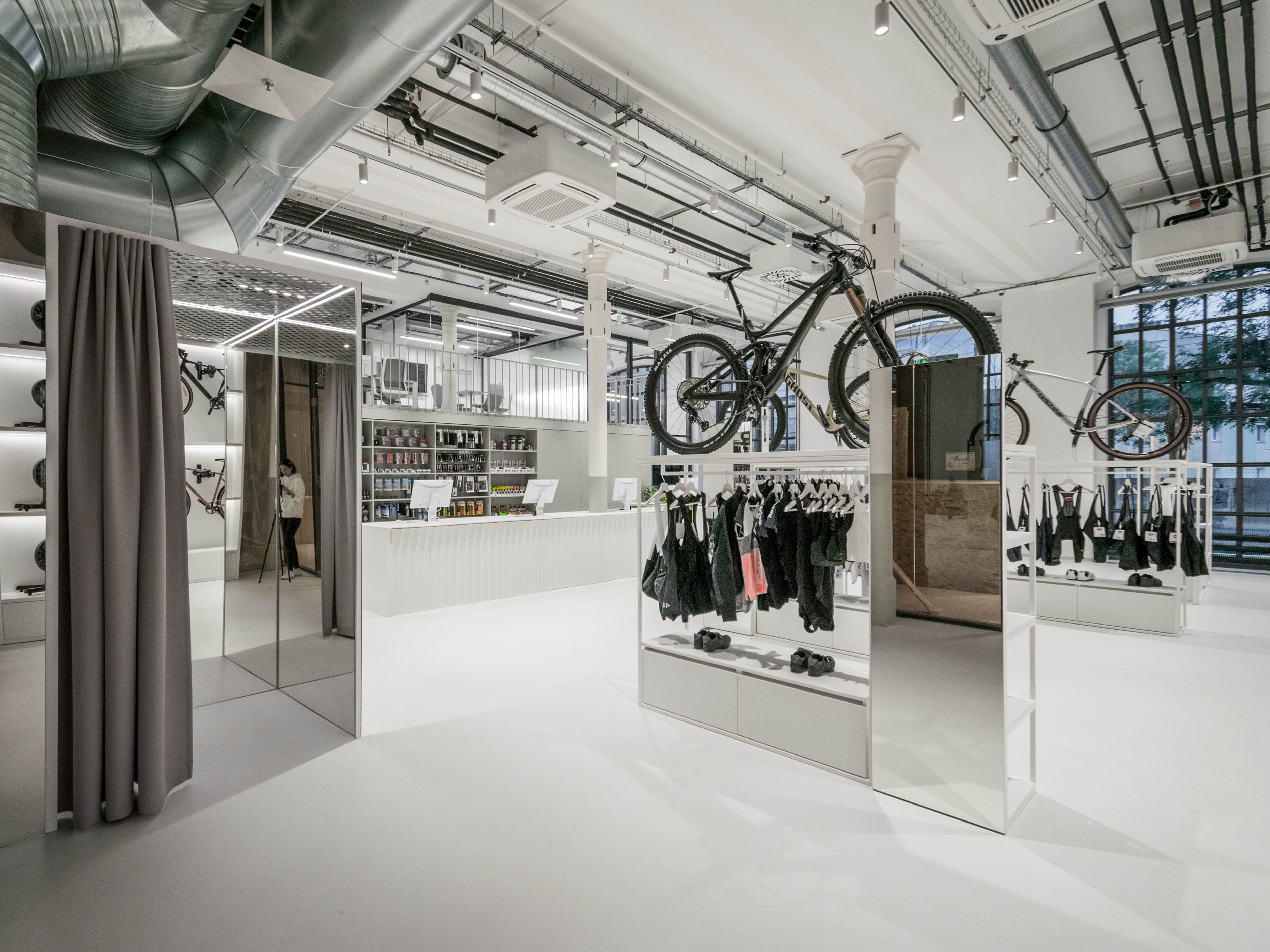 Prezentačná stena s bicyklami a modulárne stojany v priestore sú pre maximálne vyniknutie produktov biele. Priestor medzi servisom a predajňou dotvárajú zrkadlové skúšobné kabínky s logom viditeľným z ulice.
