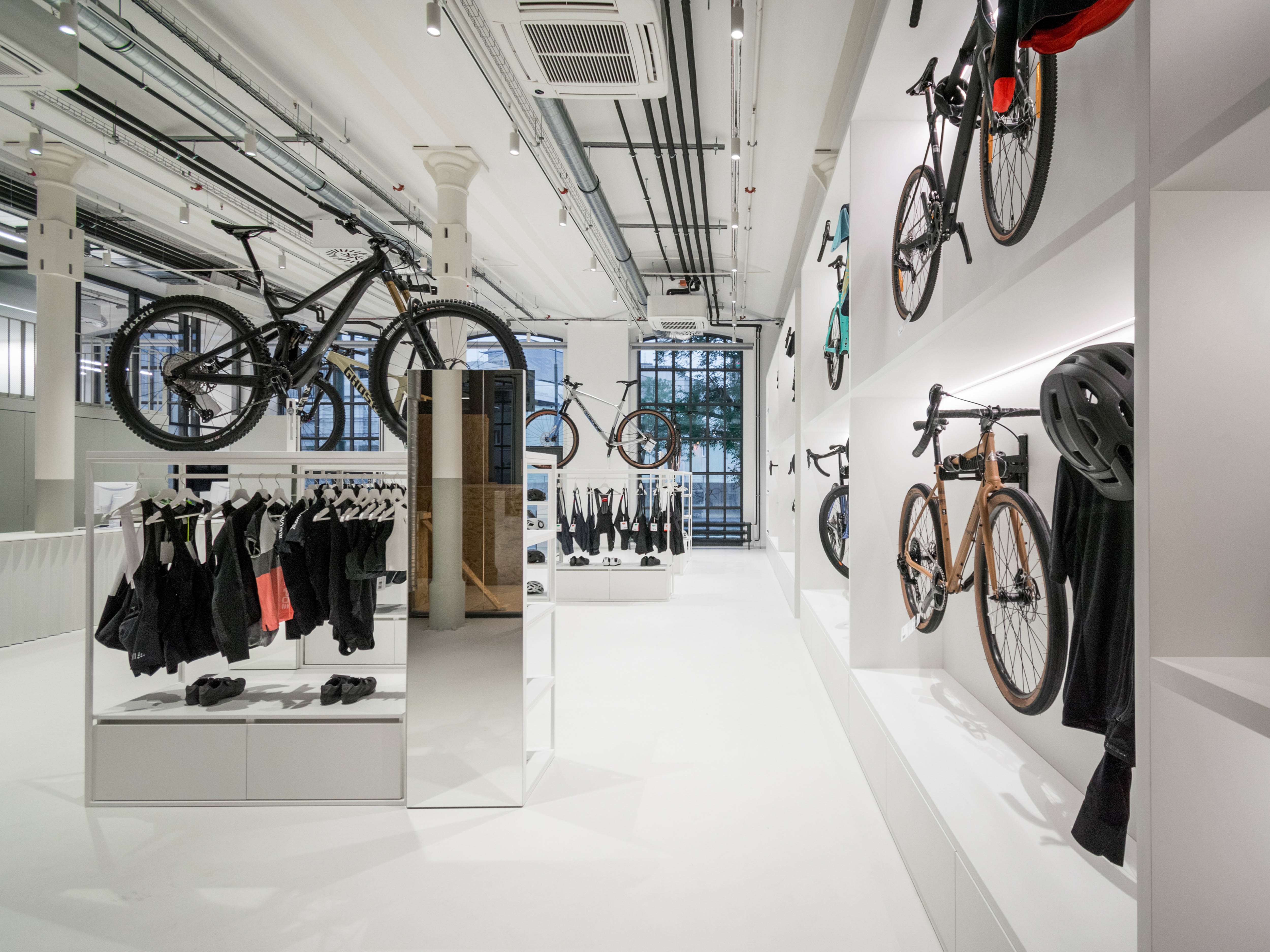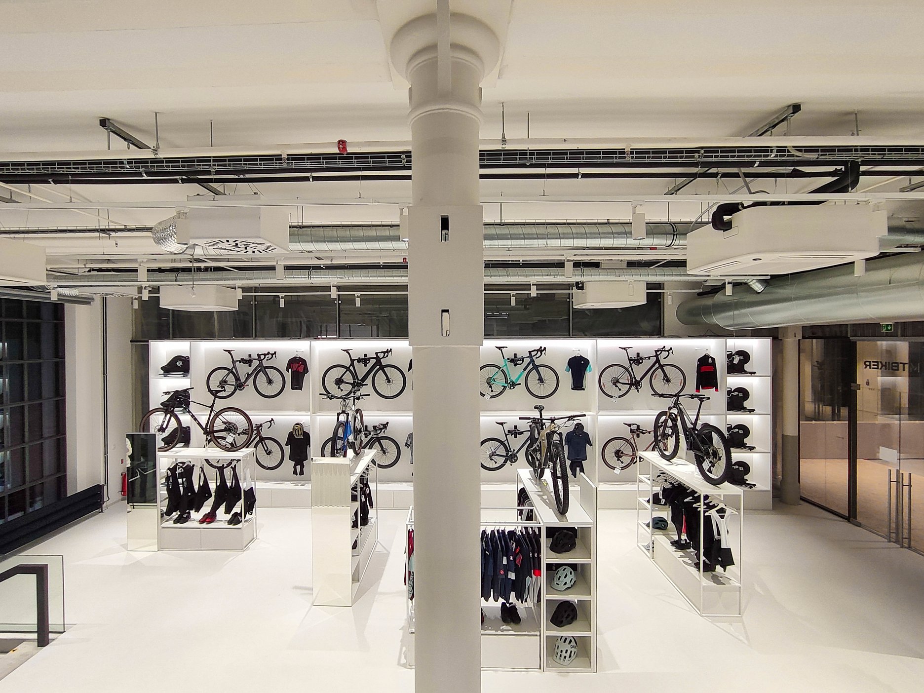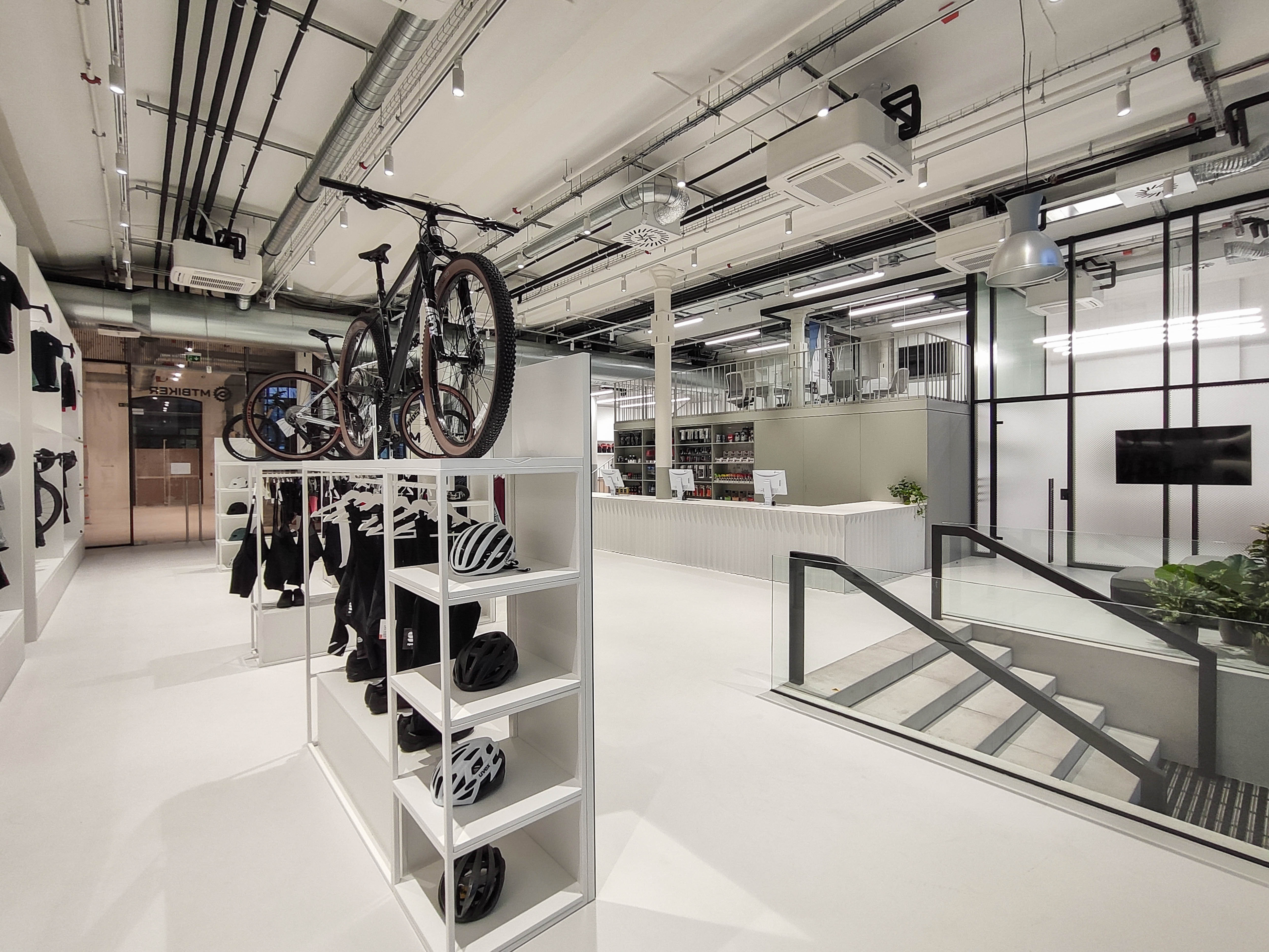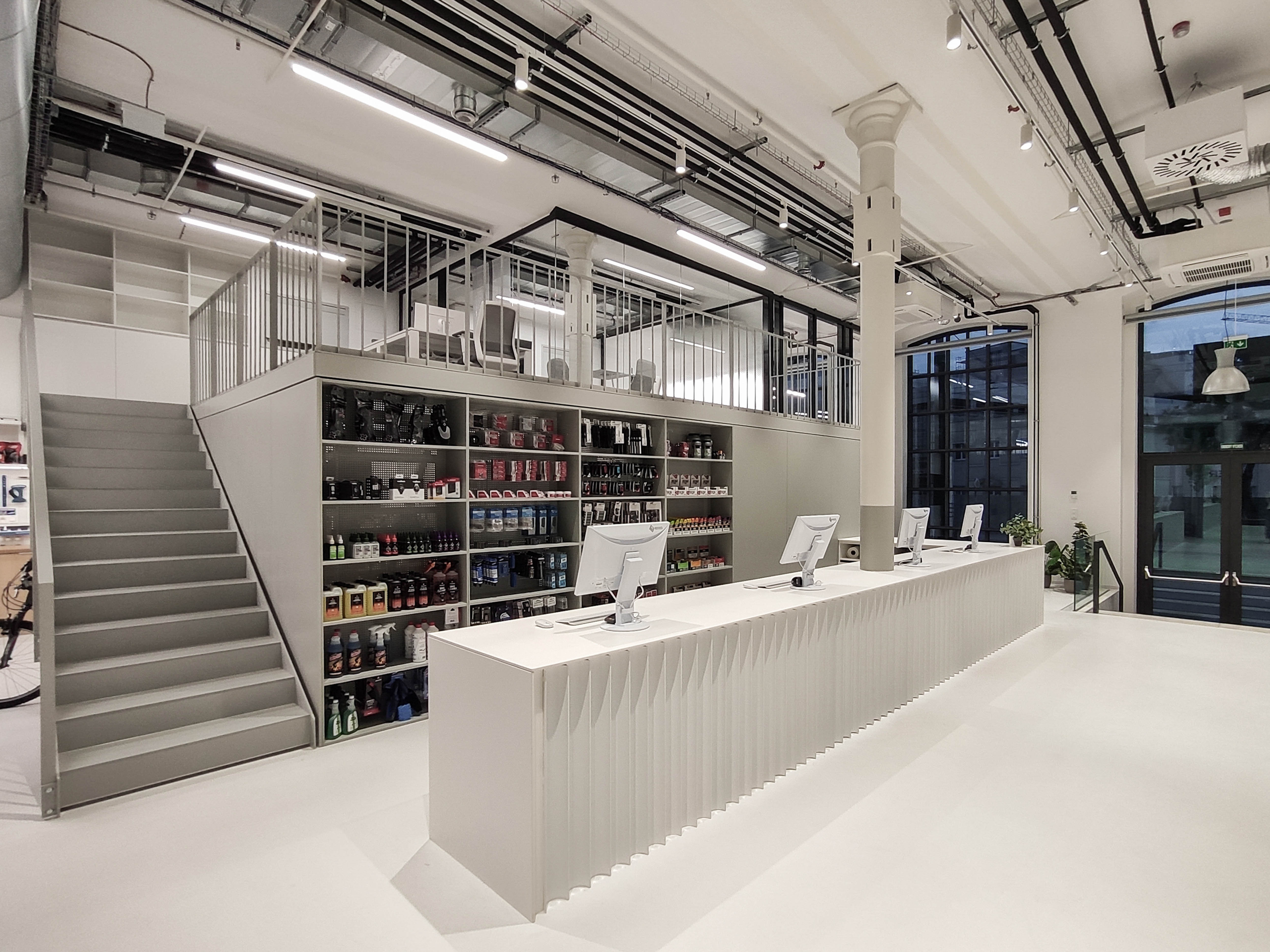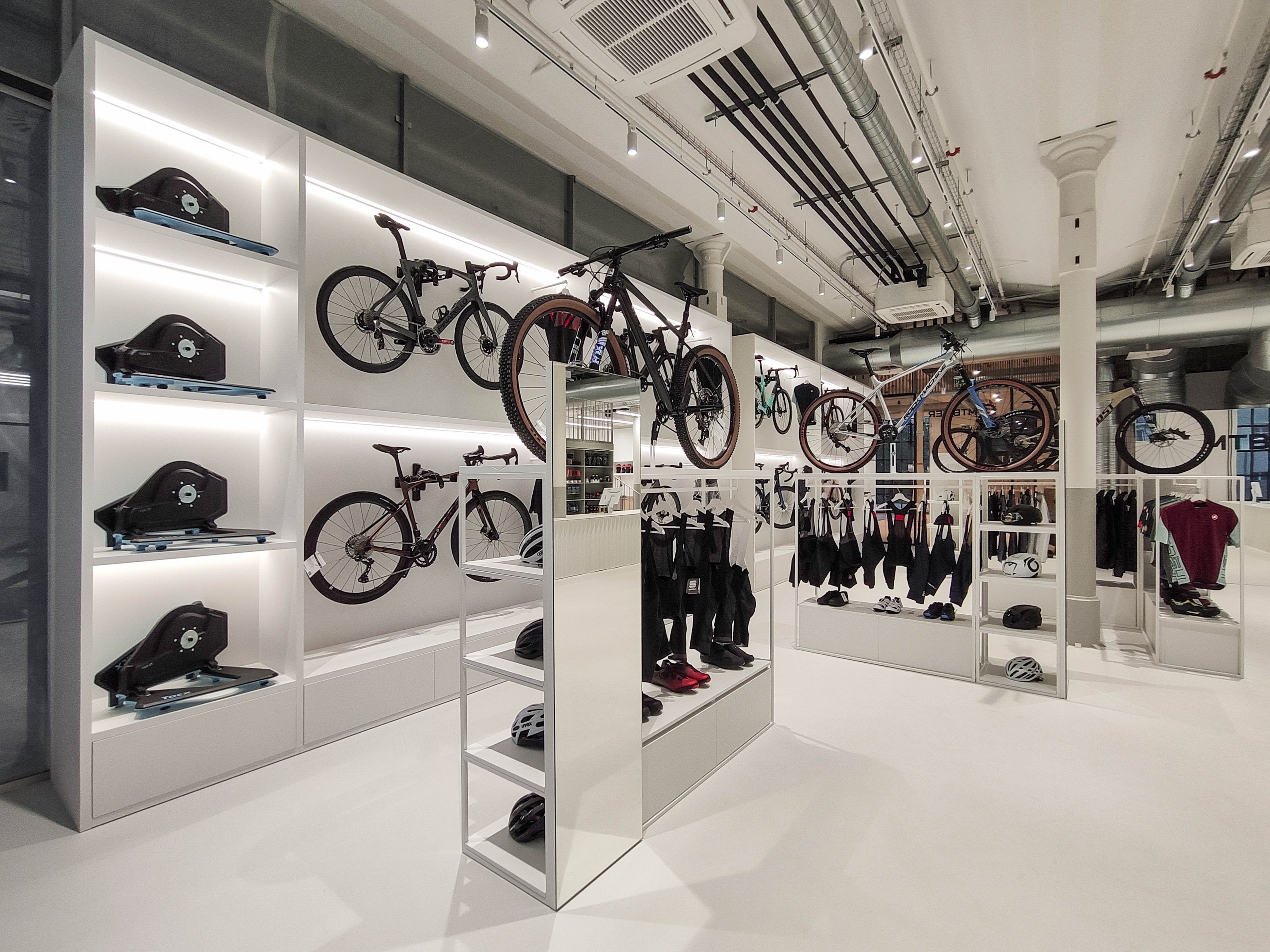 Prezentačná stena s bicyklami a modulárne stojany v priestore sú pre maximálne vyniknutie produktov biele. Priestor medzi servisom a predajňou dotvárajú zrkadlové skúšobné kabínky s logom viditeľným z ulice.