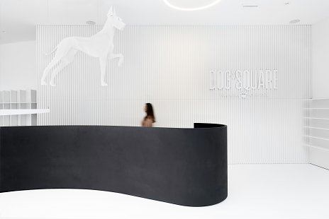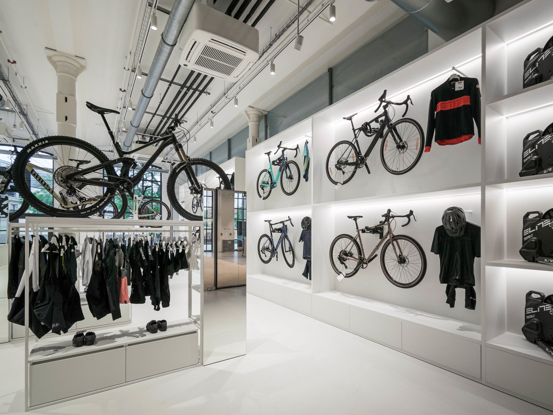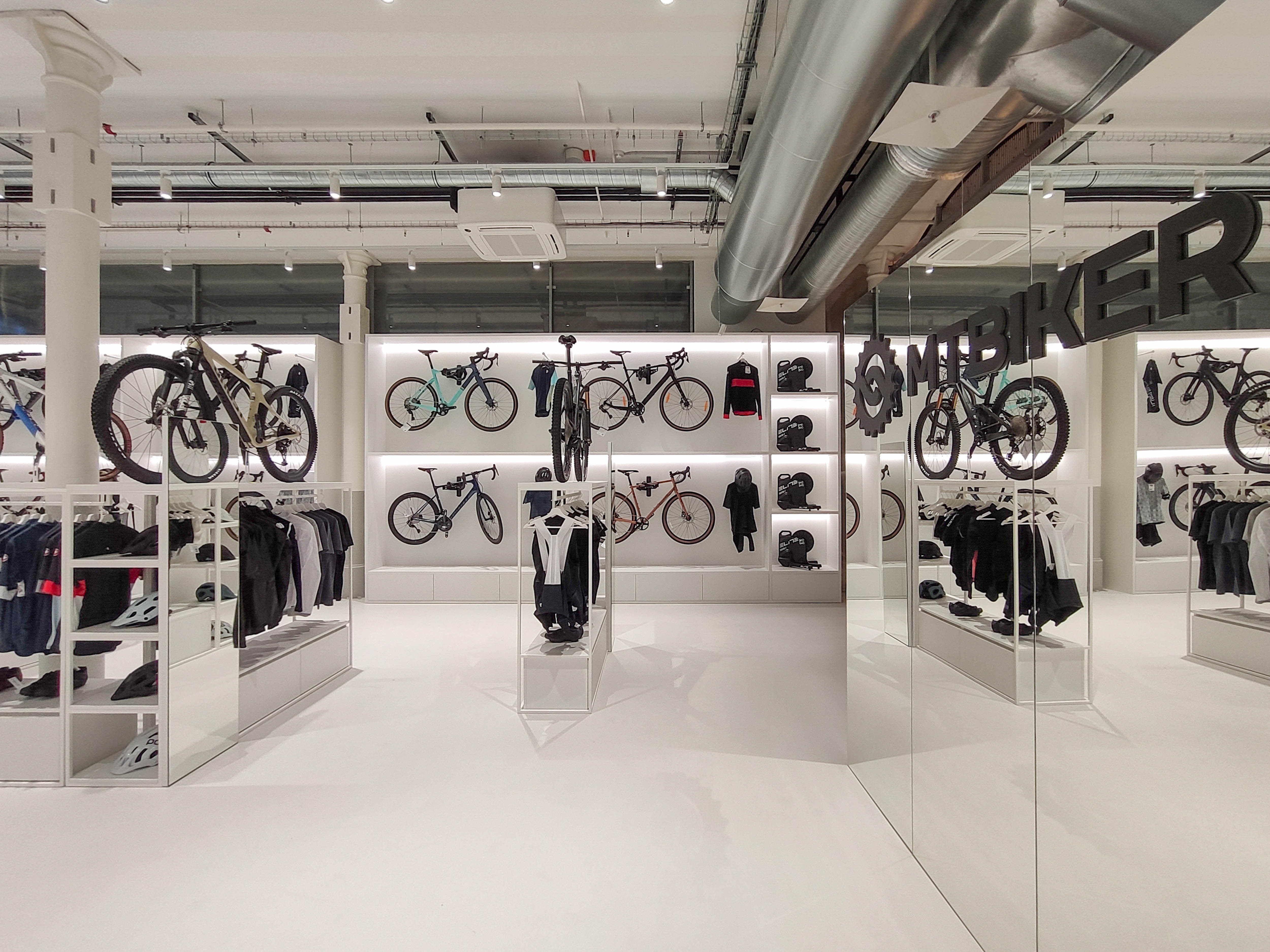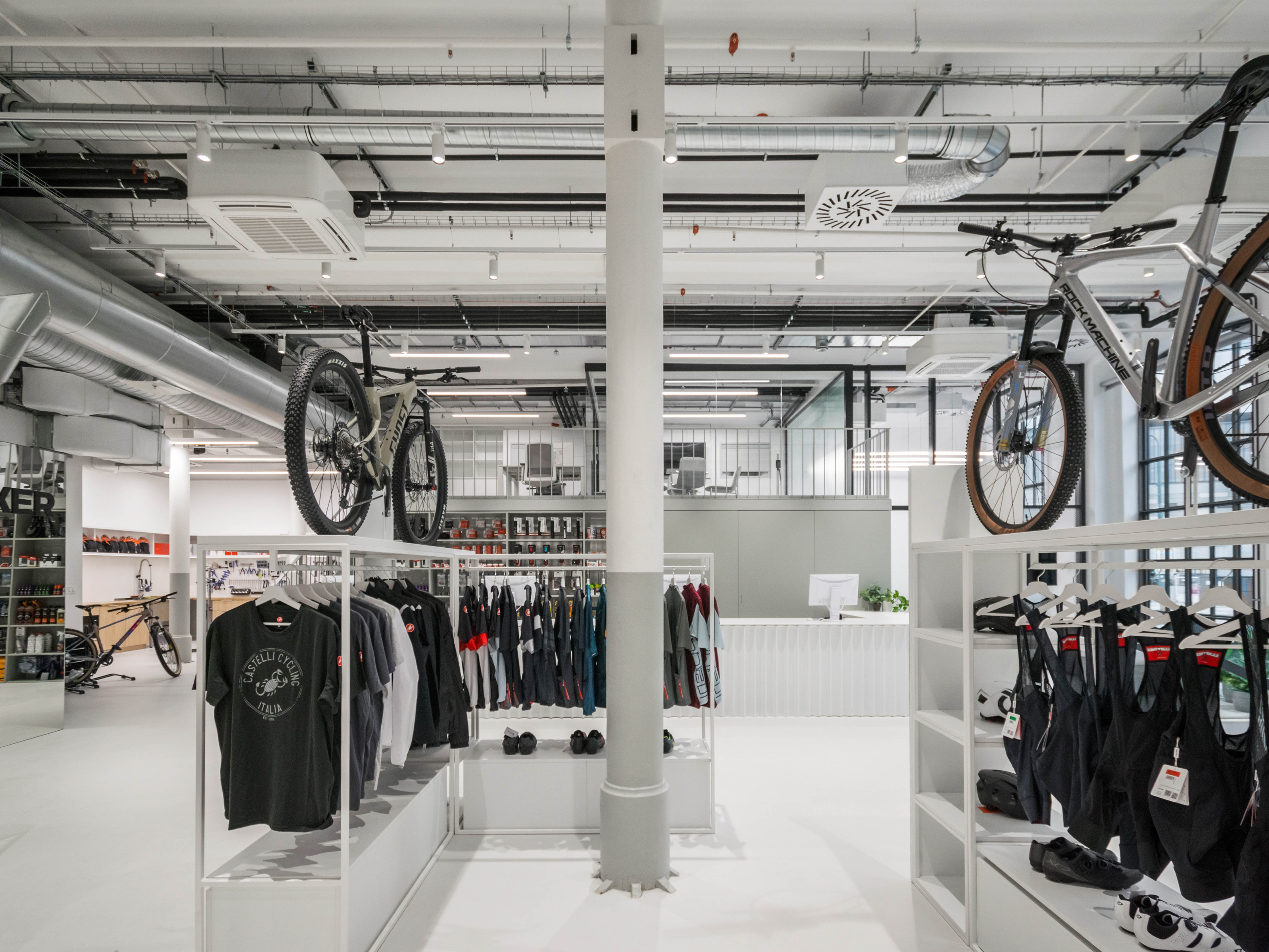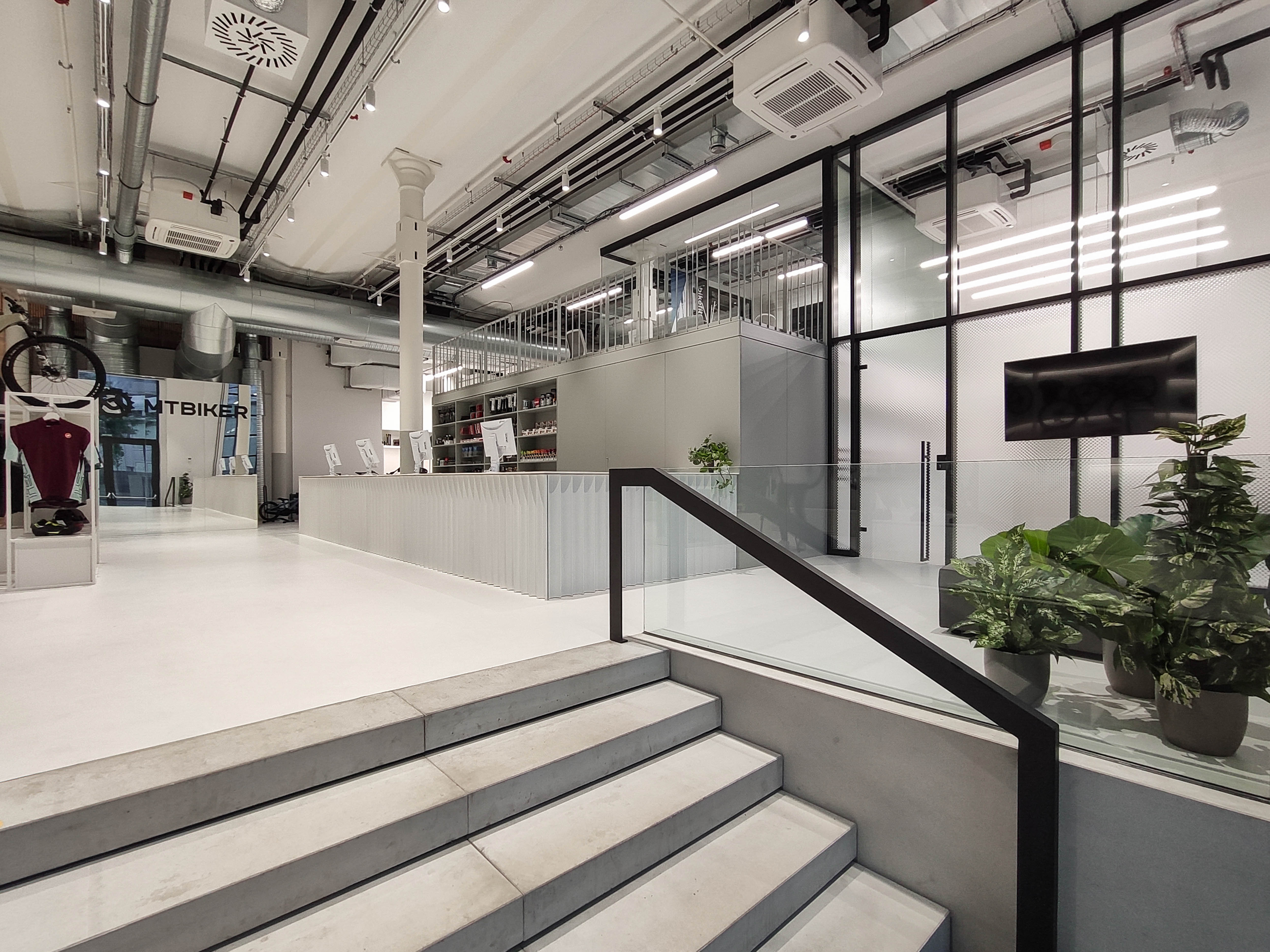 Prezentačná stena s bicyklami a modulárne stojany v priestore sú pre maximálne vyniknutie produktov biele. Priestor medzi servisom a predajňou dotvárajú zrkadlové skúšobné kabínky s logom viditeľným z ulice.