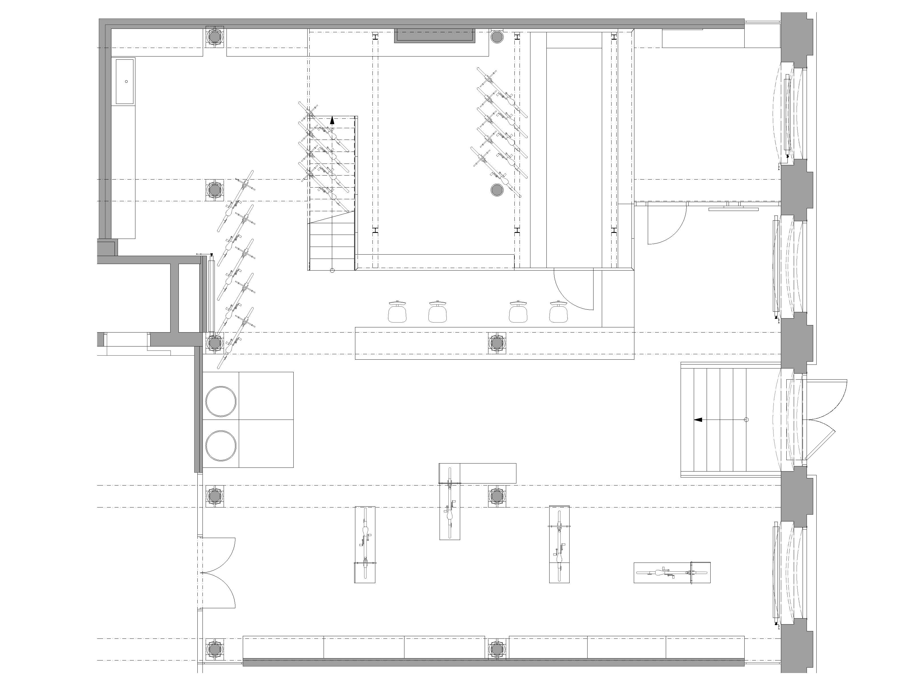 Monochromatická paleta nových materiálov necháva vyniknúť kontext obnoveného priestoru a sústreďuje pozornosť na prezentované produkty. Svetlosivá konštrukcia mezanínu a nadväzujúce nábytkové prvky zodpovedajú farebnosti soklovej časti obnovených liatinových stĺpov.