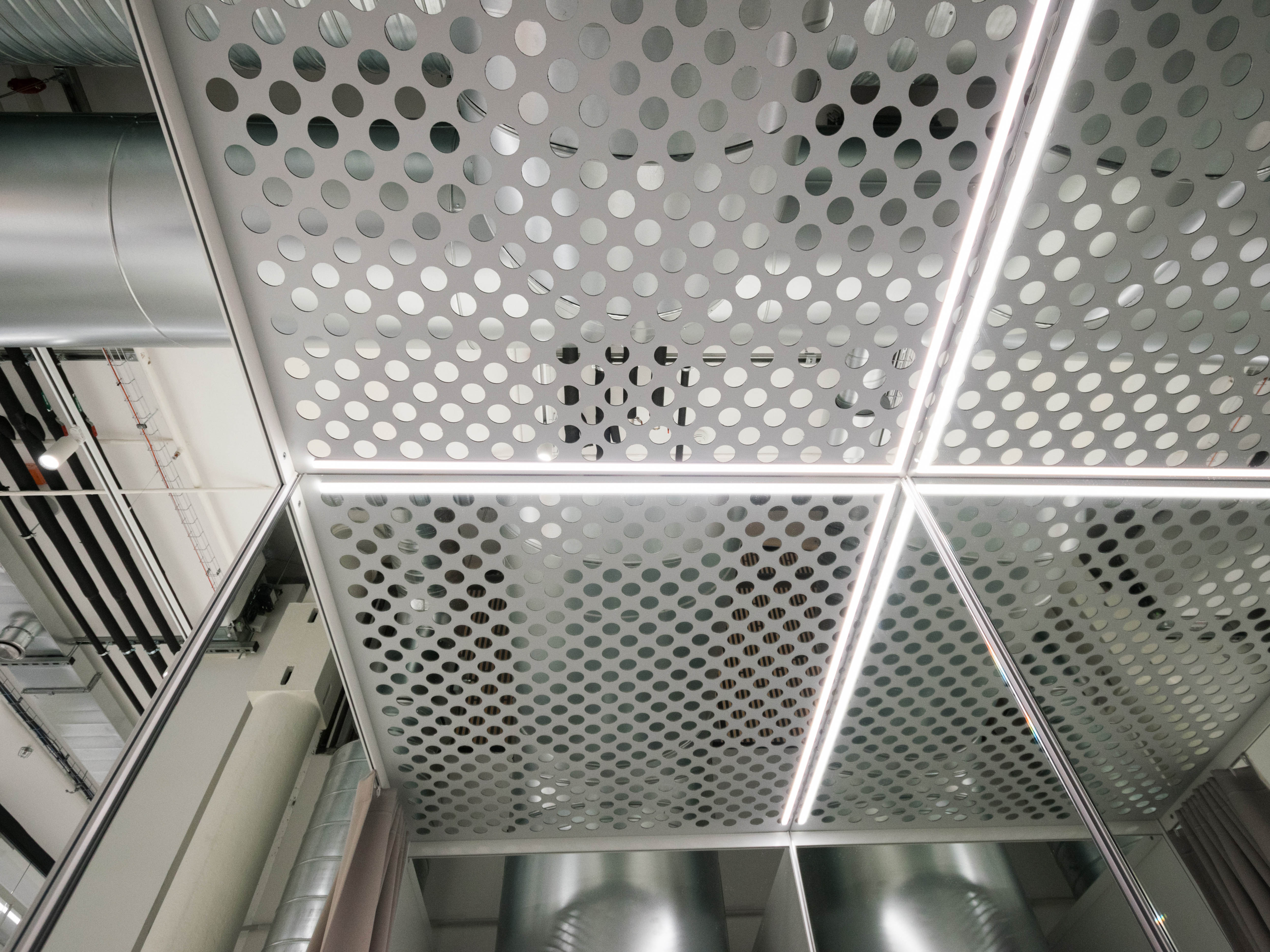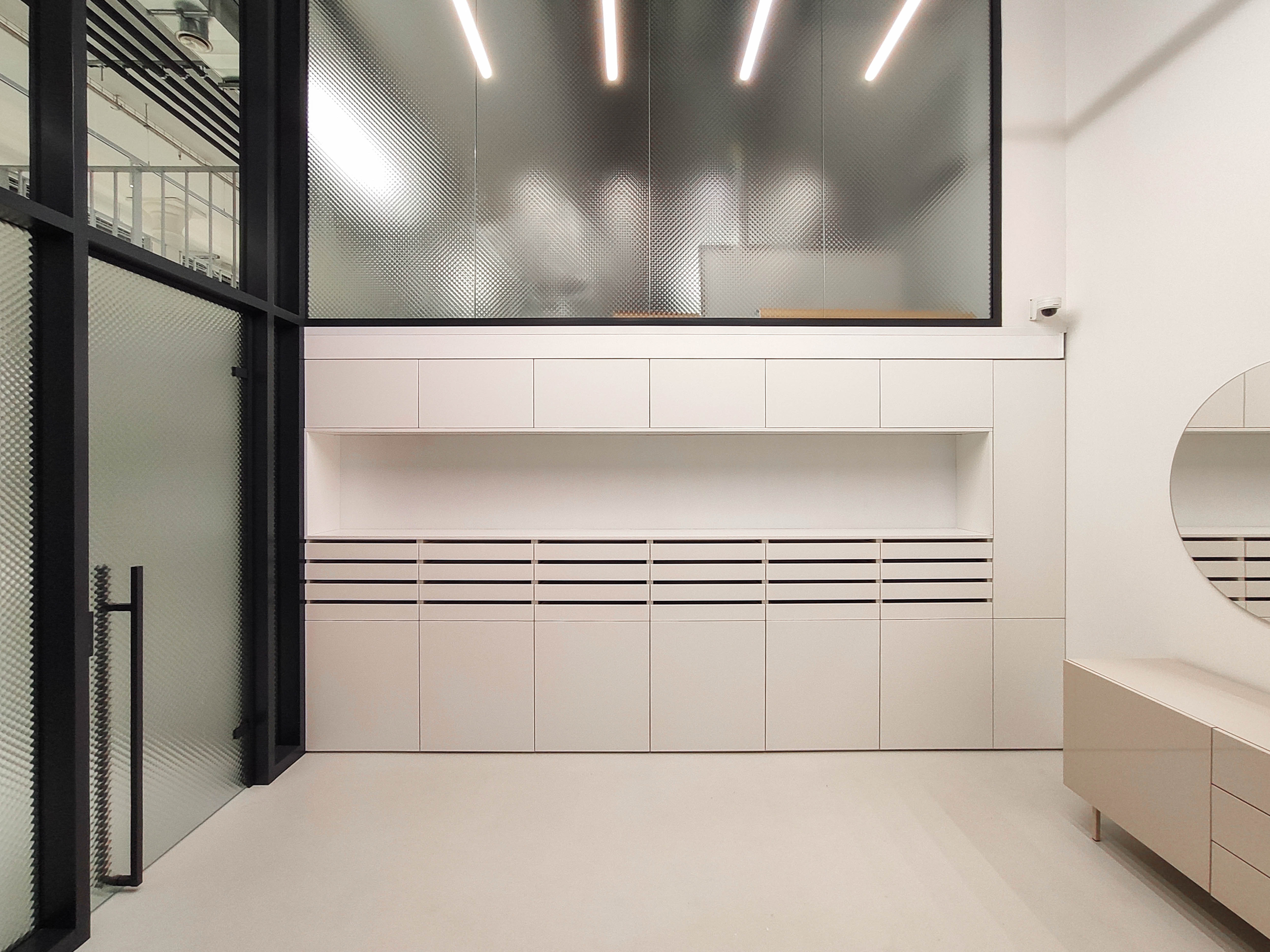 Funkčnú náplň na mezaníne tvorí oddychová zóna pre zamestnancov, priestor pre hot desks a miestnosť pre bike fitting. Čiastočné súkromie medzi jednotlivými zónami zabezpečuje dekoračné štruktúrované sklo.