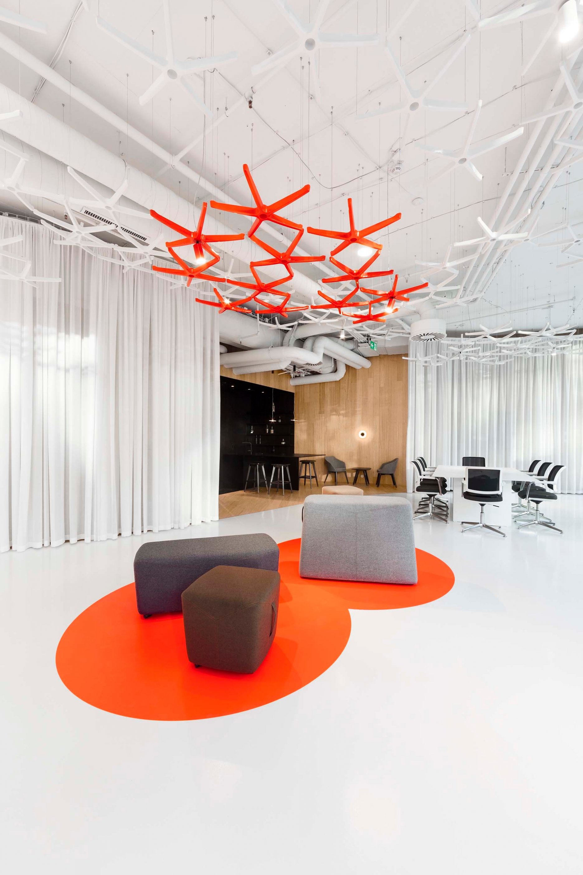 Pri návšteve na prvý pohľad zaujmú výrazné červené plochy na podlahe. Tie sú určené pre prezentáciu noviniek v sortimente. Podhľad tvorený z krížov kancelárskych stoličiek je na týchto miestach taktiež farebne odlíšený. Výrazným prvkom je tiež kontrastný kuchynský a degustačný kút, ktorý je zapustený v nike obloženej svetlým dubovým drevom.