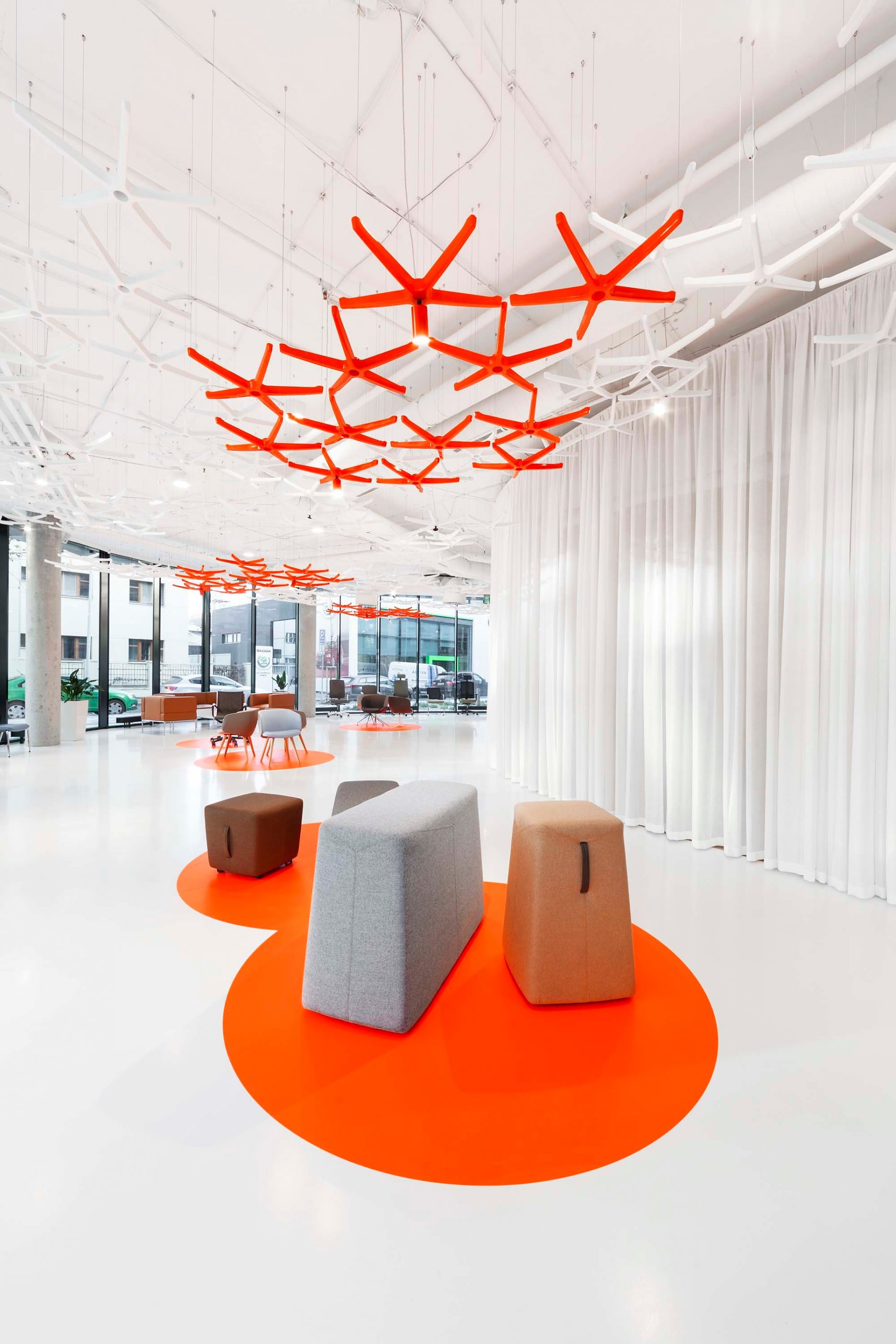 “Showroomy veľakrát vyžadujú nadmernú mieru flexibility v rámci ich užívania a častých zmien. Preto sme vsadili na najjednoduchšie možné riešenie v rámci vynaložených nákladov a finálneho užívania. Záves vnukol priestoru éterickejší charakter, drapéria funguje ako “aviváž” priestorov a taktiež ako dôležitý akustický element,” vtipne vystihuje záves Vladimír Žák.