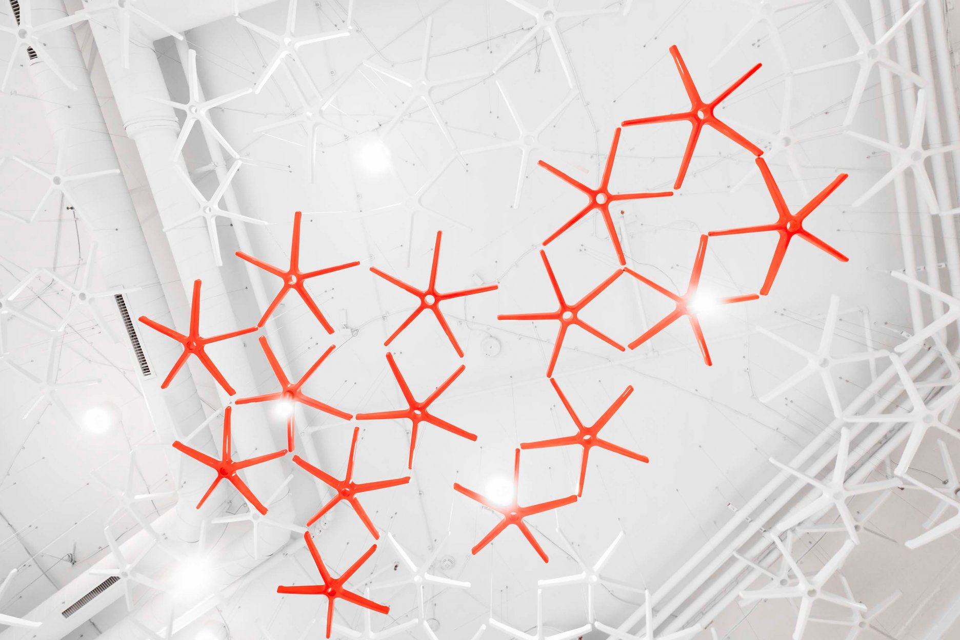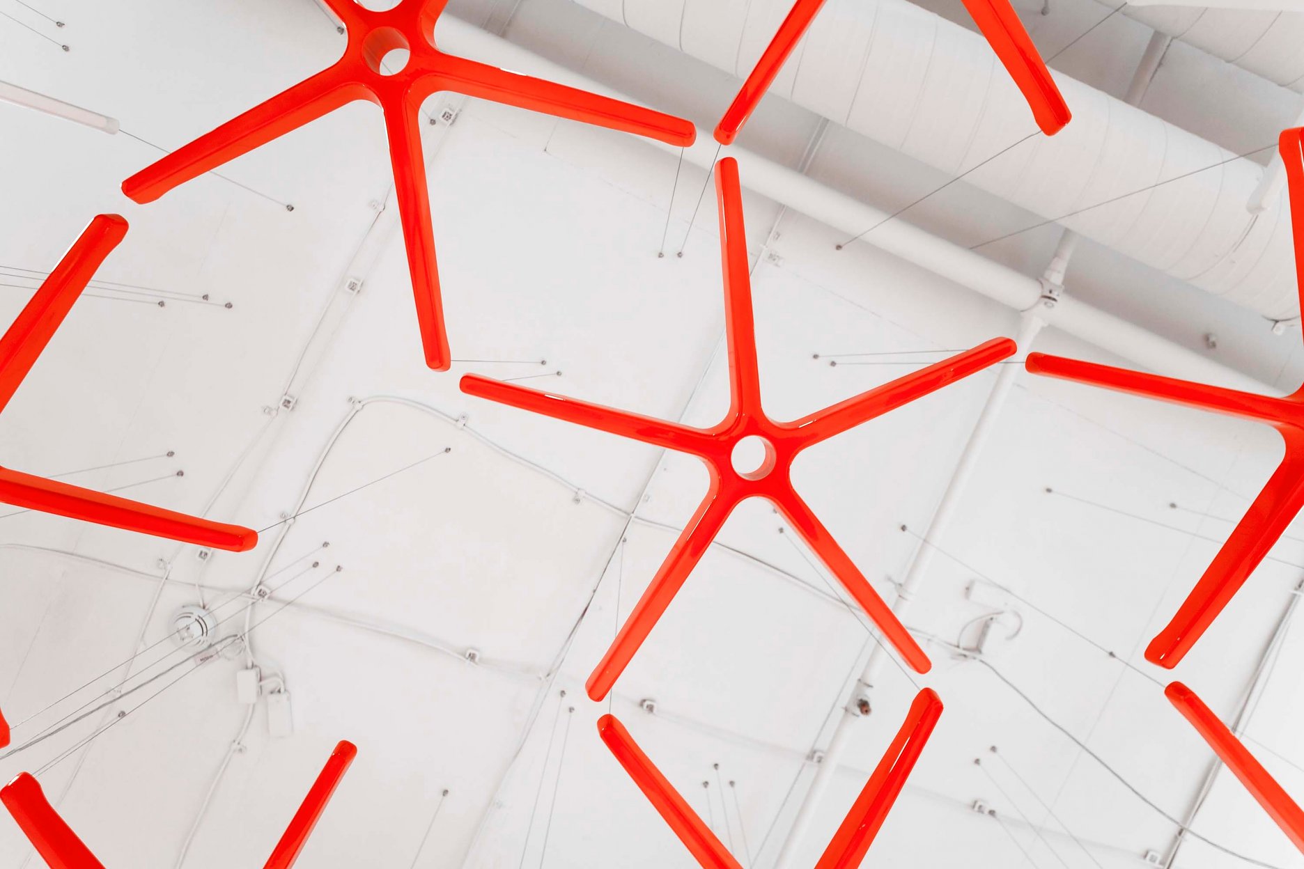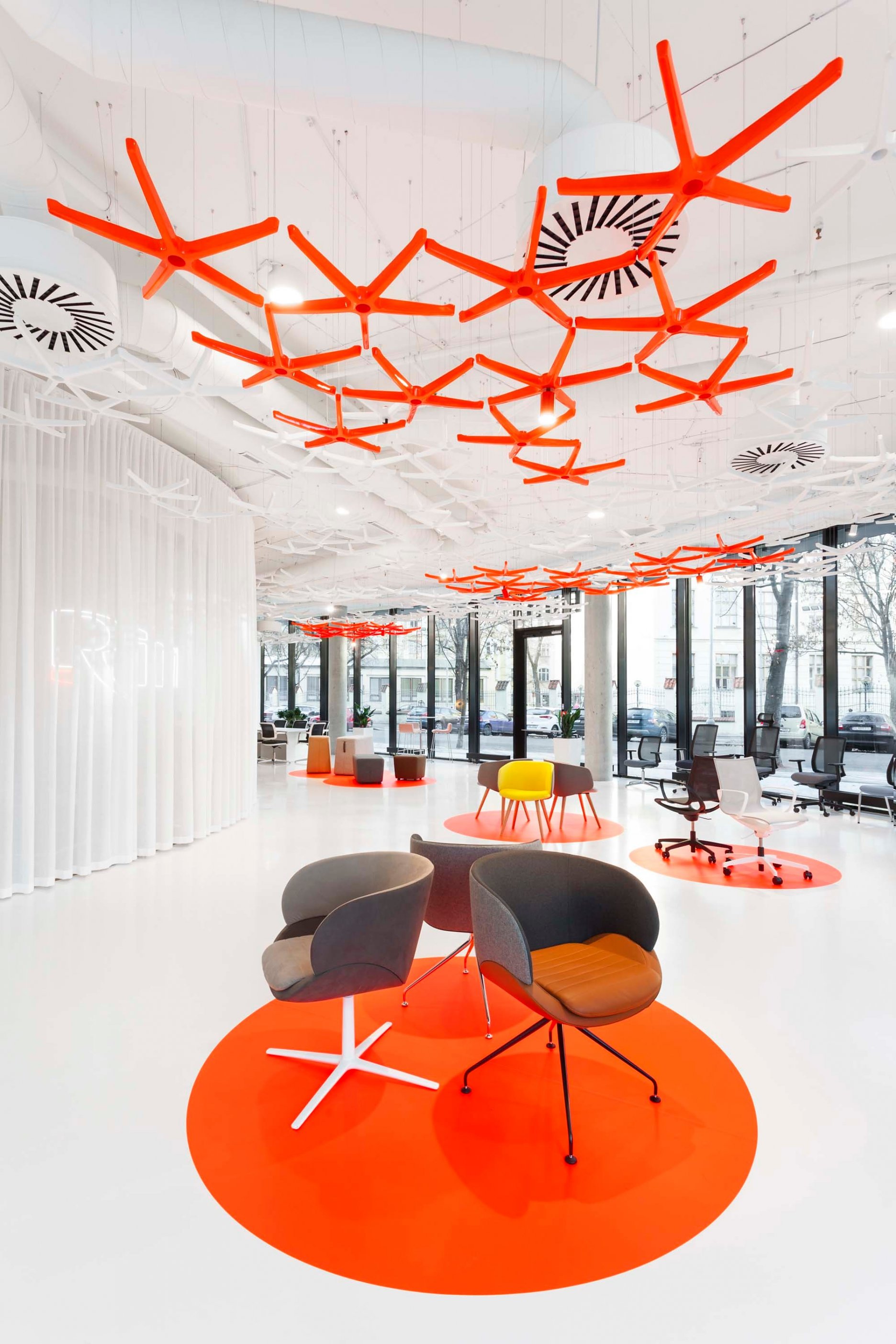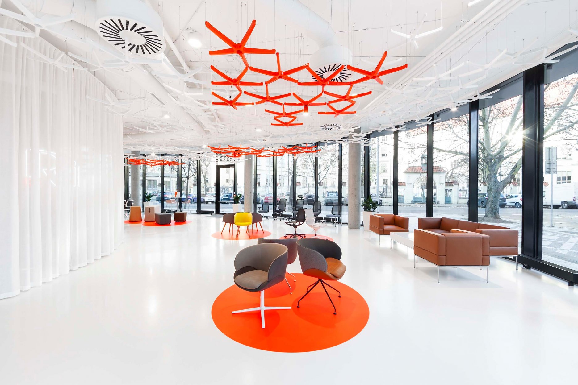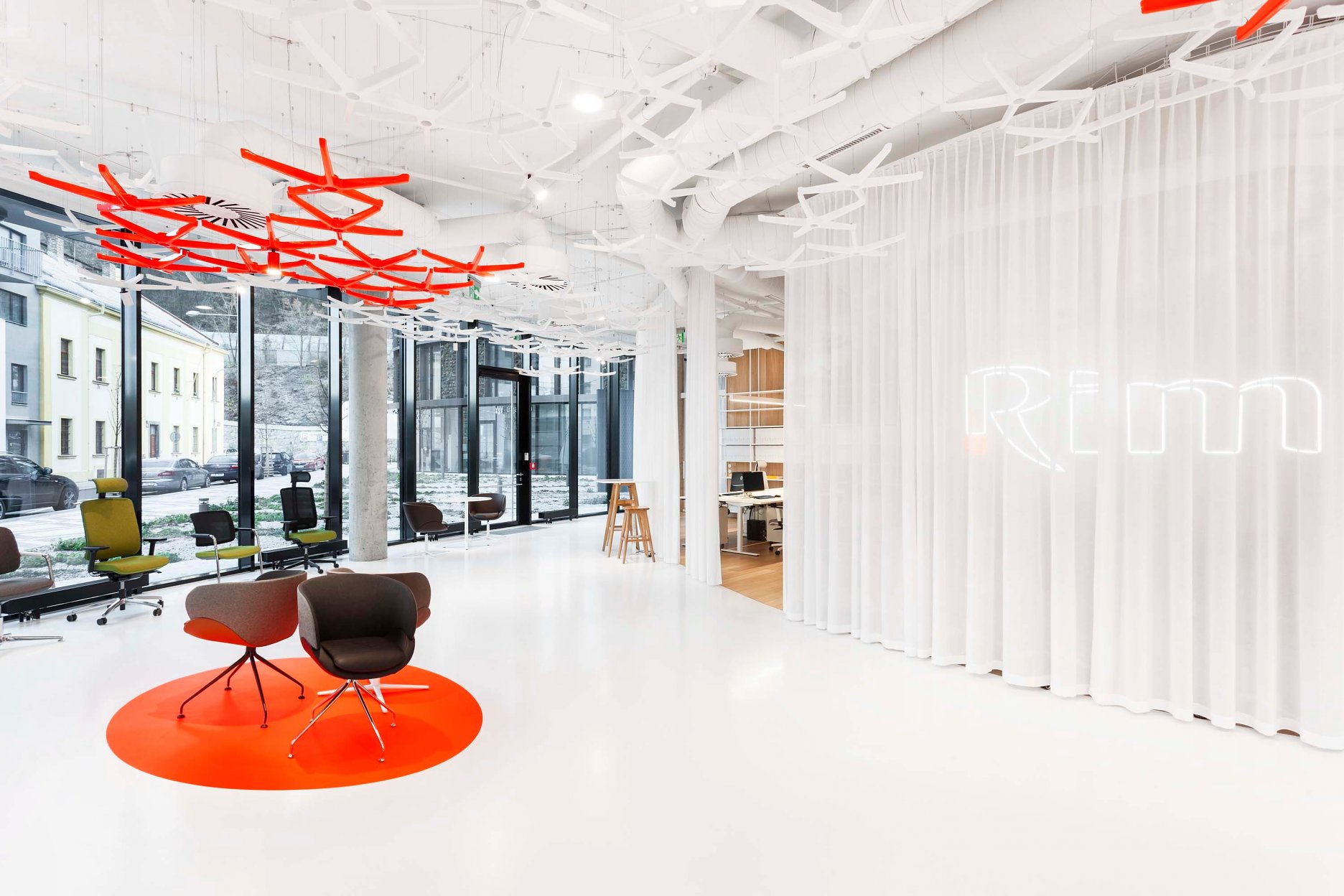 “Pro tento segment trhu je důležité odprezentovat výrobky v co nejlepší možné kvalitě. V původním showroomu nebyl dostatek místa na samotnou expozici a nábytek trpěl vysokou denzitou jednotlivých kusů. Proto jsme se při navrhování zaměřili na co největší otevření prostor, které jsme následně neofenzivně rozdělili lehkým závěsem, za kterým je schováno vše, co se netýká výstavní plochy.” vysvetľuje jeden z autorskej dvojice, Vladimír Žák. “Zásadní pro nás bylo najít vhodnou koncepci, která podpoří produkty a zároveň bude autentickým a charakteristickým způsobem reflektovat zaměření firmy. Vhodné řešení jsme nalezli v instalaci podnoží kancelářských židlí, které jsme zavěsili pod strop a tím se nám podařilo docílit identické aplikace. Z tohoto organického podhledu jsme nakonec vytvořili jasnou dominantu prostor.” doplňuje svojho kolegu Roman Vrtiška.