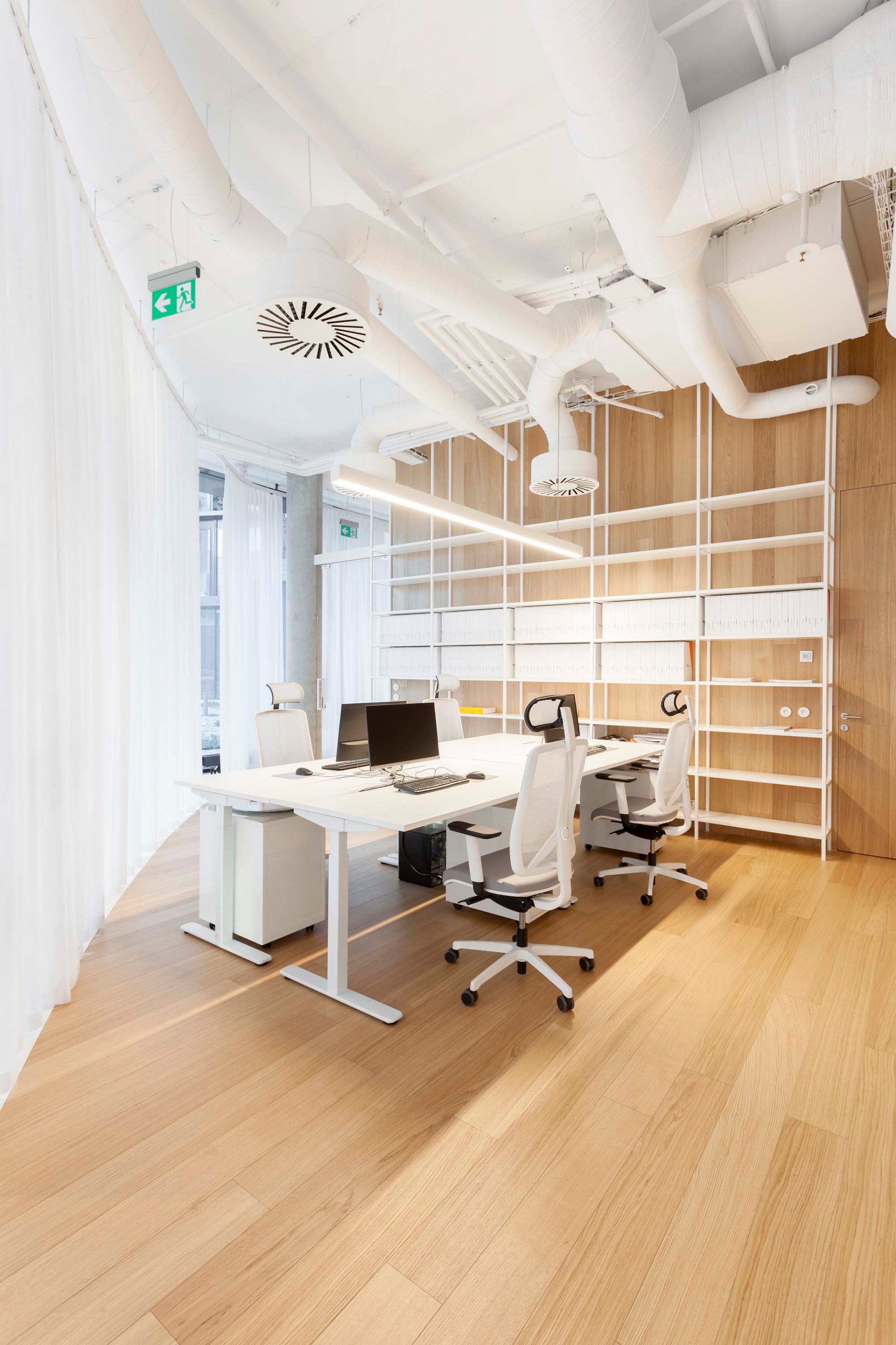 Produkty spoločnosti sú prezentované na neutrálnom bielom pozadí. “Abychom pevněji definovali rozhraní mezi expozicí a ostatními prostory, rozhodli jsme se kanceláře, a vedlejší přilehlé plochy, obložit dubovým dřevem a to jak podlahy, tak stěny. Docílili jsme příjemného kontrastního výsledku, který krásně funguje v obou případech. Bílý prostor dává vyniknout produktům, dřevo pak utváří teplý a přirozený dojem z prostor,” objasňuje materiálové a farebné riešenie Vrtiška.