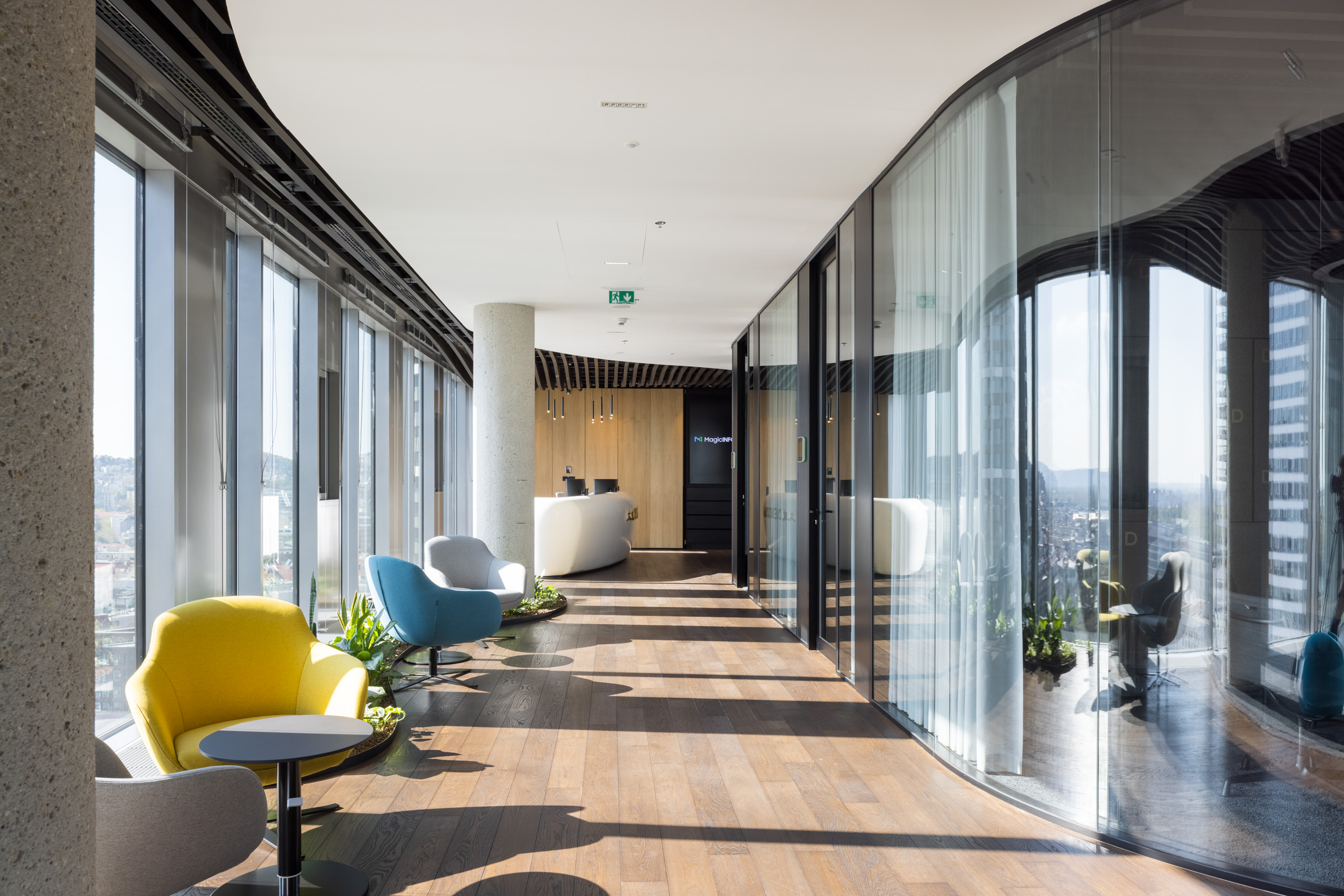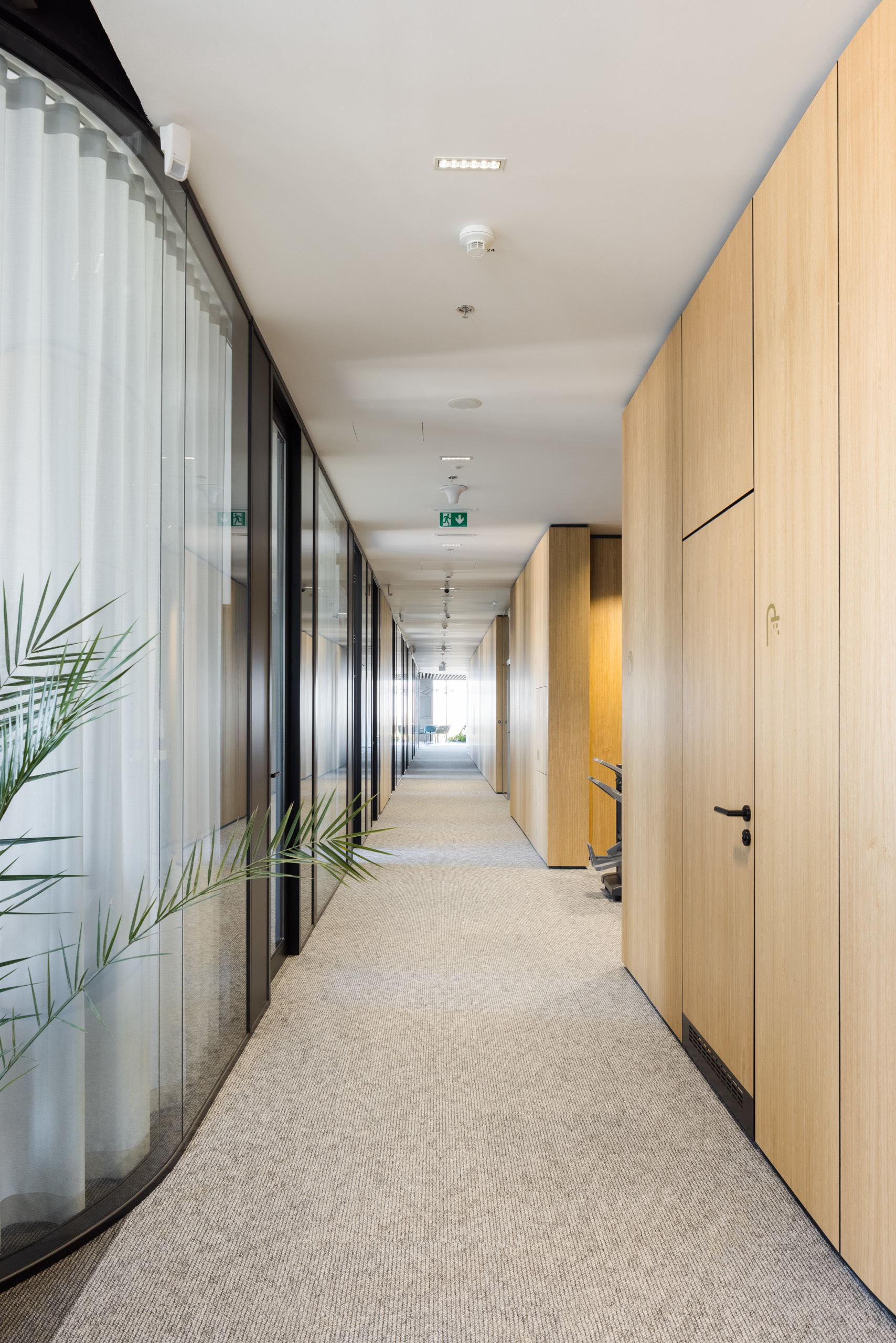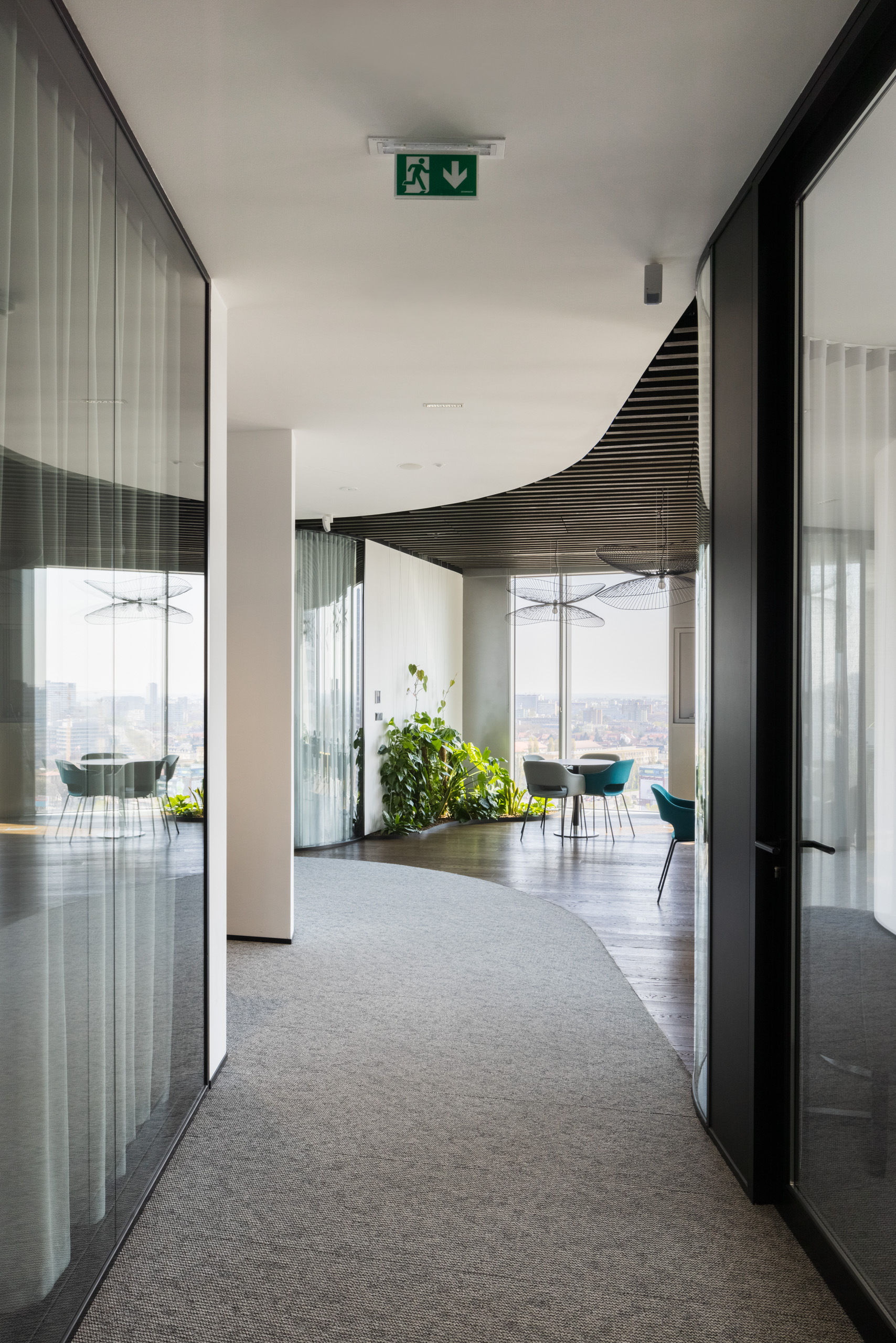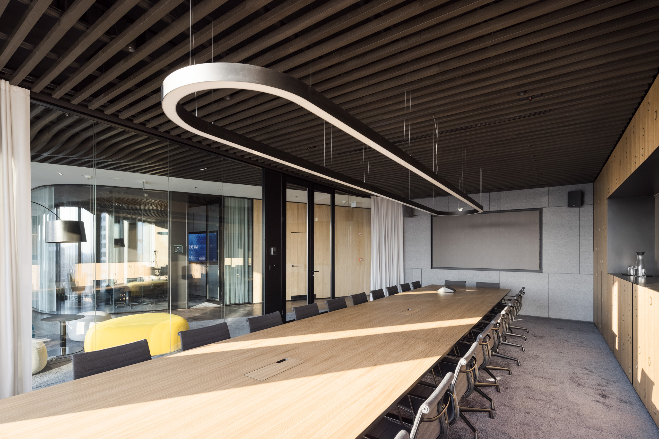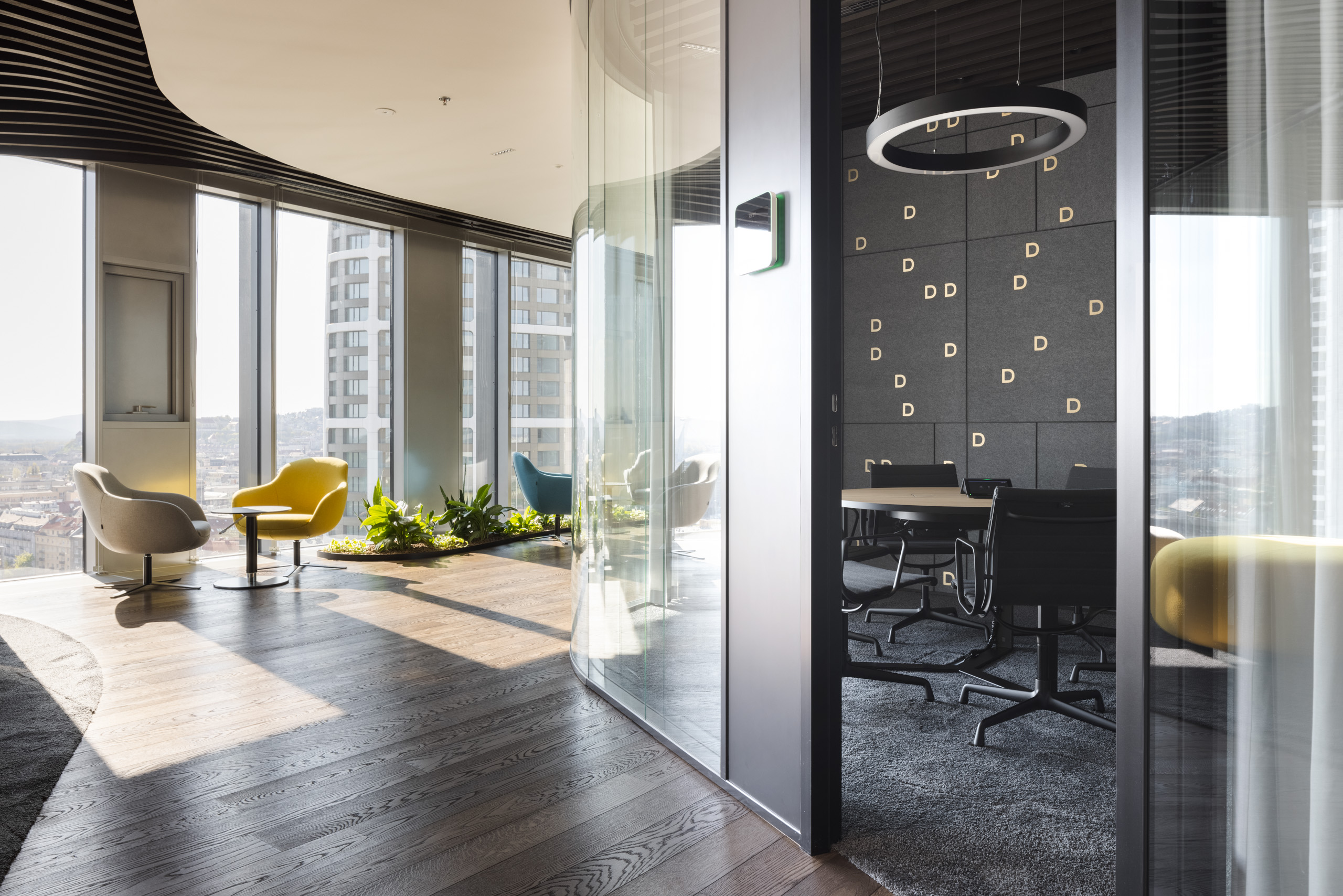 Paleta tradičných, ušľachtilých materiálov, ako drevené dyhy, či mosadzné intarzie je doplnená farebnými akcentmi kresiel, ostrovmi so zeleňou a odhaleným betónom stĺpov, ktoré interiér odľahčujú a robia ho menej formálnym. Veľký dôraz bol kladený na kvalitné spracovanie detailov, ako napríklad infotainment. Interiér je vyhotovený z materiálov s certifikátmi ekologickej udržateľnosti a recyklovaných materiálov. Kancelárske priestory sú vybavené špičkovým audiovizuálnym systémom pre organizáciu online konferencii.