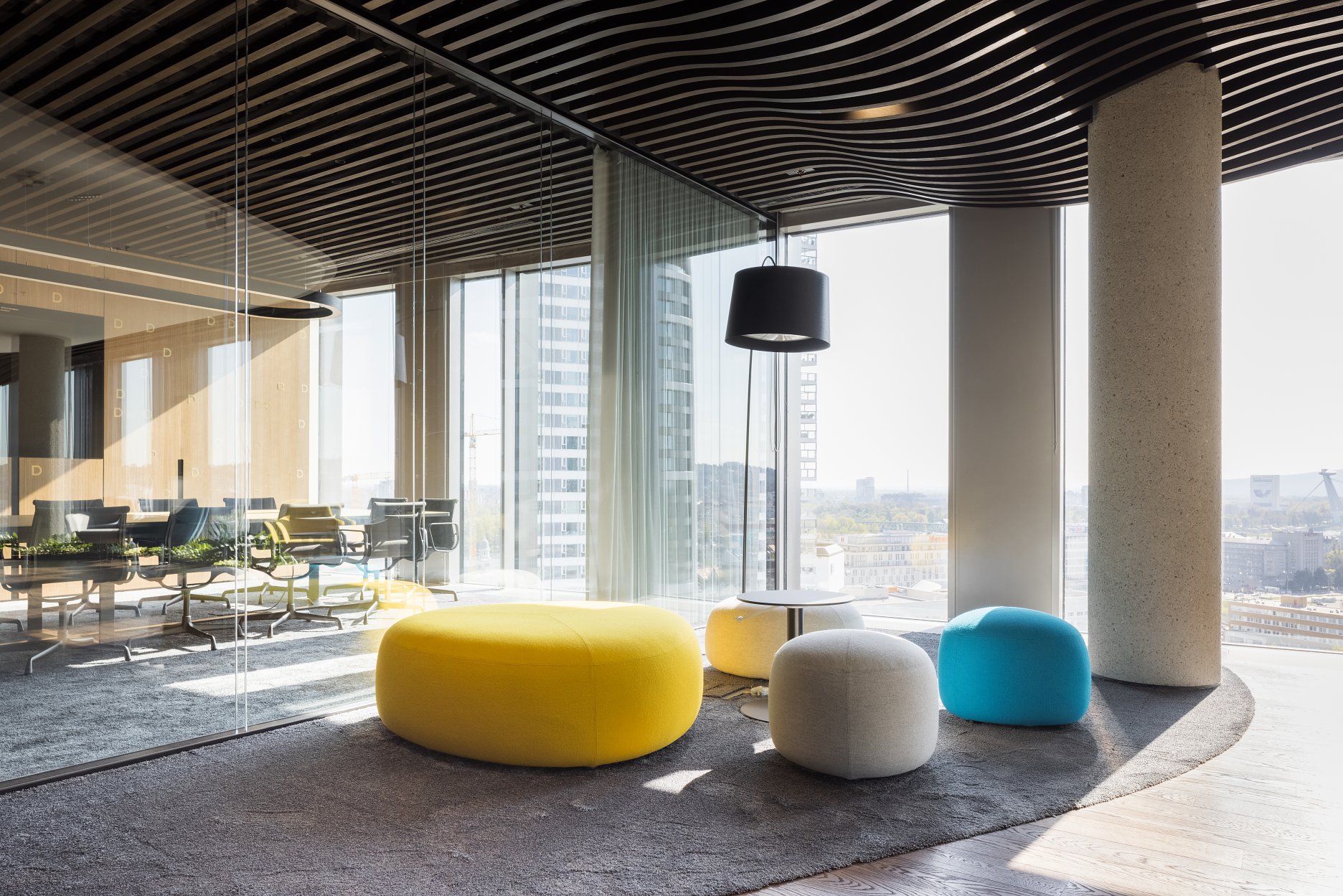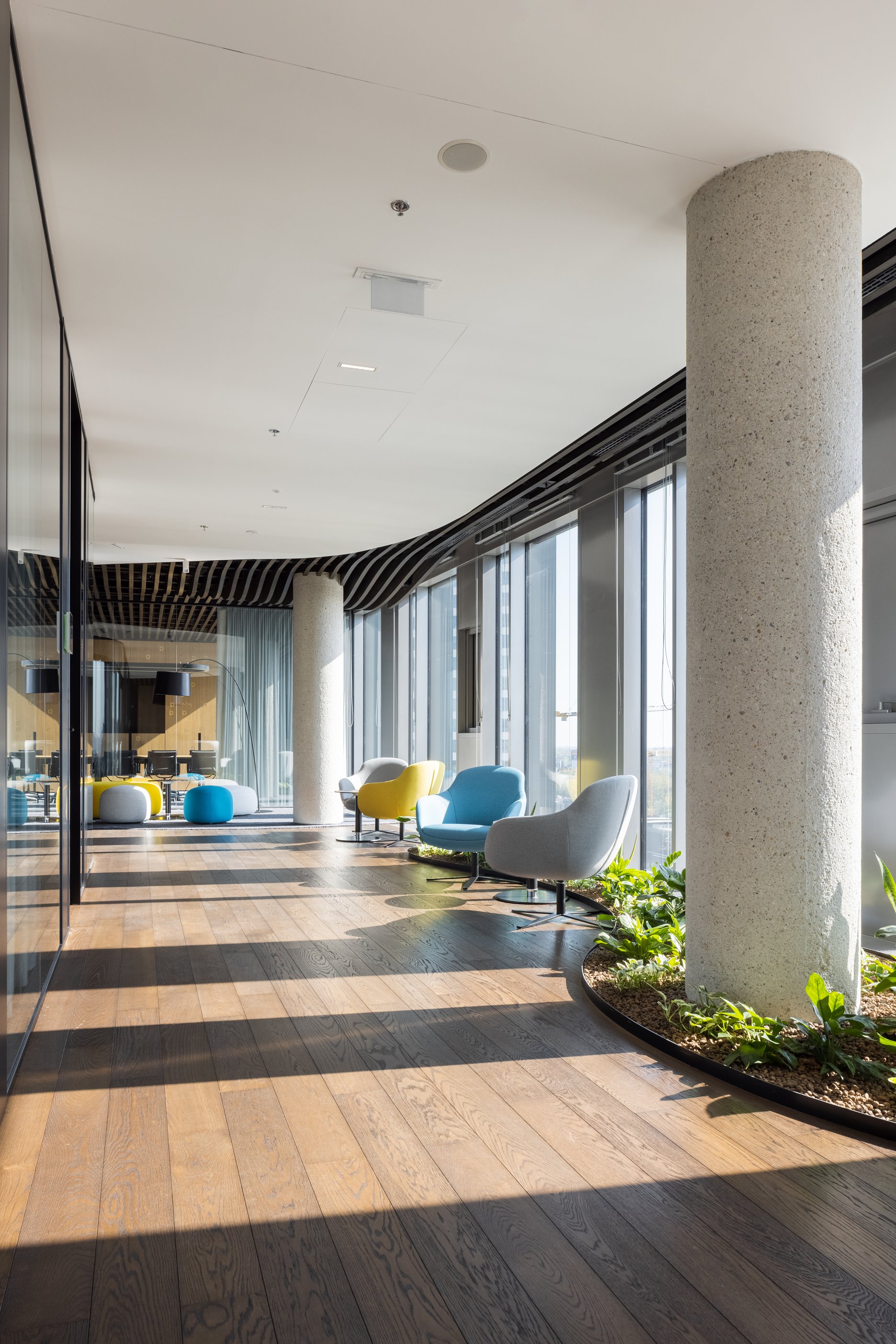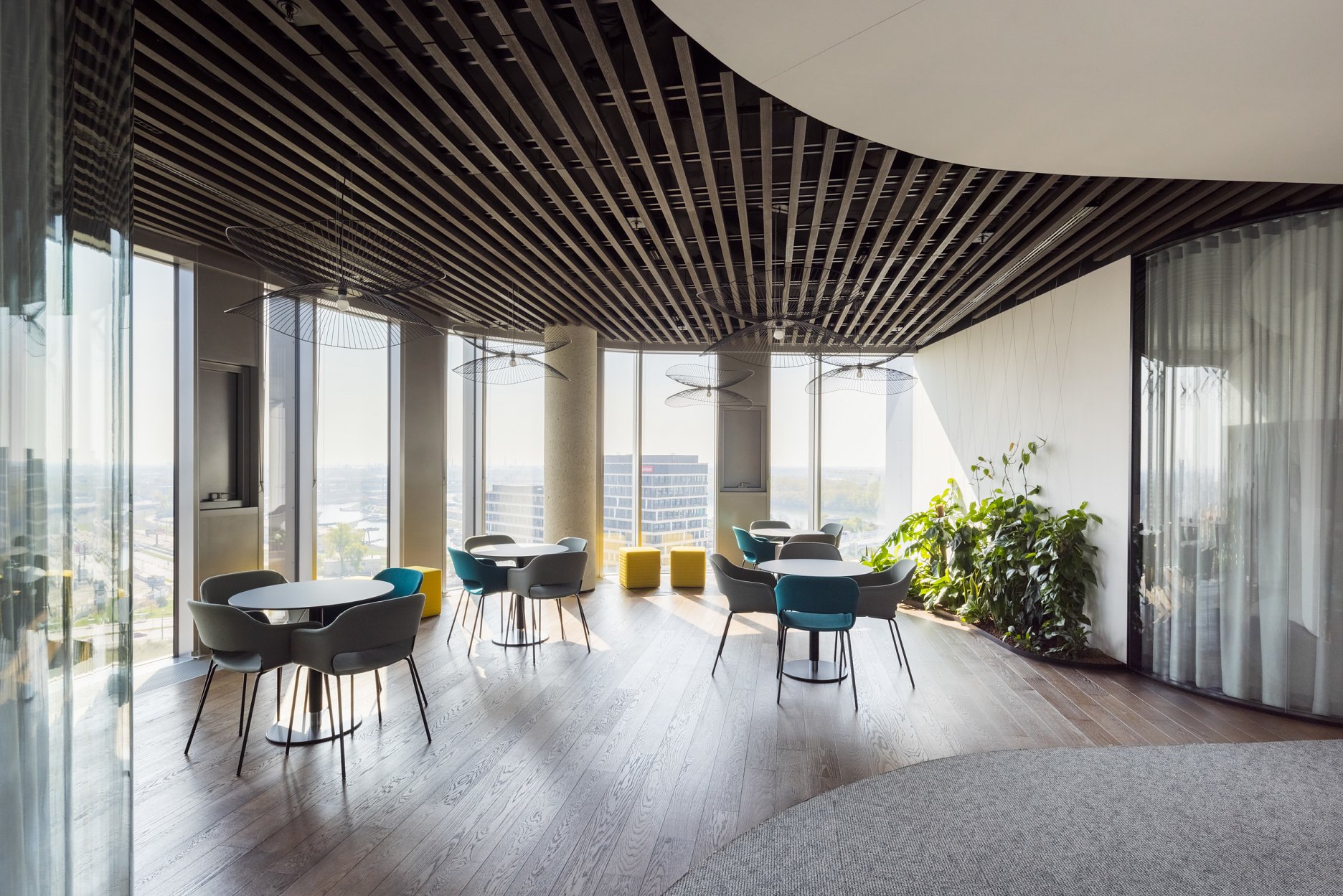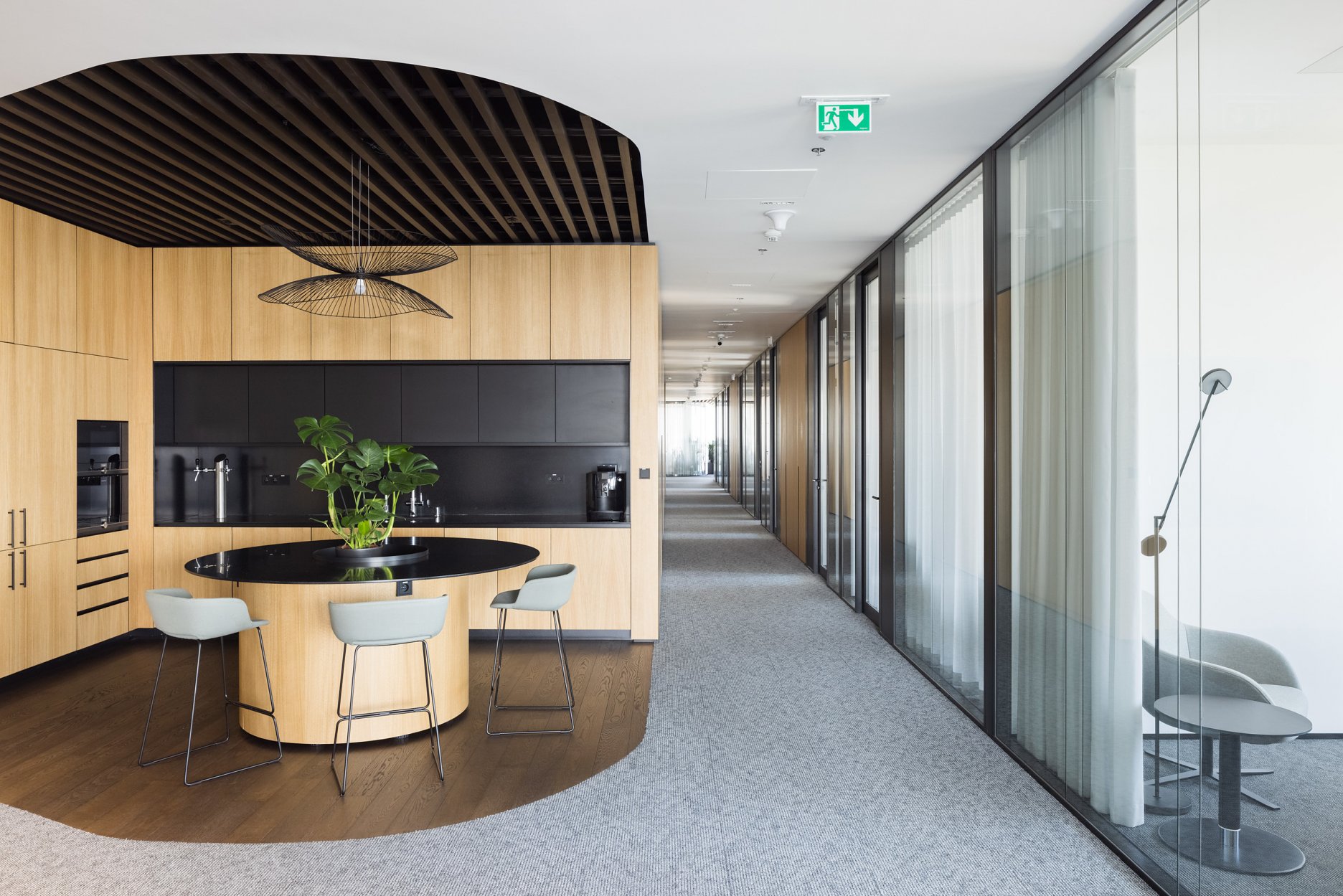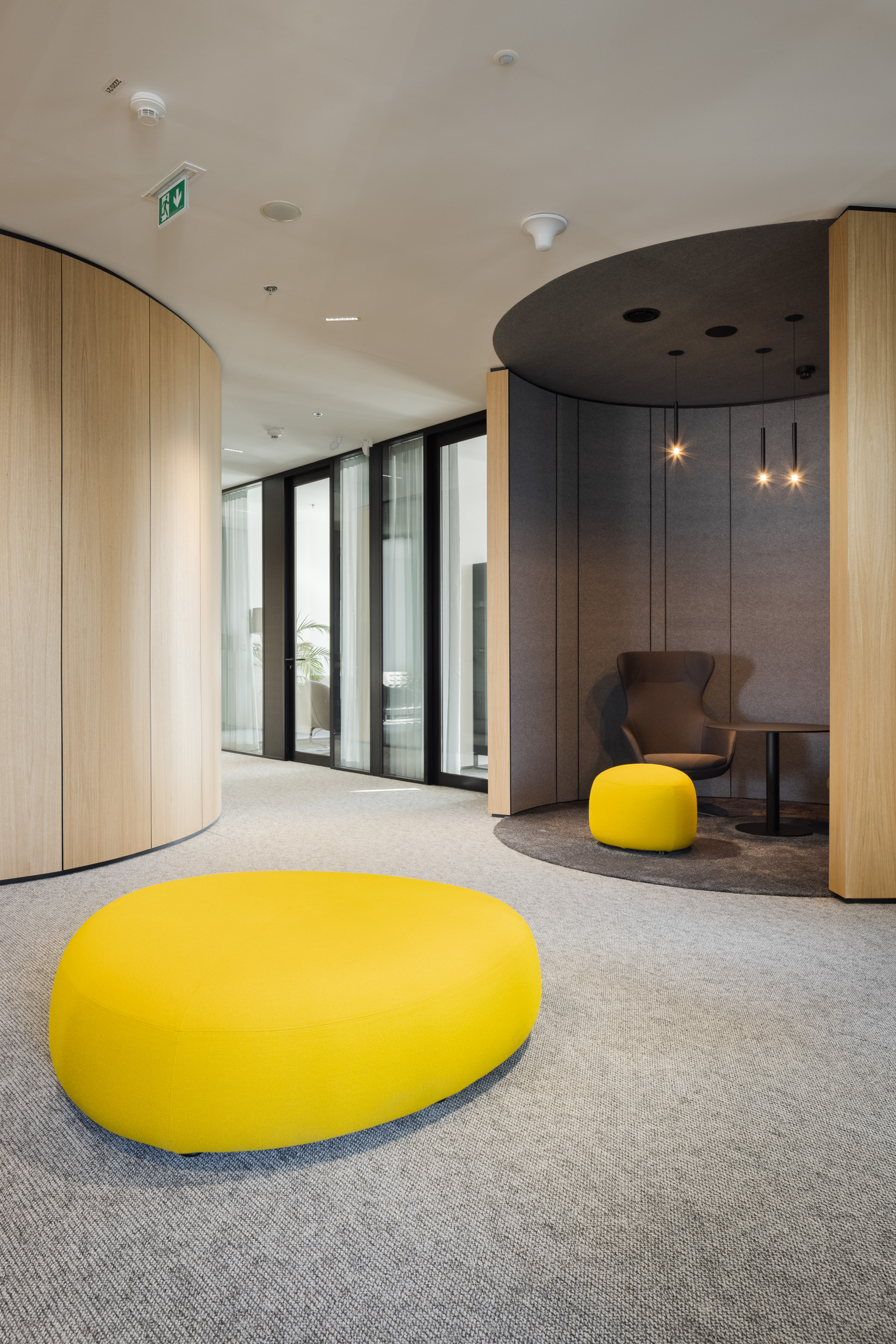 Paleta tradičných, ušľachtilých materiálov, ako drevené dyhy, či mosadzné intarzie je doplnená farebnými akcentmi kresiel, ostrovmi so zeleňou a odhaleným betónom stĺpov, ktoré interiér odľahčujú a robia ho menej formálnym. Veľký dôraz bol kladený na kvalitné spracovanie detailov, ako napríklad infotainment. Interiér je vyhotovený z materiálov s certifikátmi ekologickej udržateľnosti a recyklovaných materiálov. Kancelárske priestory sú vybavené špičkovým audiovizuálnym systémom pre organizáciu online konferencii.