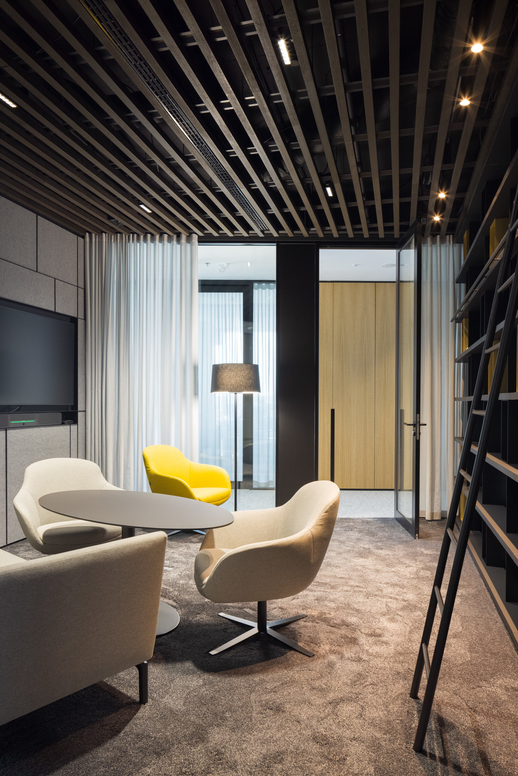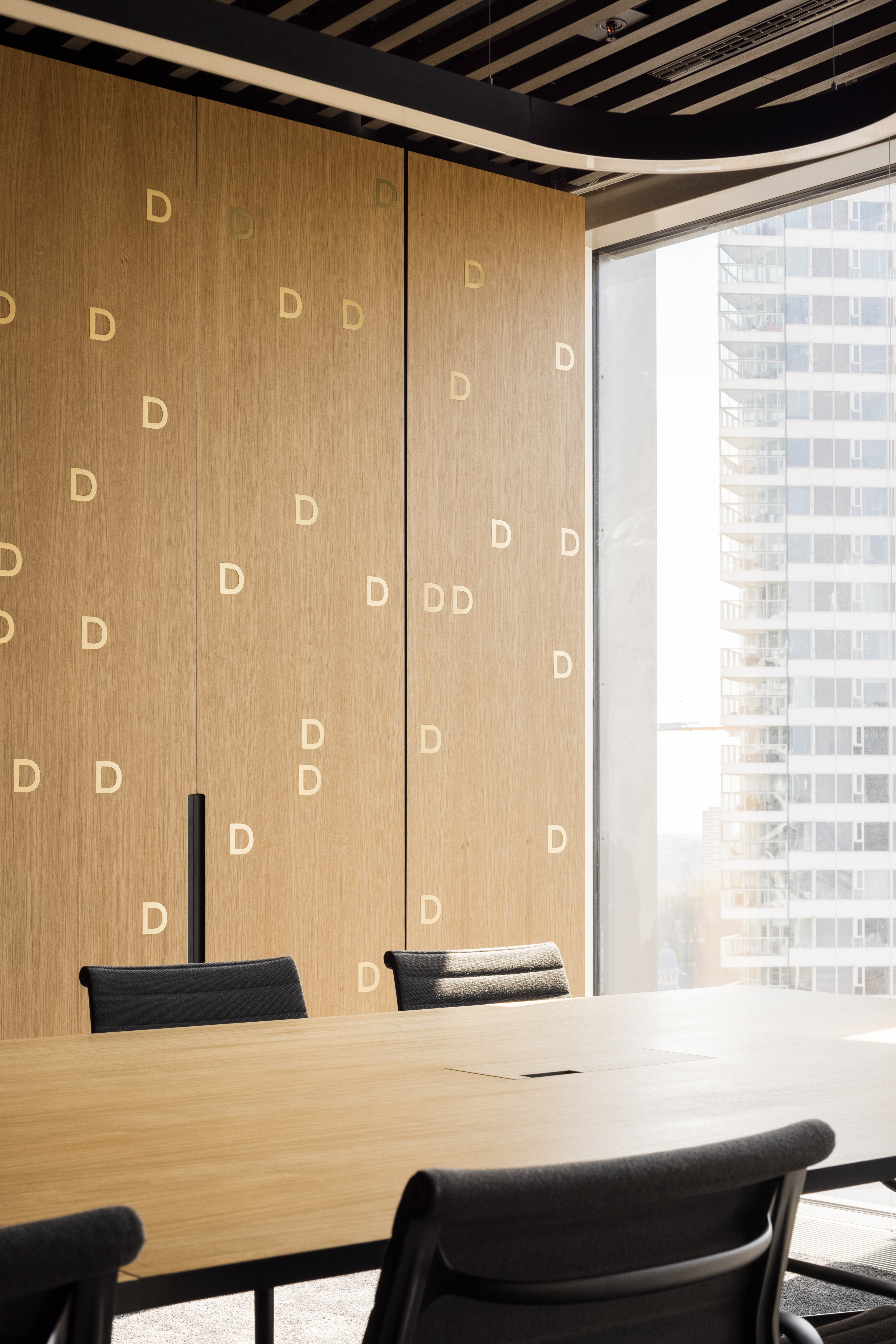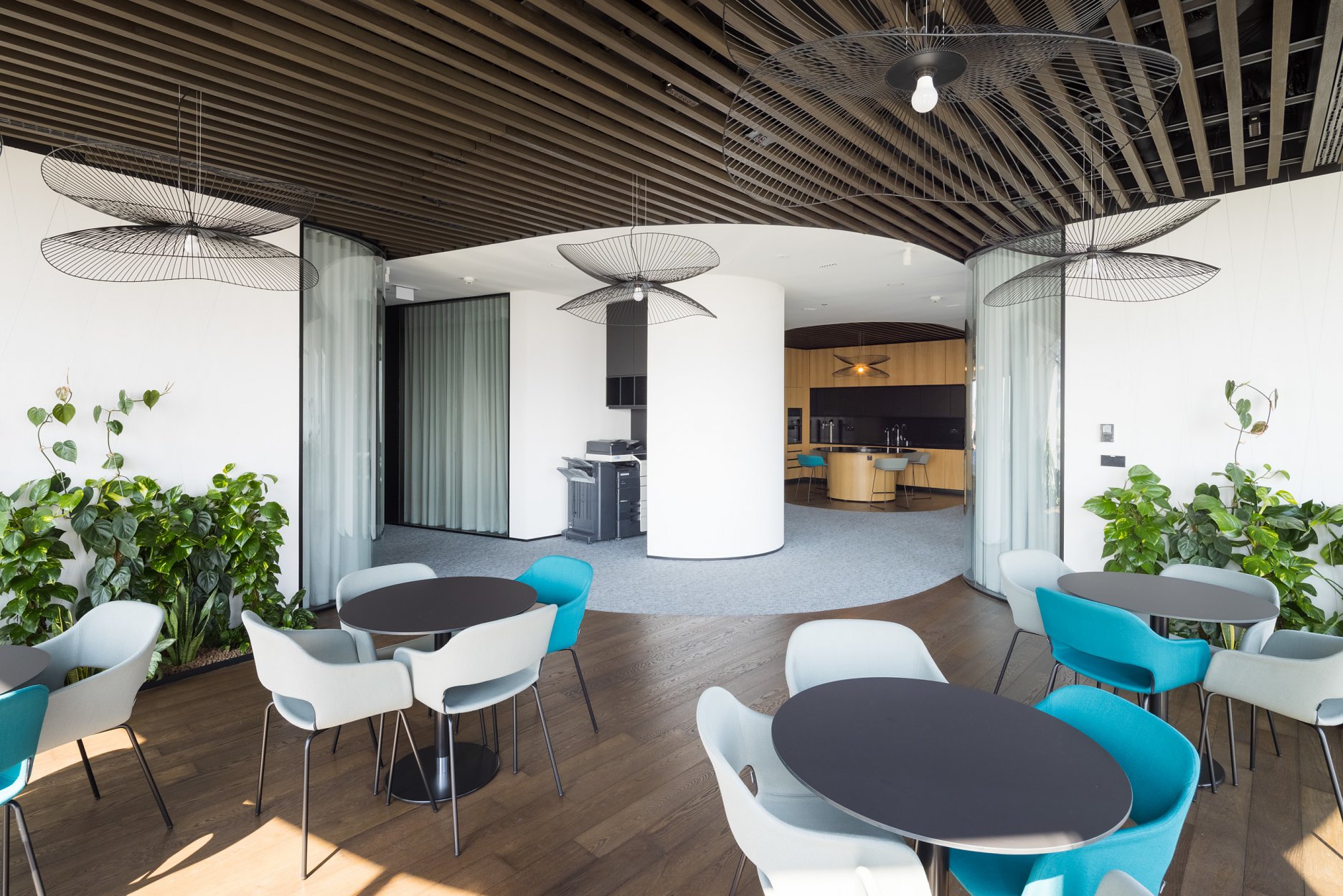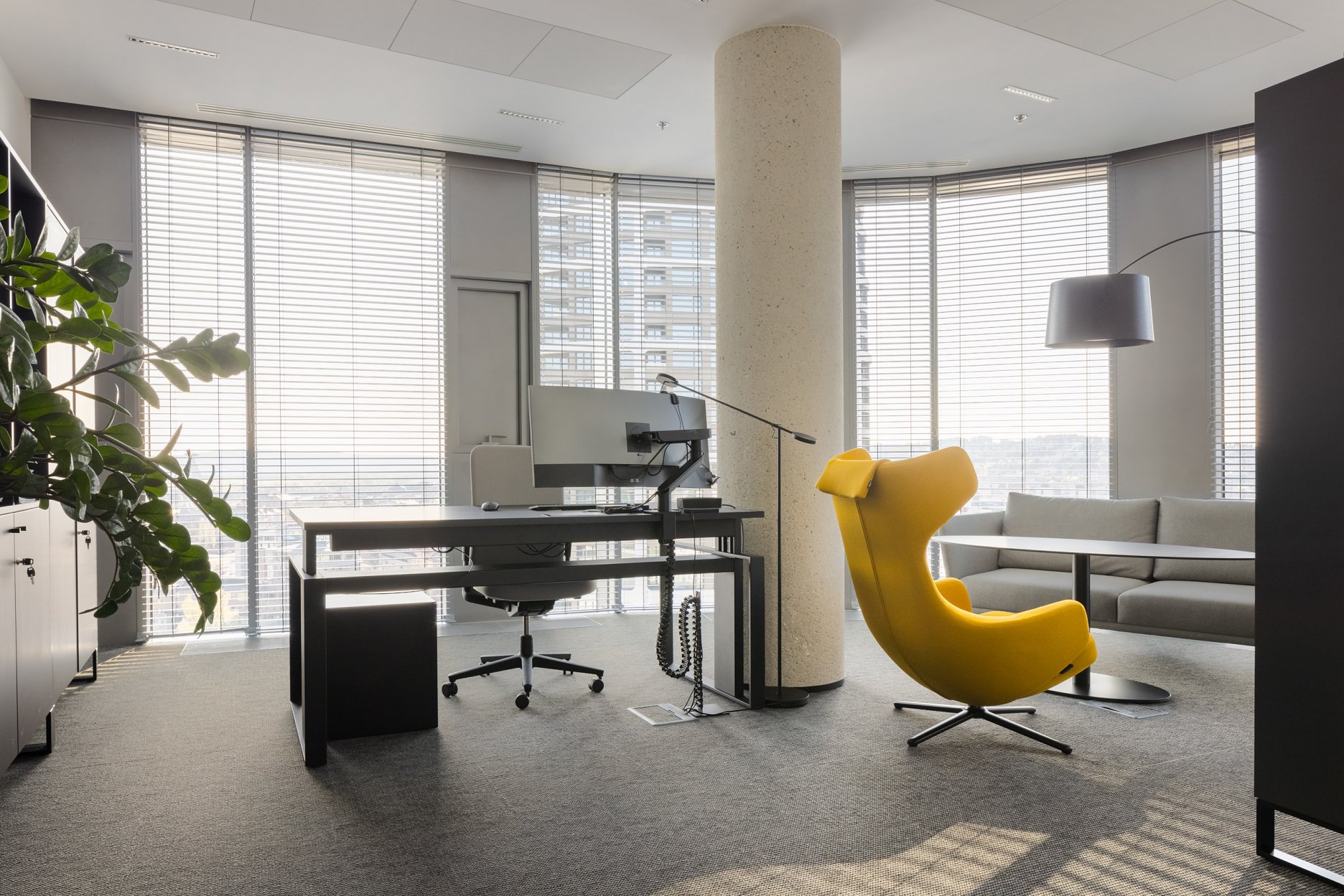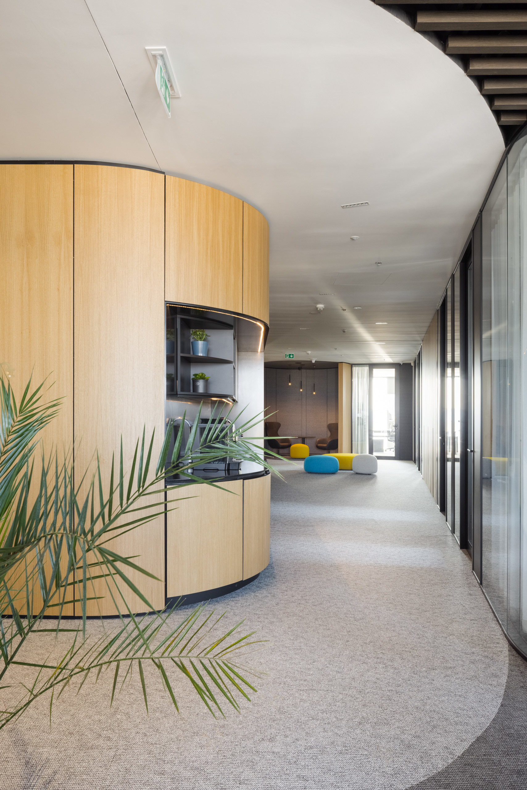 Paleta tradičných, ušľachtilých materiálov, ako drevené dyhy, či mosadzné intarzie je doplnená farebnými akcentmi kresiel, ostrovmi so zeleňou a odhaleným betónom stĺpov, ktoré interiér odľahčujú a robia ho menej formálnym. Veľký dôraz bol kladený na kvalitné spracovanie detailov, ako napríklad infotainment. Interiér je vyhotovený z materiálov s certifikátmi ekologickej udržateľnosti a recyklovaných materiálov. Kancelárske priestory sú vybavené špičkovým audiovizuálnym systémom pre organizáciu online konferencii.