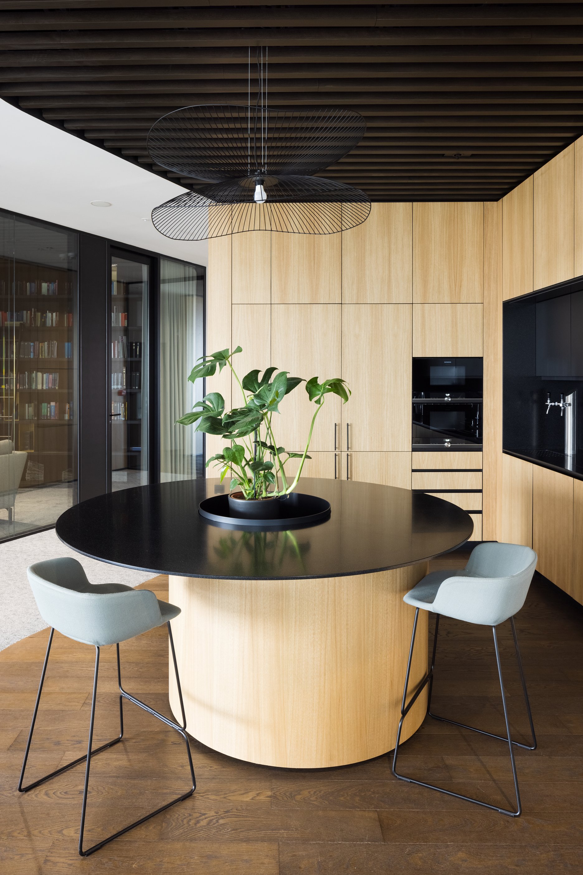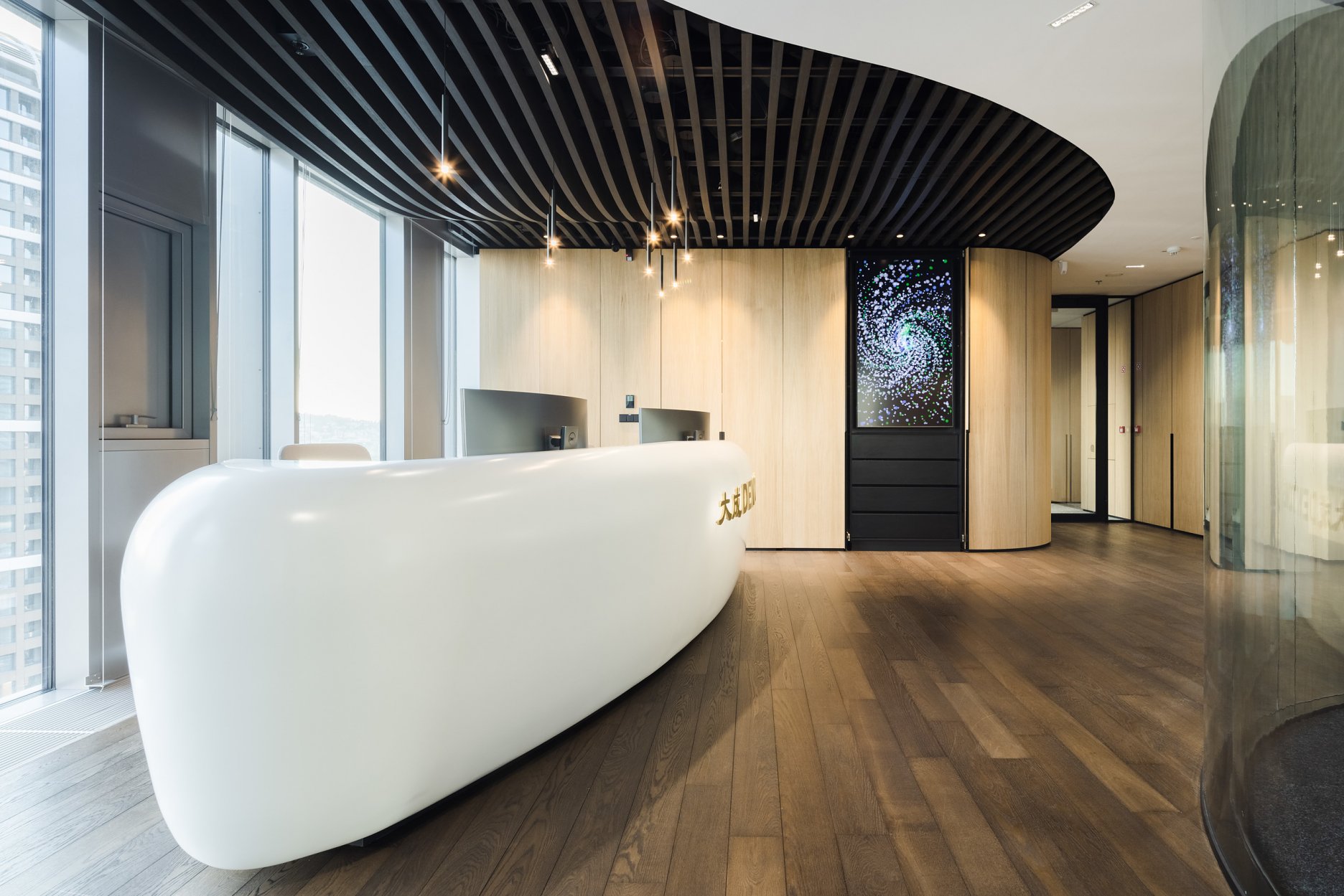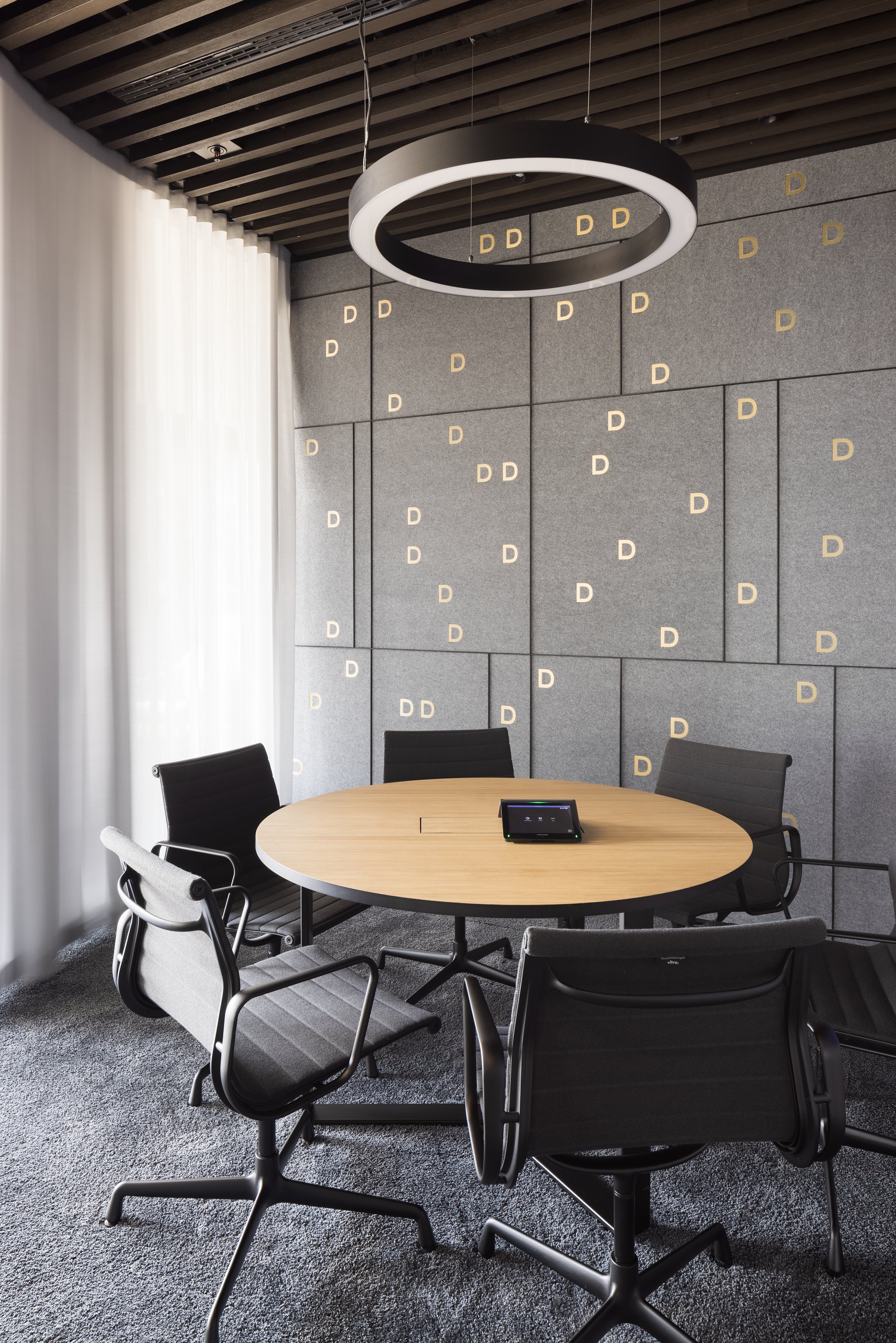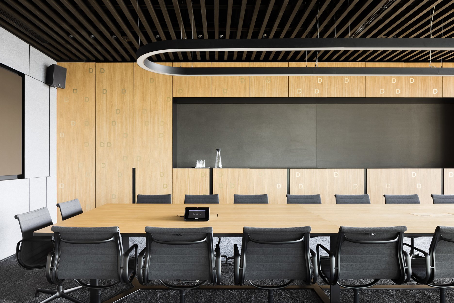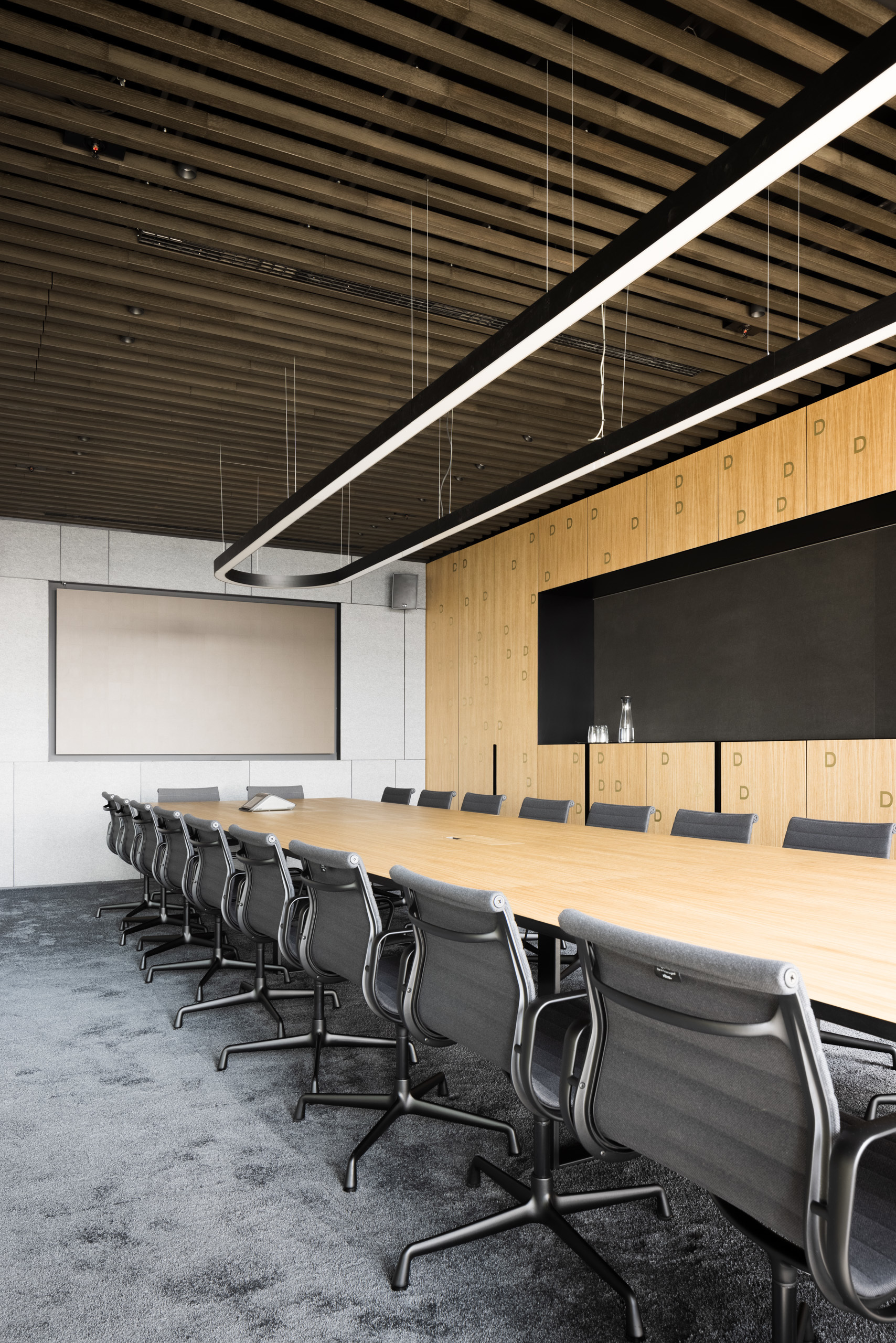 Paleta tradičných, ušľachtilých materiálov, ako drevené dyhy, či mosadzné intarzie je doplnená farebnými akcentmi kresiel, ostrovmi so zeleňou a odhaleným betónom stĺpov, ktoré interiér odľahčujú a robia ho menej formálnym. Veľký dôraz bol kladený na kvalitné spracovanie detailov, ako napríklad infotainment. Interiér je vyhotovený z materiálov s certifikátmi ekologickej udržateľnosti a recyklovaných materiálov. Kancelárske priestory sú vybavené špičkovým audiovizuálnym systémom pre organizáciu online konferencii.