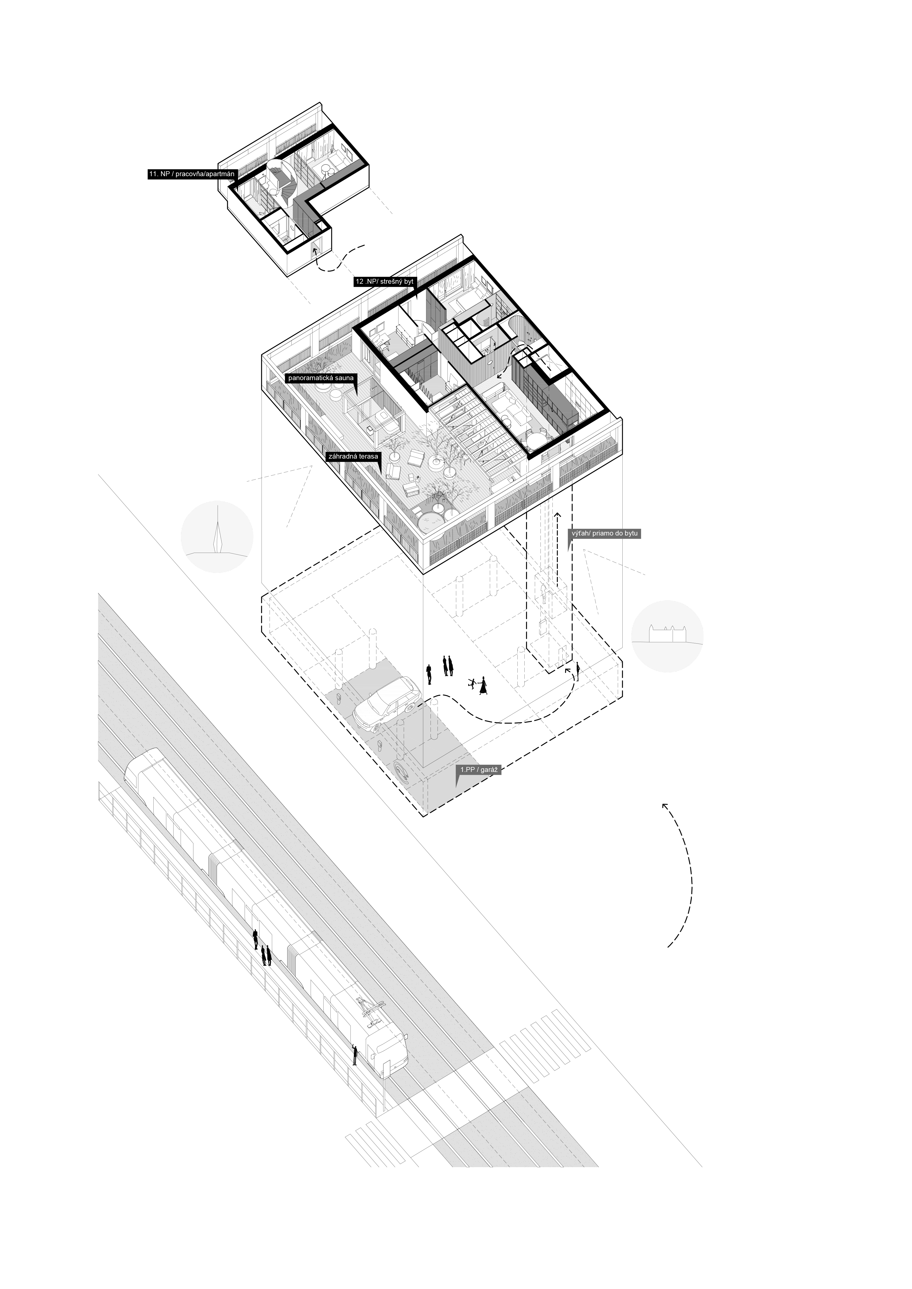 Interiérové priestory sú z prevádzkového hľadiska delené na tri základné celky. Menšia časť bytu, sa nachádza na 11. N.P. Z funkčného hľadiska predstavuje samostatný celok so súkromnou pracovňou majiteľa, hosťovskou izbou a obslužnými/úložnými priestormi. Z haly, vizuálne predeľujúcej pracovňu a hosťovskú izbu sa po subtílnom kovovom točitom schodisku dostaneme do priestorov nočnej zóny. Nachádza sa tu samostatné krídlo rodičovskej spálne s vlastnou kúpeľňou. Na opačnej strane nájdeme zas dve detské izby s priamym východom do exteriéru. Centrom rodinného života je aj v tomto prípade otvorená denná zóna na 12. NP, nachádzajúca sa v priamom kontakte s terasou.