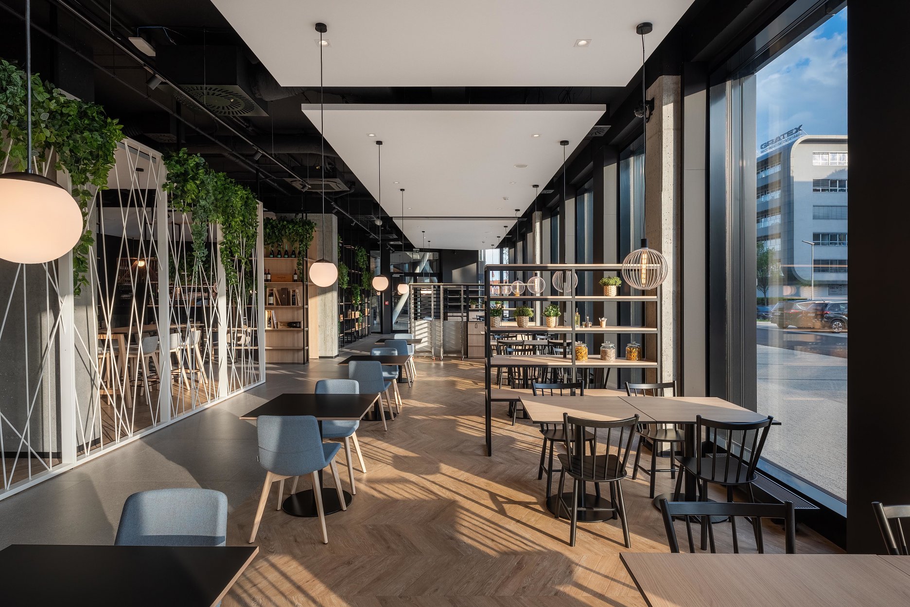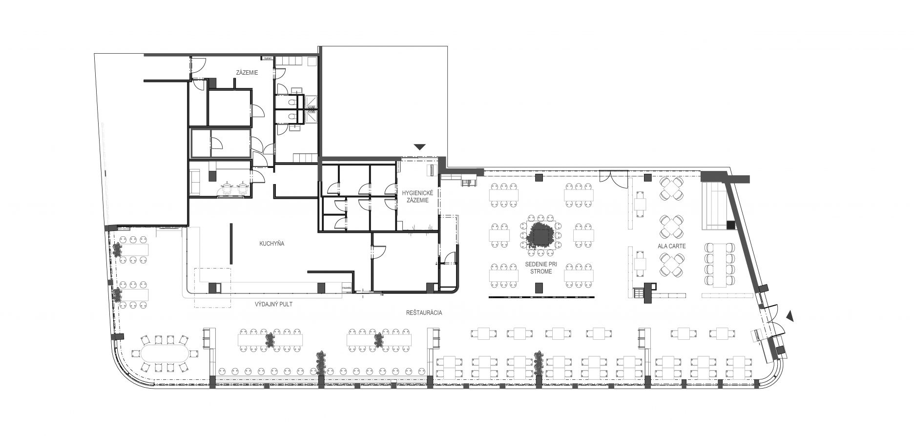 Variabilný mobiliár v odbytových častiach reštaurácií umožňuje jednoduchú adaptáciu priestorov pre rôzne spoločenské akcie. K reštaurácii prislúcha aj menšia terasa vo vnútornom átriu.