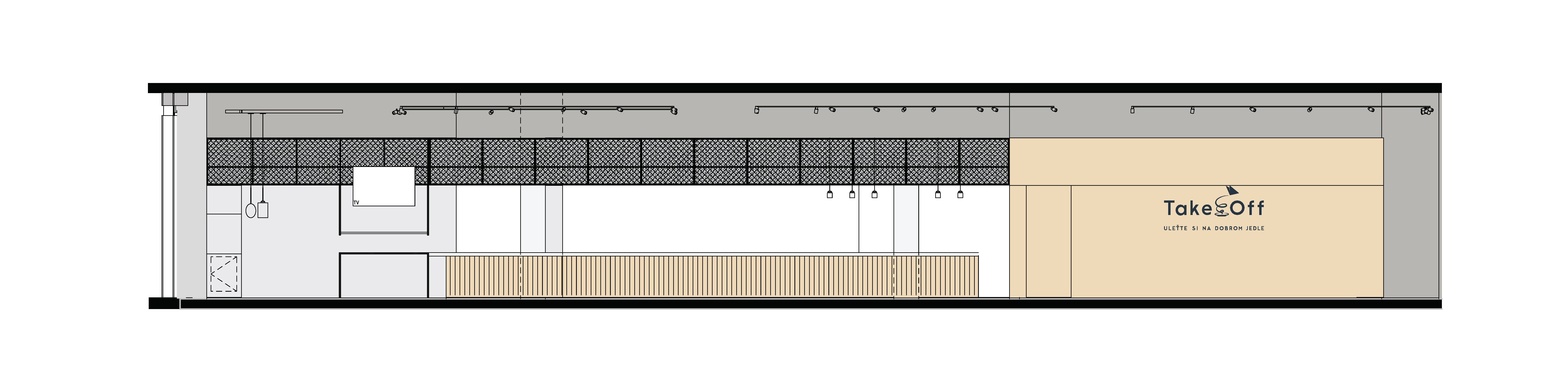 Otvorenú dispozíciu členia atypické vertikálne deliace prvky ako zavesené konštrukcie, alebo subtílne otvorené police. Rôzne materiály podláh, spolu s omietkami a obkladmi na stenách zvýrazňujú spomínané členenie prevádzky a tvoria vodiace línie pre lepšiu orientáciu v priestore.