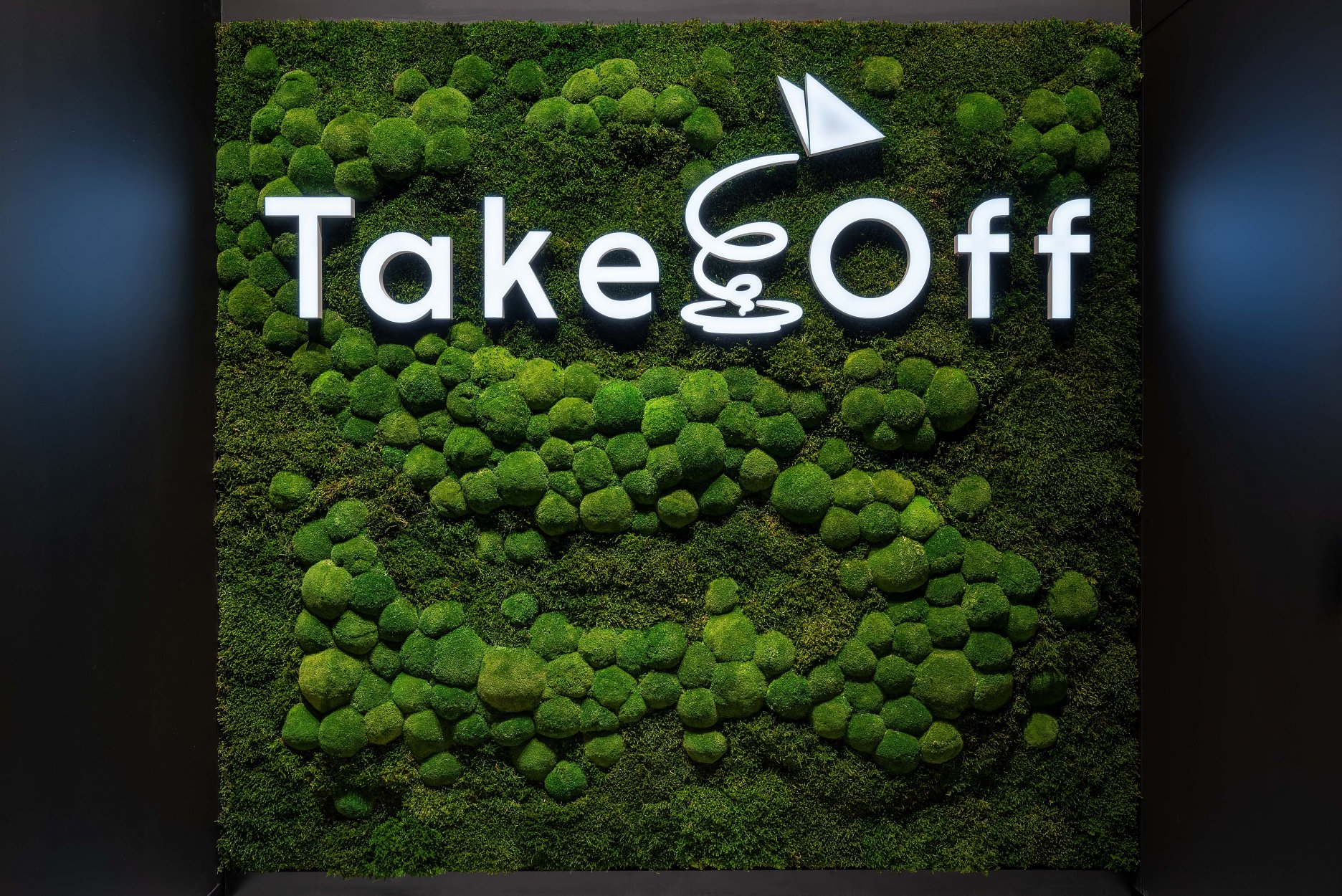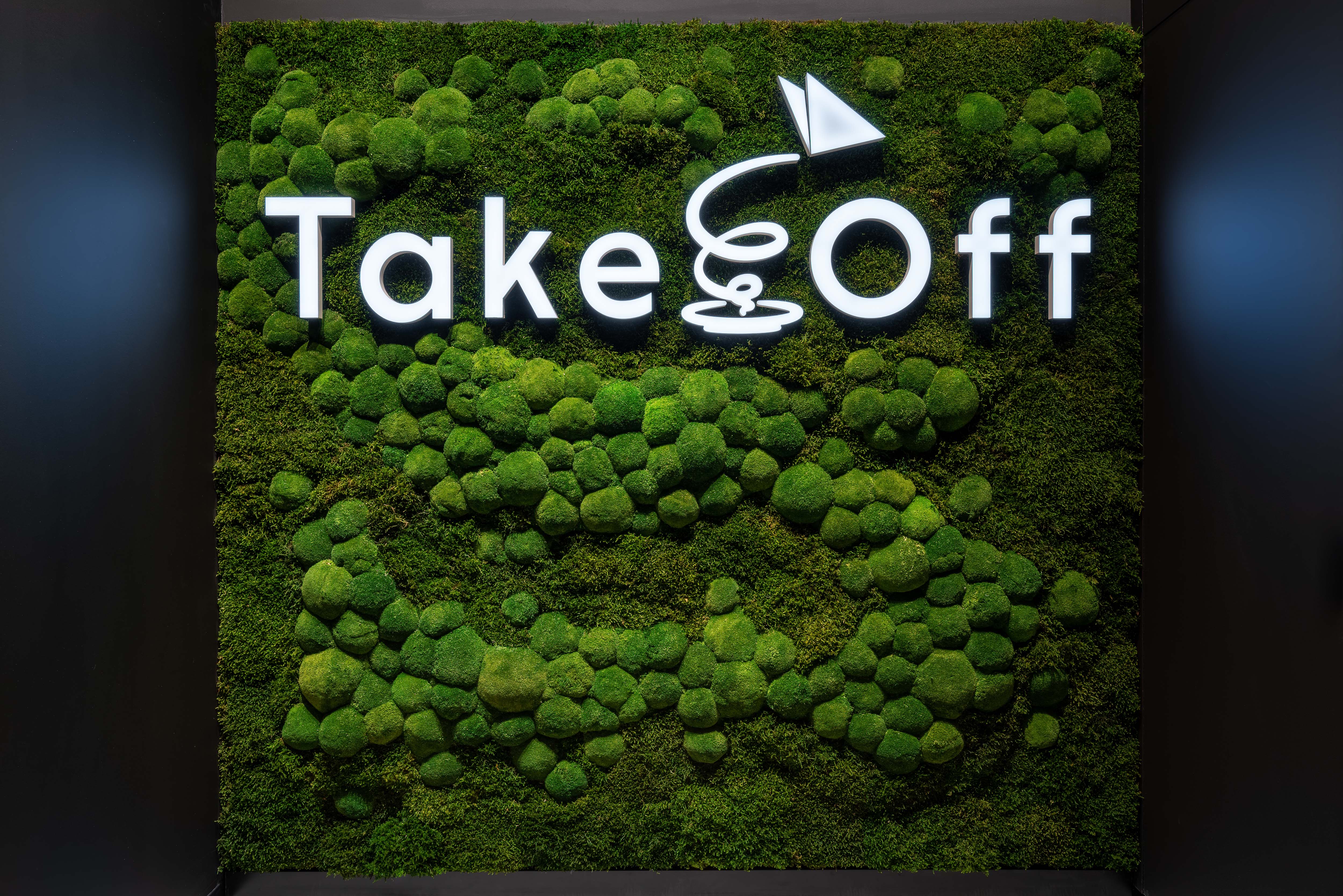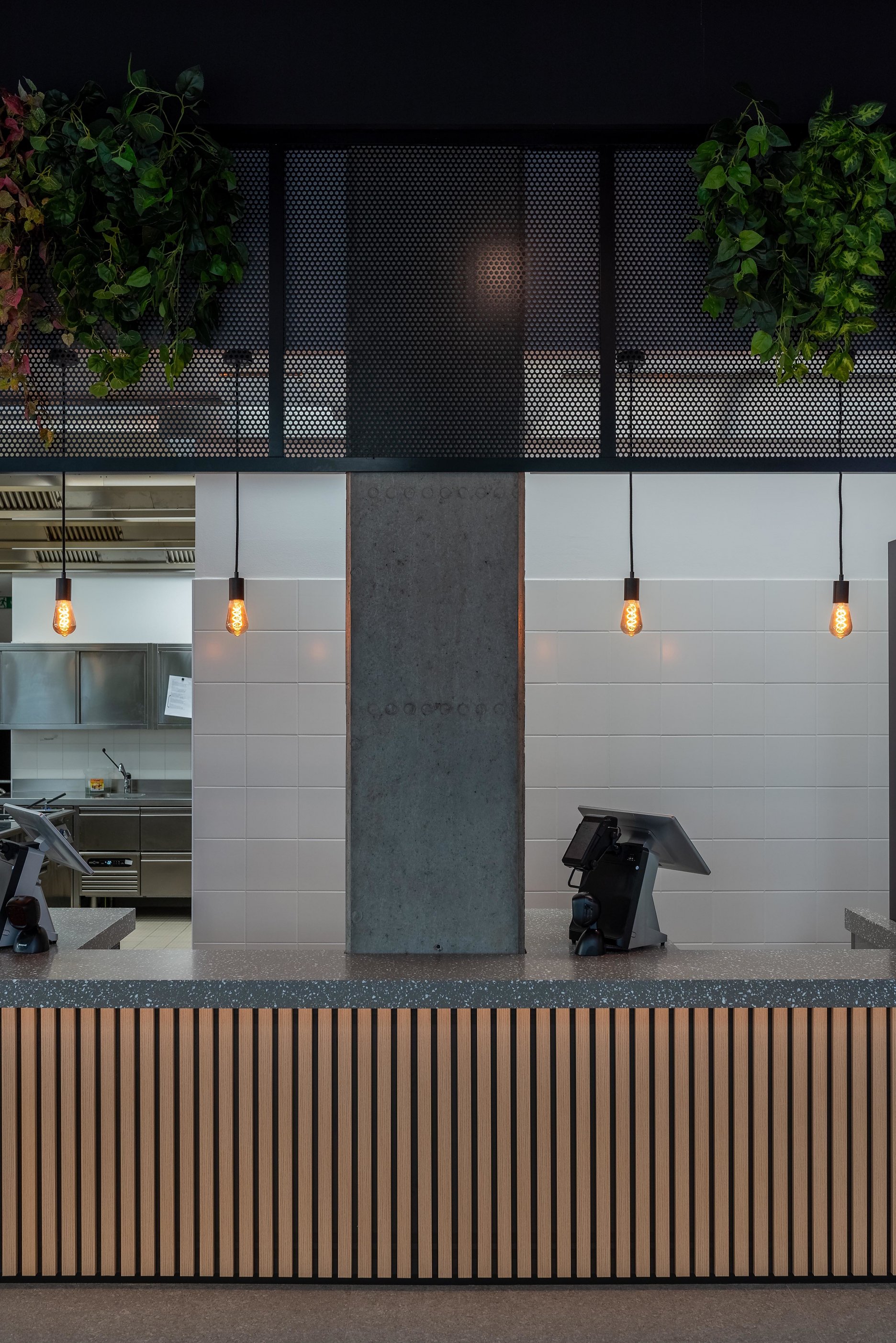 Neobvyklým prvkom je živý strom umiestnený v ťažisku priestoru. Na podlahy zvolili autori kombináciu gresovej dlažby, dubového dreva s rybinovým vzorom a linolea so vzorom svetlého terazza. Obklady, stierky a nástreky podporujú horizontálne členenie priestoru. Nadväzujúci mobiliár kombinuje monochromatické povrchy s výraznou textúrou dreva.