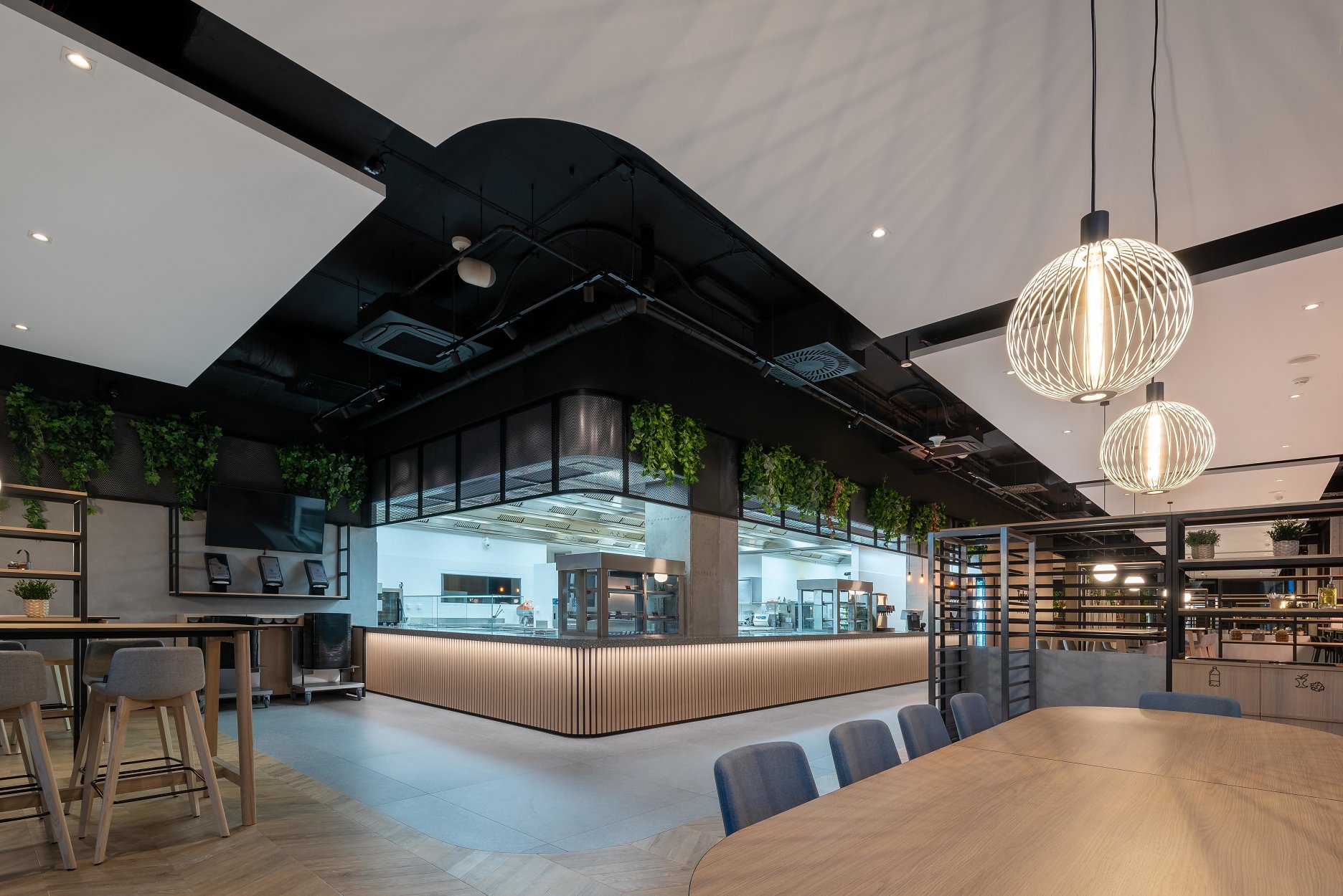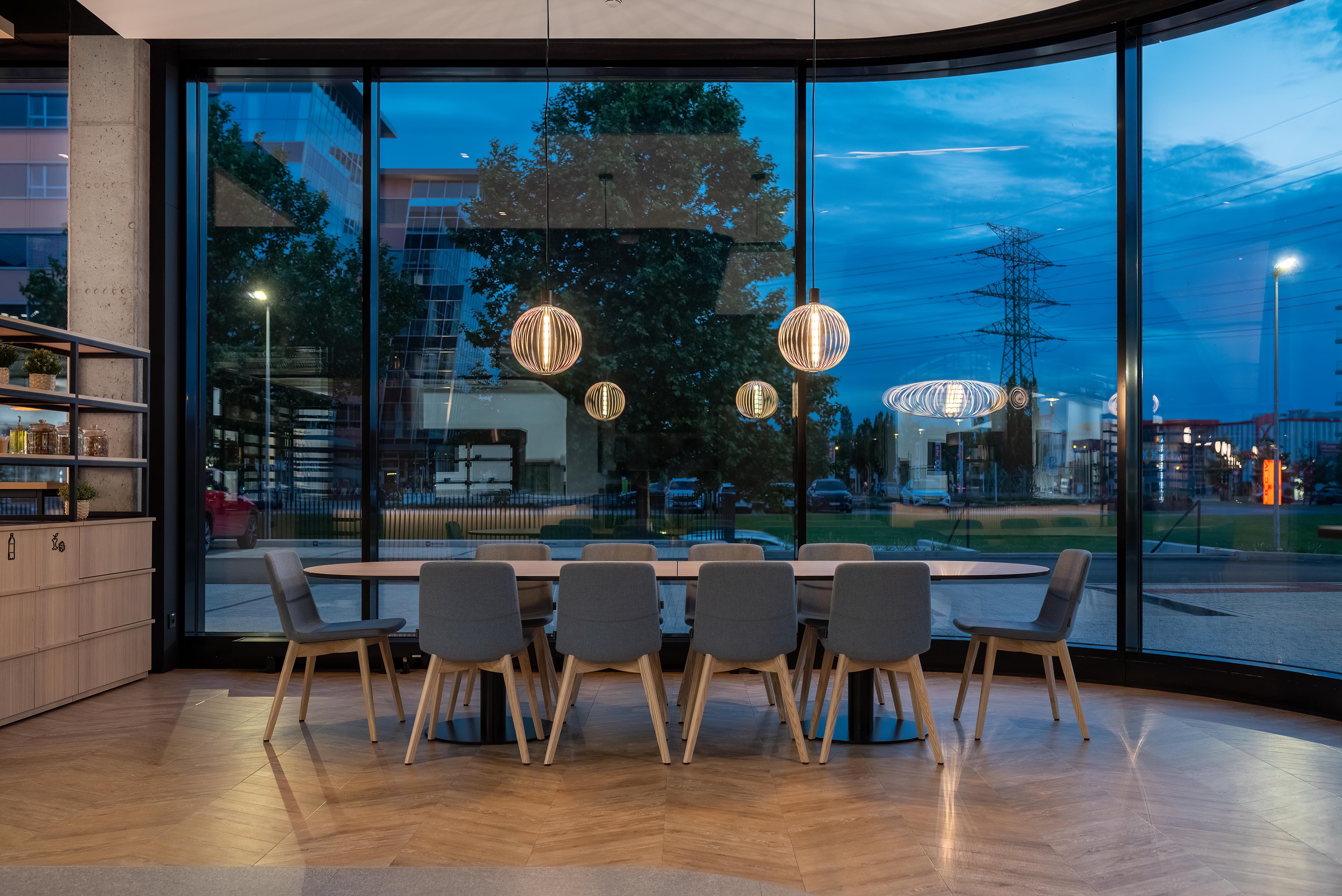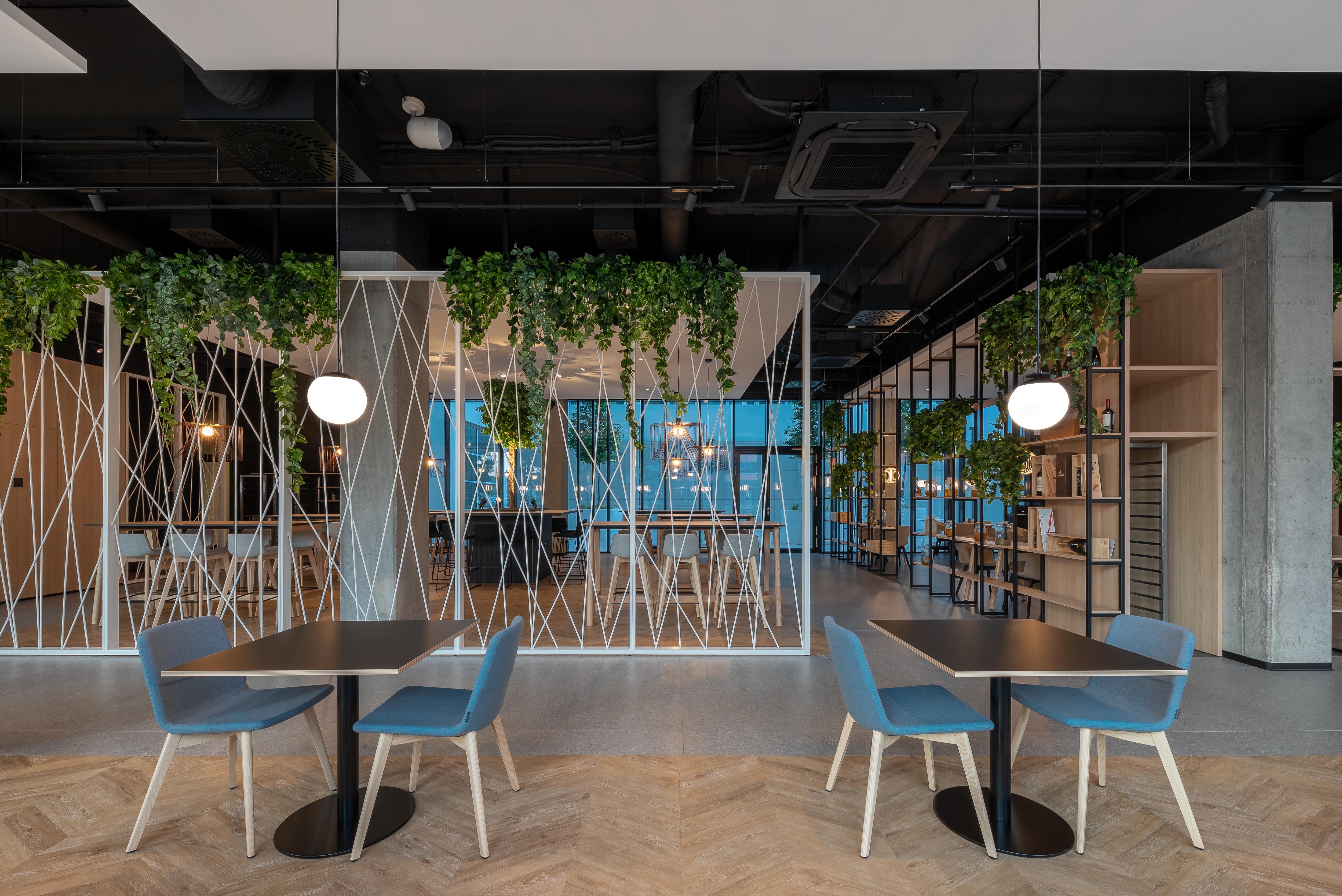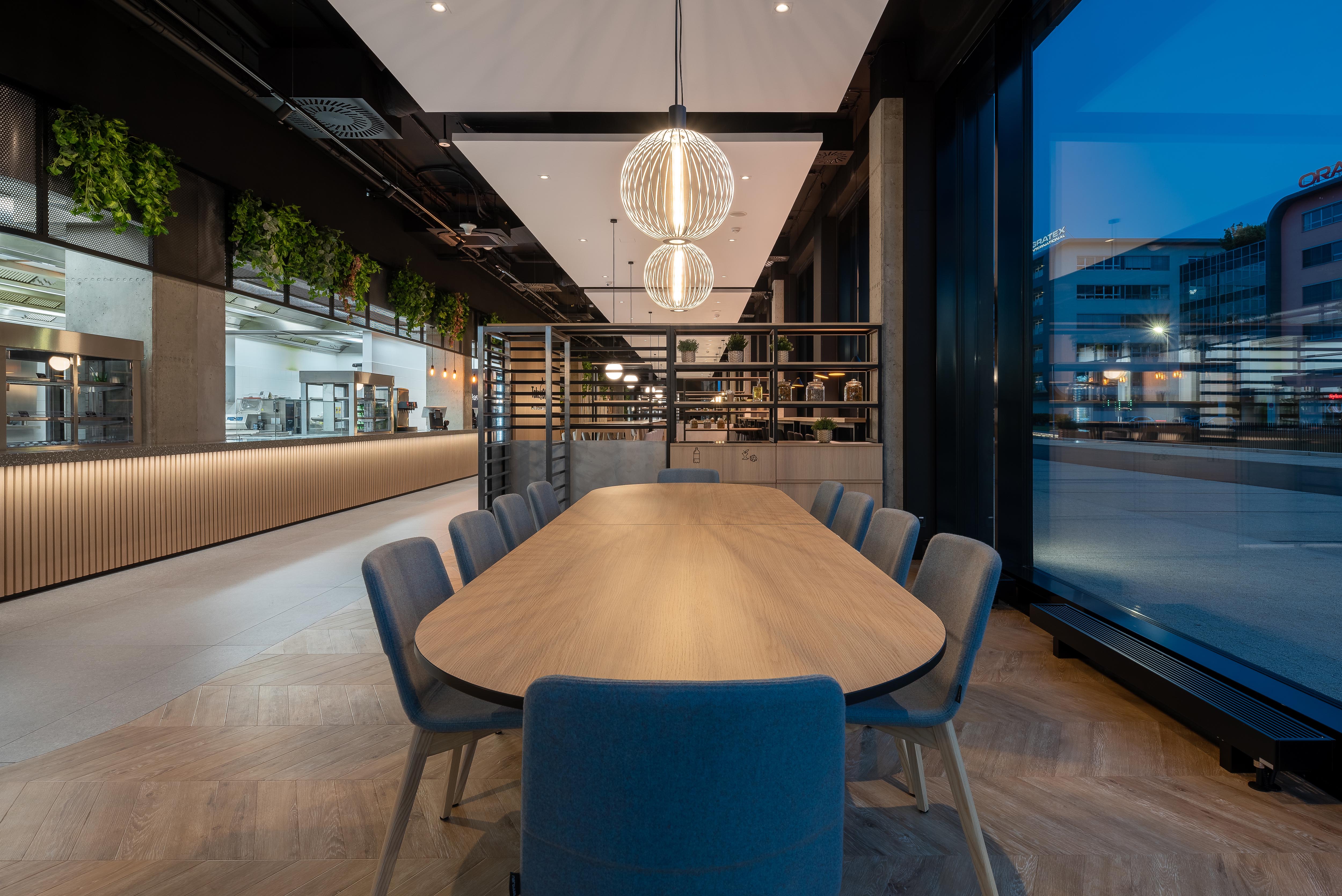 Otvorený strop, doplnený o zavesené akustické panely a o viaceré typy zavesených svietidiel, dotvára atmosféru interiéru.