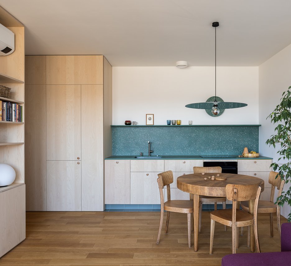 Zelené terrazzo prvky nesú osobný odkaz na obľúbenú farbu majiteľky a podčiarkujú jemnú hravosť celého interiéru.