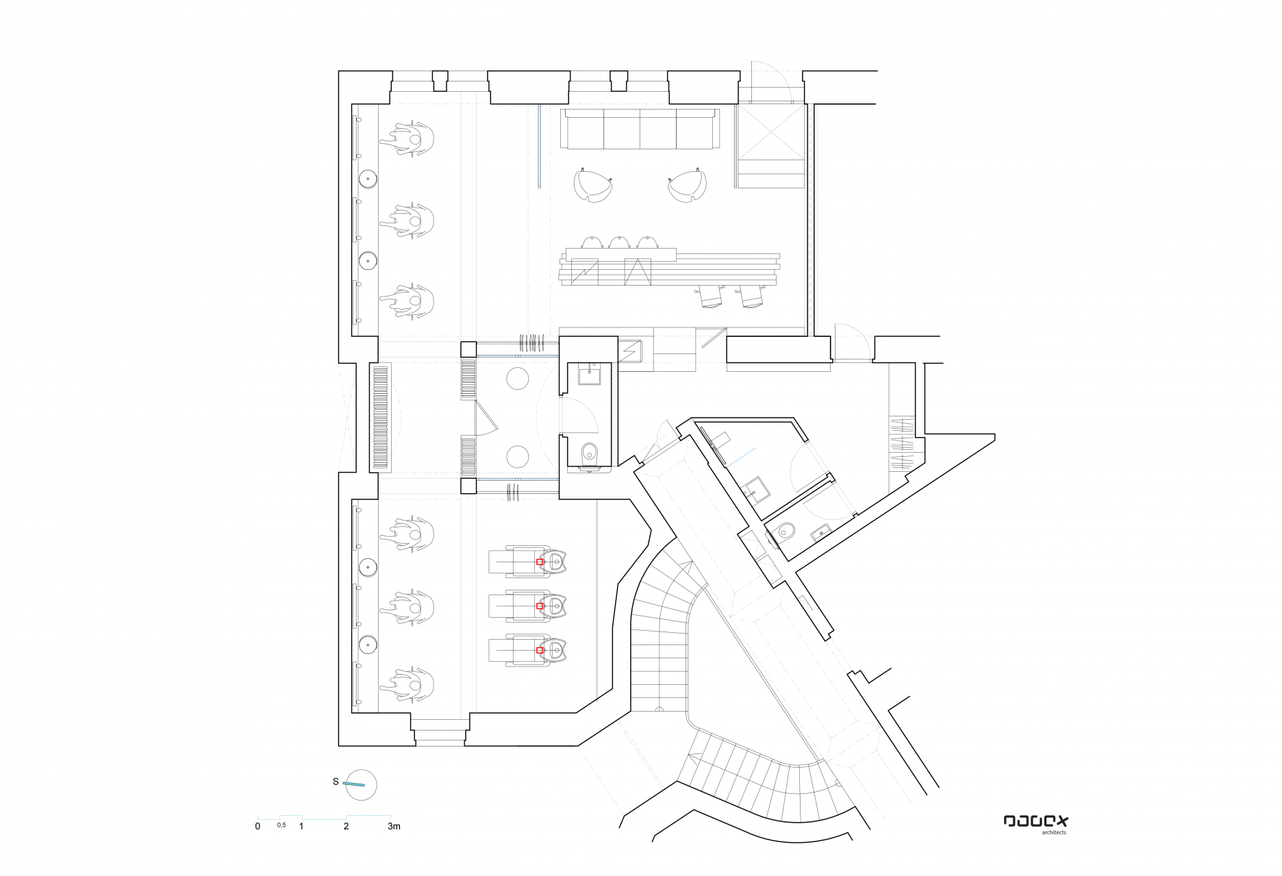 Vymedzený priestor umožnil rozdelenie jednotlivých funkcií bez výrazných stavebných zásahov. Zázemie je umiestnené za barom, z priestoru pre hostí je prístupná toaleta. Hlavný priestor prevádzky oddeľuje koridor s policami. Zo zúženého priestoru je prístupná toaleta. Poslednou miestnosťou je oddelená časť s holiacimi kreslami a umývacími pultmi. (Virtuálnu prehliadku priestoru nájdete na tomto linku).