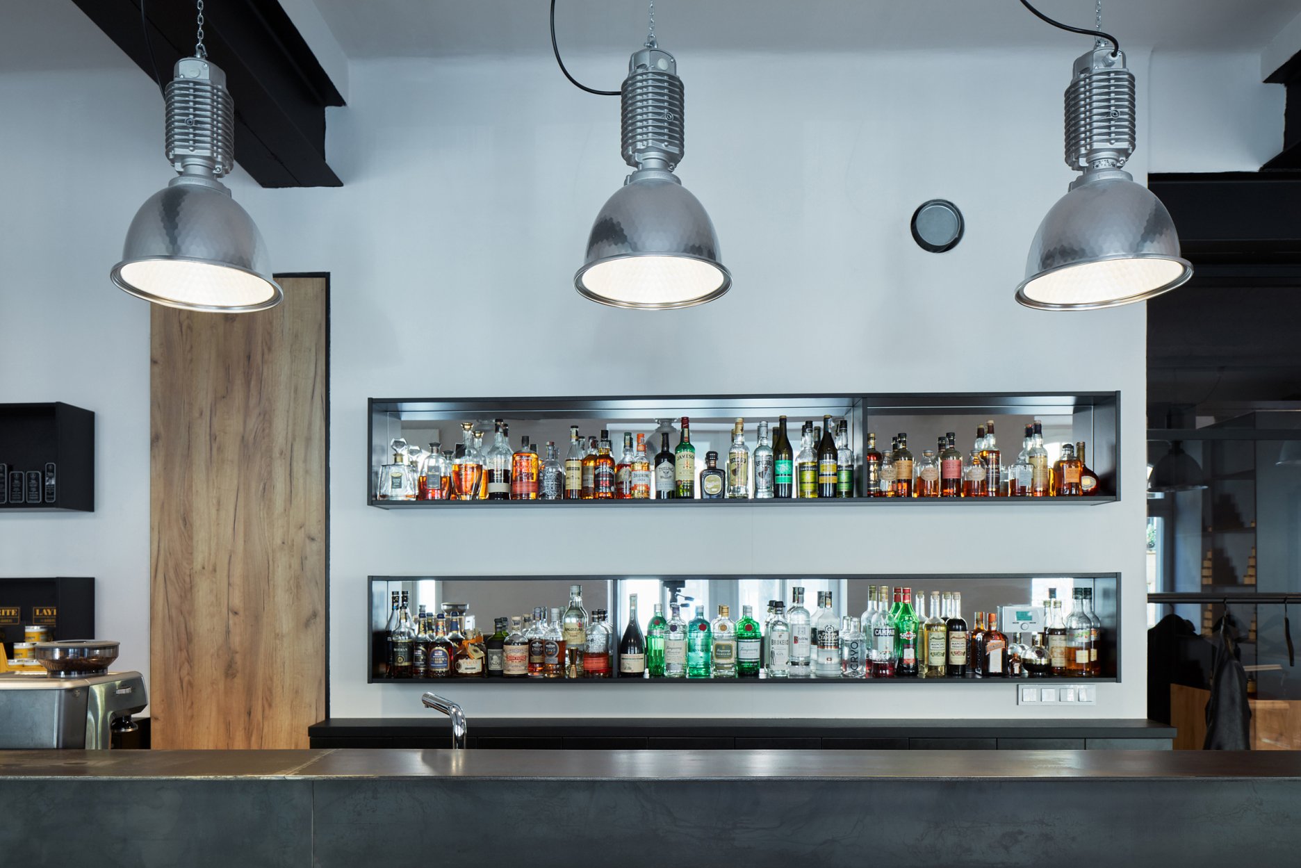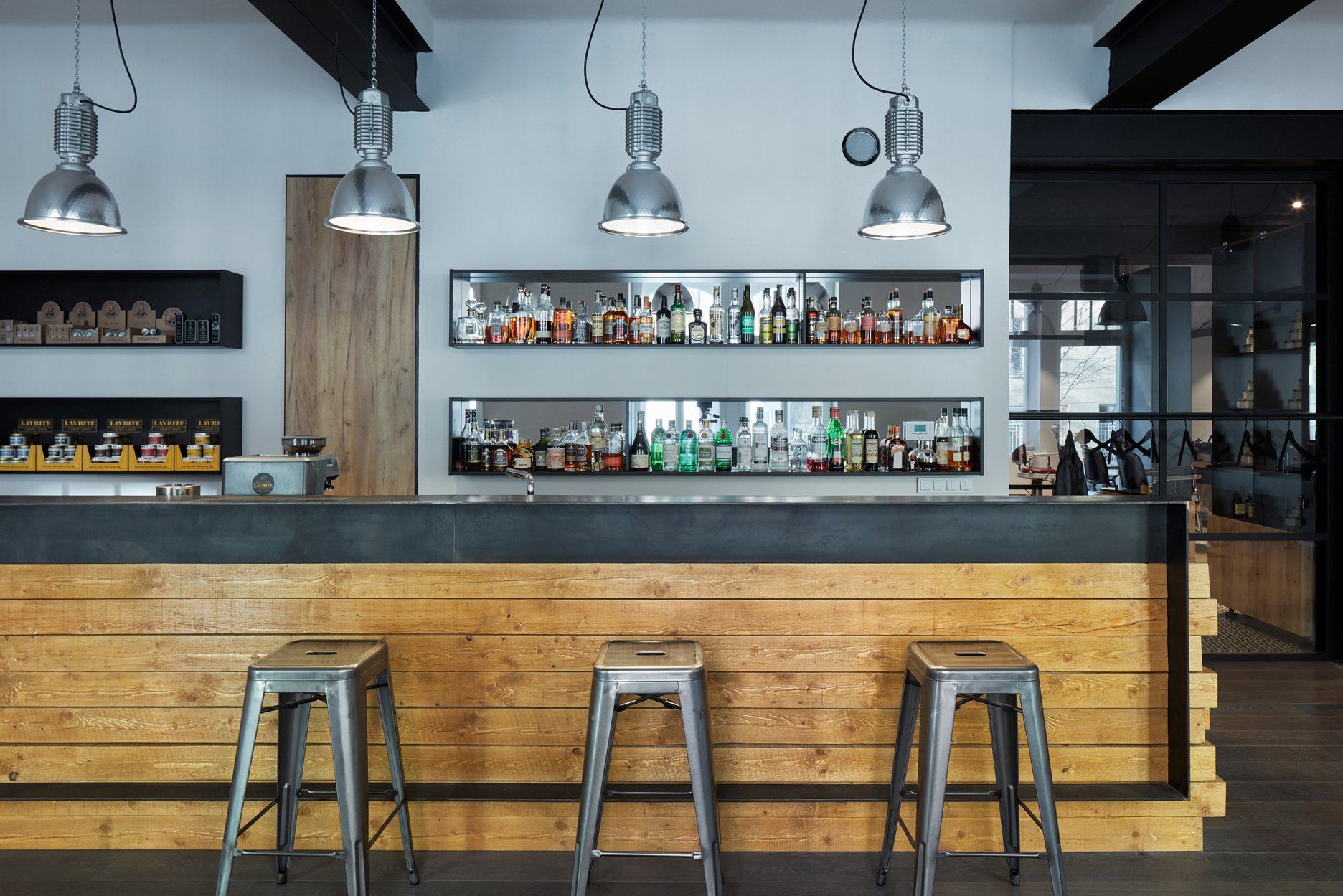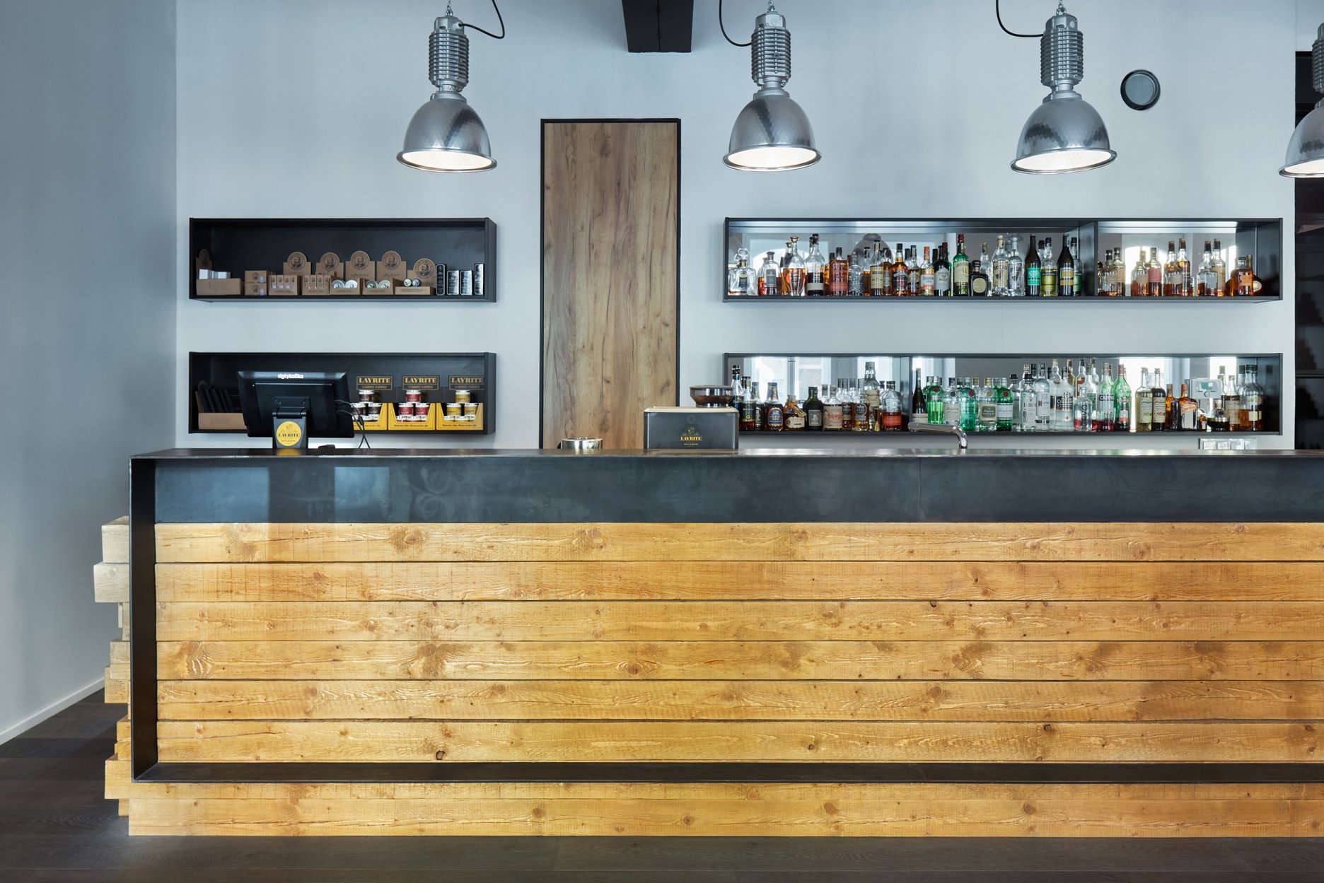 Je vytvorený z masívnych trámov, ktoré majú nepravidelne zakončené bočné hrany. Vyvýšená oceľová konštrukcia zakrýva barový pult a slúži zároveň aj ako opierka na nohy. Oproti baru je umiestnená stará kožená sedačka, ktorá odkazuje na klasické americké holičstvá.