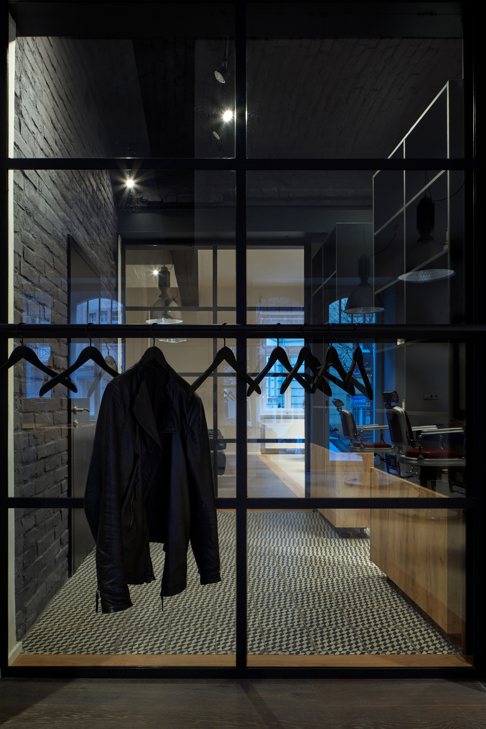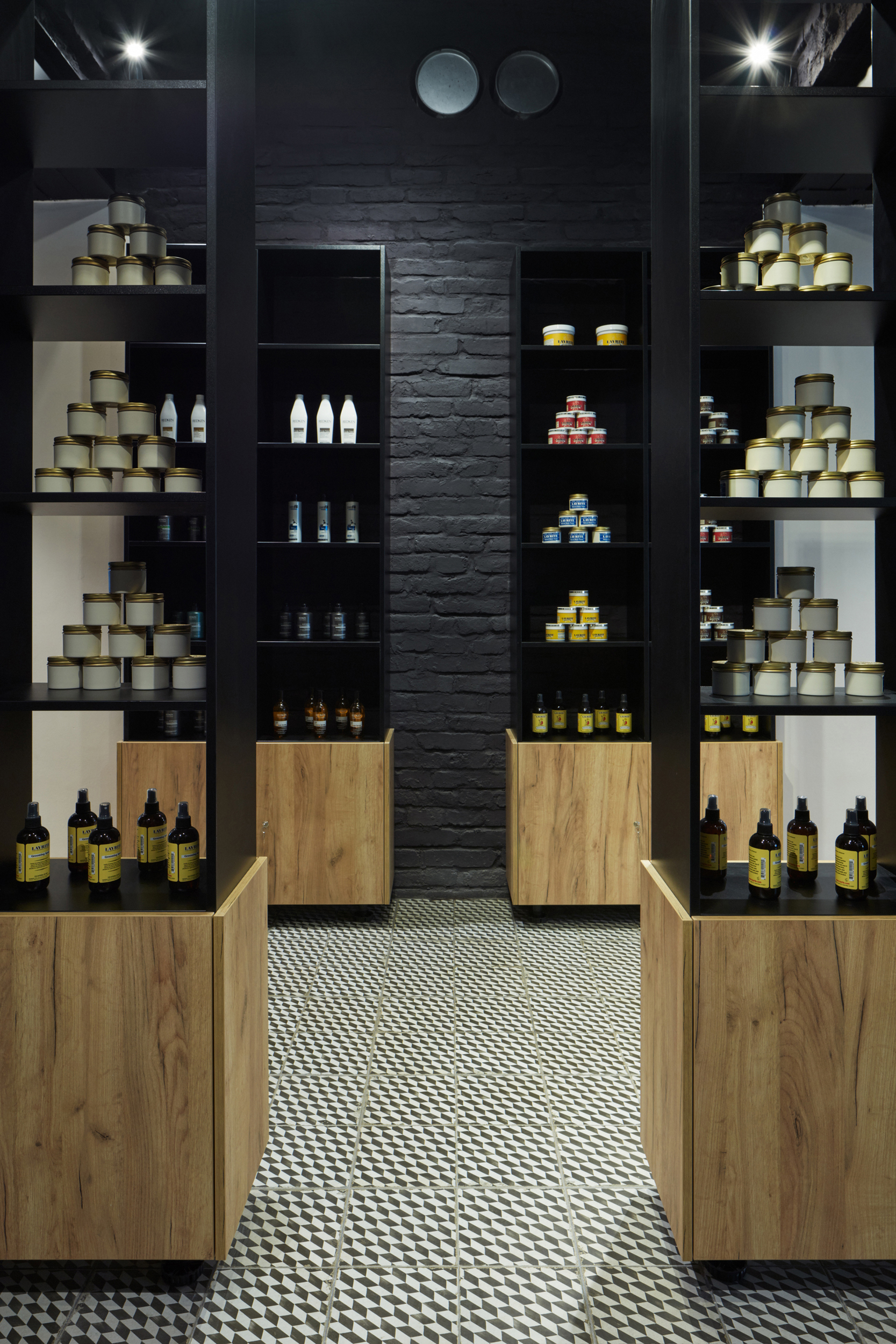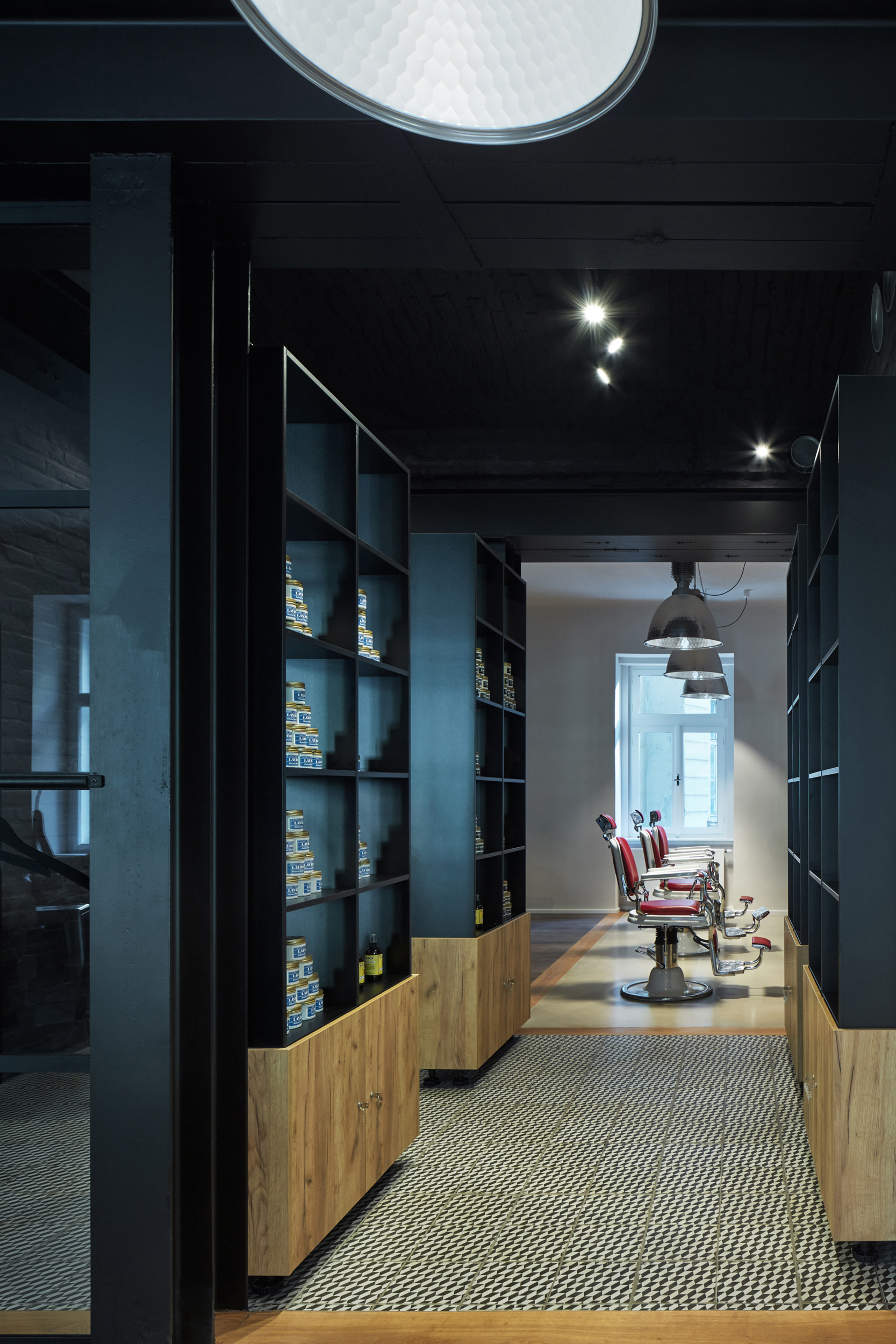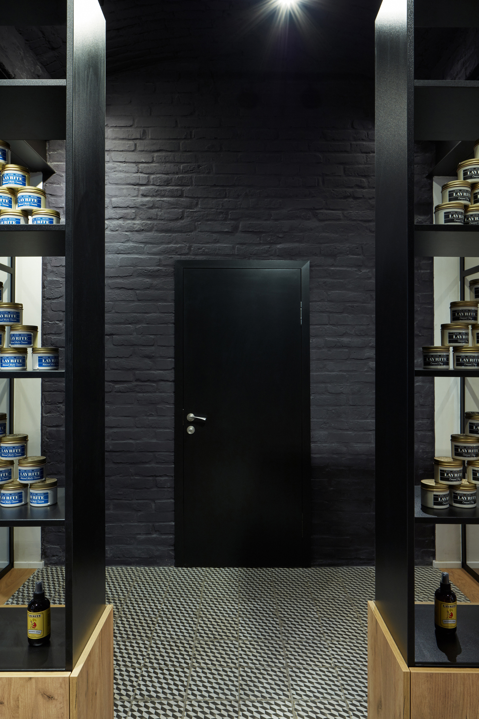 Jednotlivé priestory na holenie sú oddelené tmavým koridorom, ktorý slúži na prezentáciu kozmetických produktov. Z priestoru za sklenenou priečkou je prístupná toaleta pre hostí. Povrchy v tejto časti sú obité až na tehlu a natreté čiernou farbou. Pred sklenenou priečkou sú osadené vodorovné oceľové trubky, ktoré slúžia na zavesenie vešiakov a odkladanie kabátov. V tejto časti je na podlahe použitá keramická dlažba s výrazným geometrickým vzorom.