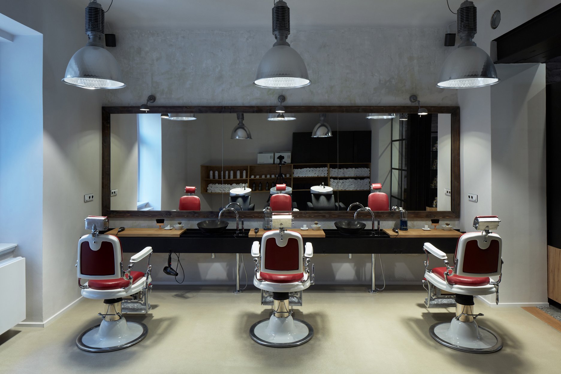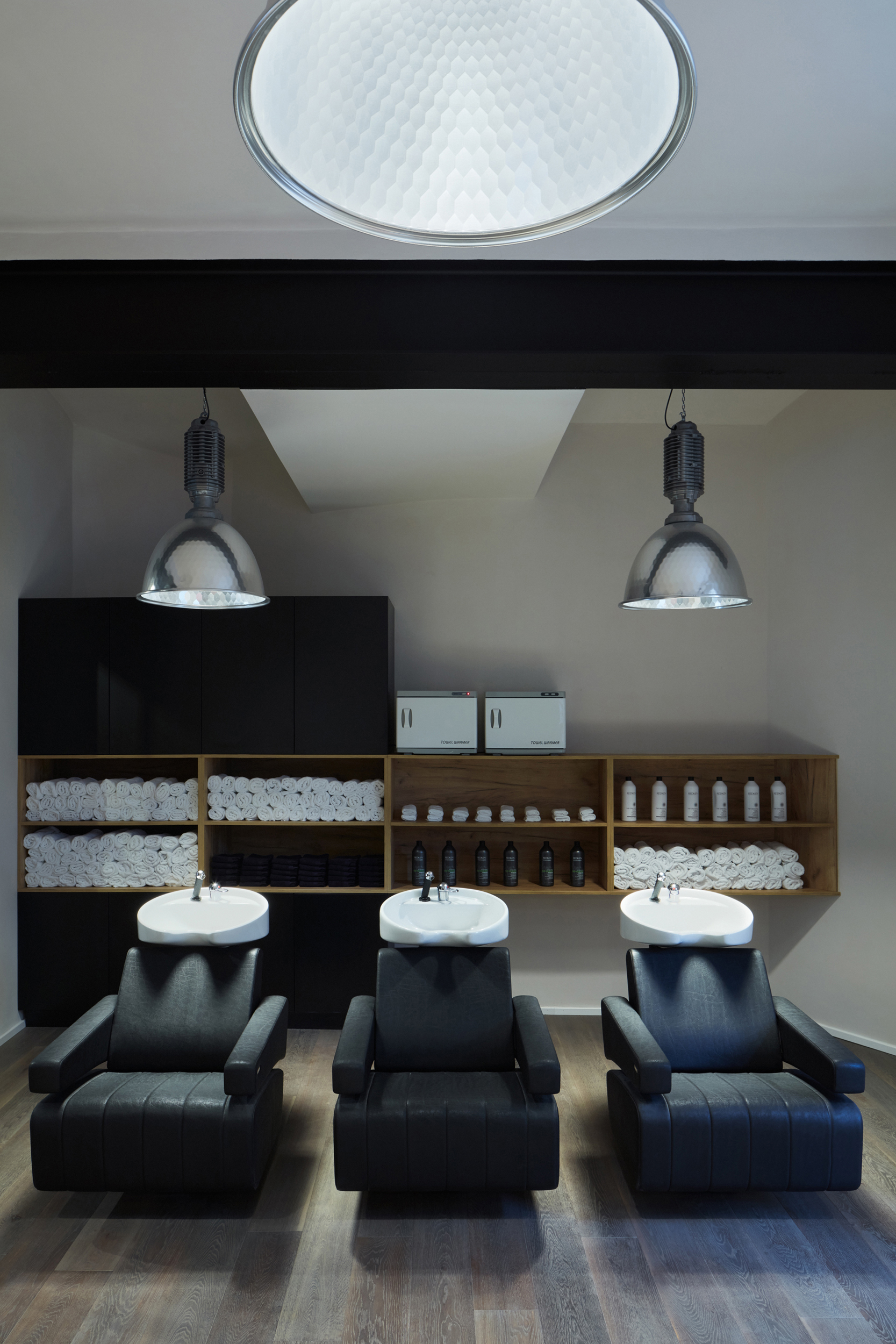 Pulty sú vyrobené z dvoch oceľových nosníkov, na ktorých je osadené umývadlo a pomedzi nosníky prechádzajú voľne stojace batérie. Na nosníky sú osadené drevené dosky, ktoré slúžia na odkladanie kozmetiky. Zásuvky na strojčeky a fény sú skryté v zadných hranách nosníkov. Každé miesto je vybavené kreslom v retro dizajne v červenej koži. Steny za zrkadlami sú oškrabané až na omietku, a na celú šírku steny je umiestnené zrkadlo. Podlahy v priestore na holenie sú betónové.