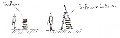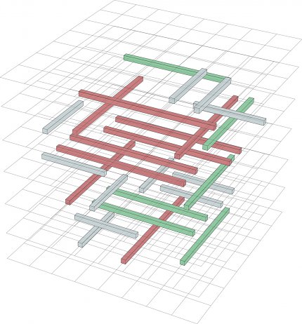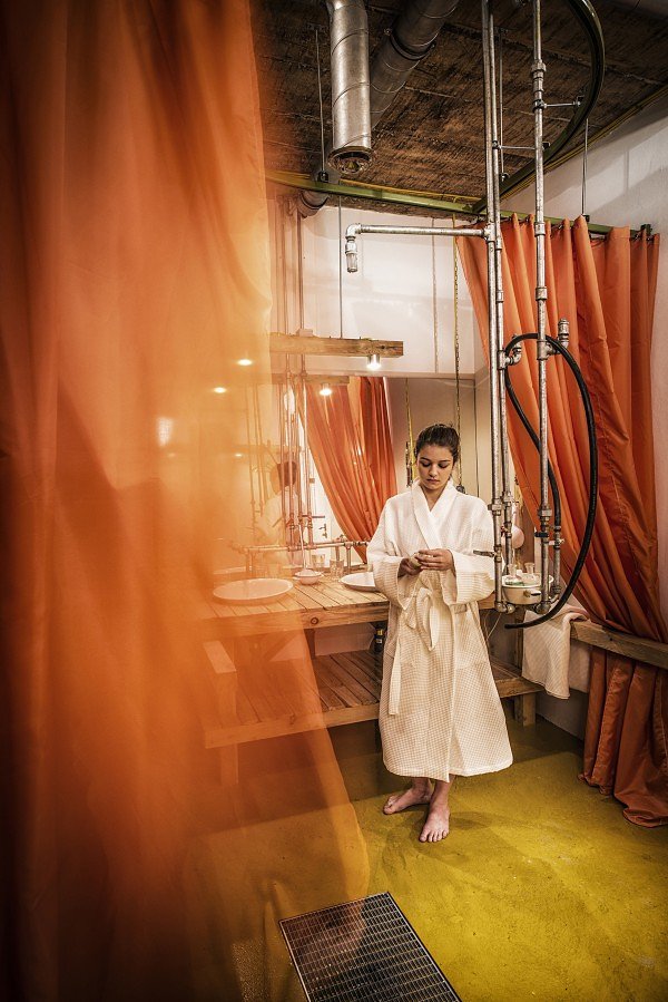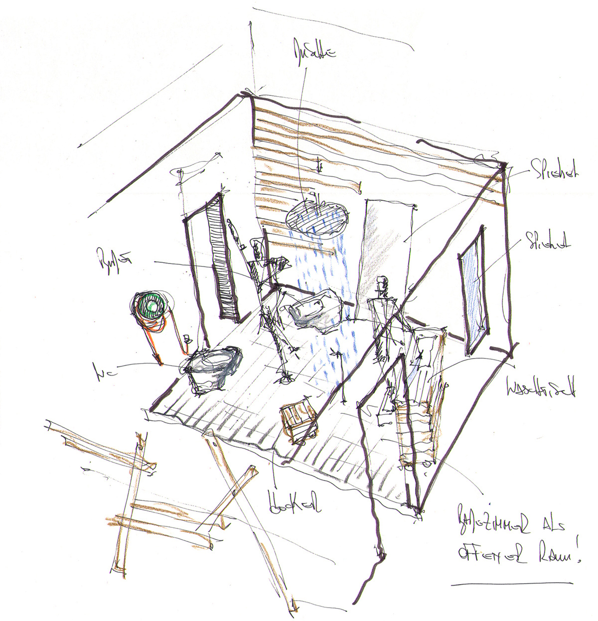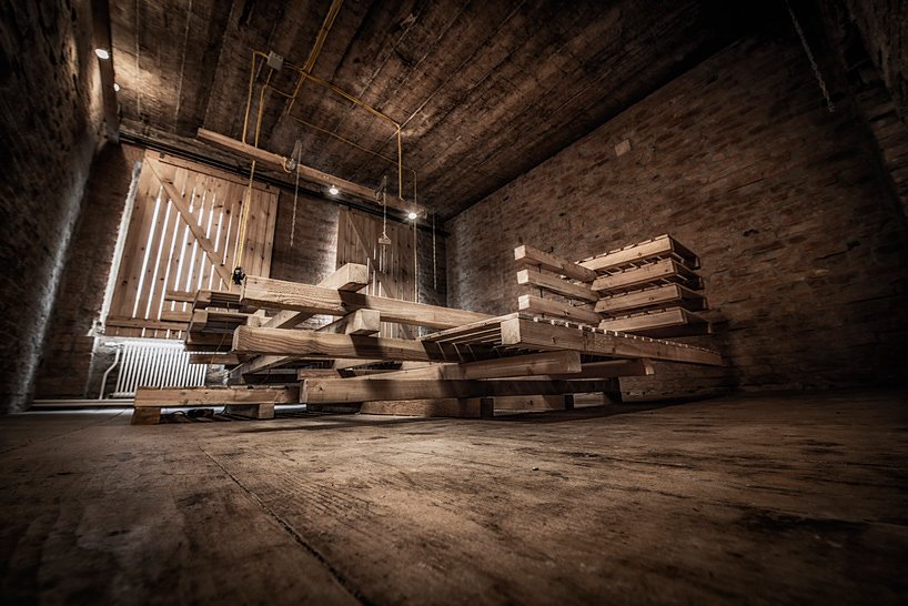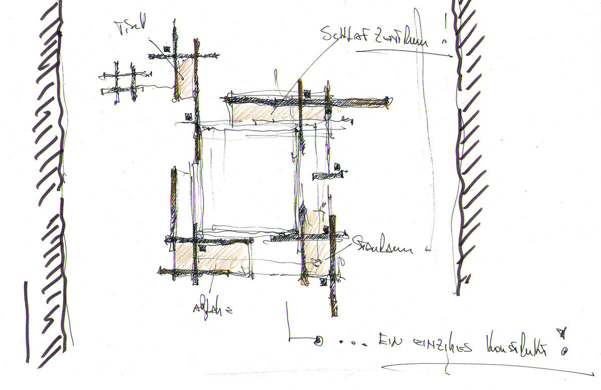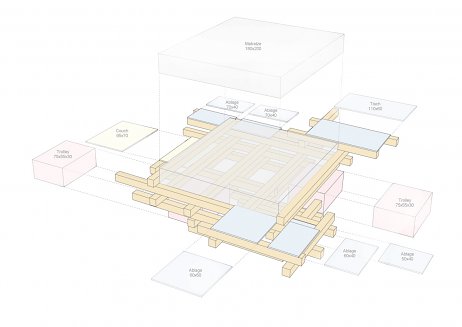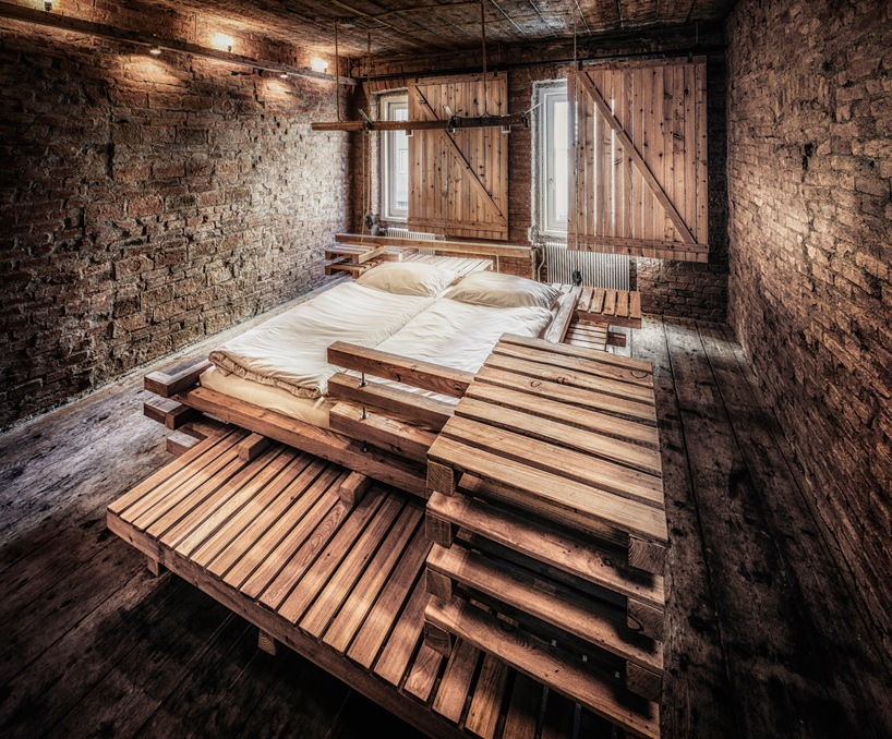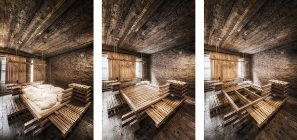Surové štvorcové trámy vytvárajú centrálny priestor na spanie, využité môžu byť aj okolité plochy. Plnia všetky základné účely, čo hosť potrebuje. Ďalší nábytok nie je nutný.