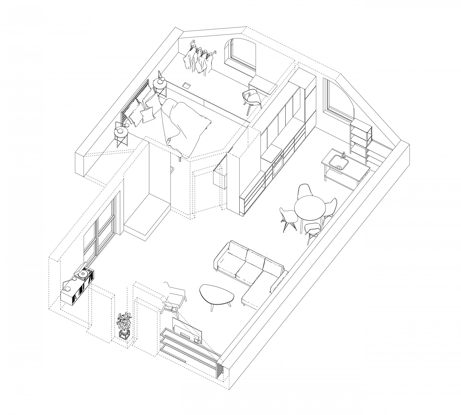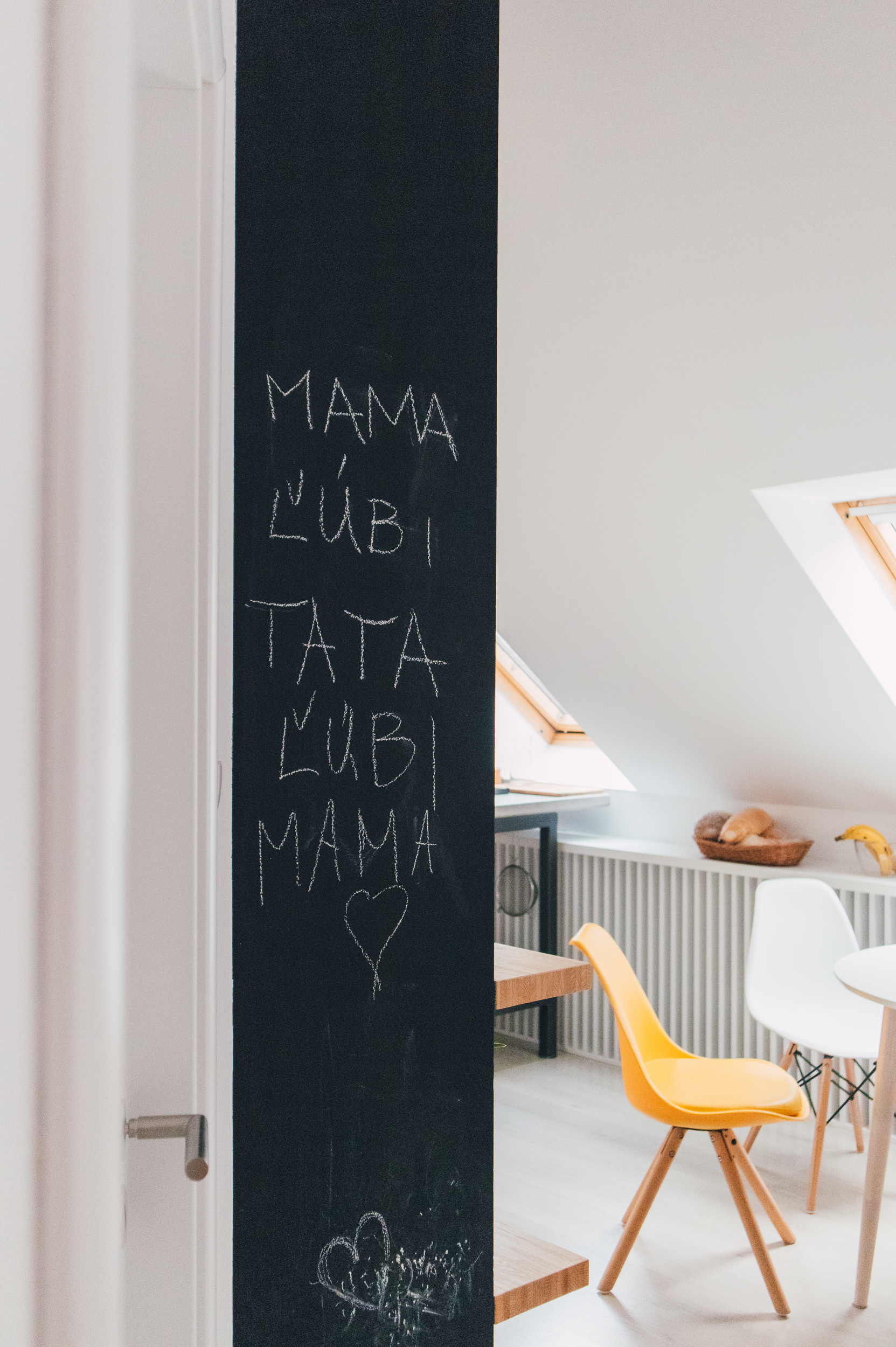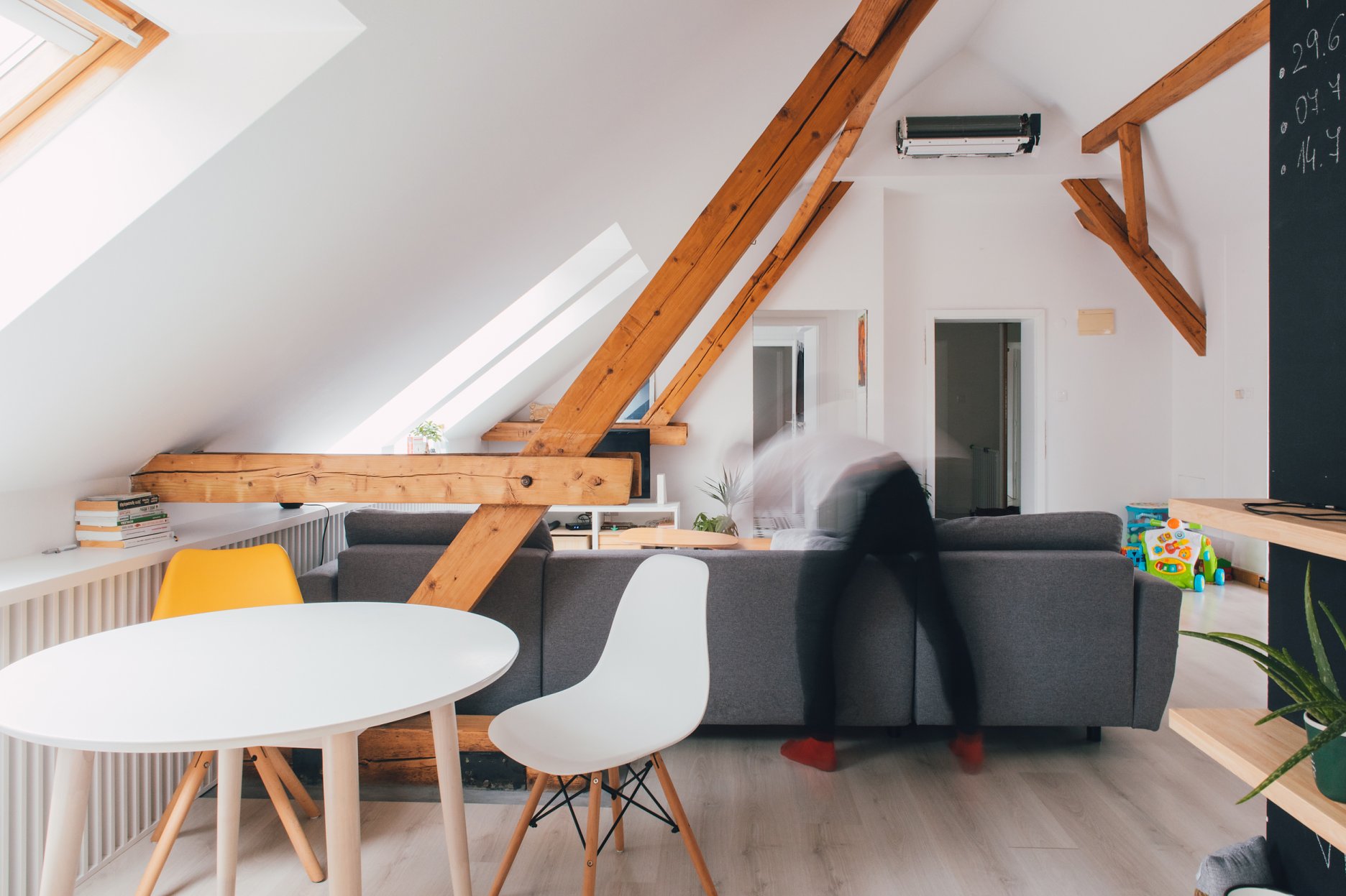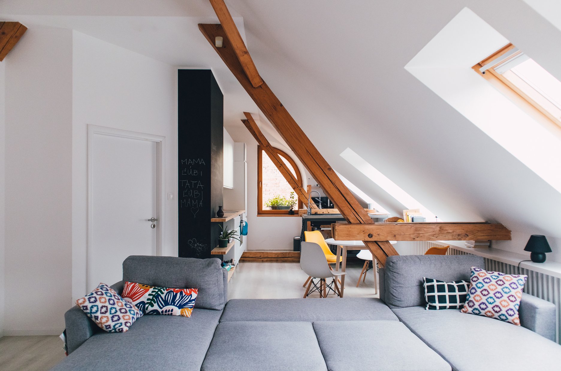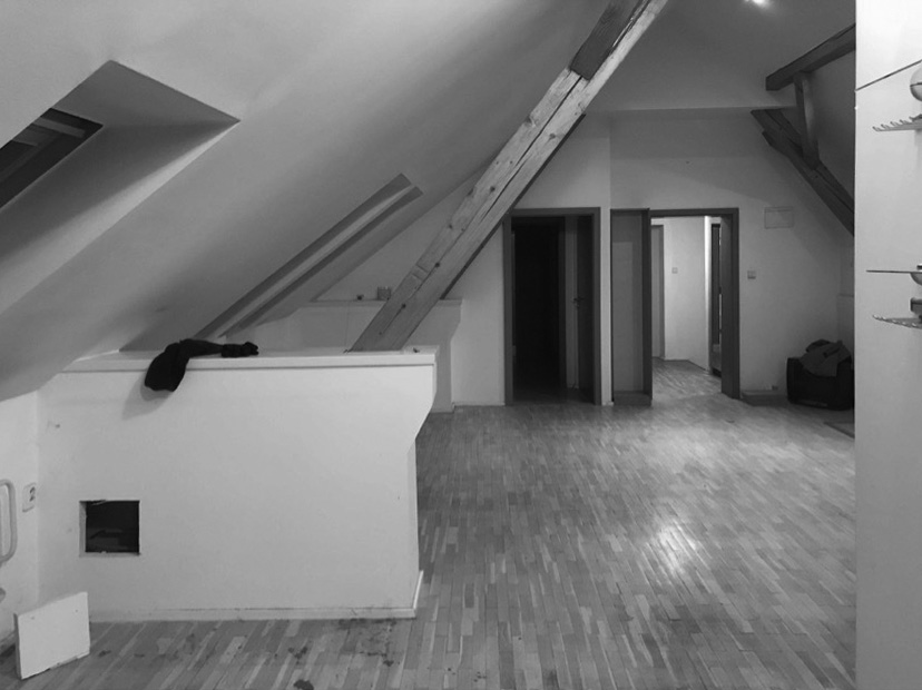 Premena dennej časti obytného podkrovia na Kollárovej ulici v tesnej blízkosti futbalového štadióna. Drevený krov očistený od nánosov sadrokartónu. Snaha nájsť odpoveď na otázku súčasného bývania - lacno, svojpomocne / s kamarátmi, multifunkčne...