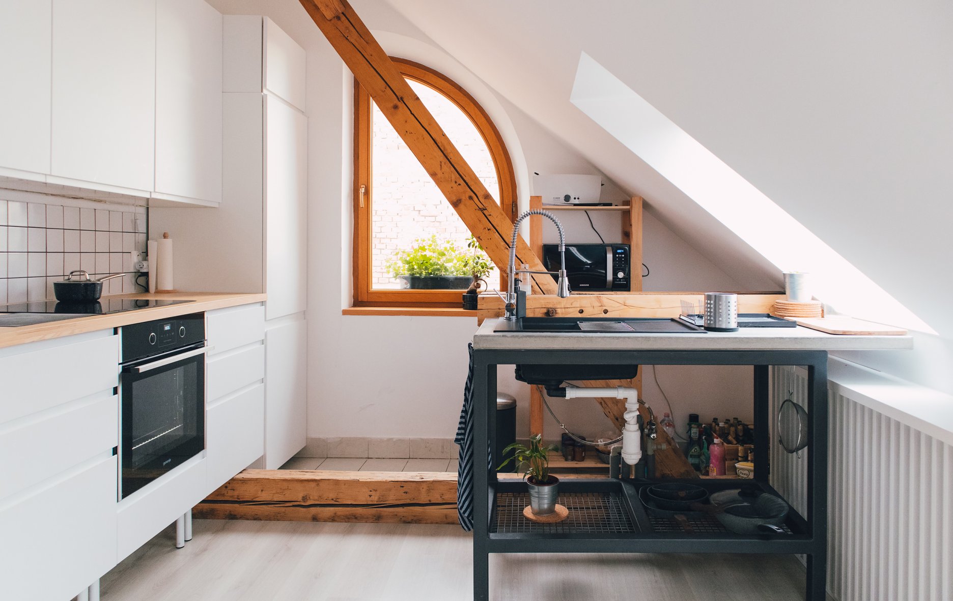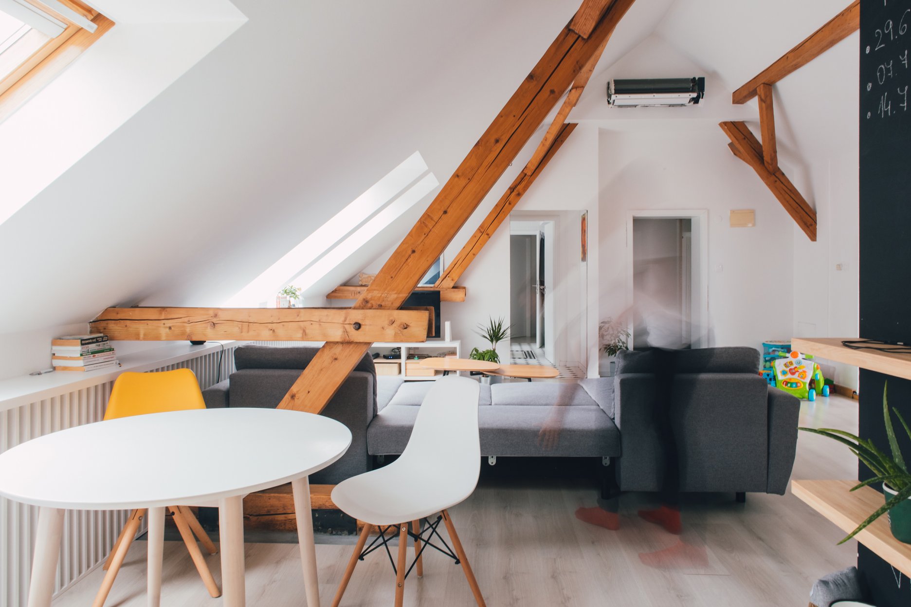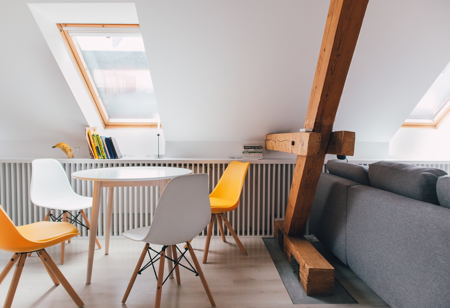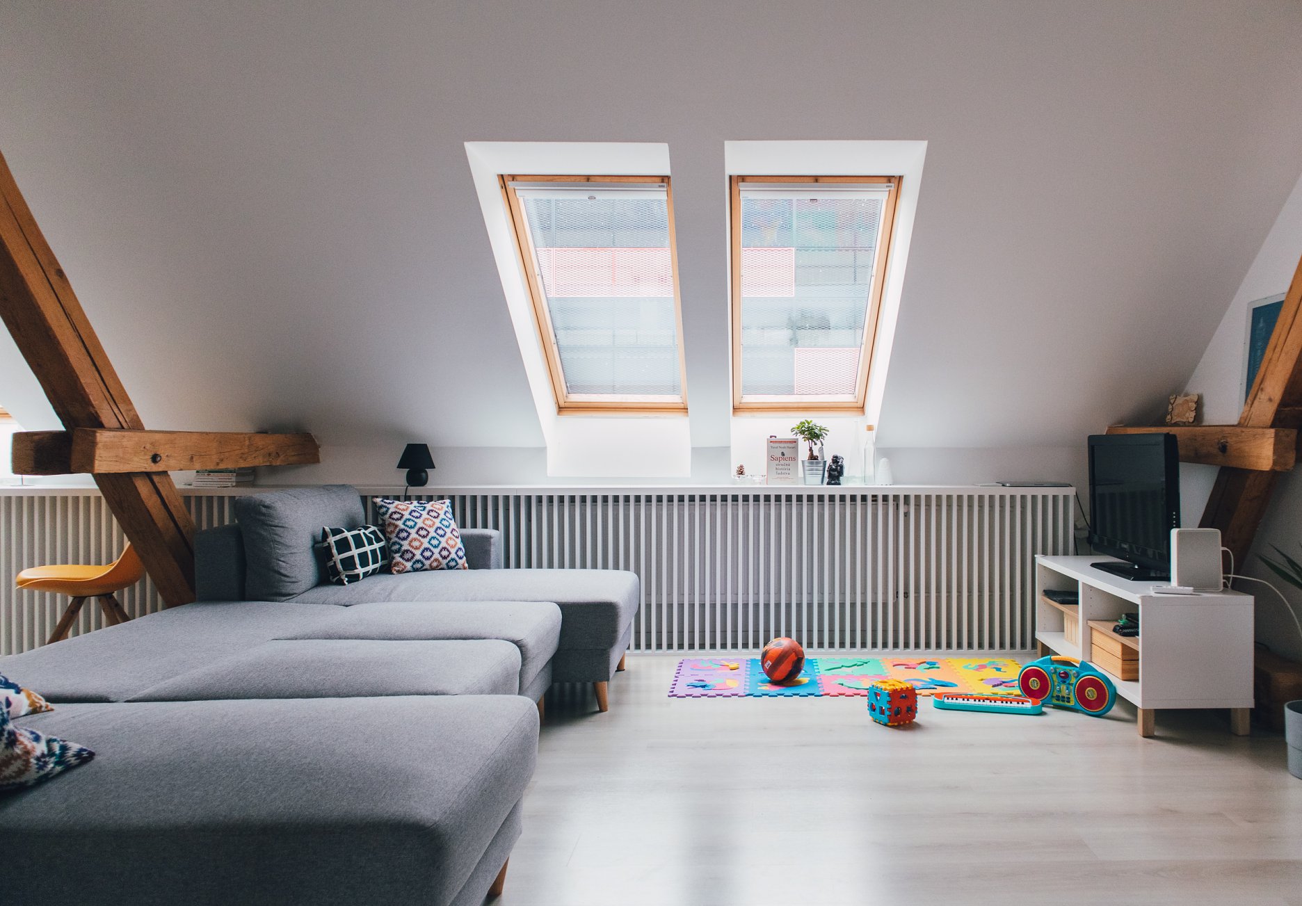 Premena dennej časti obytného podkrovia na Kollárovej ulici v tesnej blízkosti futbalového štadióna. Drevený krov očistený od nánosov sadrokartónu. Snaha nájsť odpoveď na otázku súčasného bývania - lacno, svojpomocne / s kamarátmi, multifunkčne...