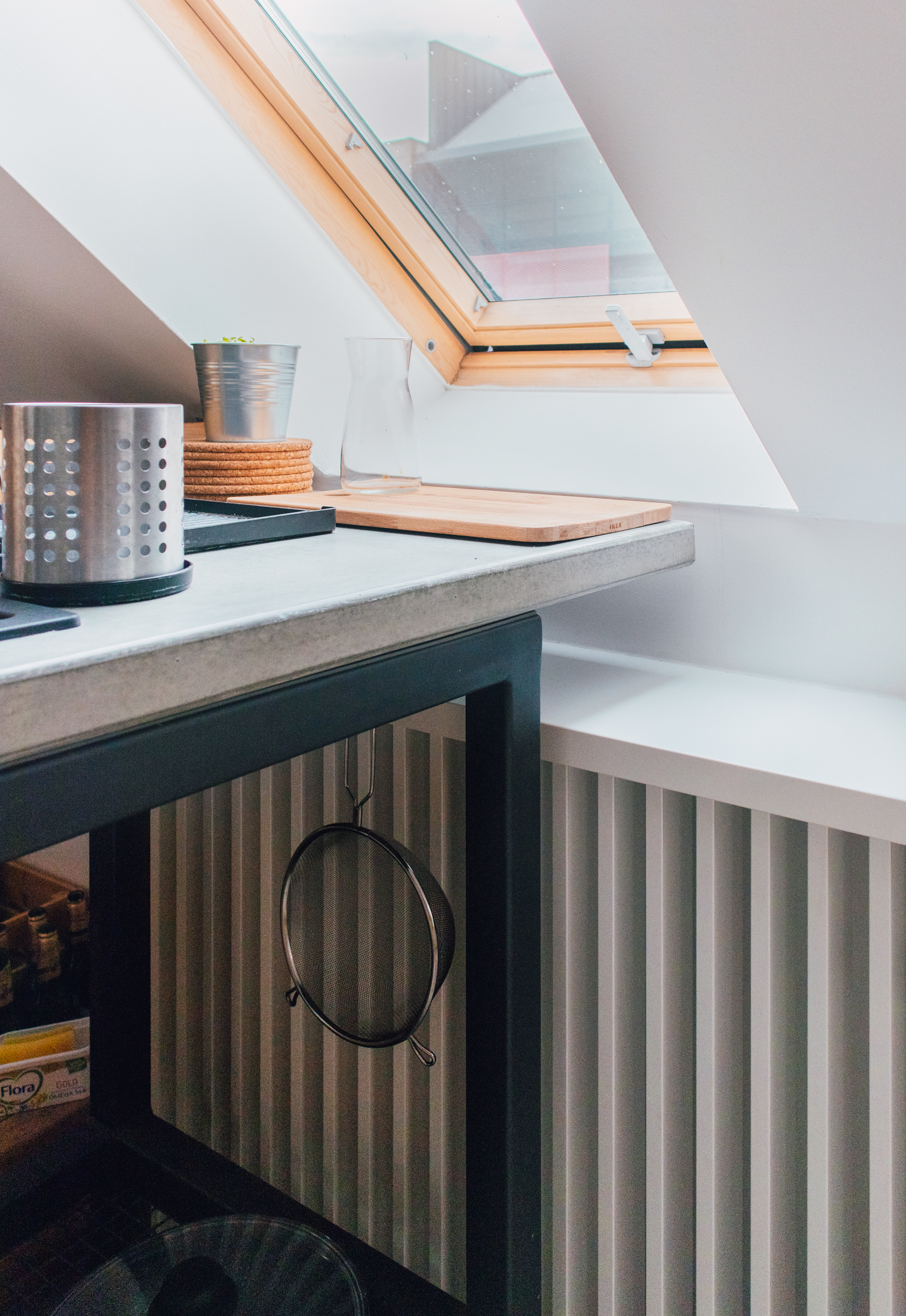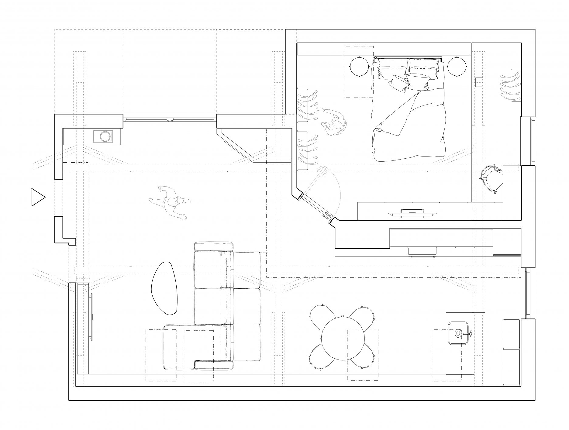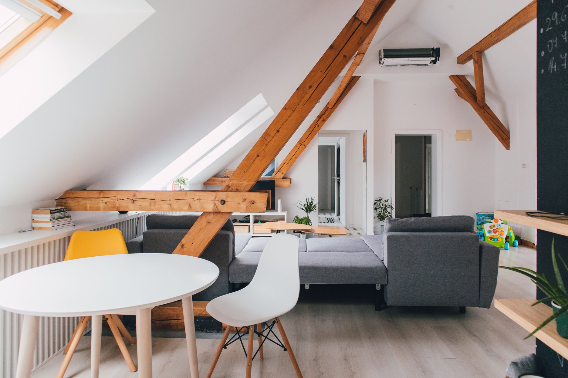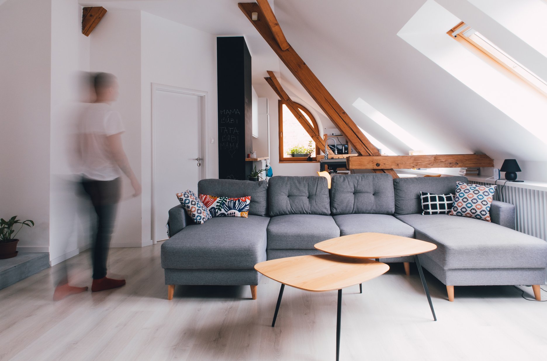 Premena dennej časti obytného podkrovia na Kollárovej ulici v tesnej blízkosti futbalového štadióna. Drevený krov očistený od nánosov sadrokartónu. Snaha nájsť odpoveď na otázku súčasného bývania - lacno, svojpomocne / s kamarátmi, multifunkčne...