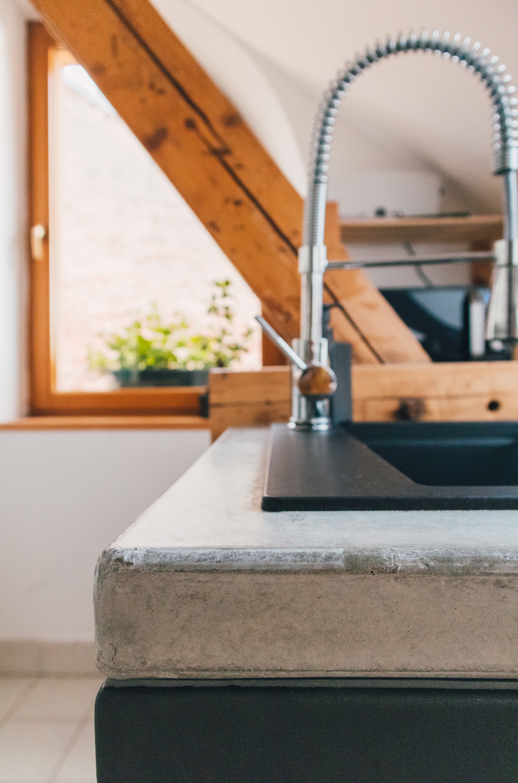 Očistenie od vrstiev z 90. rokov. Brúsenie lakovaného krovu (ležatá stolica) až na surové drevo. Mulitfunkčná sedačka v centre priestoru otvára a prepája priestor kuchyne, jedálne a obývačky pre mladú trojčlennú rodinu. Interiér a zariadenie sa podľa potreby mení na veľké detské ihrisko, doplnené o trvácne betónové detaily.
