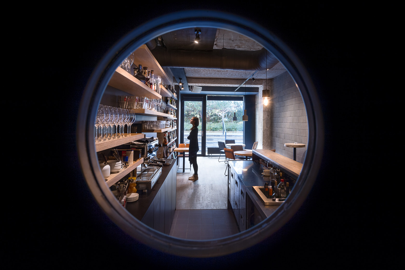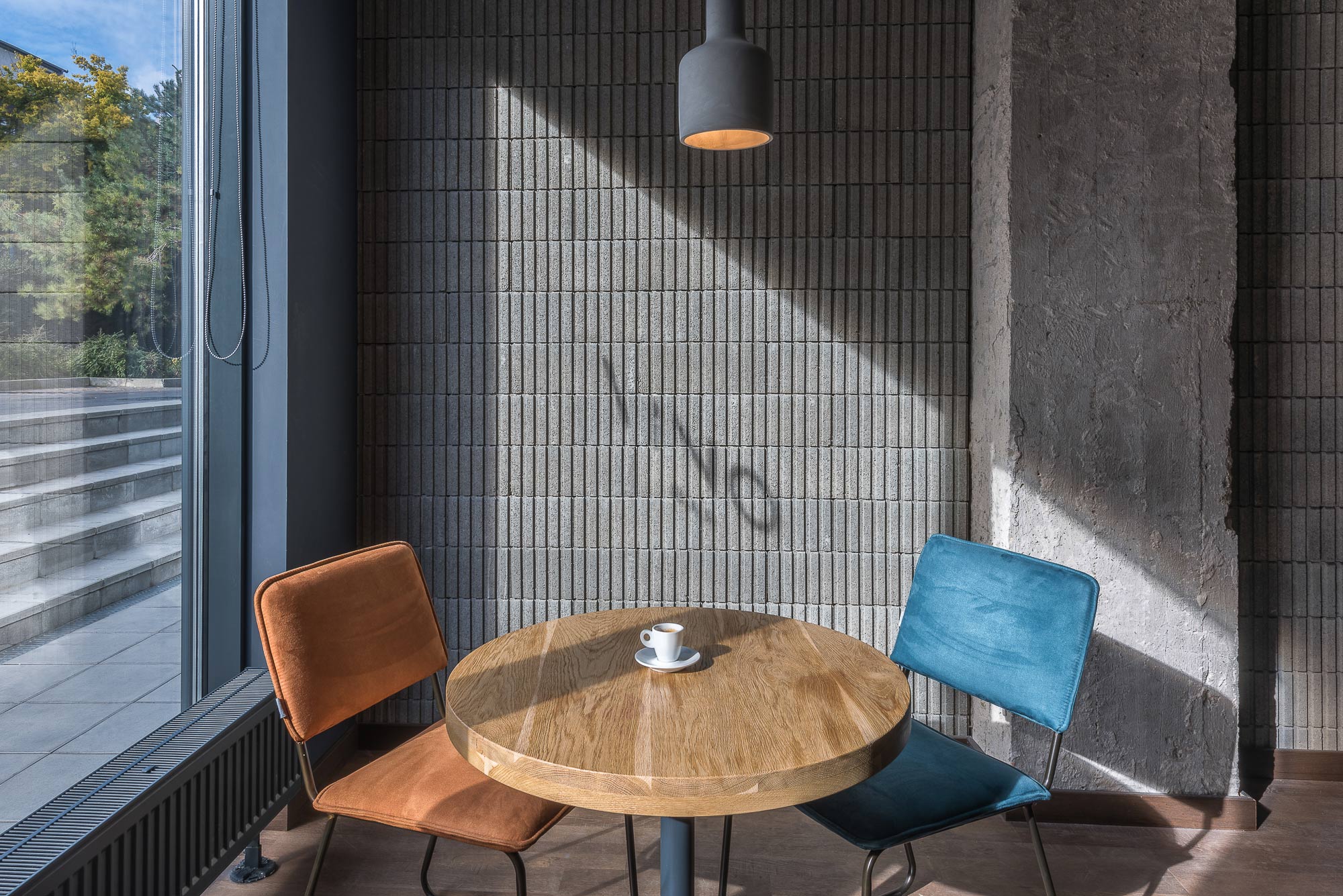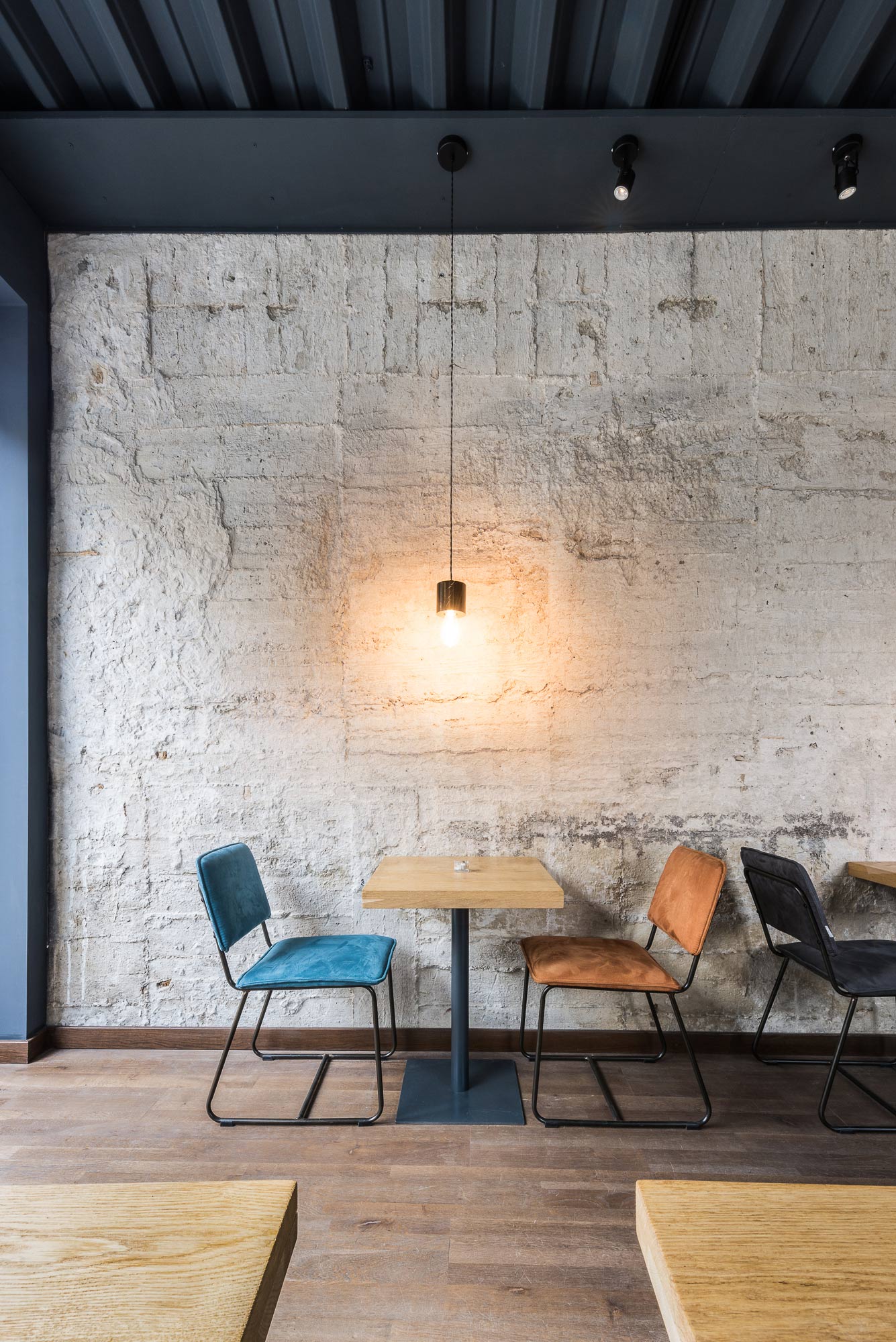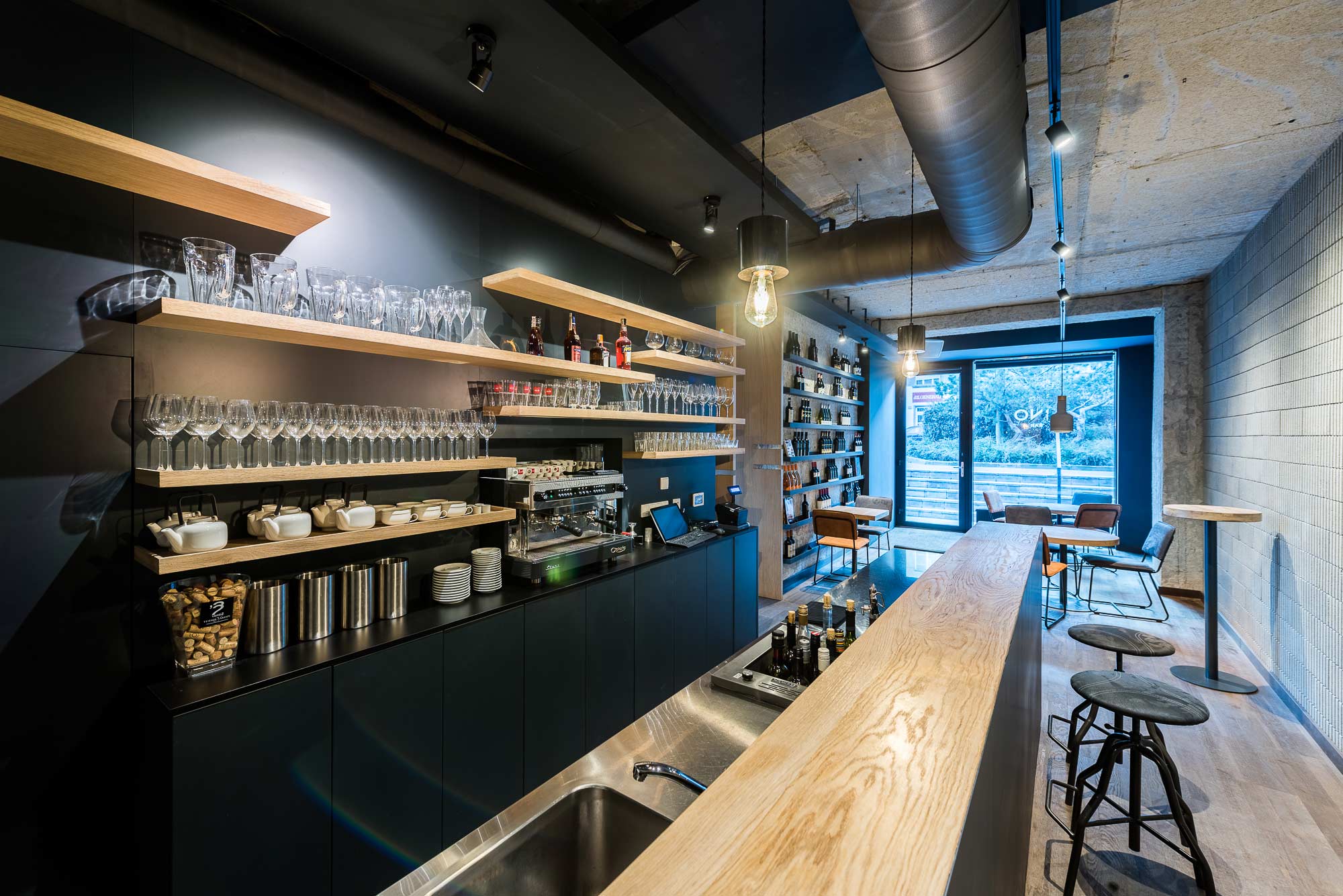 Našou snahou bolo, aby interiér posobil čisto a zároveň príjemne a útulne. Zvolili sme jednoduché farby - antracitovú na steny, interiérové dvere, podnož barového pultu, police, nábytok, ale aj radiátory a vzduchotechniku a decentnú bielu farbu na stenu v salóniku a na toaletách. O ostatné farby sa postarali samotné materiály - drevo a betón.