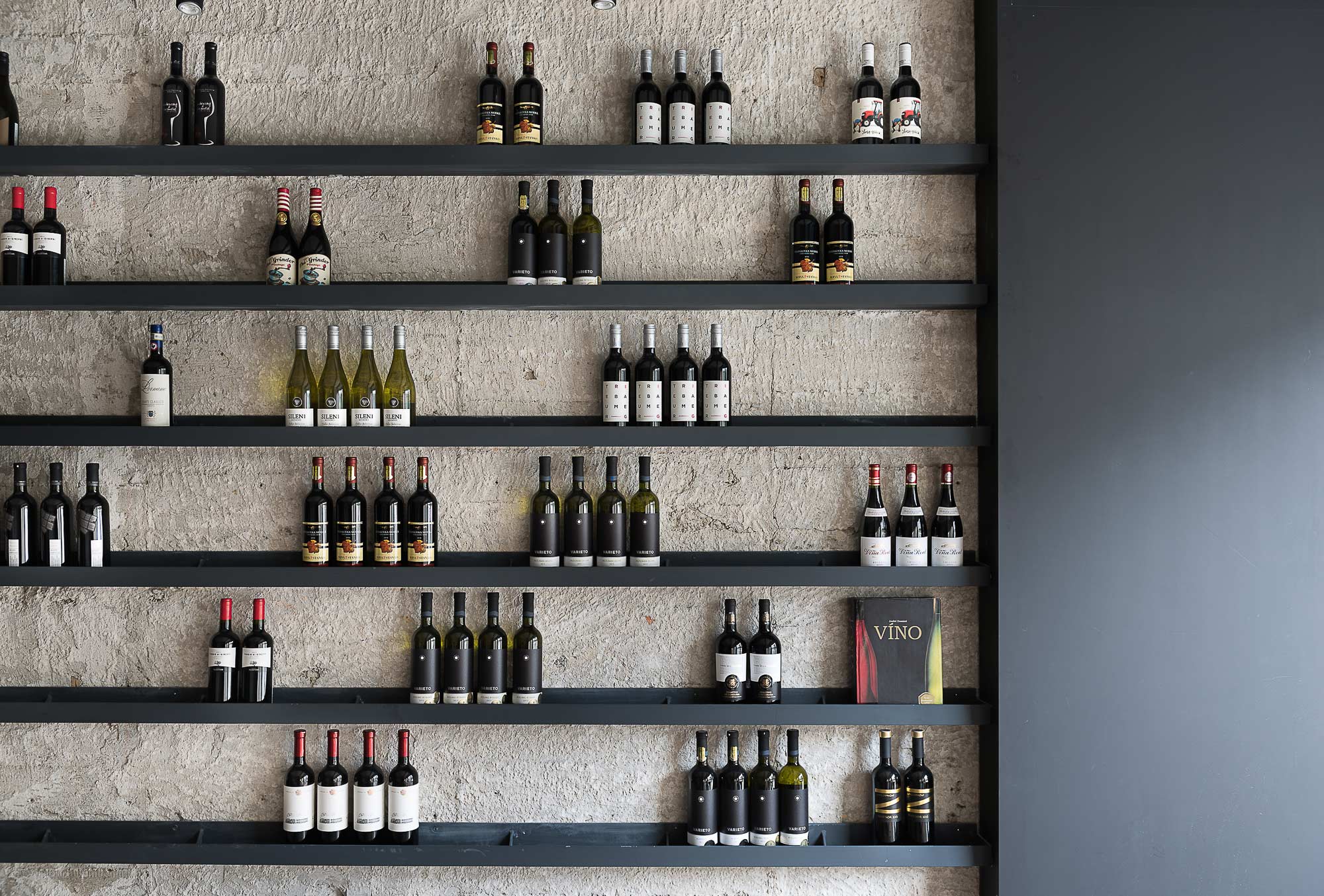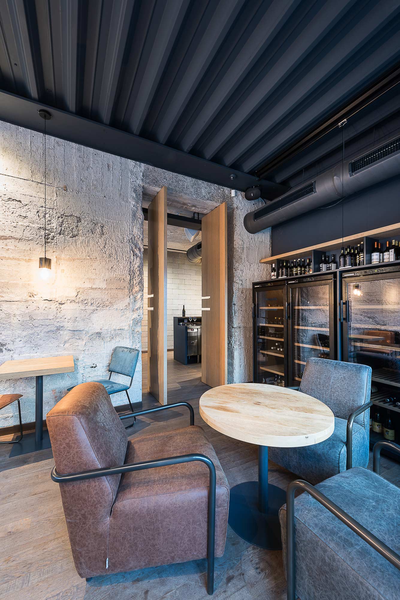 Vinobar je rozdelený na 2 časti. V prvej vstupnej miestnosti sa nachádza bistro s barovým pultom a sedením. Priestoru dominuje stena z betónových tvárnic a namieru vyrobená kovová polica na fľaše s vínom.