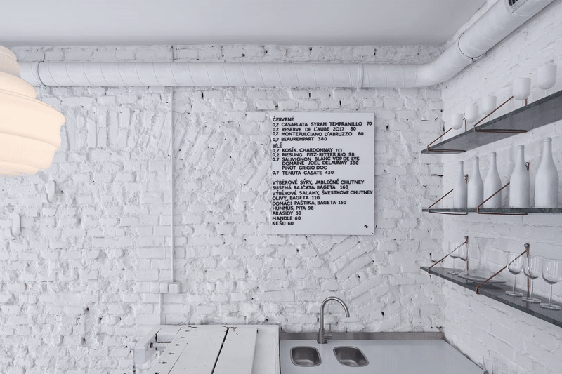 Vzali jsme pár starých pracovních stolů a stoliček, pár starých ledniček na chlazení vína a vše včetně stěn jsme natřeli na bílo, aby celý prostor působil jednotně a vše se odehrávalo spíš v rovině světla a stínů. Na podlahu jsme vylili beton, který jsme pocákali bílou barvou, takže to na první pohled vypadá, že jste vstoupili do něčího ateliéru. Případně do prodejny retro chladniček. Na stěně pak visí neonová “dvojka” v barvě červeného vína jako takové znamení, o čem že to ve dvojce je.