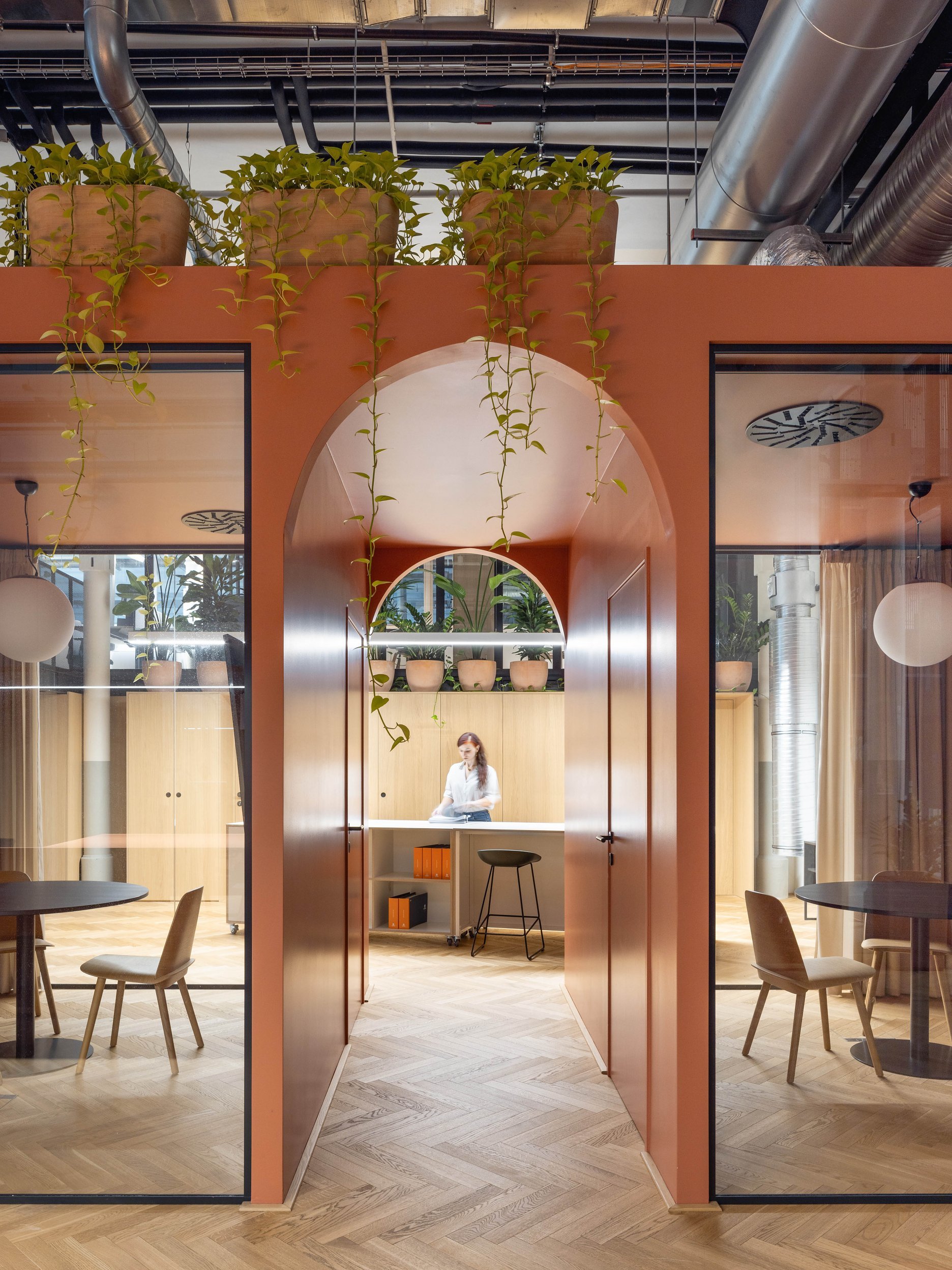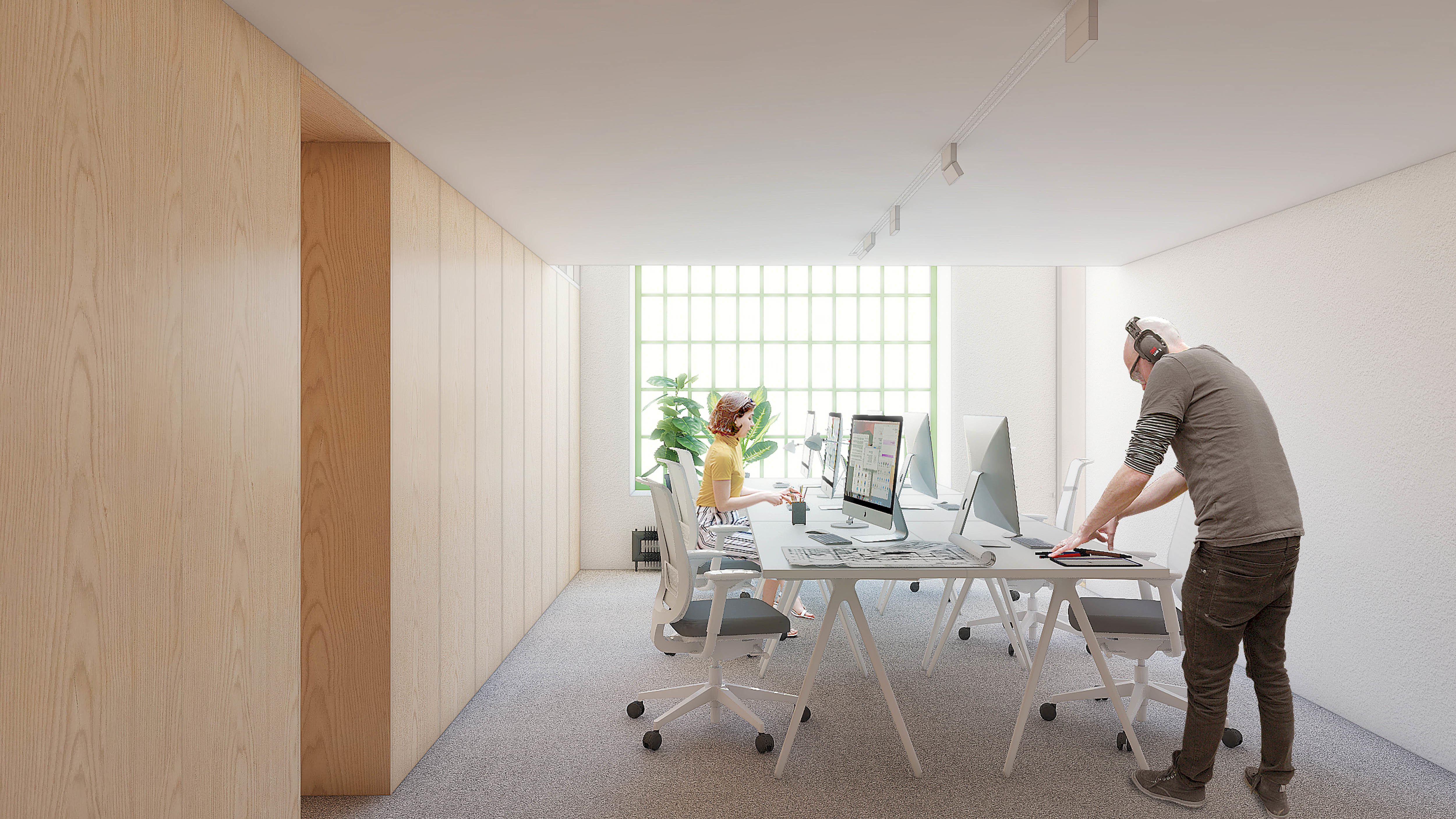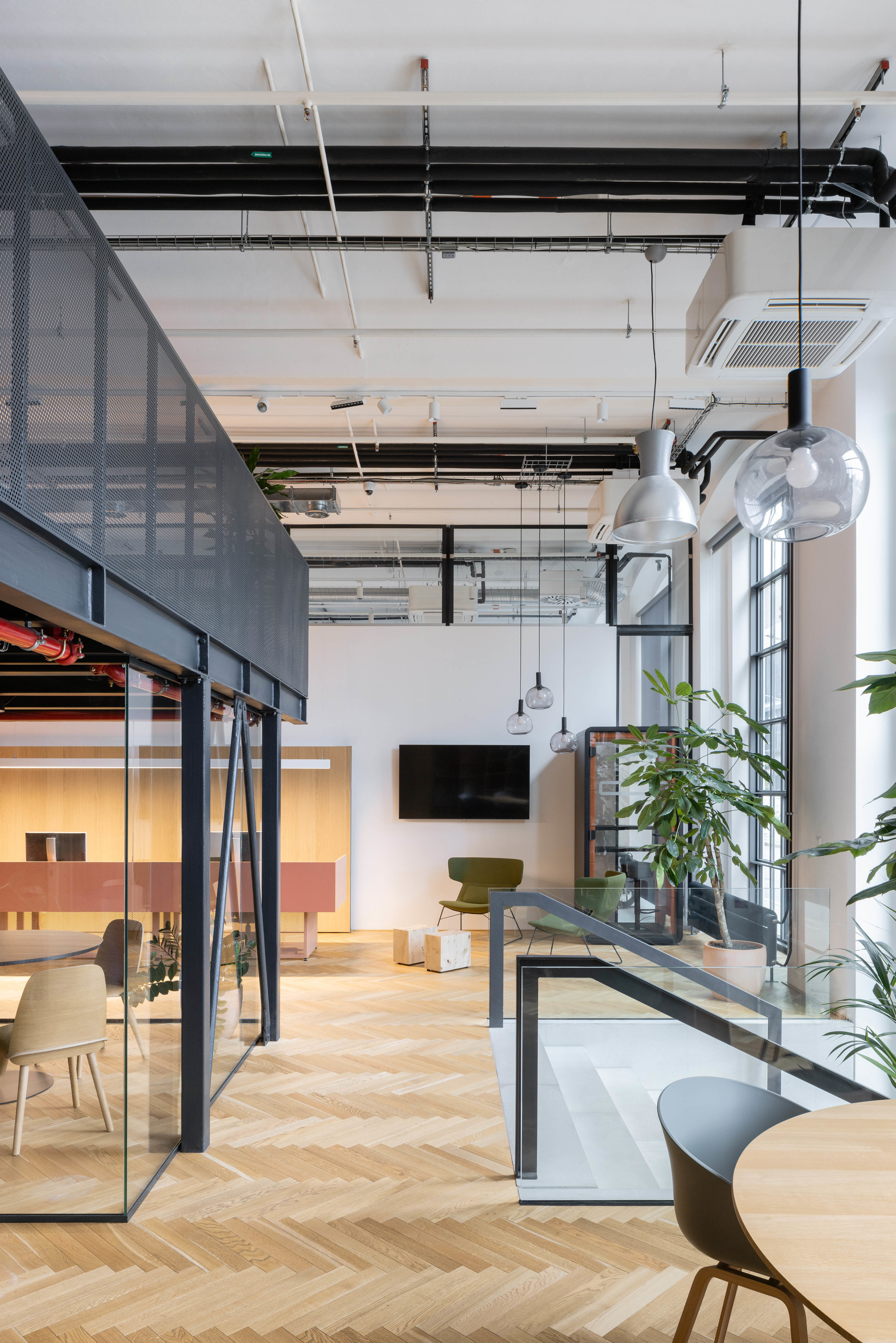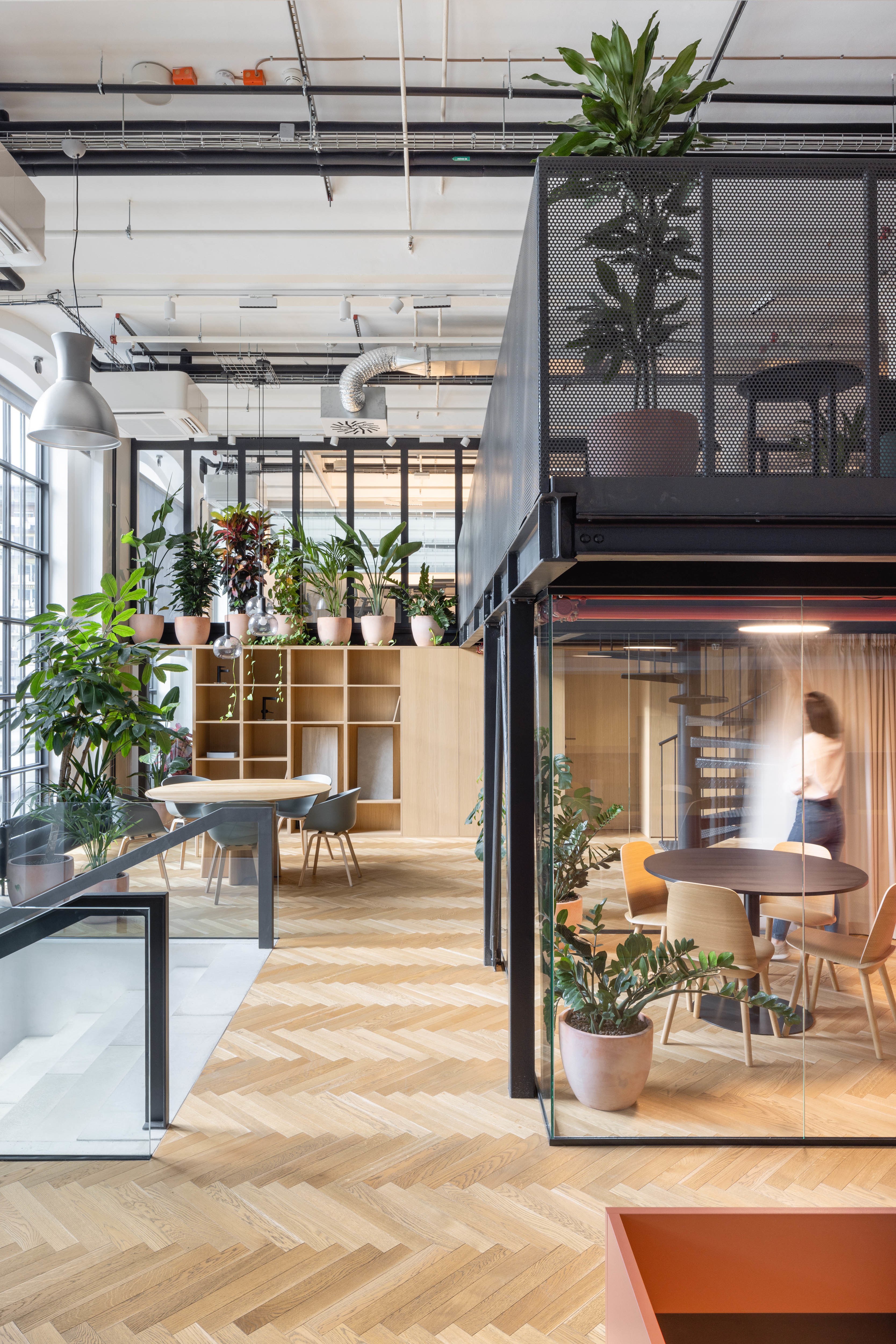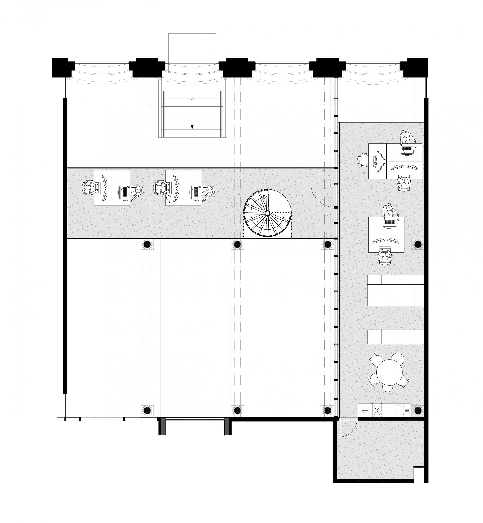Uzatvorená časť prízemia a mezanínu slúži pre potreby zamestnancov a ukrýva v sebe pracovné miesta, kuchynku, sociálne zázemie a jednu zasadačku. Otvorená časť mezanínu slúži ako priestorová rezerva. Táto časť bola po roku užívania a bez nášho vedomia bohužiaľ skrátená o 1 modul.