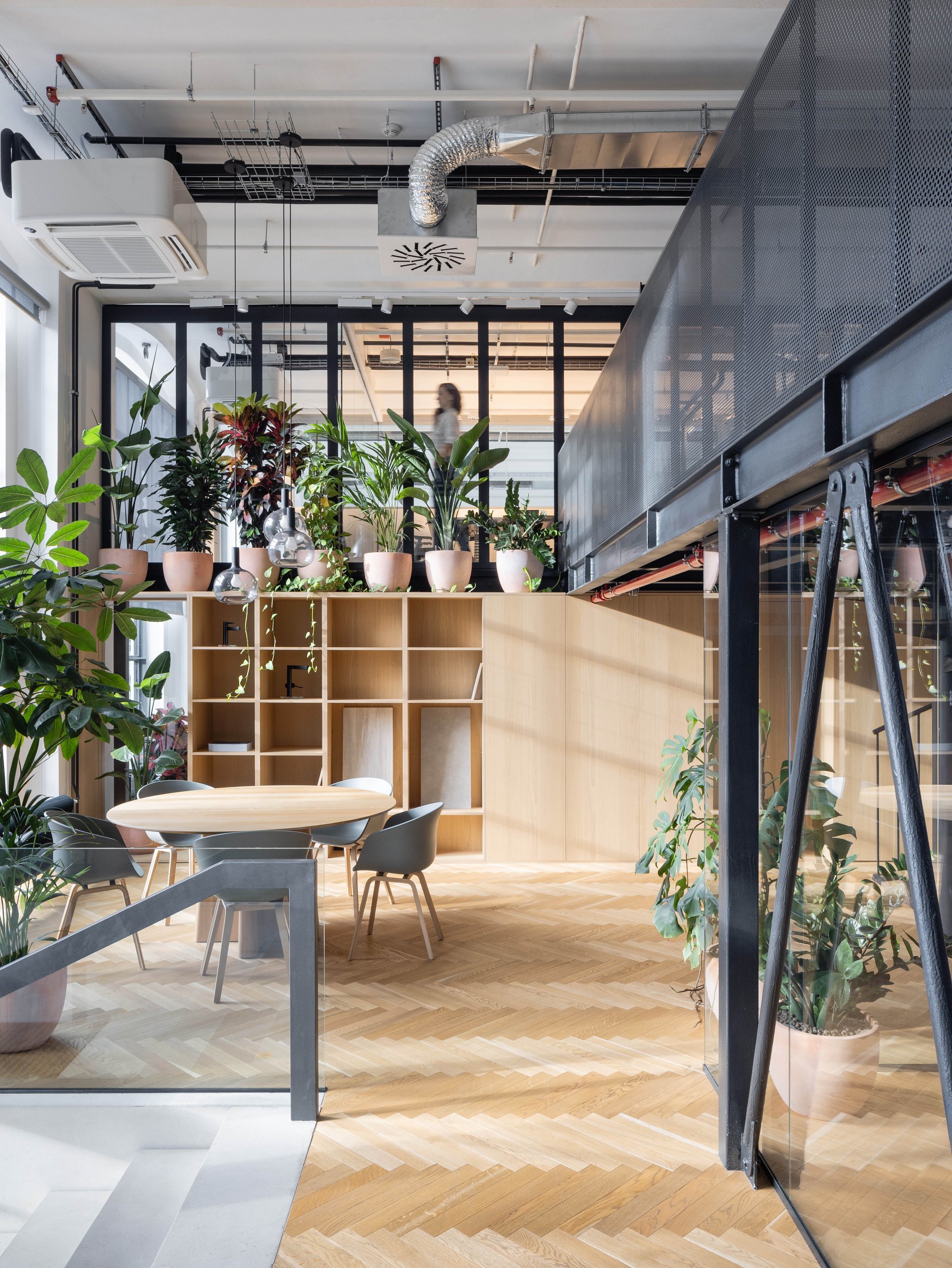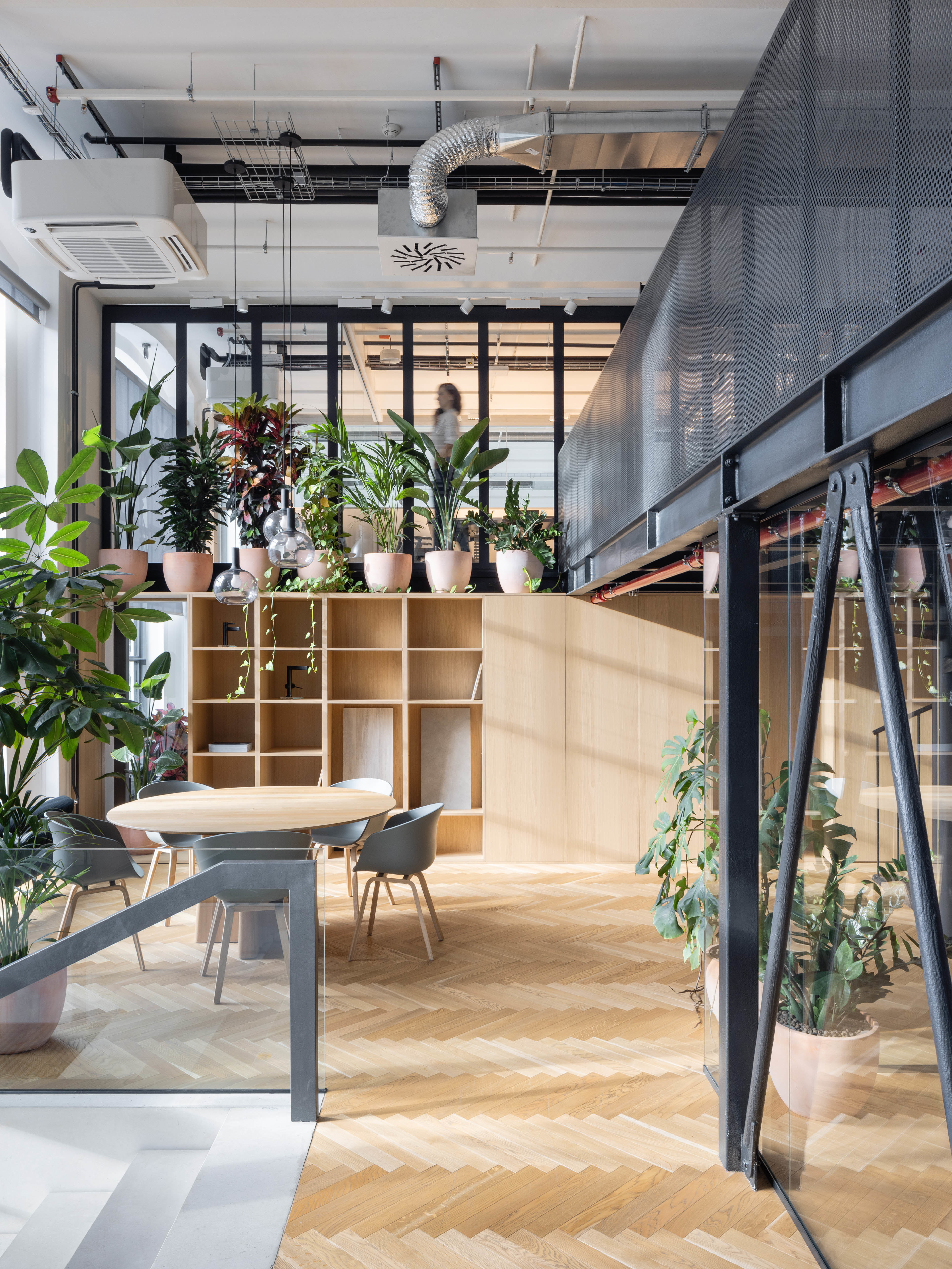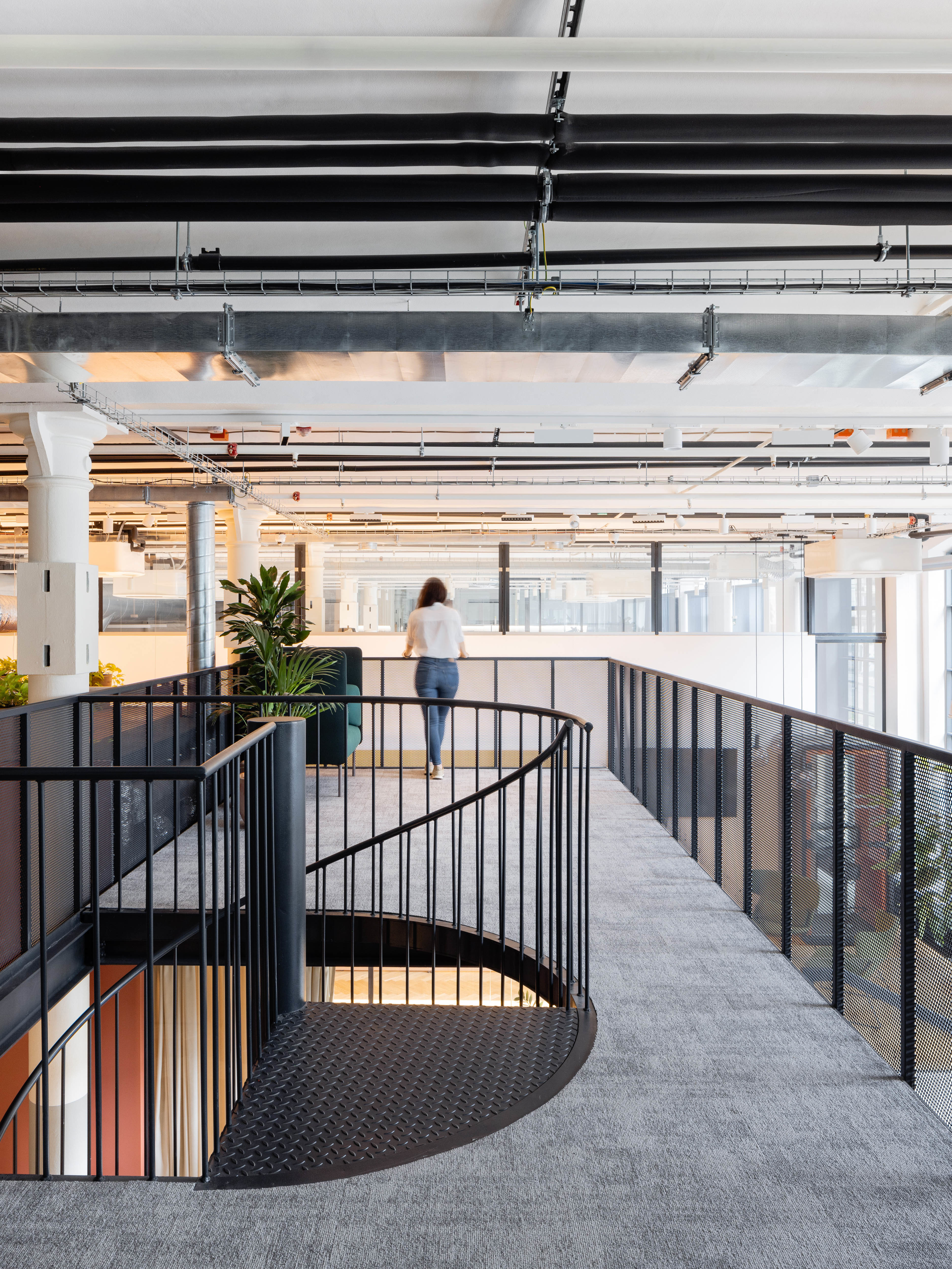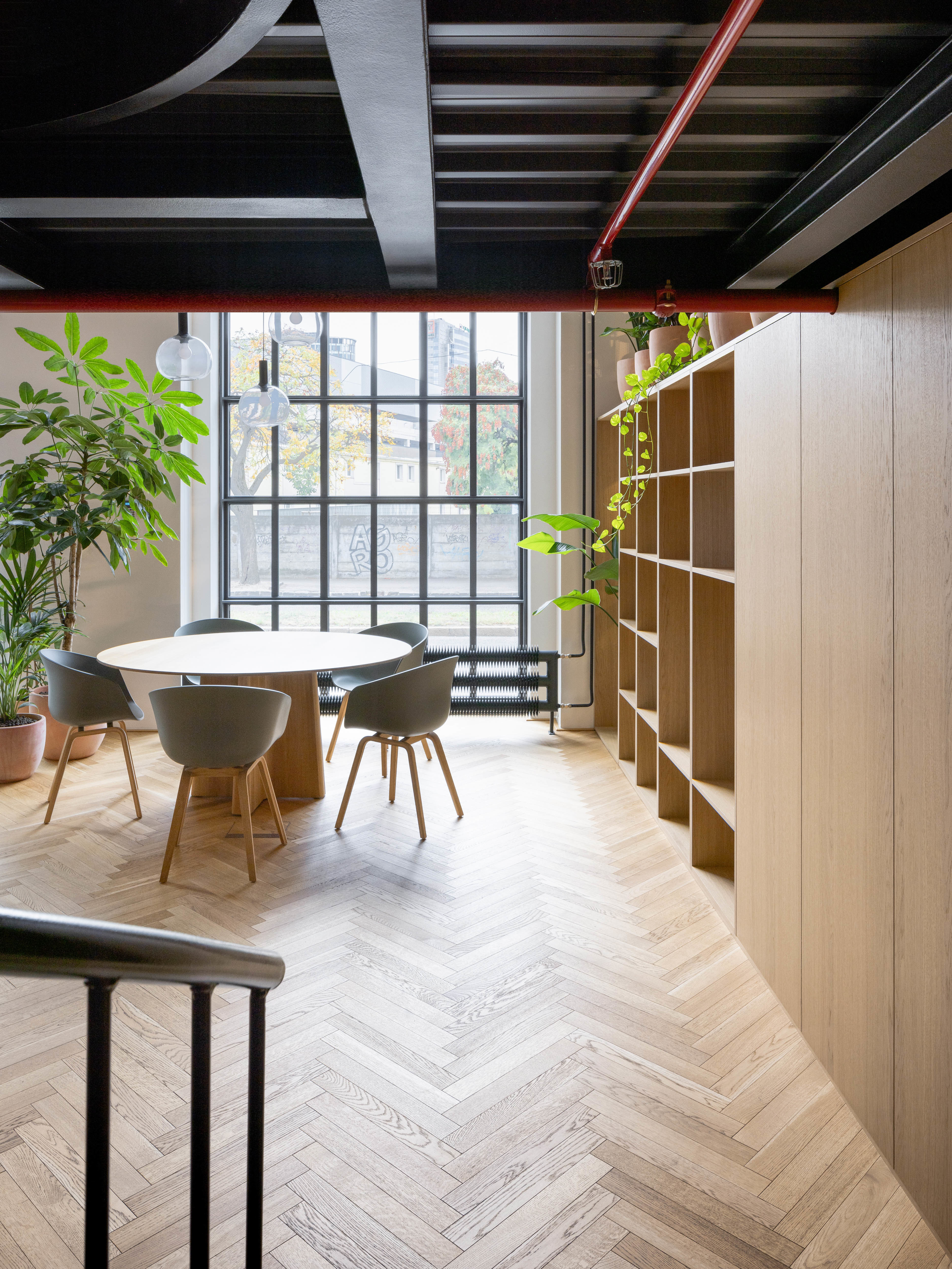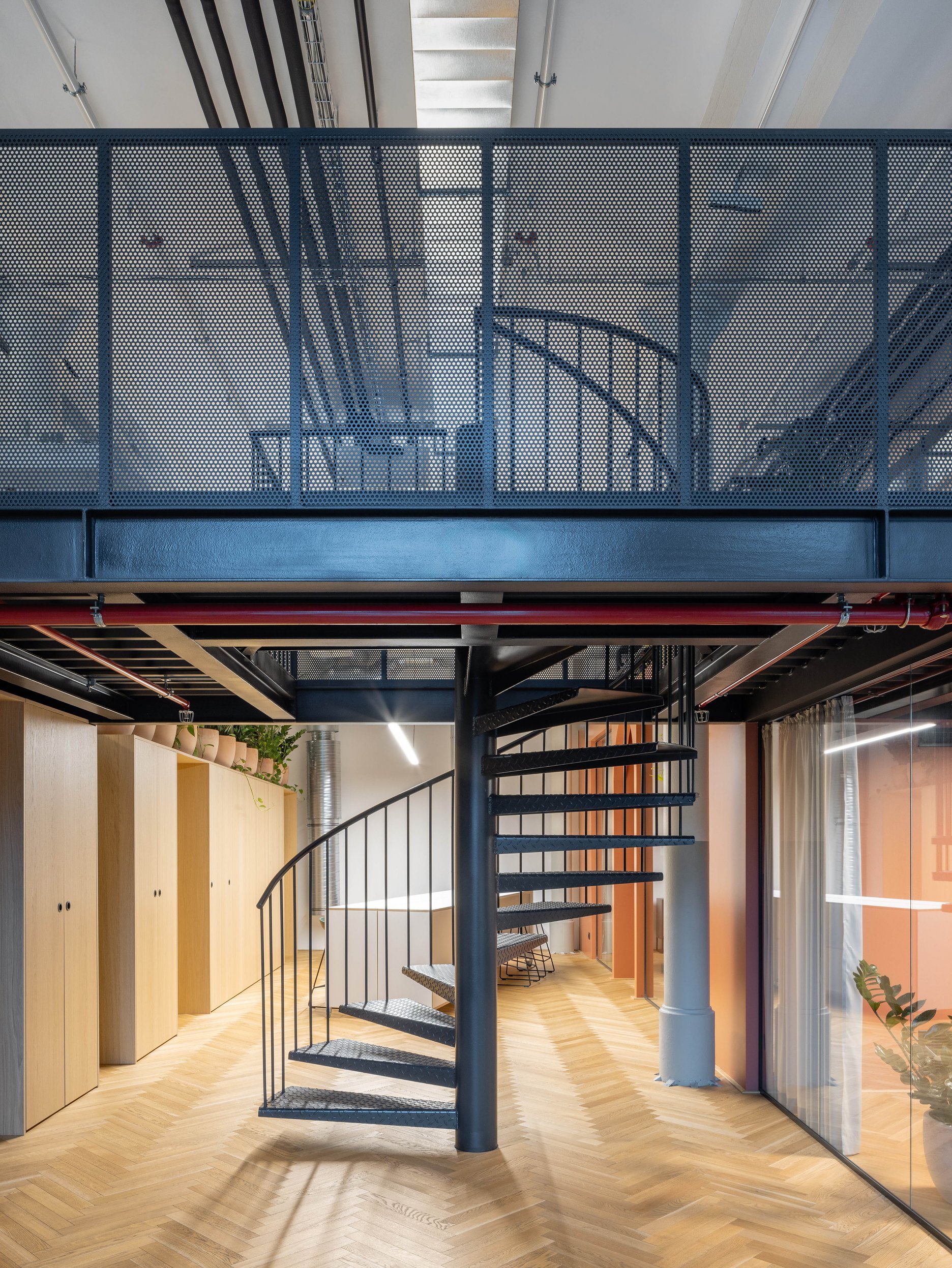 Nakoľko bol priestor plošne pomerne malý oproti nárokom na prevádzku, rozhodli sme sa využiť jeho veľkorysú svetlú výšku vložením mezanínu. Samotný mezanín a točité schodisko sme navrhovali zámerne tak, aby pôsobili surovo a industriálne, čo vytvorilo kontrast voči ostatným “uhladenejším" prvkom interiéru. Preklenutie priestoru v priečnom smere vytvára zaujímavú výškovú topografiu priestoru a pocitovo ho člení na menšie celky.