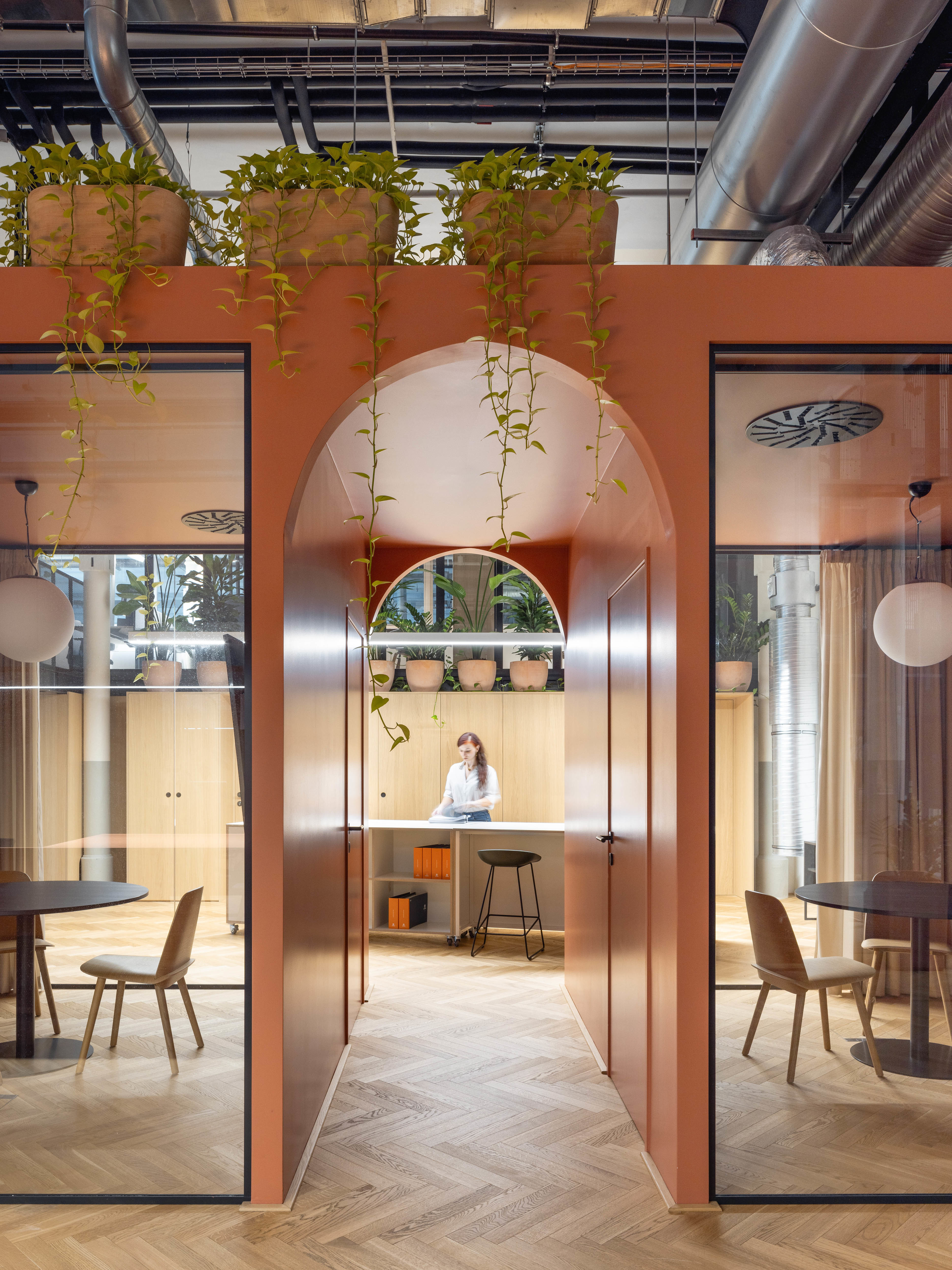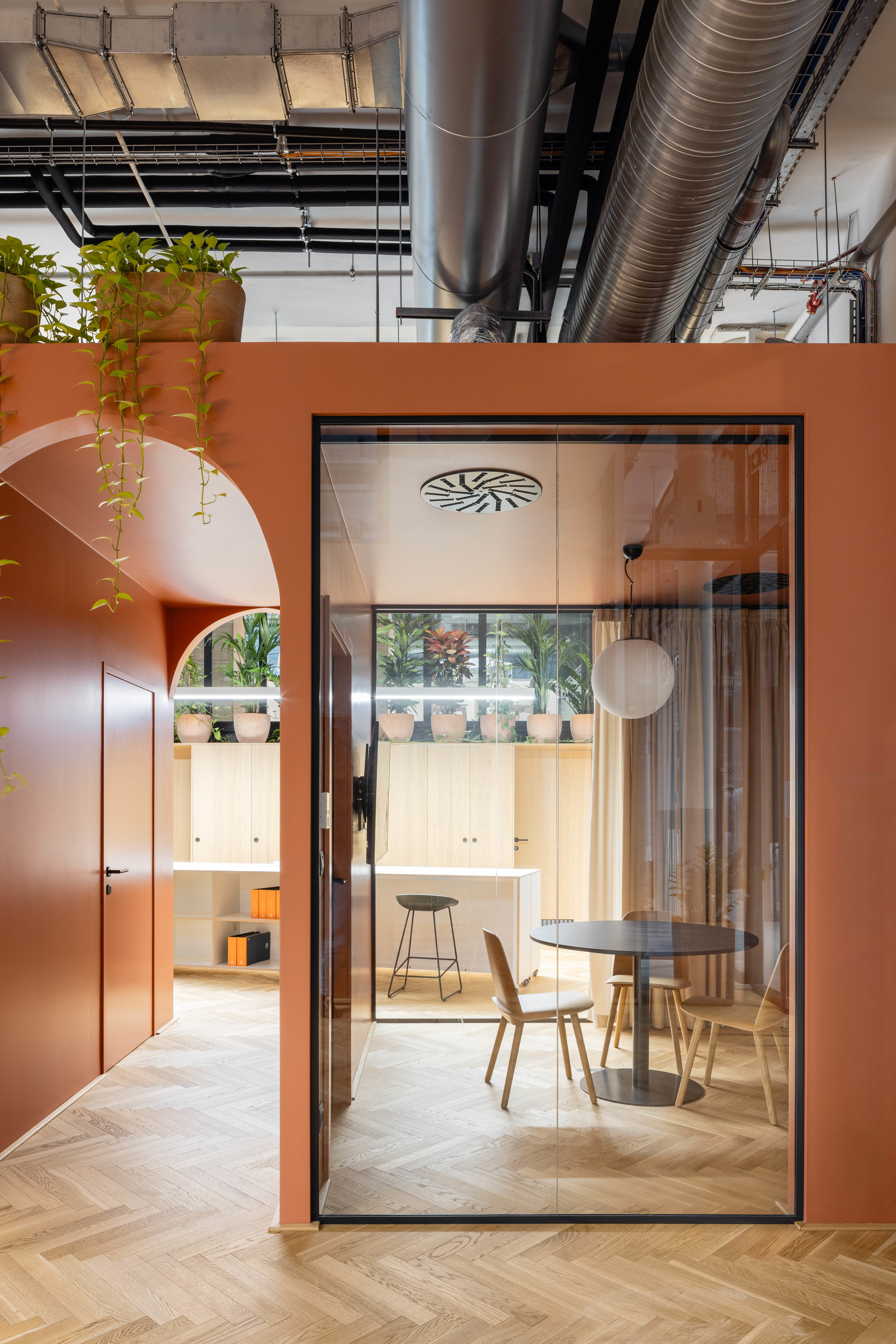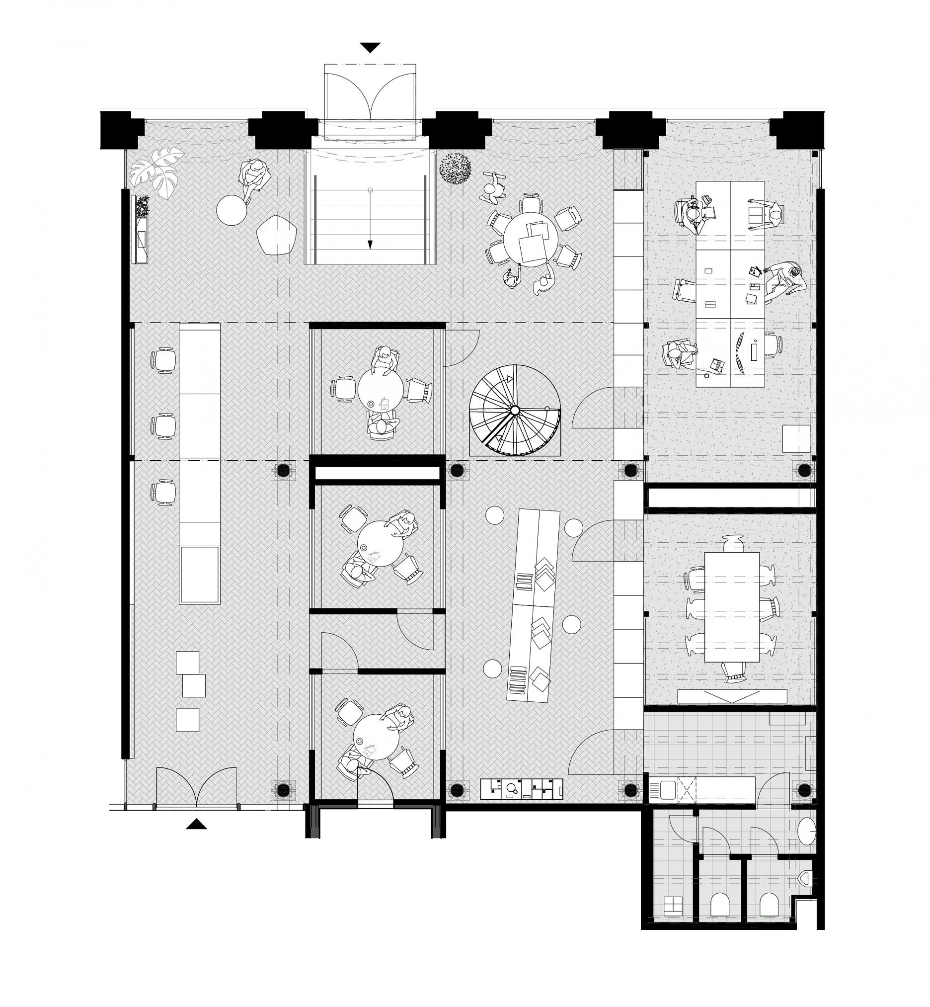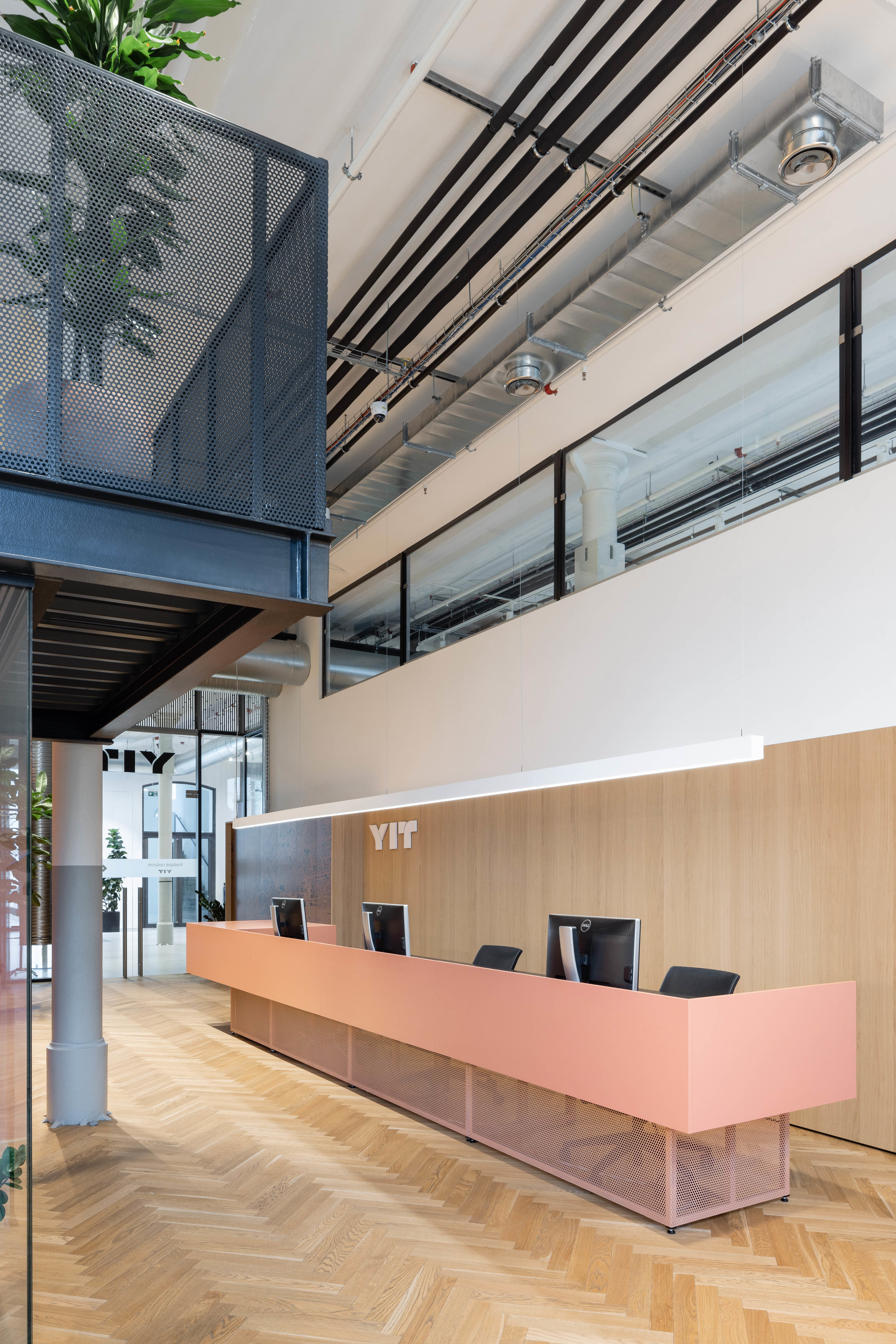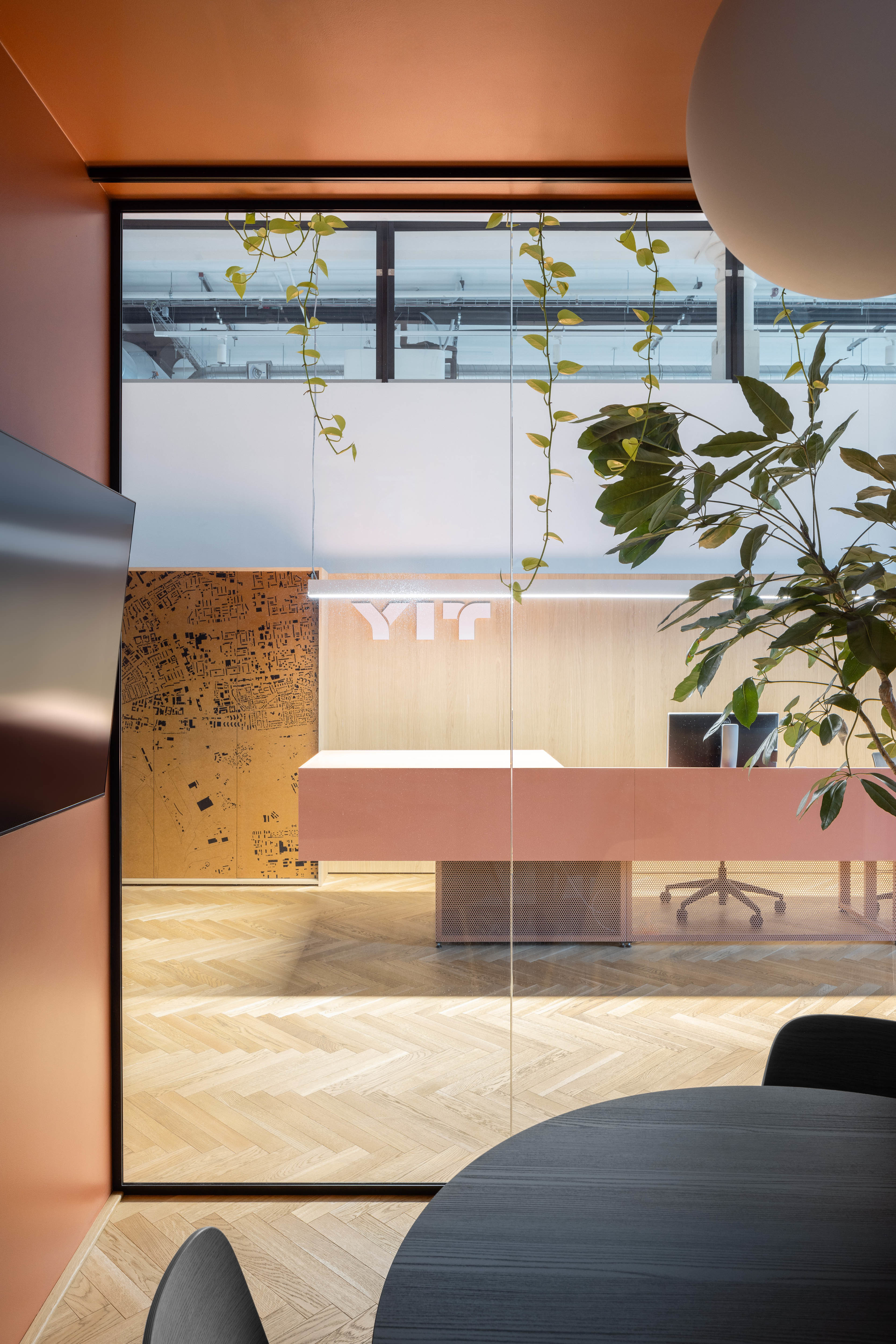 Funkčne je priestor delený na časť pre prácu s klientmi a na kľudnejšie uzatvorené kancelárie pre zamestnancov. Na pozdĺžnu os sme umiestnili recepciu, ktorá má výhľad na obidva vstupy a predpolie s detským kútikom. Pri recepcii sa taktiež nachádzajú úložné priestory, ktoré sú ukryté za Schwarzplanom Bratislavy, na ktorom môže YIT graficky označovať svoje realizované projekty. Oproti recepcii sme vložili ružový box s intímnymi zasadačkami s premenlivou výškou stropov. Za týmto boxom sa nachádza vzorkovňa materiálov.