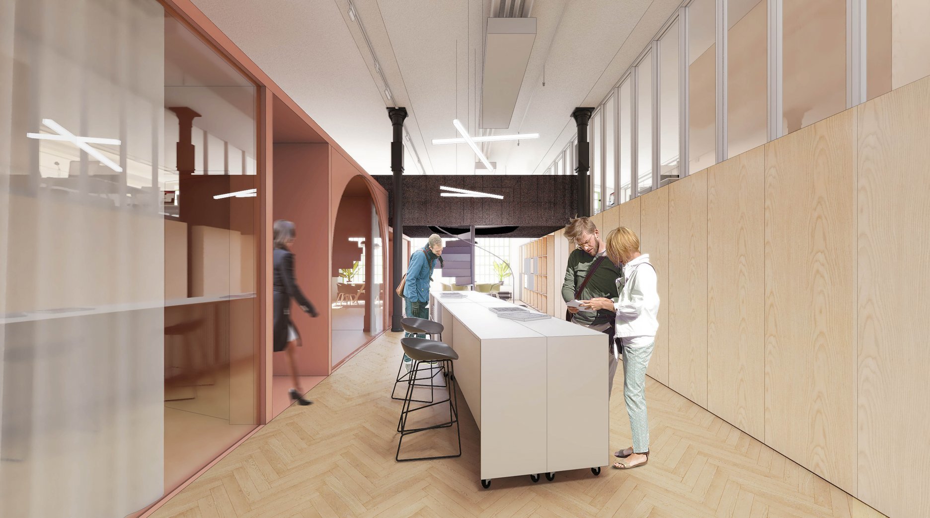 Realizácia ateliéru AT 26 vymedzuje v rámci otvoreného halového priestoru na prízemí Pradiarne1900 "obývačku developera", pričom využíva jeho takmer päťmetrovú svetlú výšku. Mäkká materialita a farebnosť zariadenia kontrastuje s industriálnym charakterom stavby a vložených konštrukcií.
