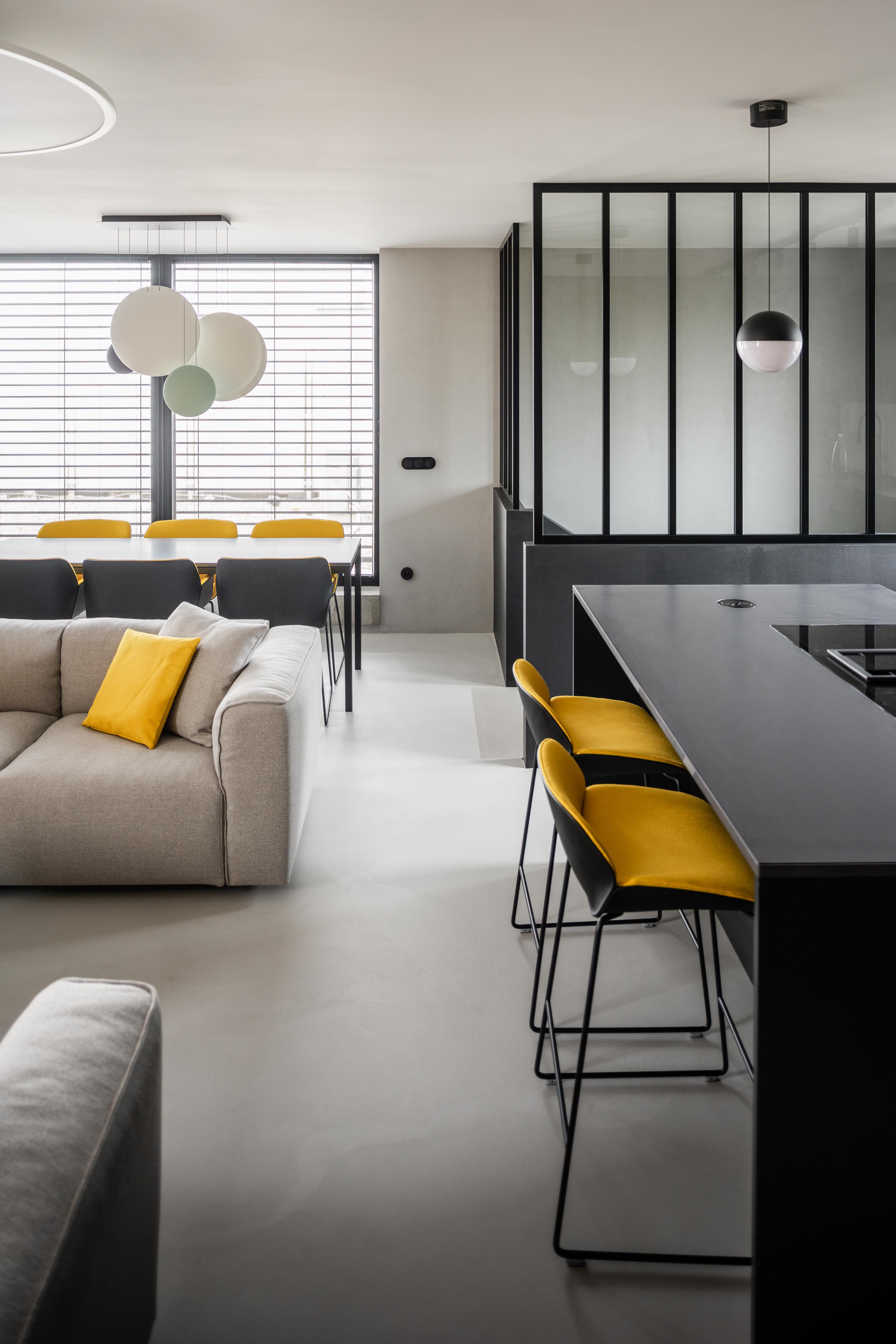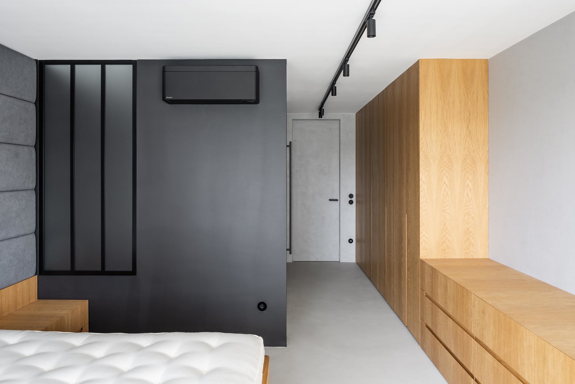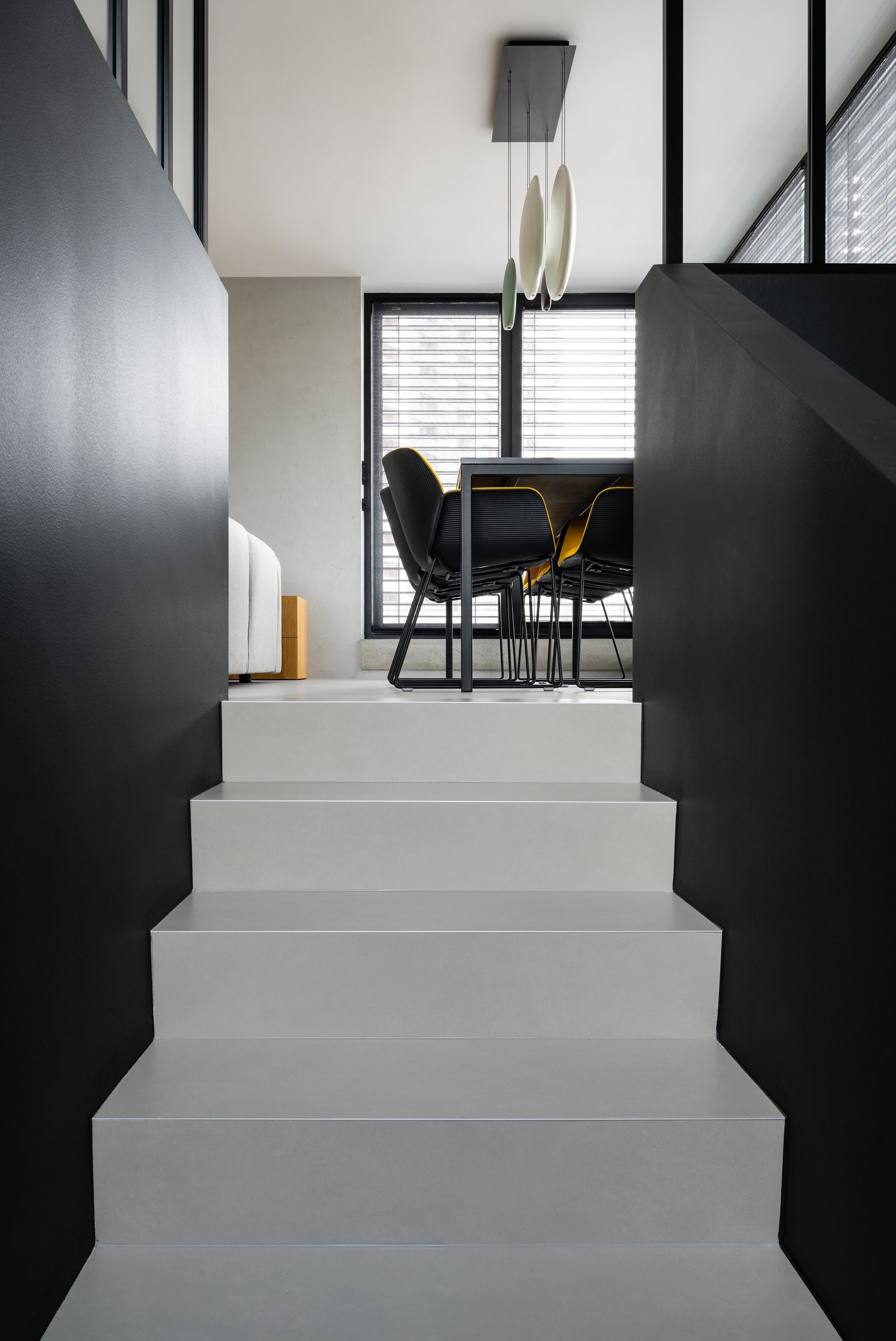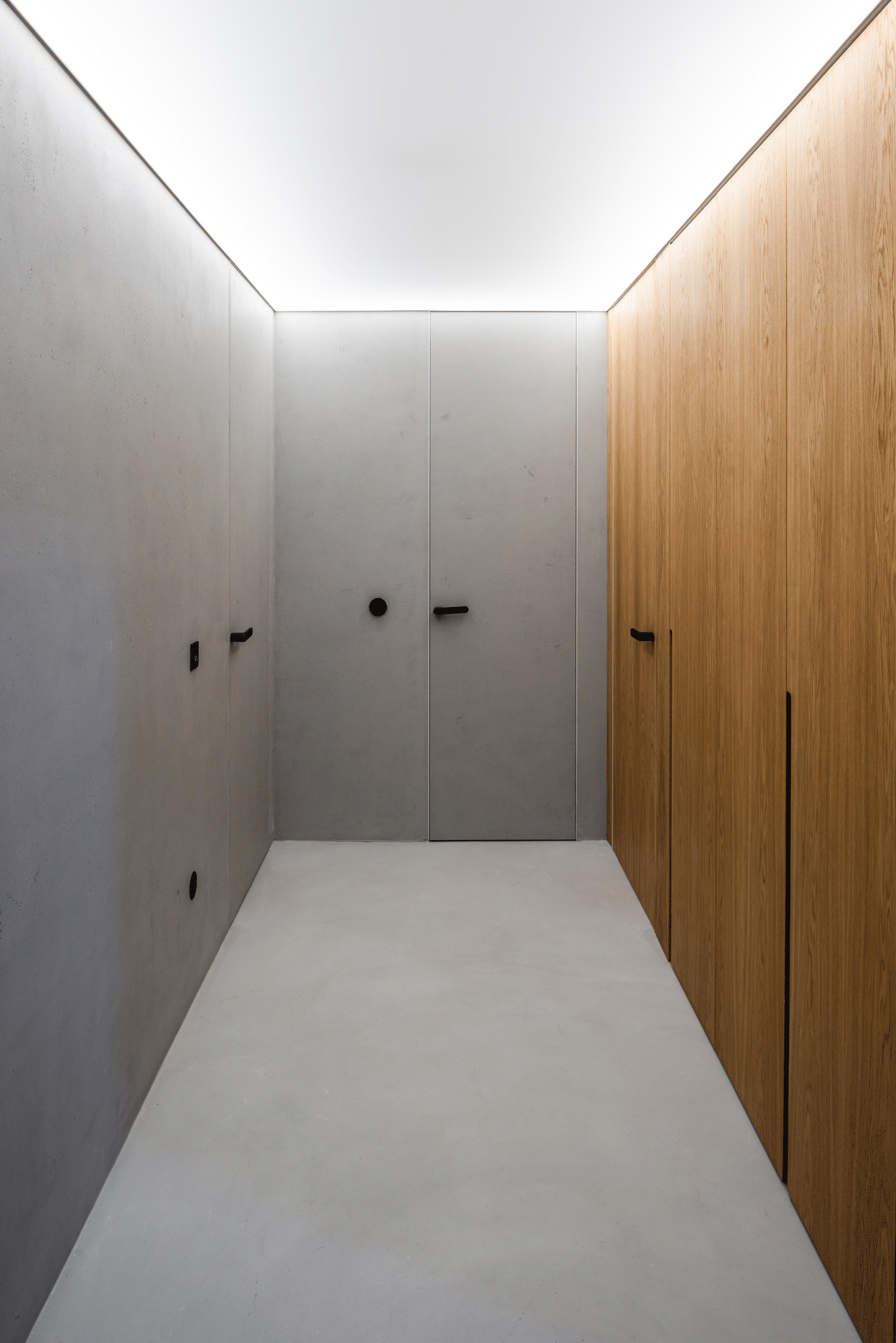 Podlahy s mikro-cementovými stierkami dopĺňajú cementové stierky na stenách. Väčšina mobiliáru je robená na mieru, prírodnú dyhu dopĺňa čierna striekaná MDF doska.