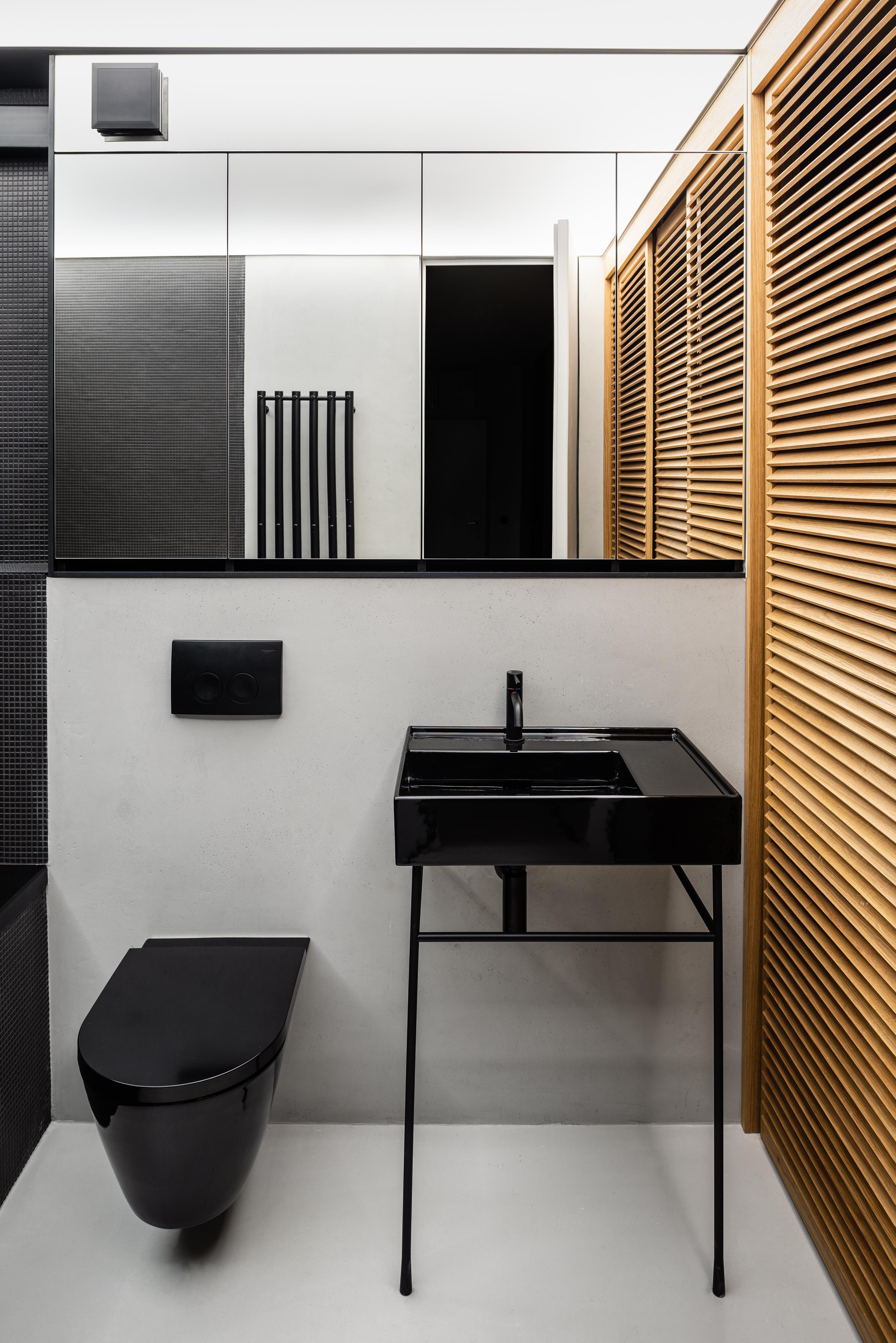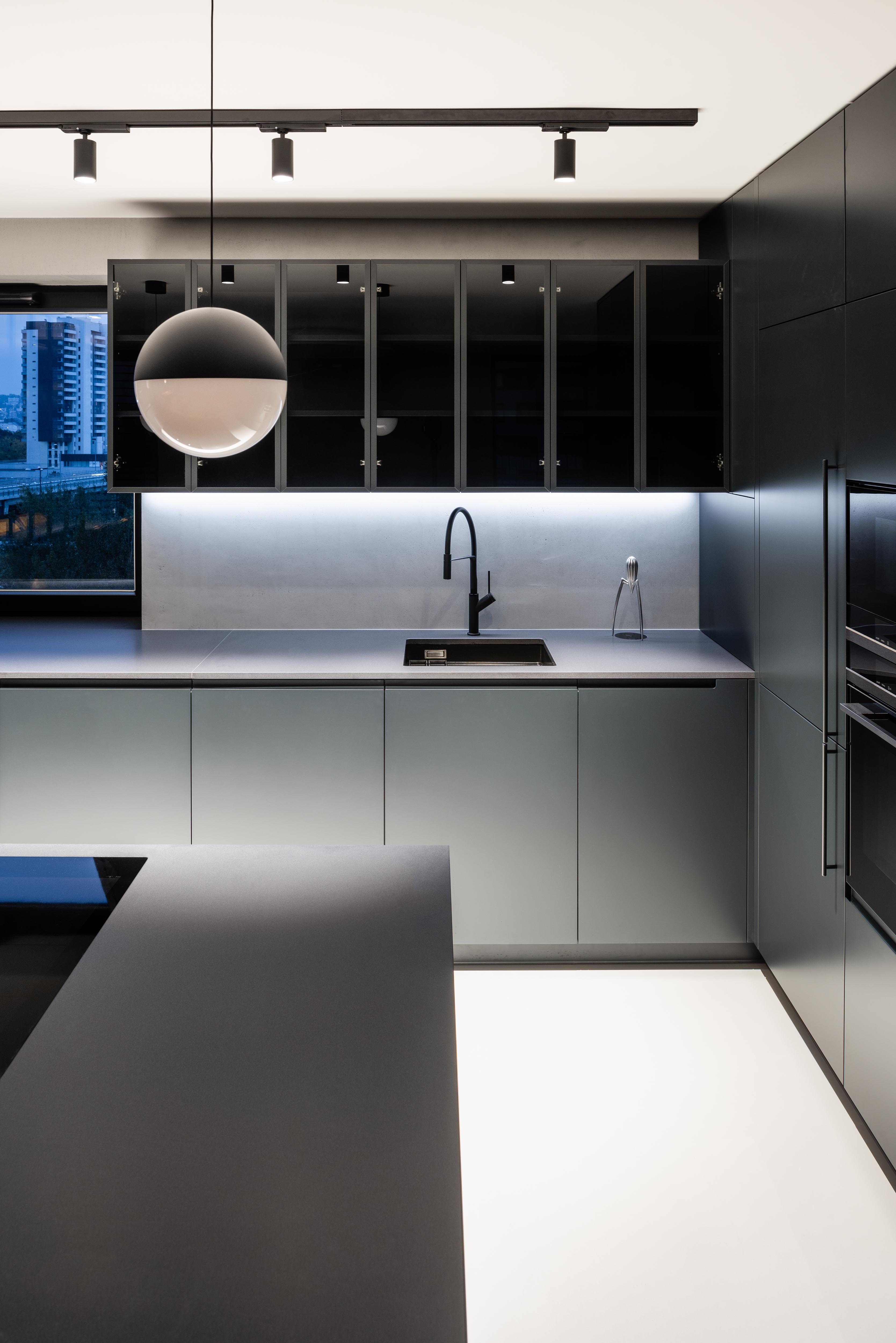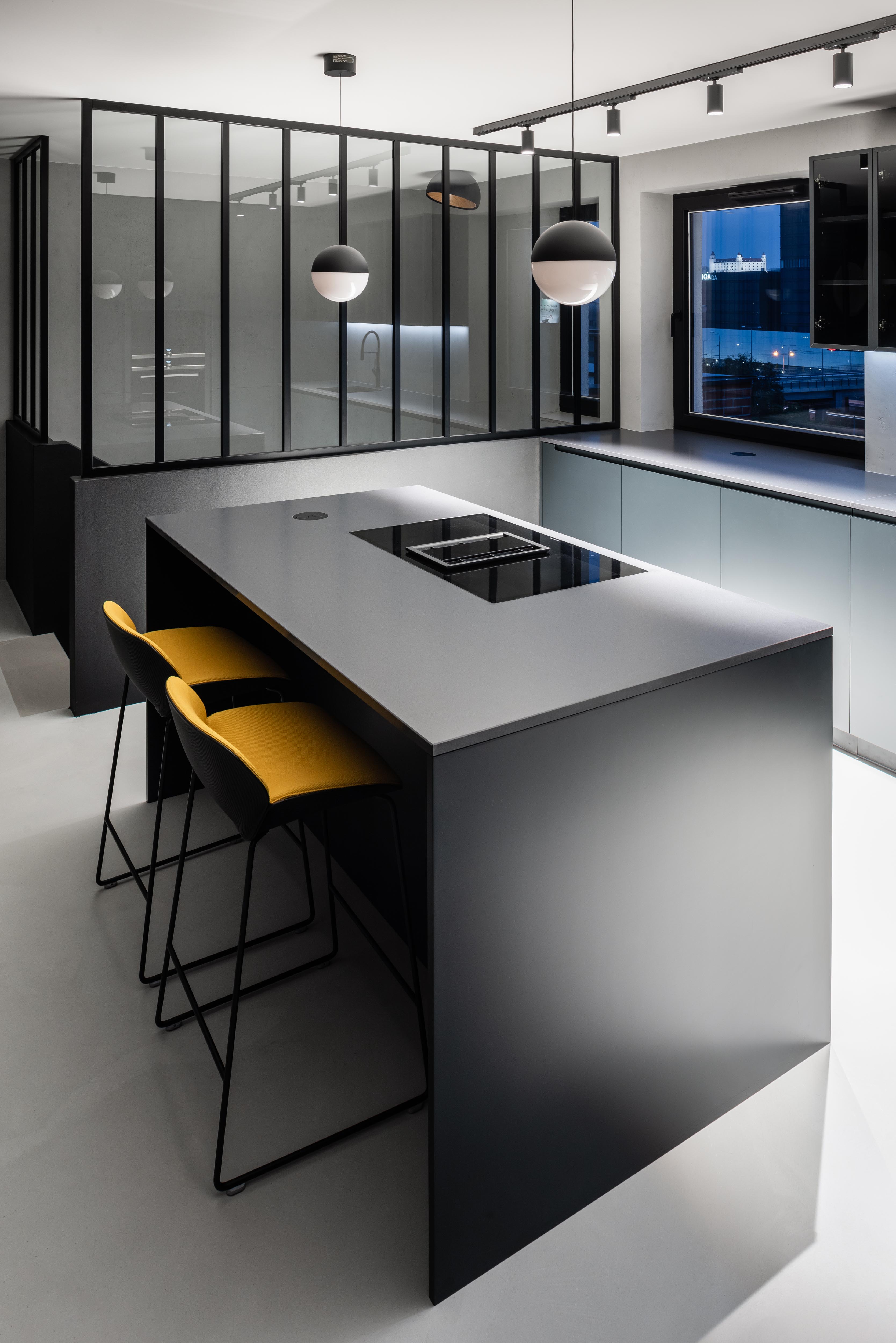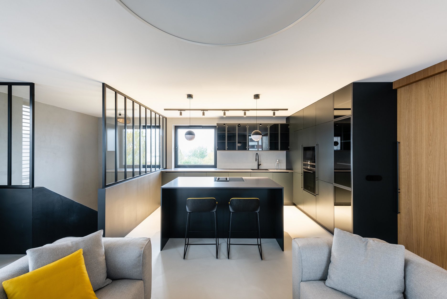 Podlahy s mikro-cementovými stierkami dopĺňajú cementové stierky na stenách. Väčšina mobiliáru je robená na mieru, prírodnú dyhu dopĺňa čierna striekaná MDF doska.
