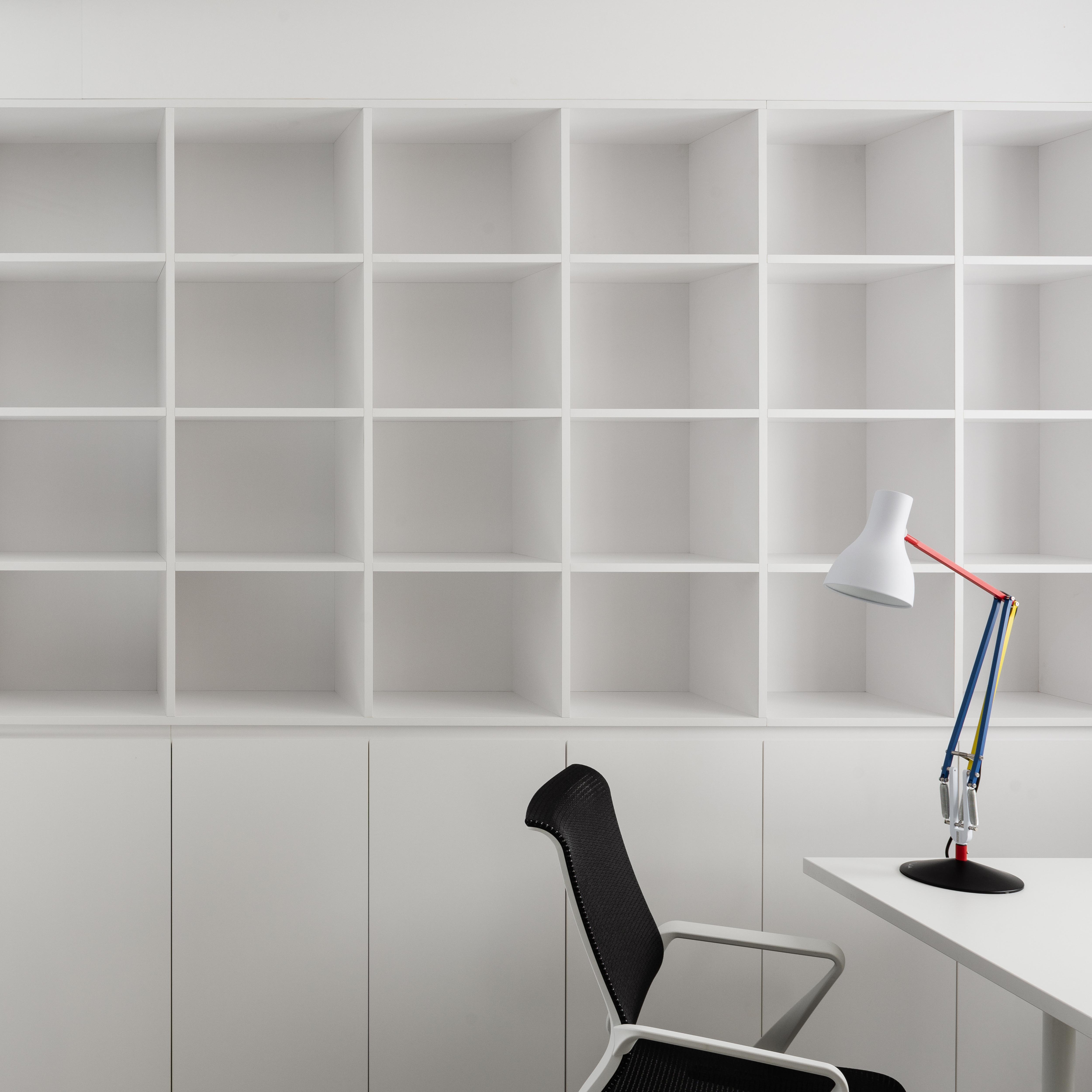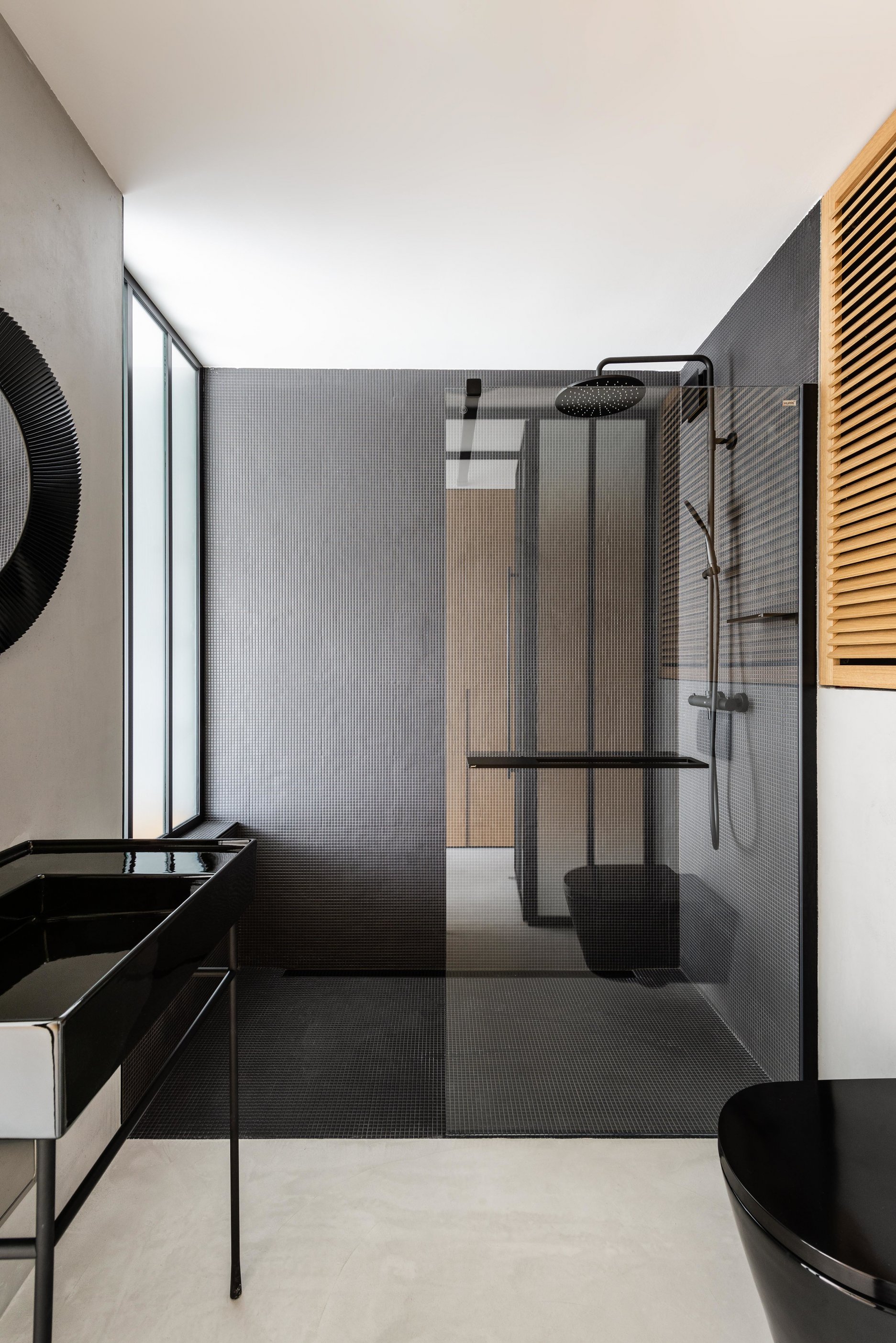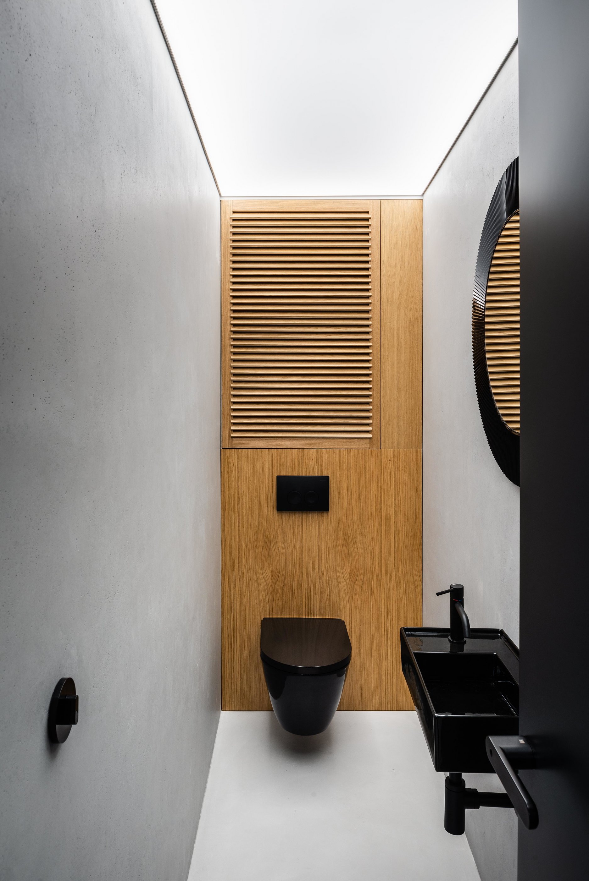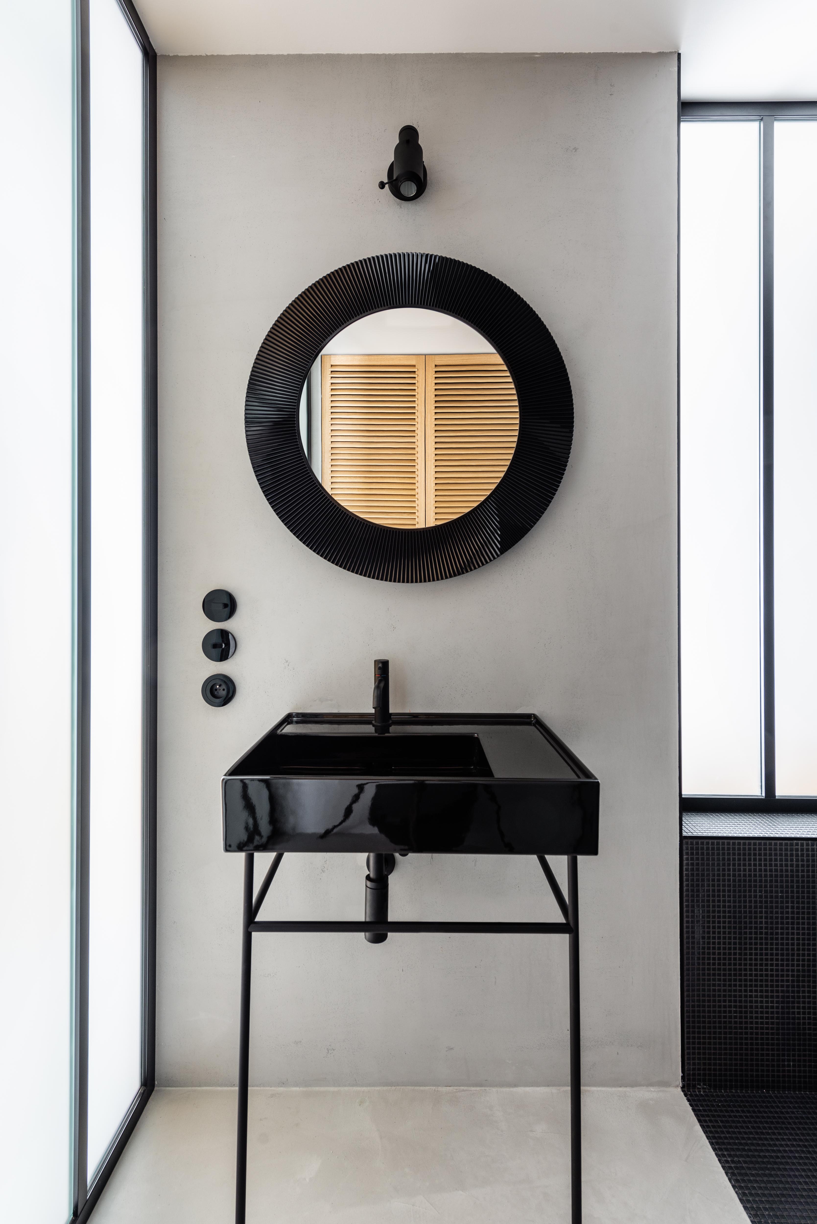 Podlahy s mikro-cementovými stierkami dopĺňajú cementové stierky na stenách. Väčšina mobiliáru je robená na mieru, prírodnú dyhu dopĺňa čierna striekaná MDF doska.