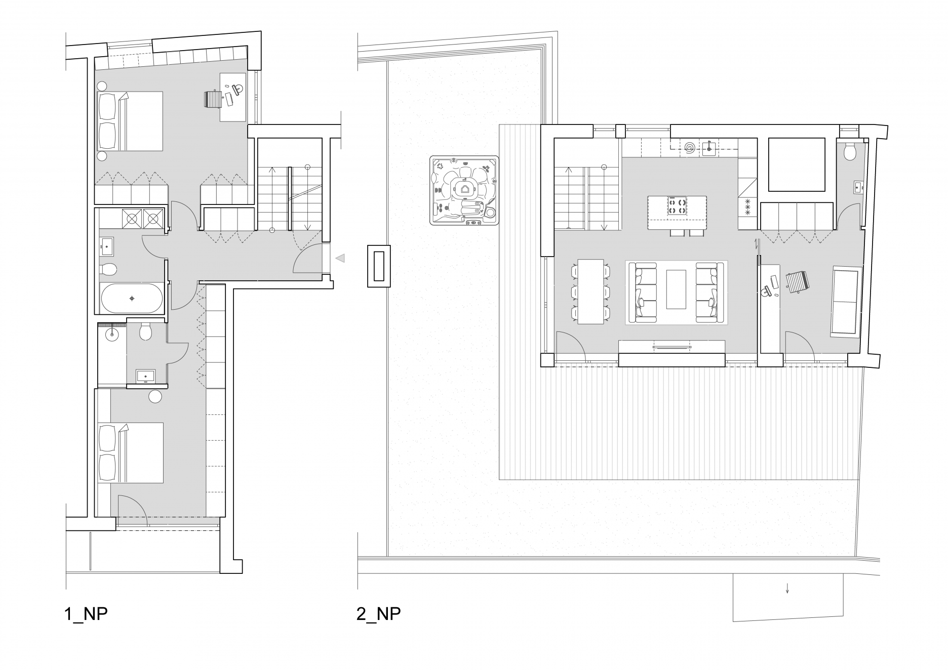Do Bytu sa vstupuje na nižšom podlaží, kde sú situované spálne s kúpeľňami. Dvojramenné schodisko vedie do dennej zóny bytu s hosťovskou izbou. Všetky miestnosti na poschodí sú priamo prepojené s rozsiahlou terasou s výhľadom na hrad.