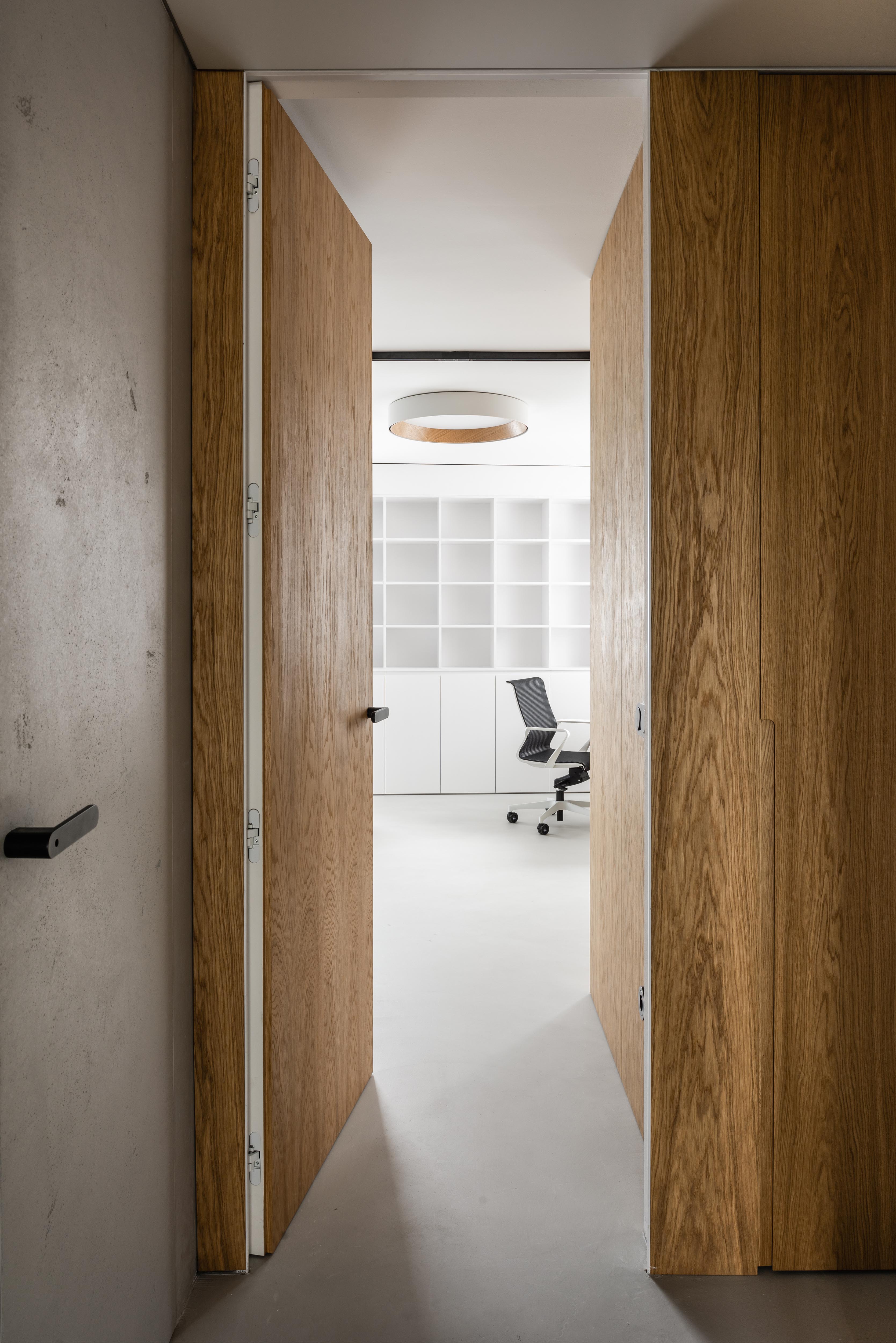 Medzi atypické detaily patria bezfalcové hliníkové dvere, so skrytými rámami a zladená povrchová úprava krídel (z jednej strany striekané a z druhej strany omietnuté stierkou, alebo dyhované a striekané z opačnej), ktoré sa stávajú súčasťou jednoliatych plôch v interiéri. Kľučky umožňujú zamykanie priamo na madle - bez rozety.