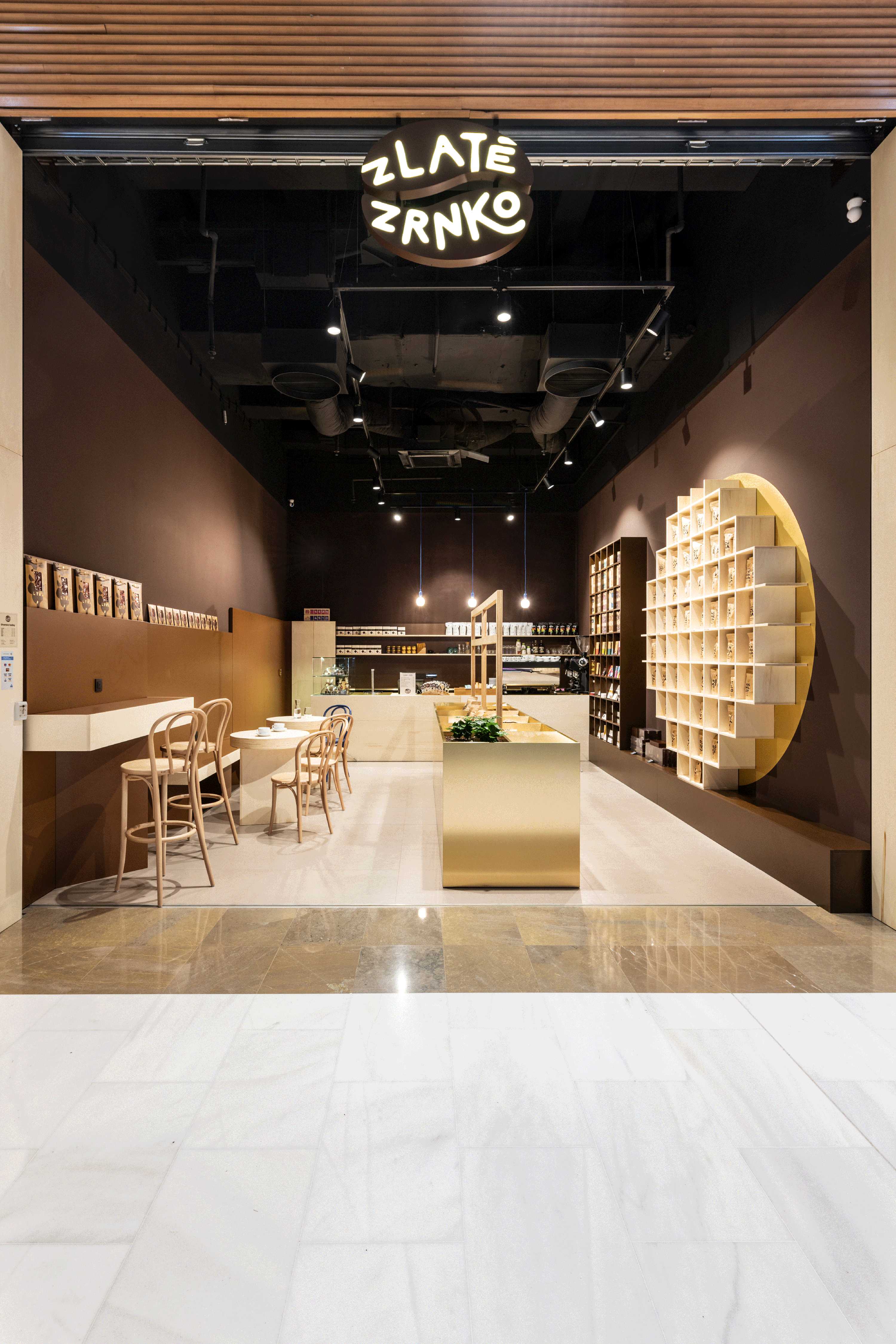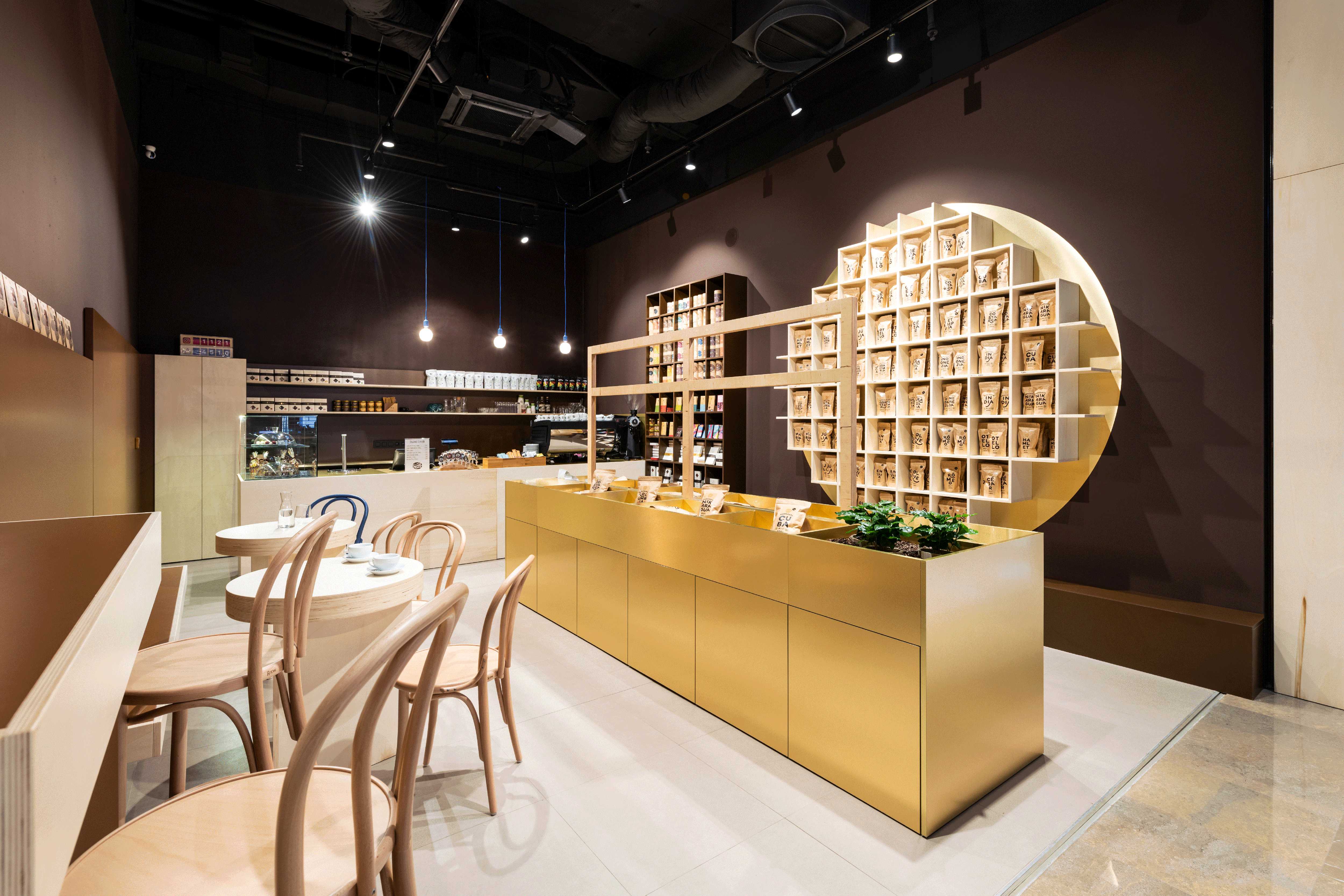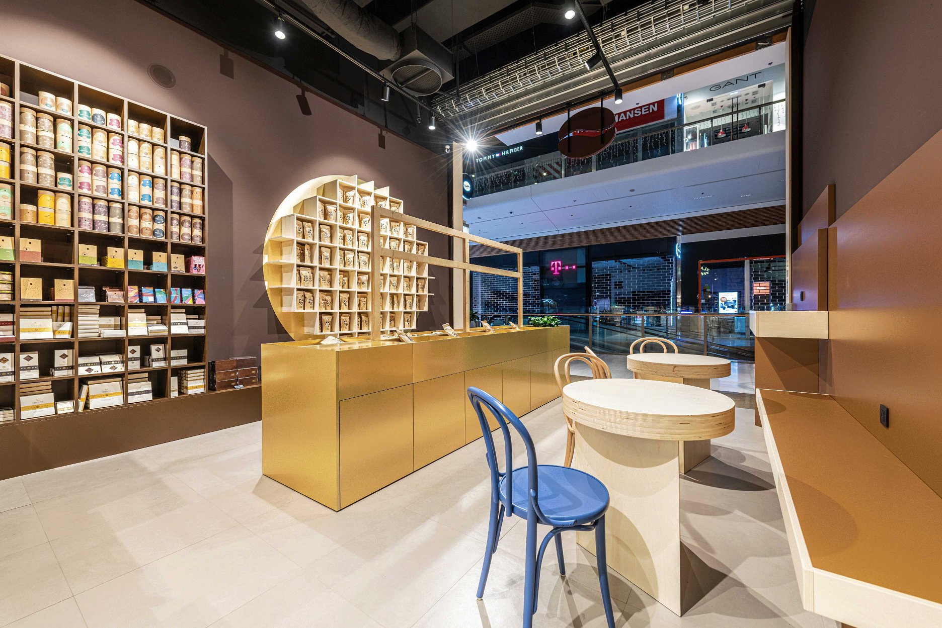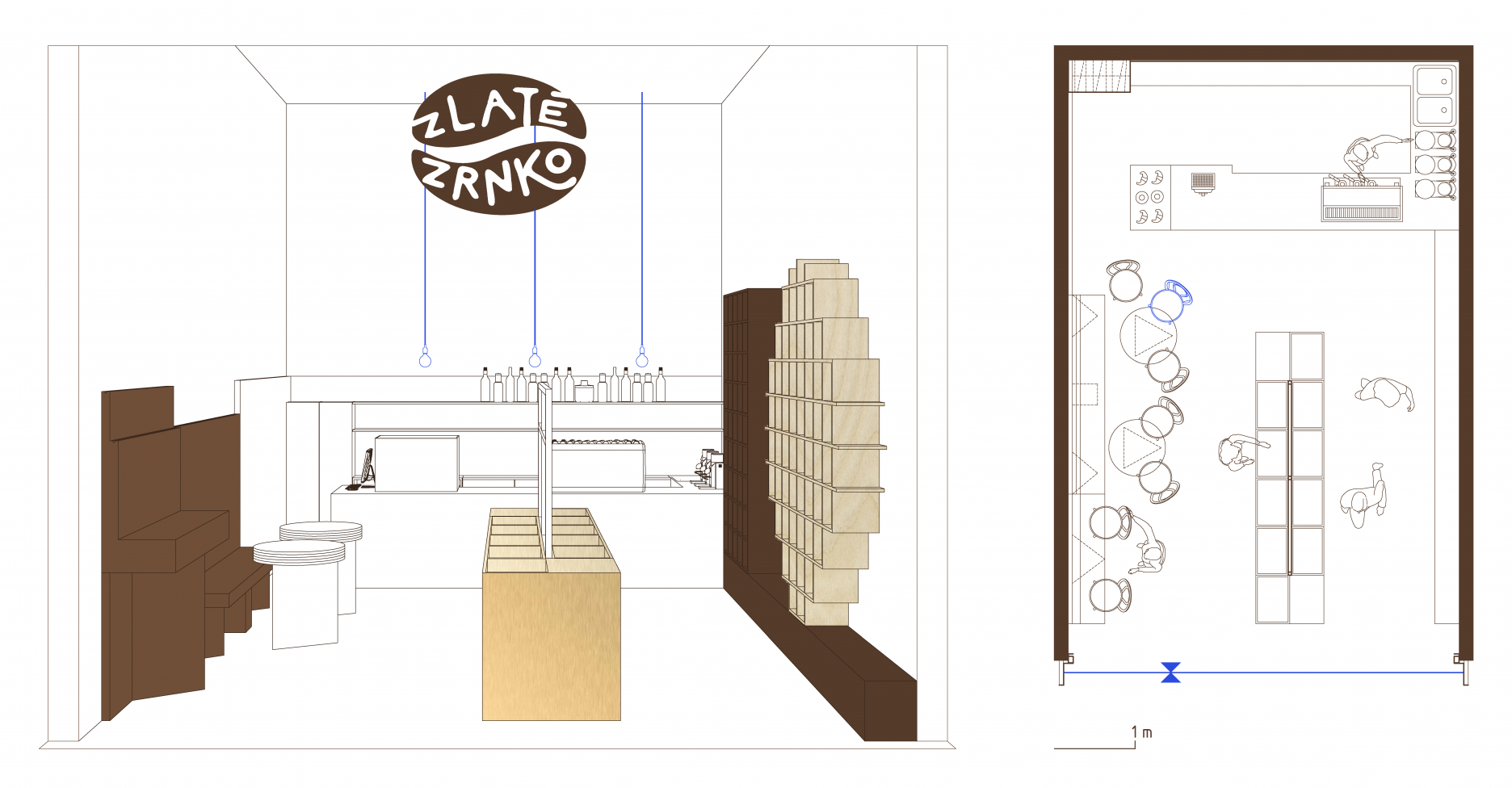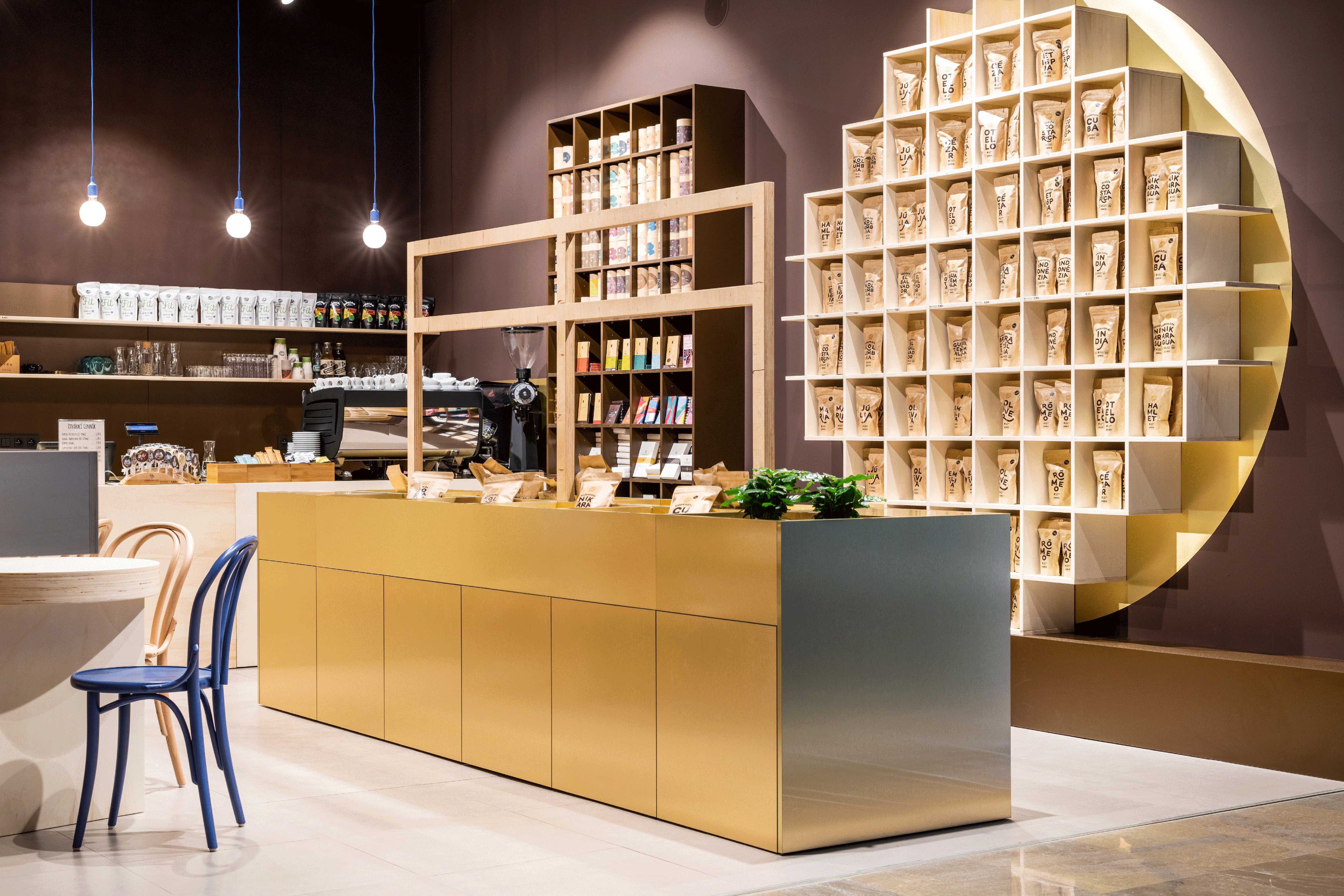 Predajná plocha je necelých 40m2. Interiér je preto navrhnutý s dôrazom na využitie každej steny tak, aby pohyb v priestore ostal príjemný a nestiesnený. Východiskom farebného konceptu je dizan balenia kávy.