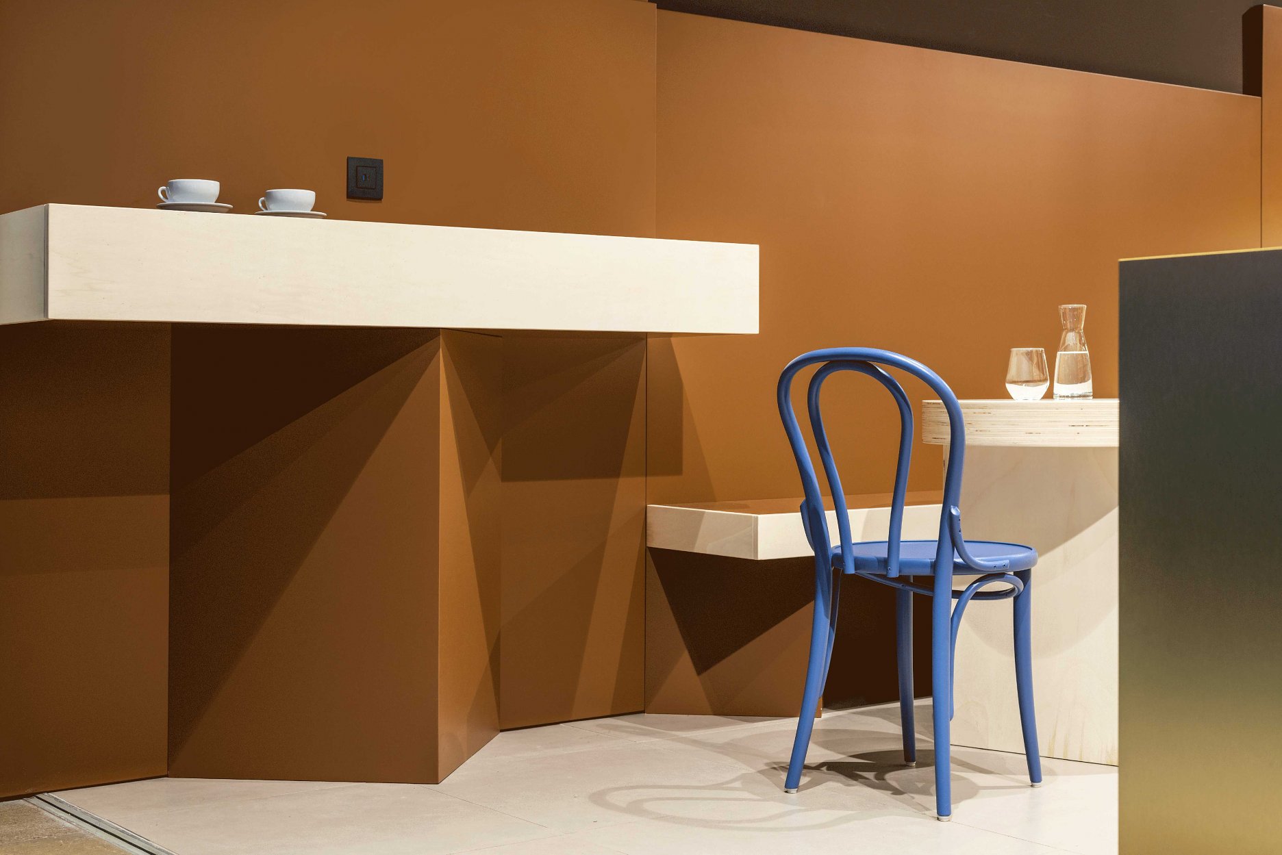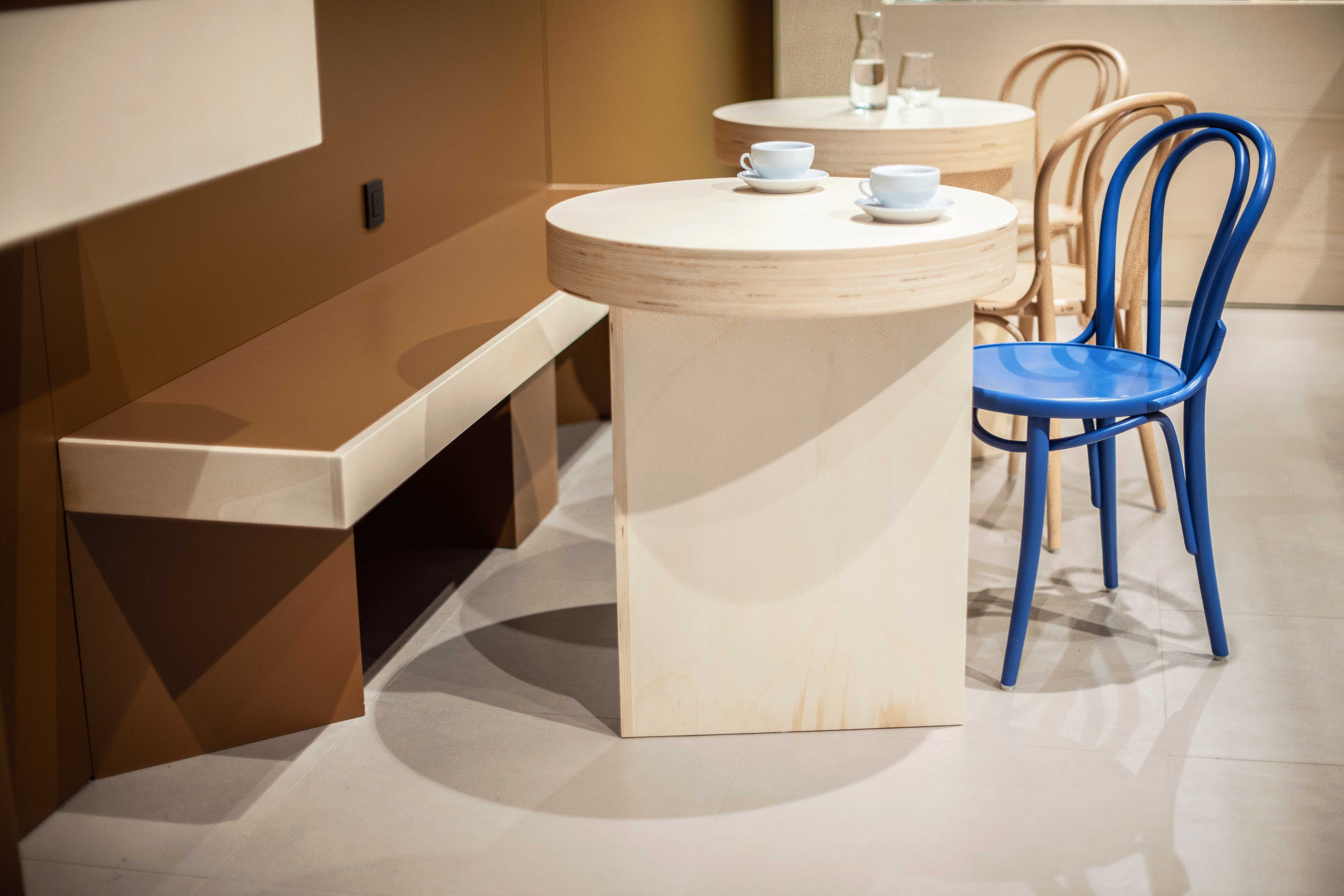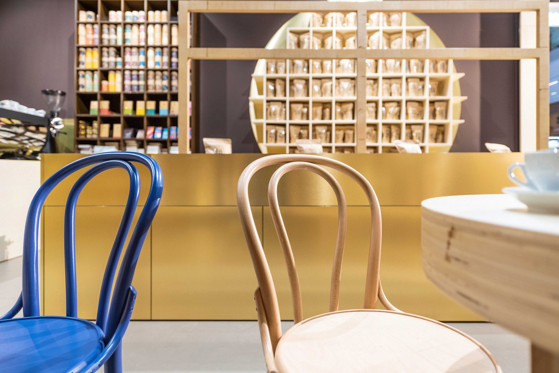 Použité materiály a farebný návrh sa snžia navodiť ambientnú atmosféru s vôňou kávy a čokolády. DTD lamino dosky sú kombinované so svetlým topoľovým drevom a zlatým povrchom odkazujúcim na produkt.