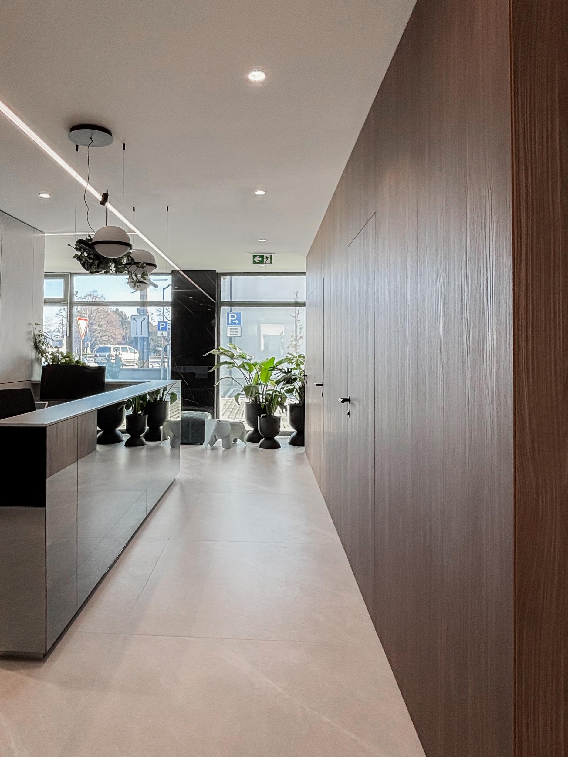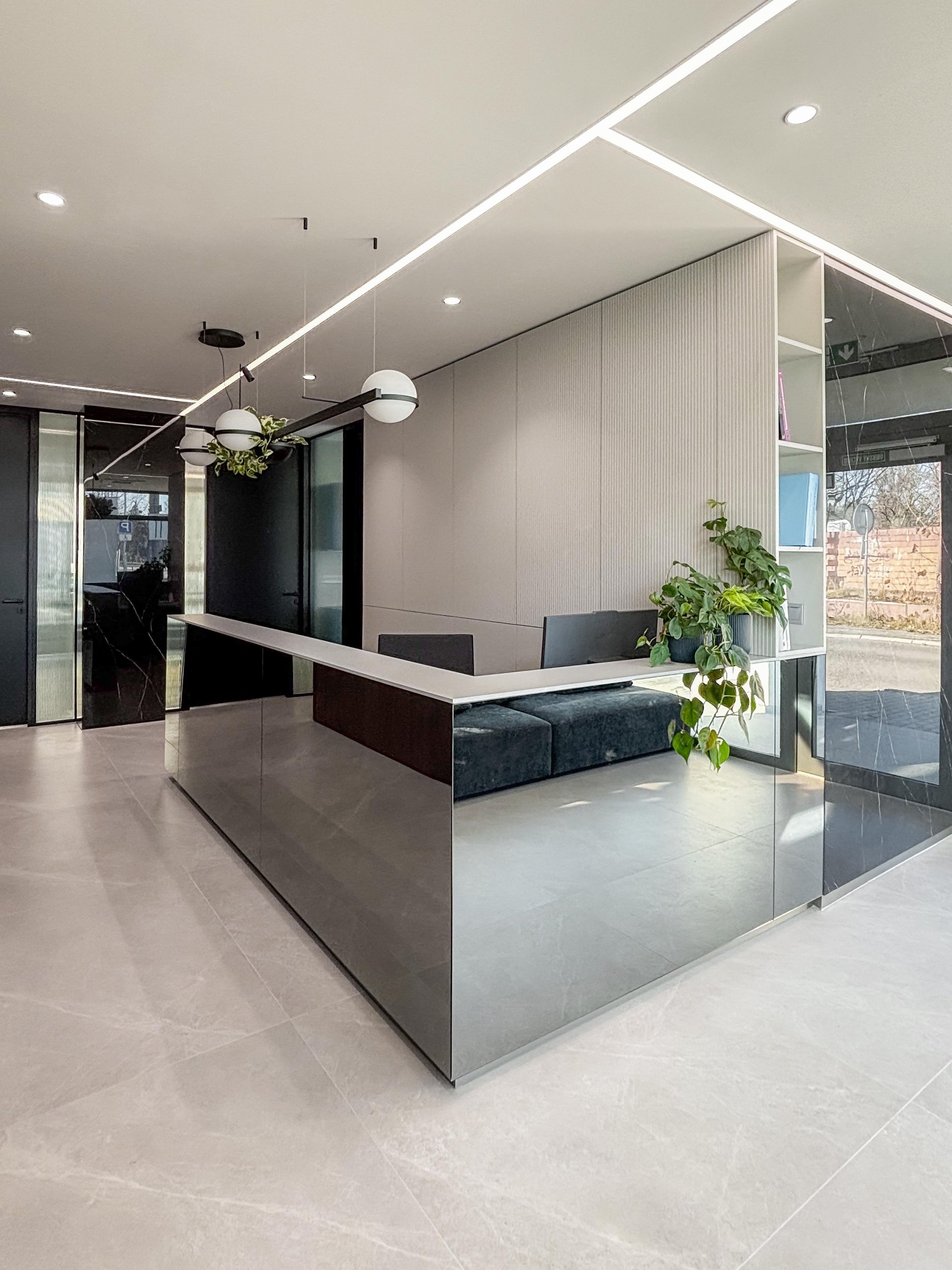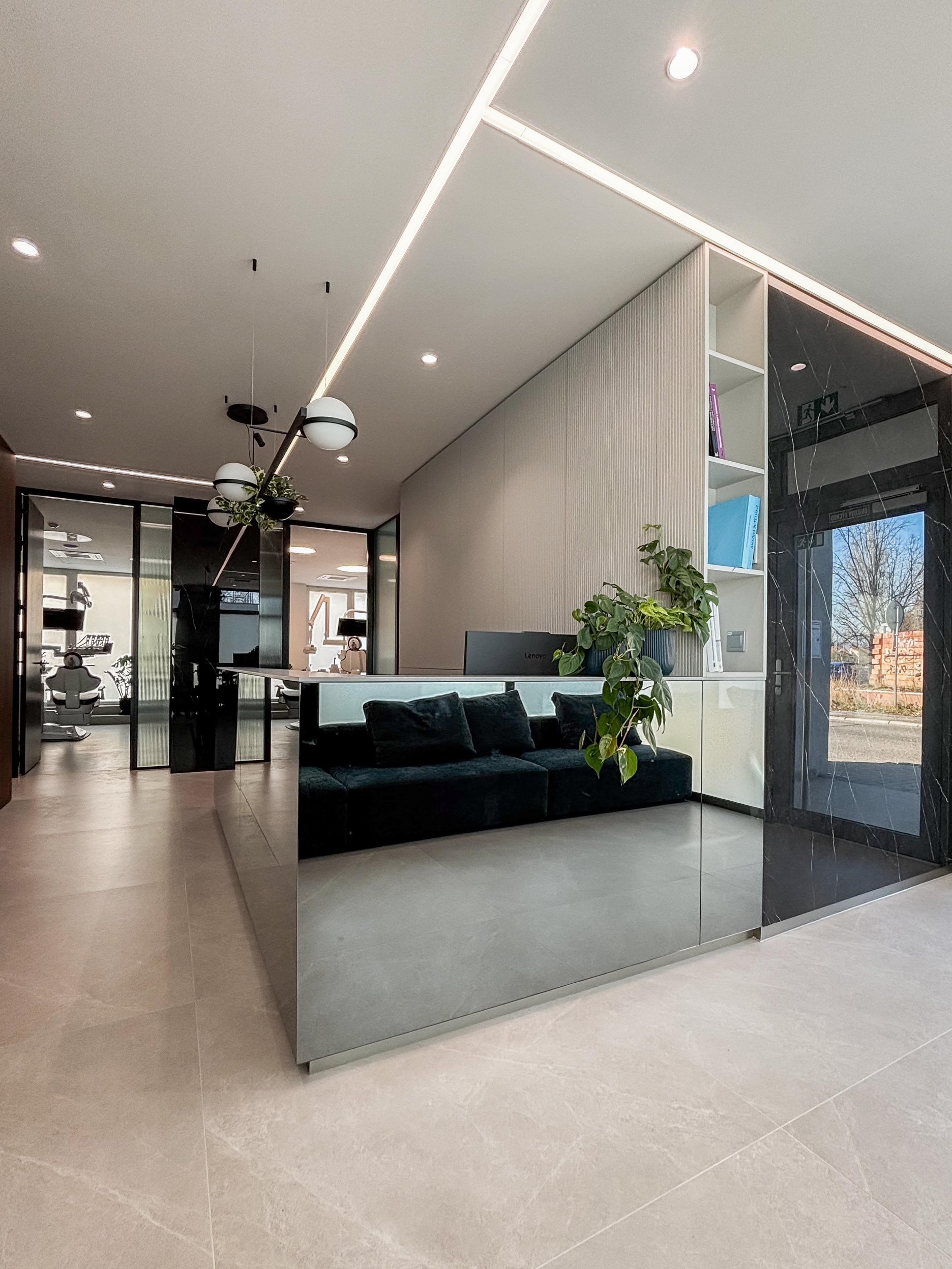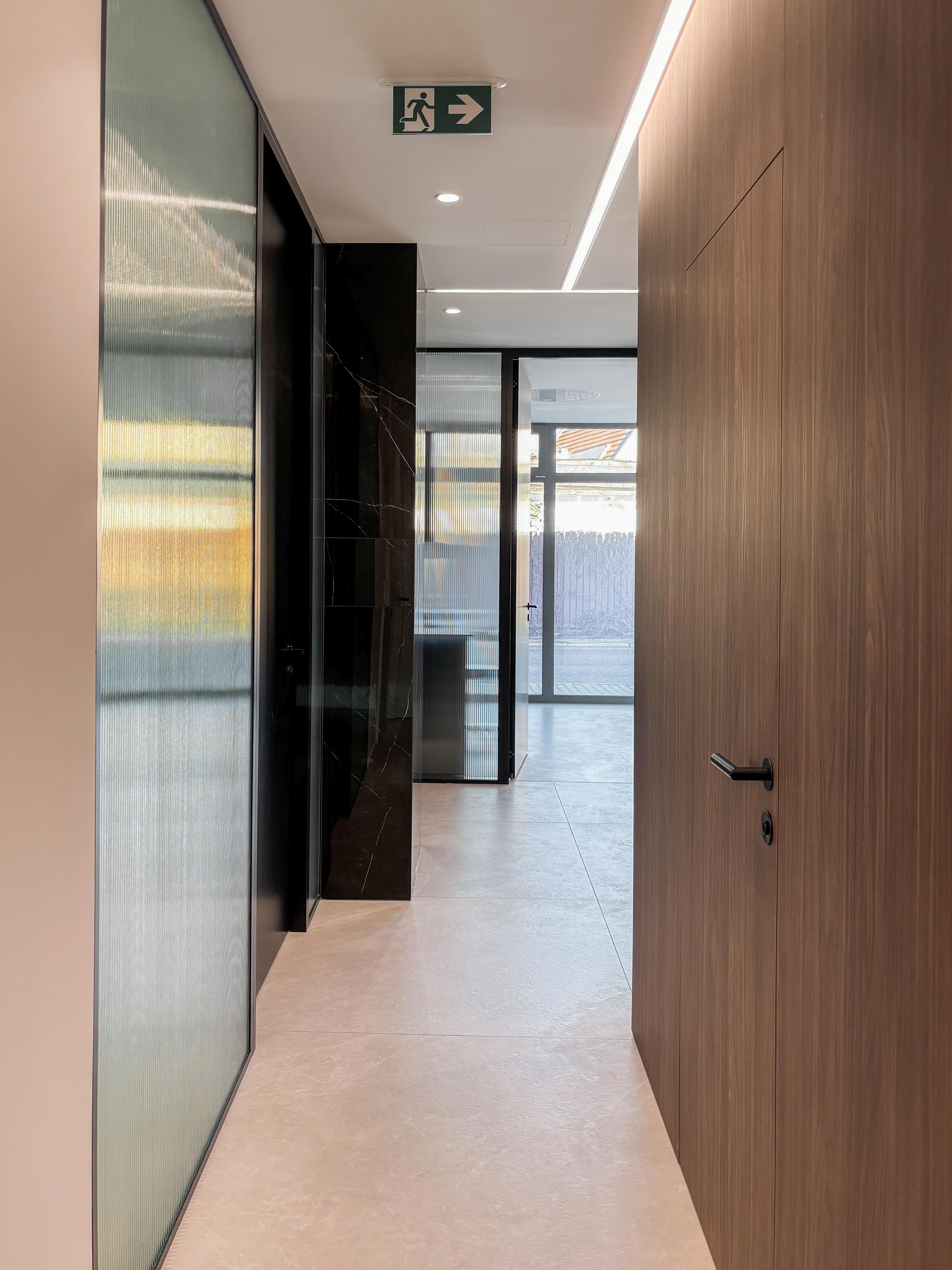 Architekti Ľudovít Vitko a Silvia Vitková navrhli dispozíciu tak, aby ambulancie, kancelária a vstupná časť využívali denné osvetlenie a boli orientované po obvode pôvodného priestoru. Súkromie voči ulici a átriu zabezpečujú smart fólie, ktoré umožňujú meniť priehľadnosť presklených plôch podľa prevádzkových potrieb. Presklené priečky zároveň privádzajú svetlo do chodby a zadnej časti recepcie a vytvárajú vizuálny kontakt smerom k ambulanciám bez priameho zásahu do súkromia pacientov a personálu. Technické riešenie týchto konštrukcií zohľadňuje aj požiadavky radiačnej ochrany v súvislosti s RTG prevádzkou.