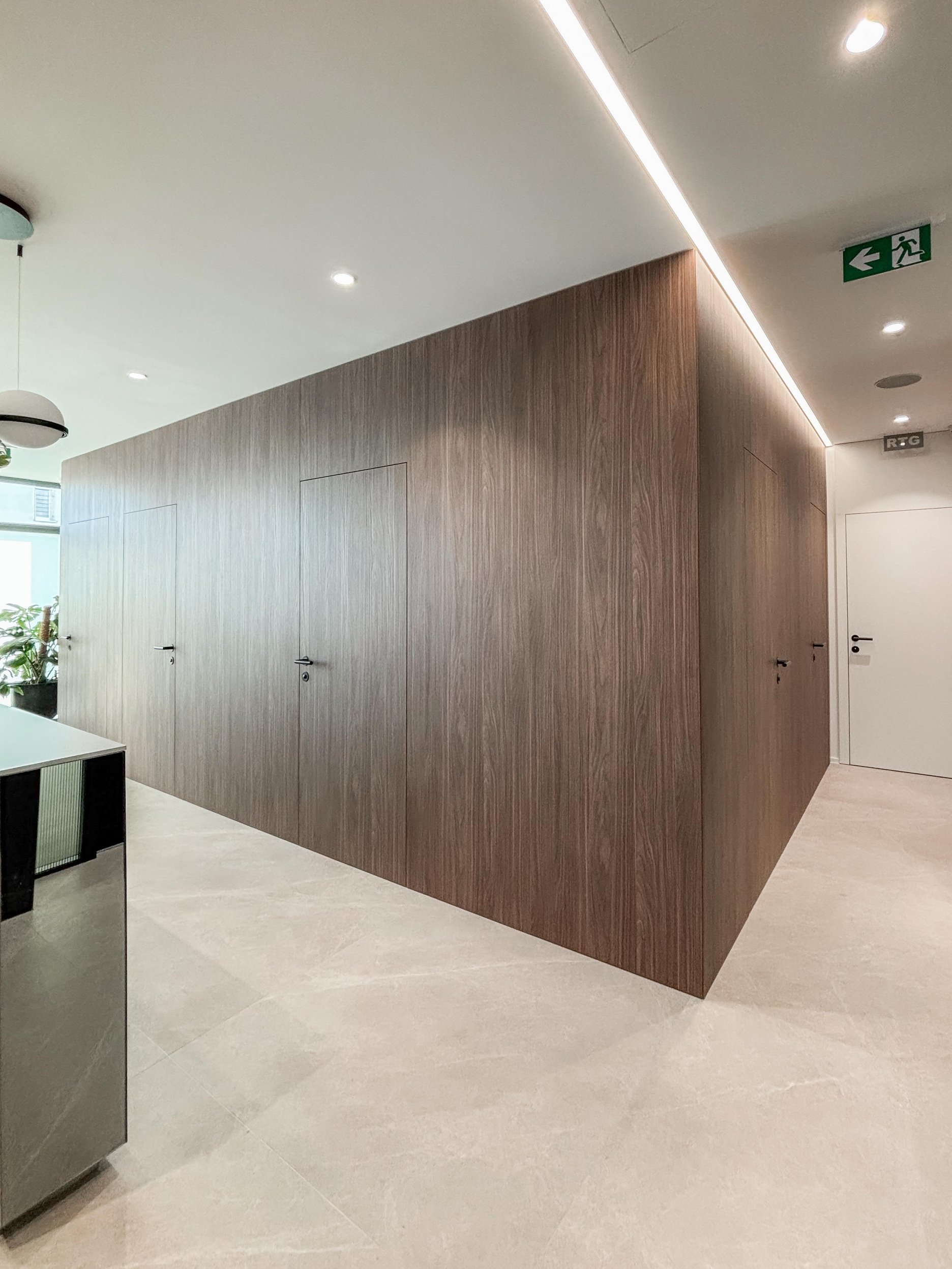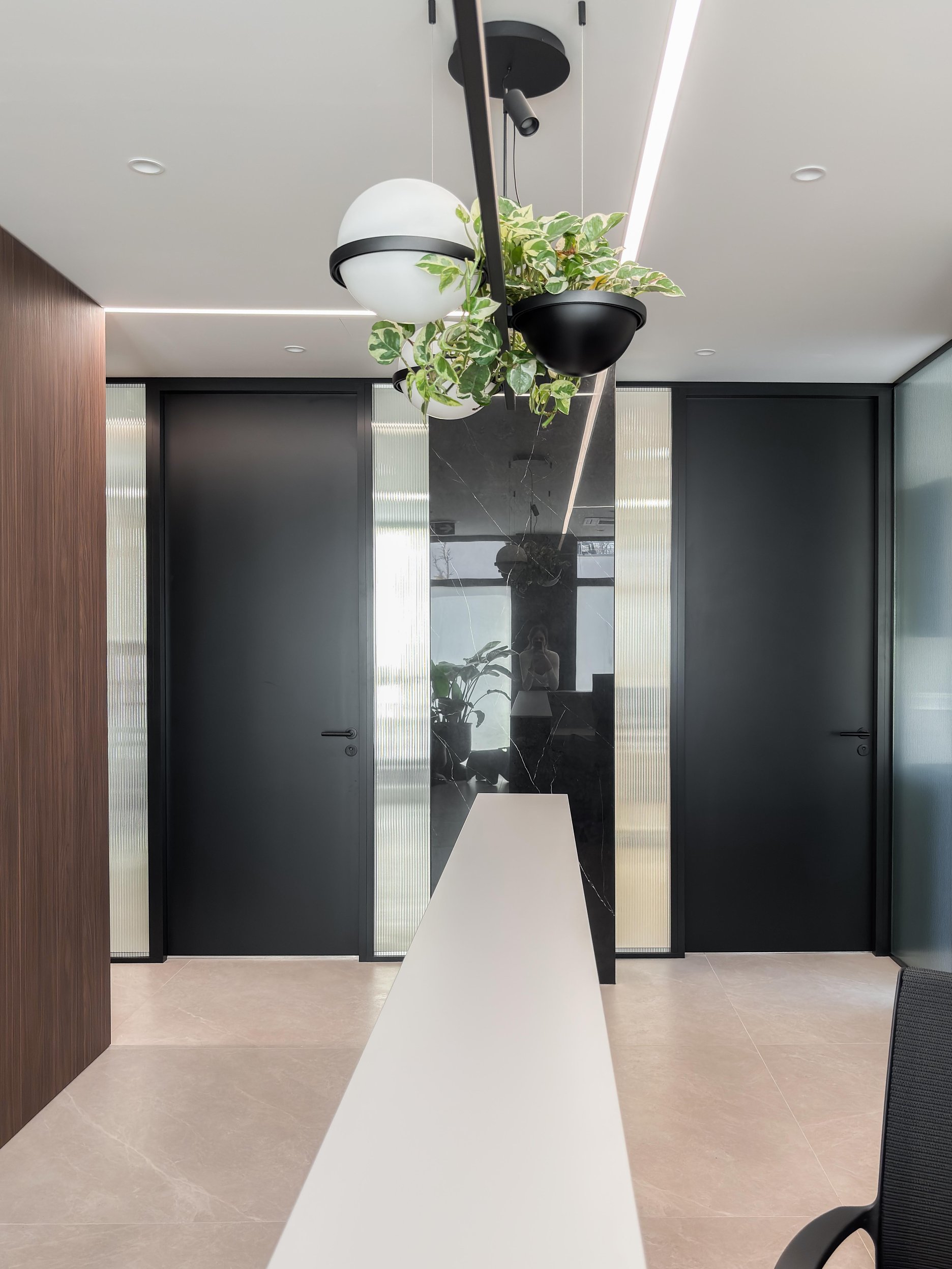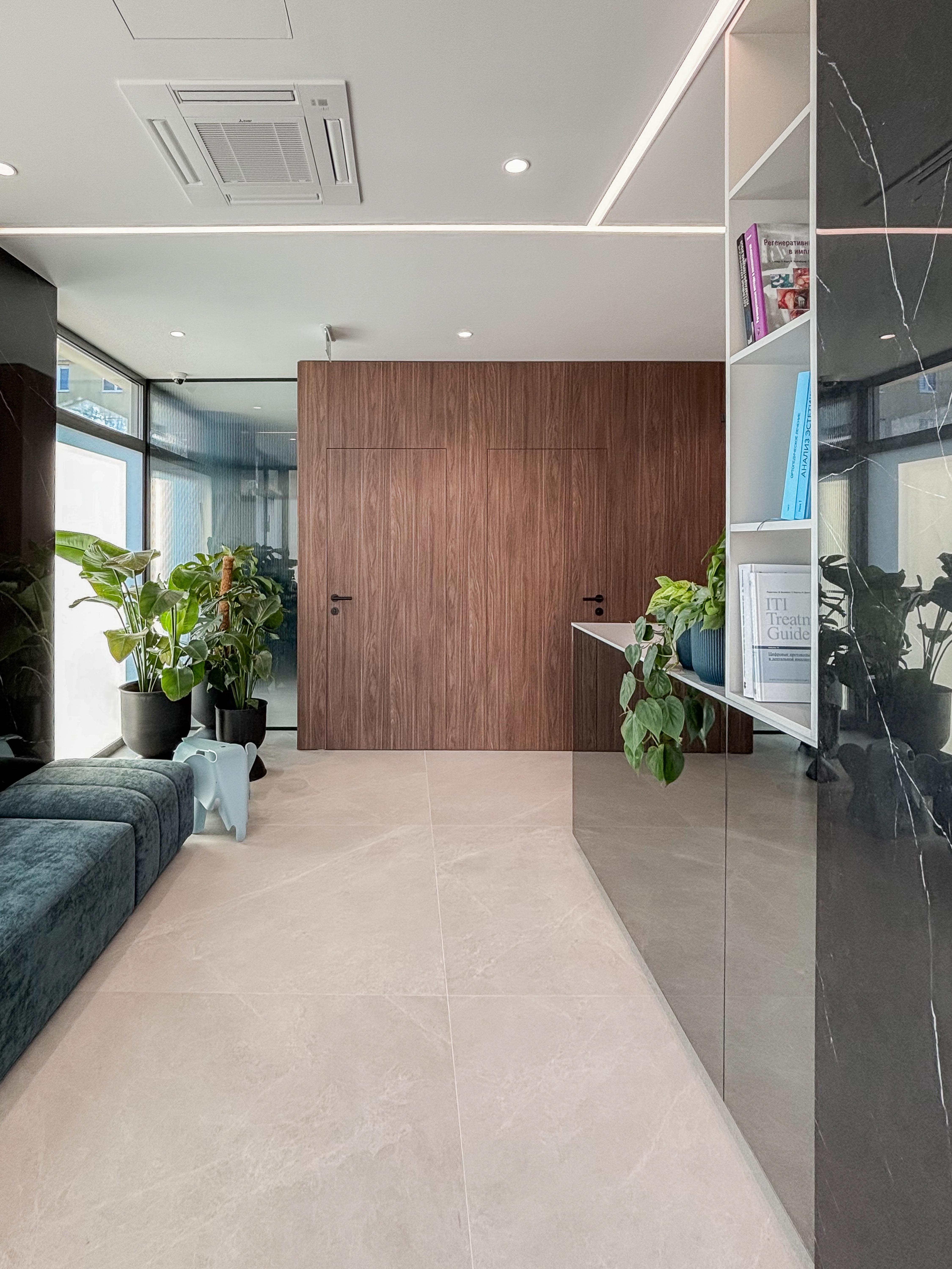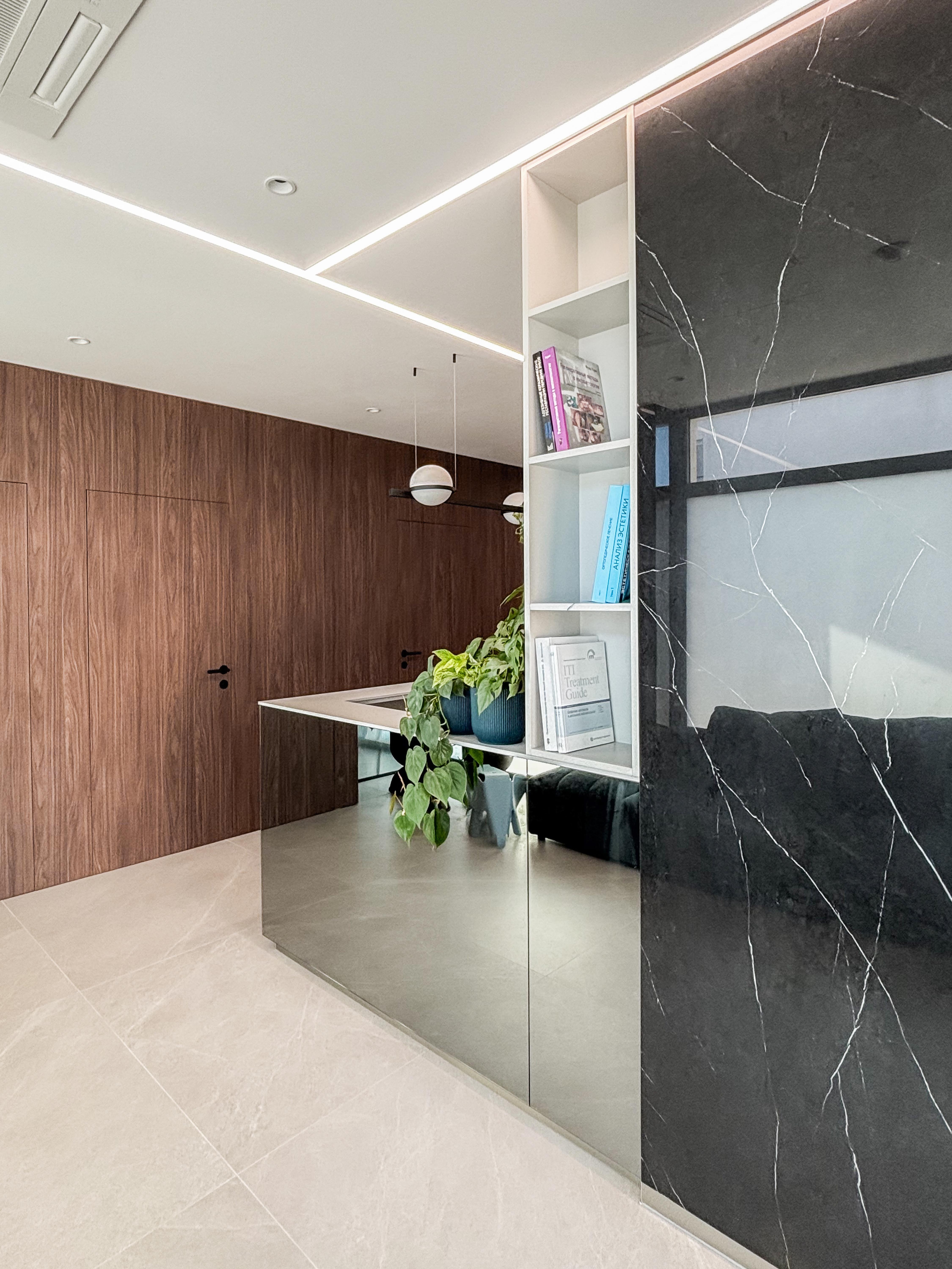 Architekti Ľudovít Vitko a Silvia Vitková navrhli dispozíciu tak, aby ambulancie, kancelária a vstupná časť využívali denné osvetlenie a boli orientované po obvode pôvodného priestoru. Súkromie voči ulici a átriu zabezpečujú smart fólie, ktoré umožňujú meniť priehľadnosť presklených plôch podľa prevádzkových potrieb. Presklené priečky zároveň privádzajú svetlo do chodby a zadnej časti recepcie a vytvárajú vizuálny kontakt smerom k ambulanciám bez priameho zásahu do súkromia pacientov a personálu. Technické riešenie týchto konštrukcií zohľadňuje aj požiadavky radiačnej ochrany v súvislosti s RTG prevádzkou.