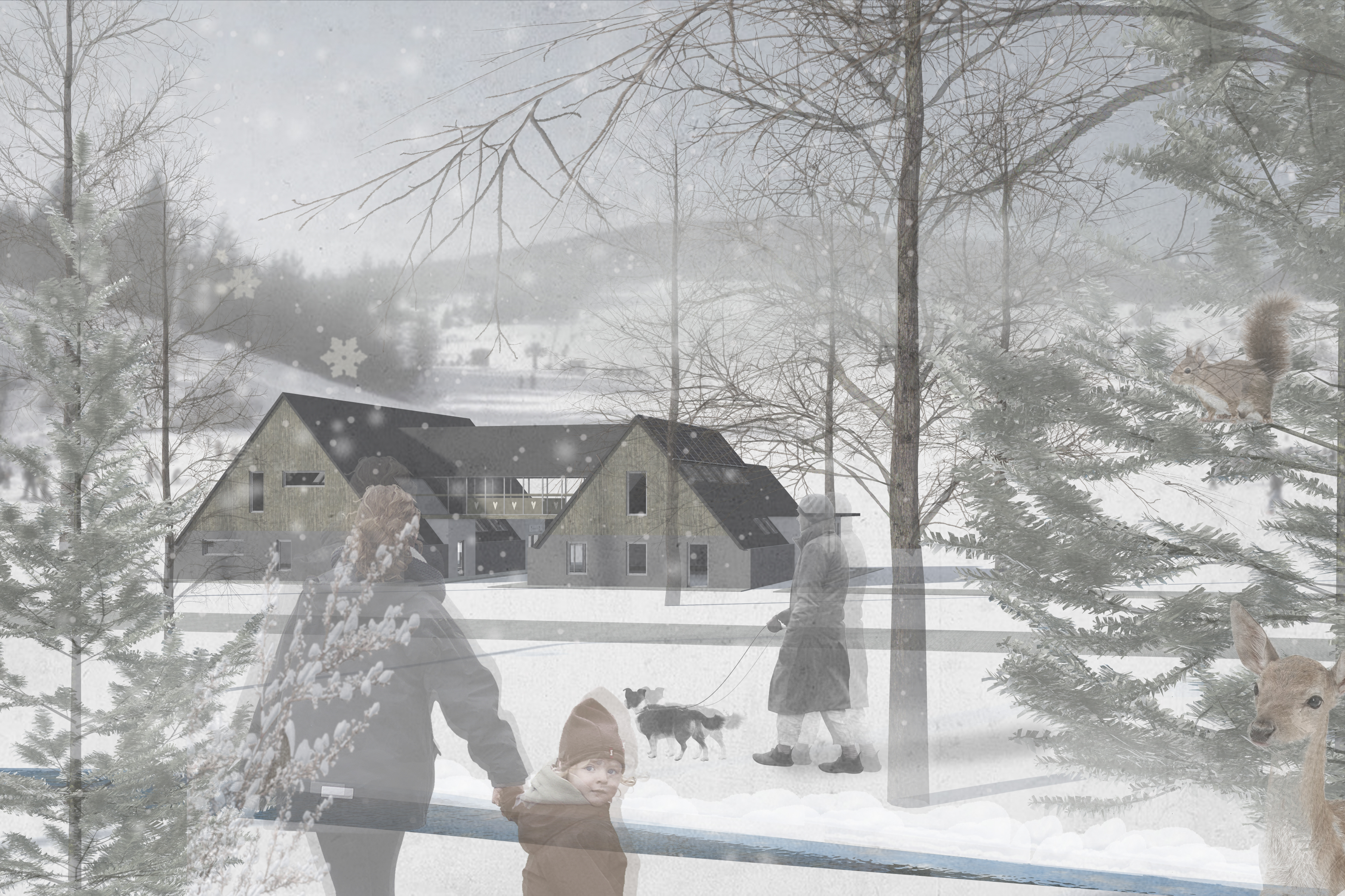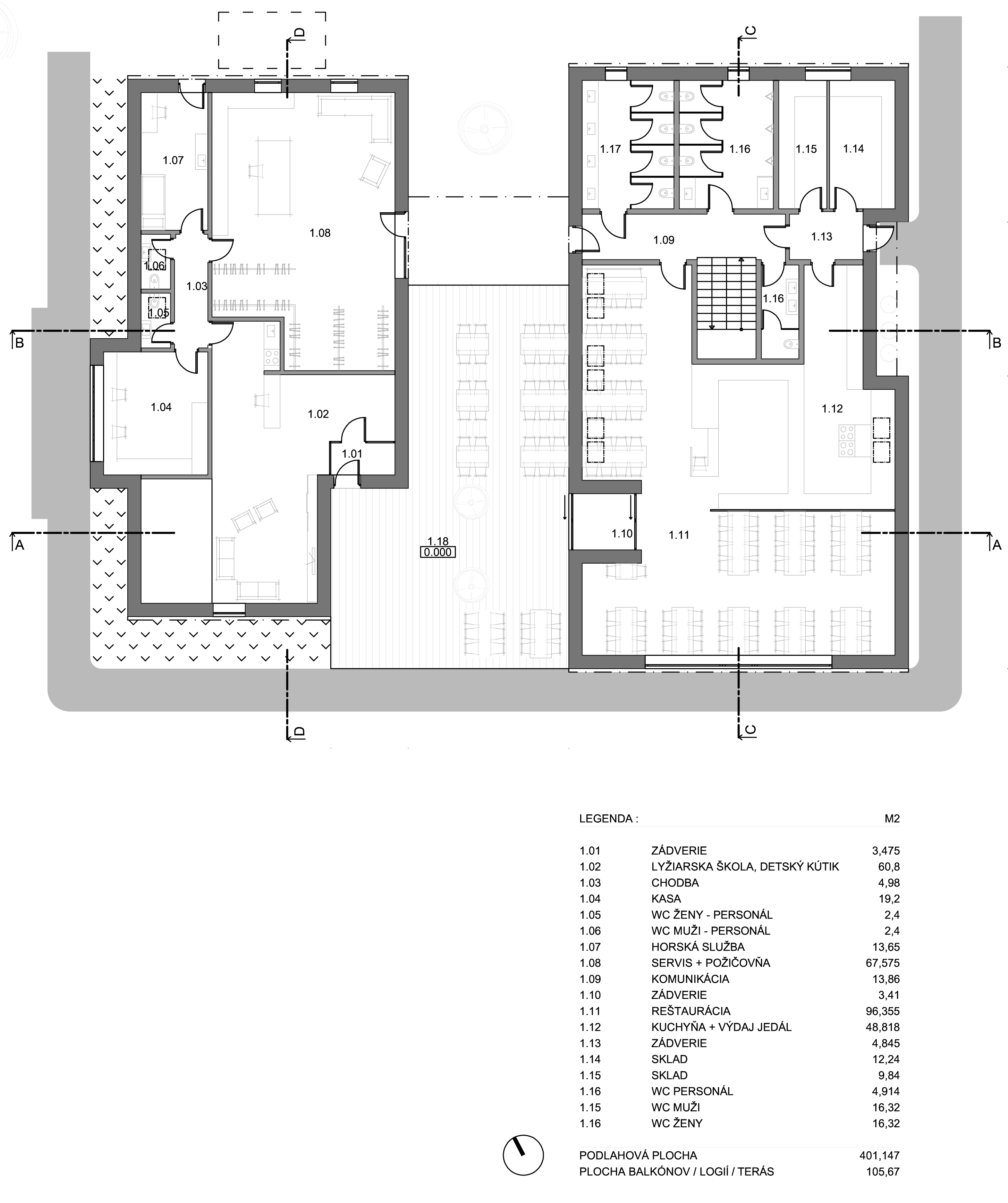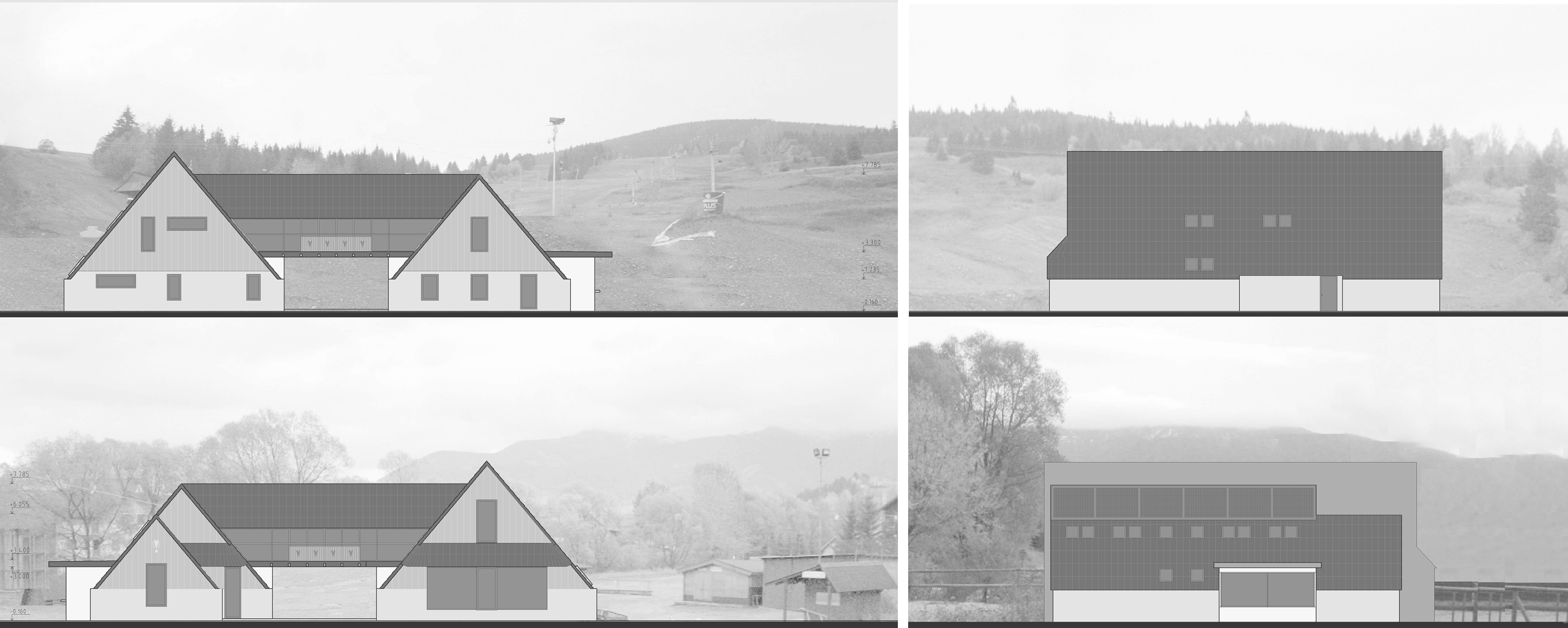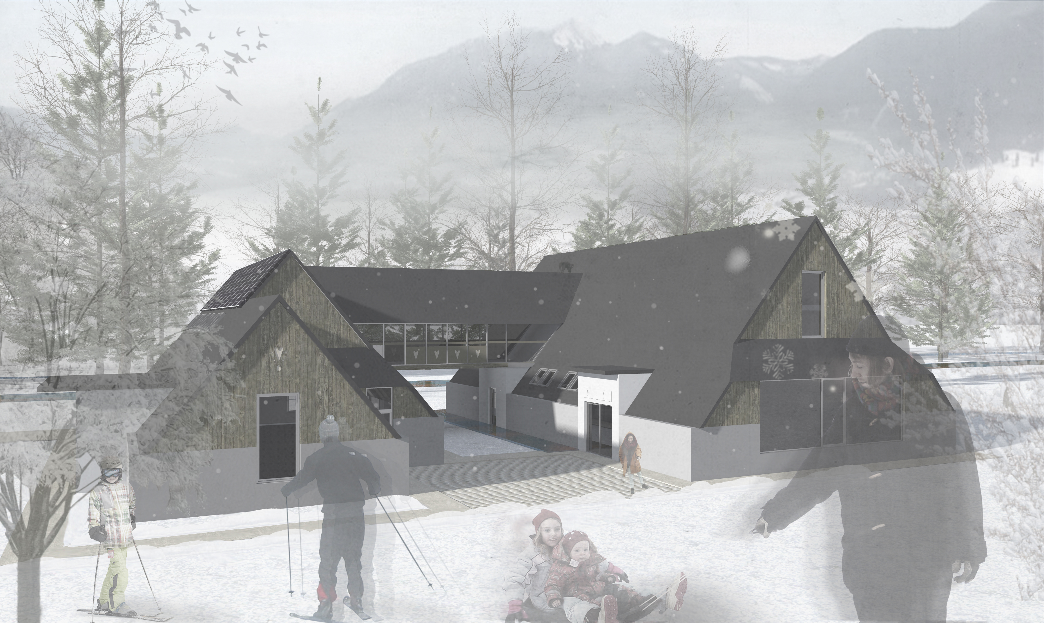 Novonavrhnuté stredisko sa skladá z tvoch samosčtatných objektov navzájom prepojených chodbou na druhom nazdemnom podlaží. Tento prepojovací prvok na prvom nadzemnom podlaží slúži ako krytie vchodových priestorov jednotlivých jednotiek. Terasa je situovaná medzi dvoma objektami a slúži ako vonkajšie sedenie k reštaurácii. Je orientovaná na juhozápad, čo umožňuje jej preslnenie počas celého dňa až do večera. Svojím výhľadom je priamo prepojená so svahom, takže v rámci umiestnenia vytvára ideálny rekreačno-stravovací priestor.