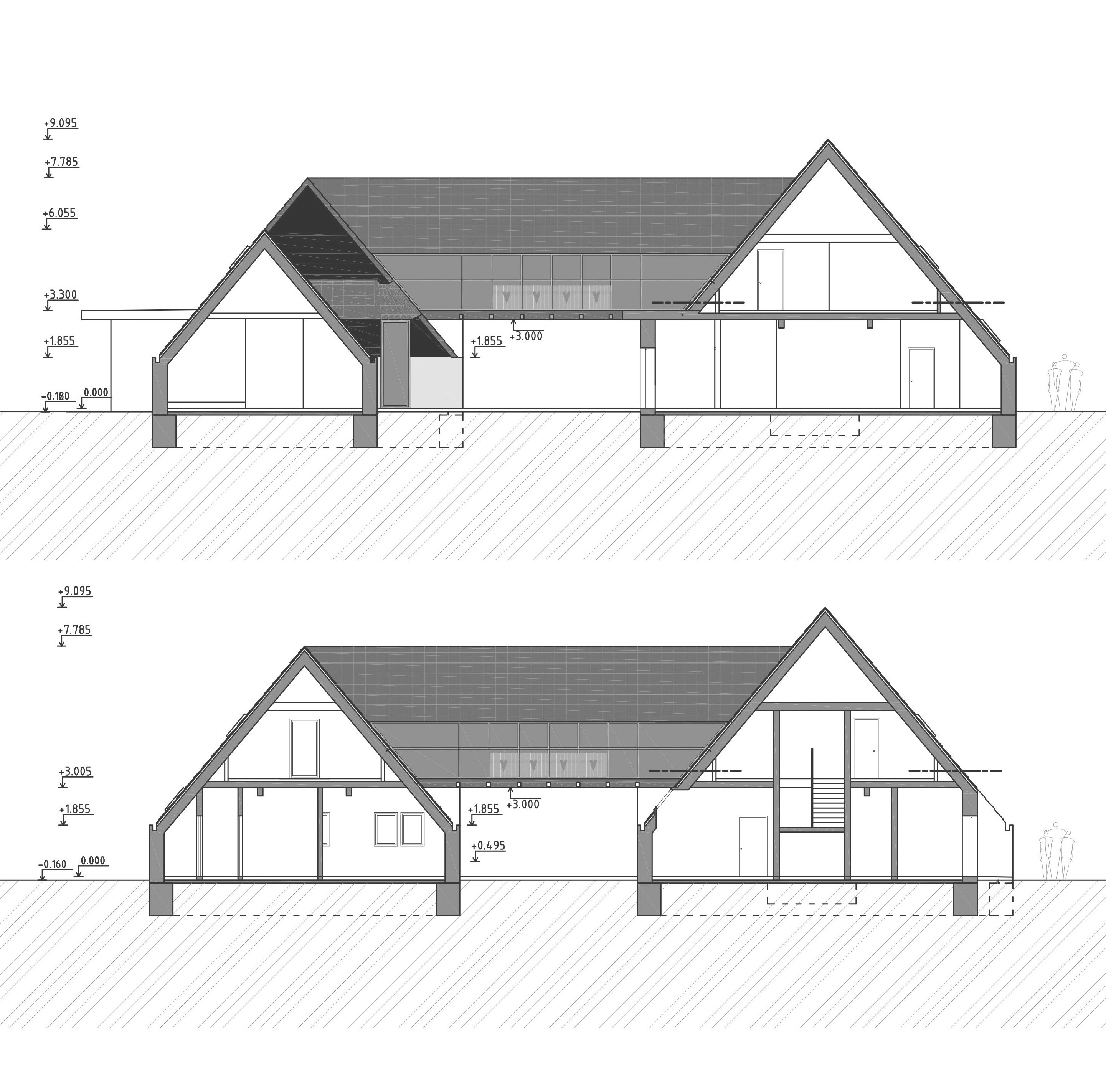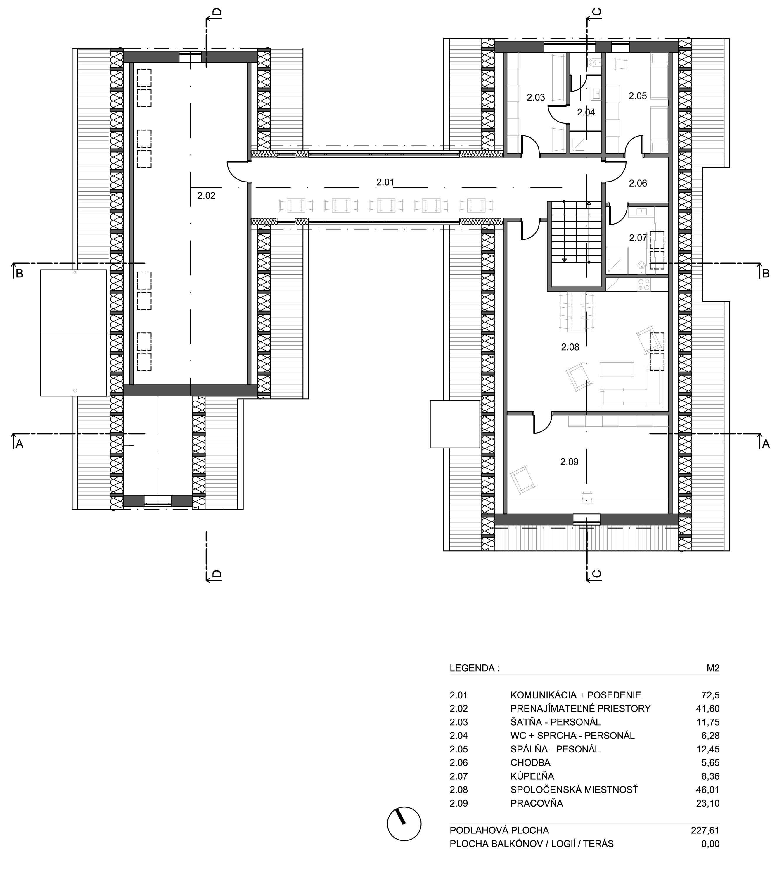 Z tejto zrubovej techniky nakoniec bolo v rámci konceptuálneho riešenia navrhovaného objektu vhodné použiť iba kamenný sokel, ktorý zároveň, okrem štítových stien vytiahnutých až po hrebeň, tvorí jedinú vertikálnu časť objektu.