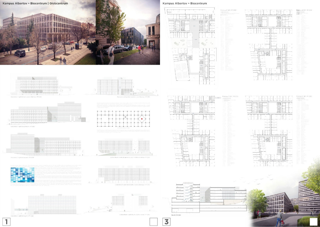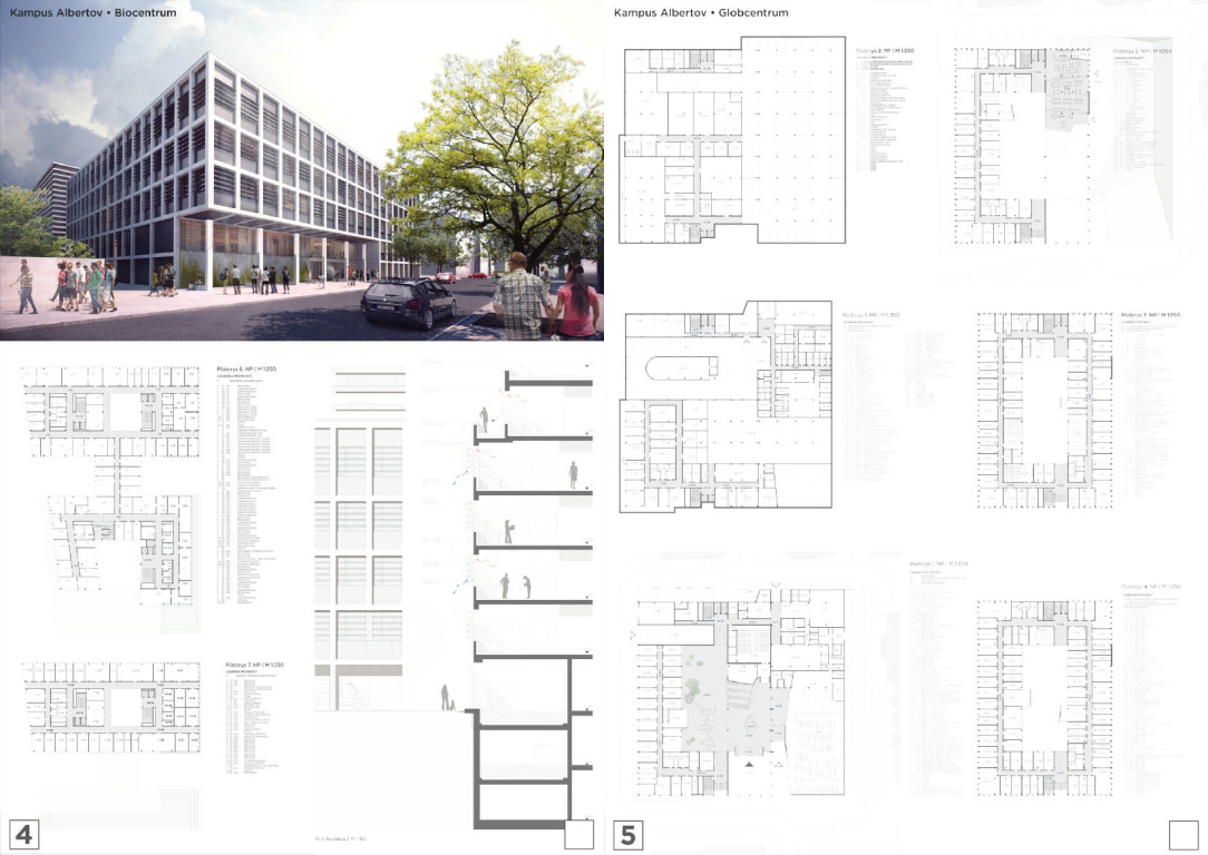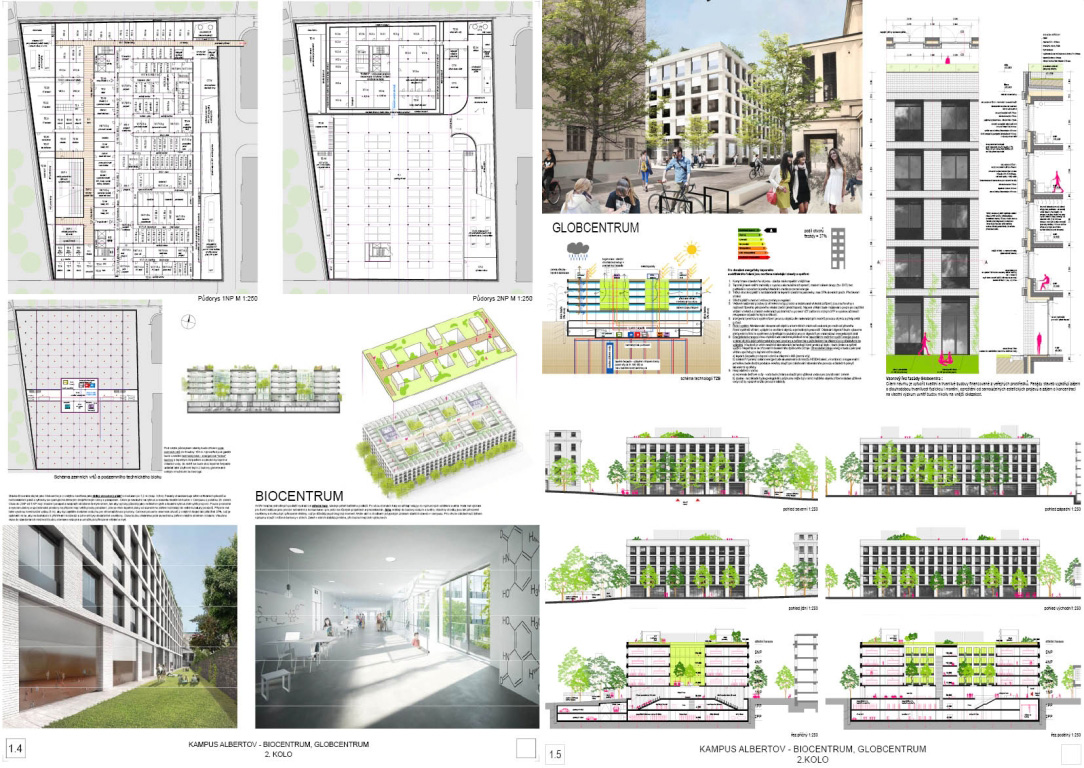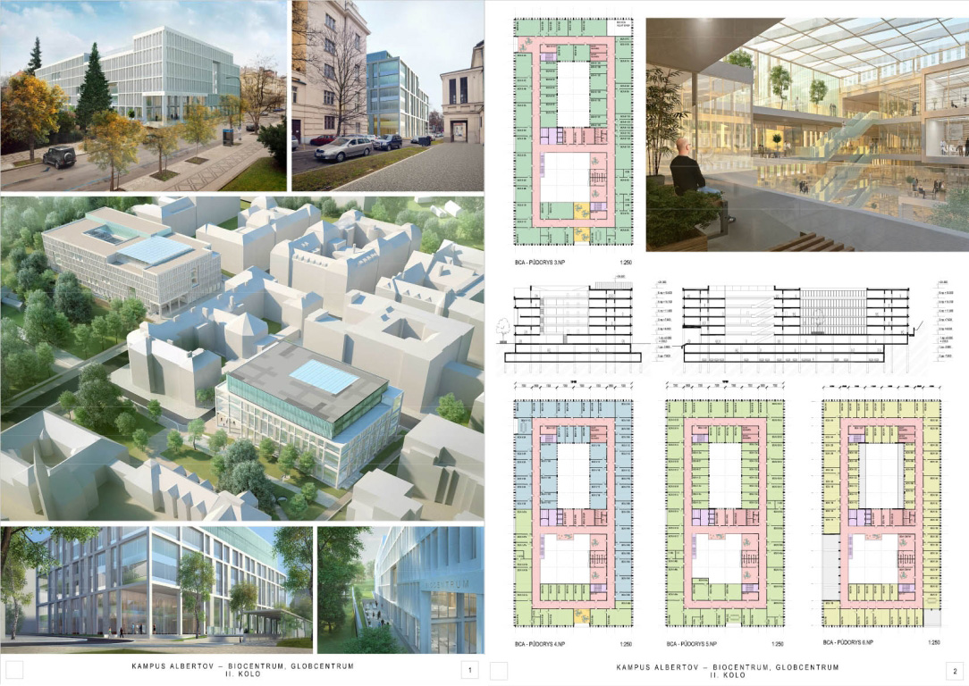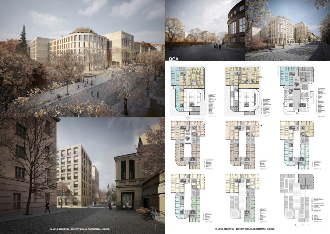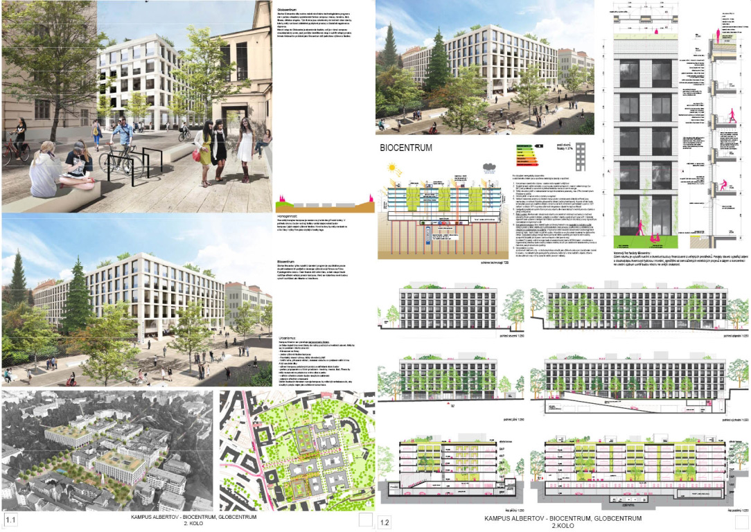 V architektonickej súťaži na návrh kampus Albertov si prvú cenu odnieslo štúdio Znamení čtyř - architekti, druhé miesto získal Ateliér M1 architekti. (Takto farebne sú označené víťazné návrhy aj v nasledujúcej grafickej prezentácii návrhov, ktoré postúpili do druhého kola súťaže). Keďže sa odborná porota rozhodla neudeliť tretiu cenu, na finálnej podobe dvoch budov, ktoré vyrastú na území Prahy budú spolupracovať iba dva spomínané ateliéry.
