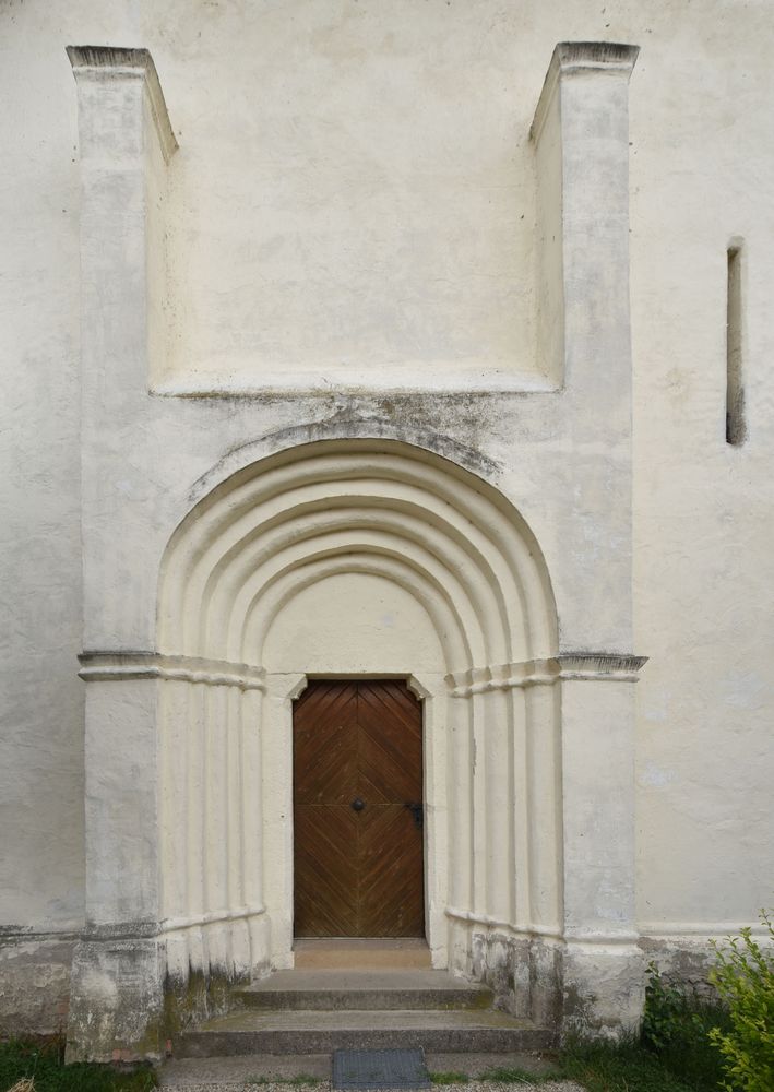 Ústupkový románsky portál je po stranách lemovaný vežičkami s ihlanovitým ukončením, typickým pre viacero kostolíkov na Žitnom ostrove.