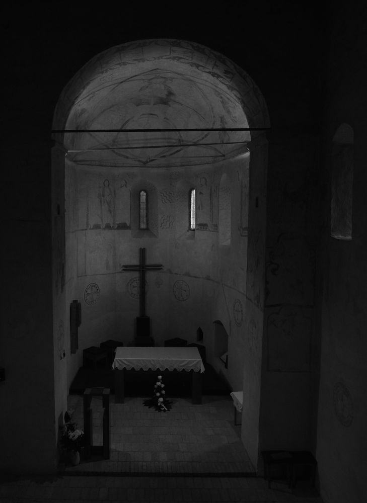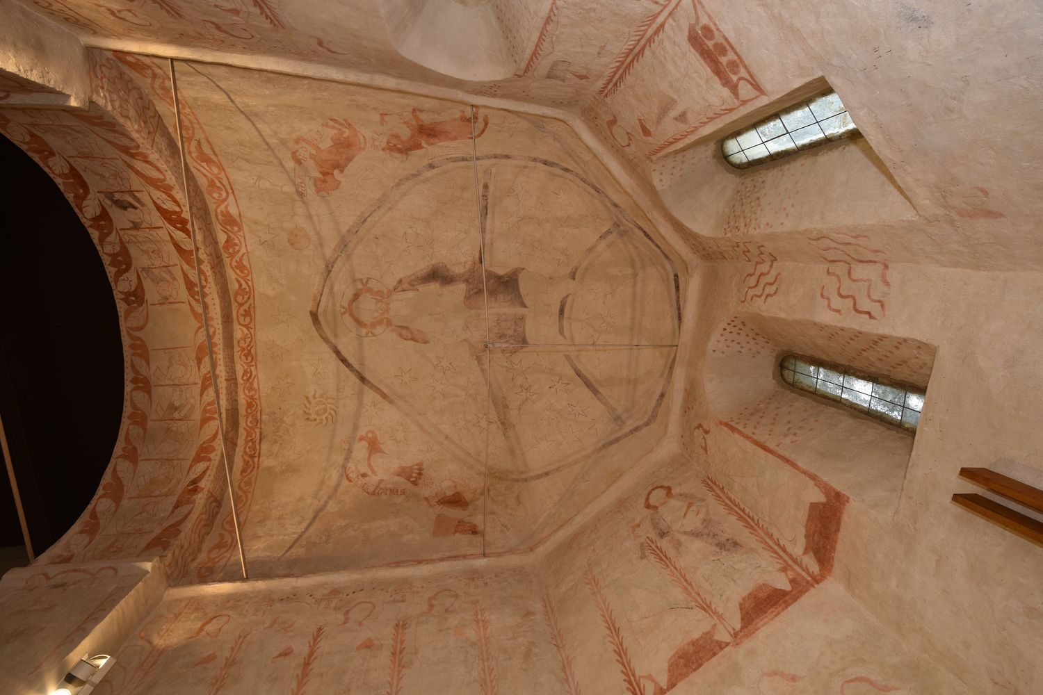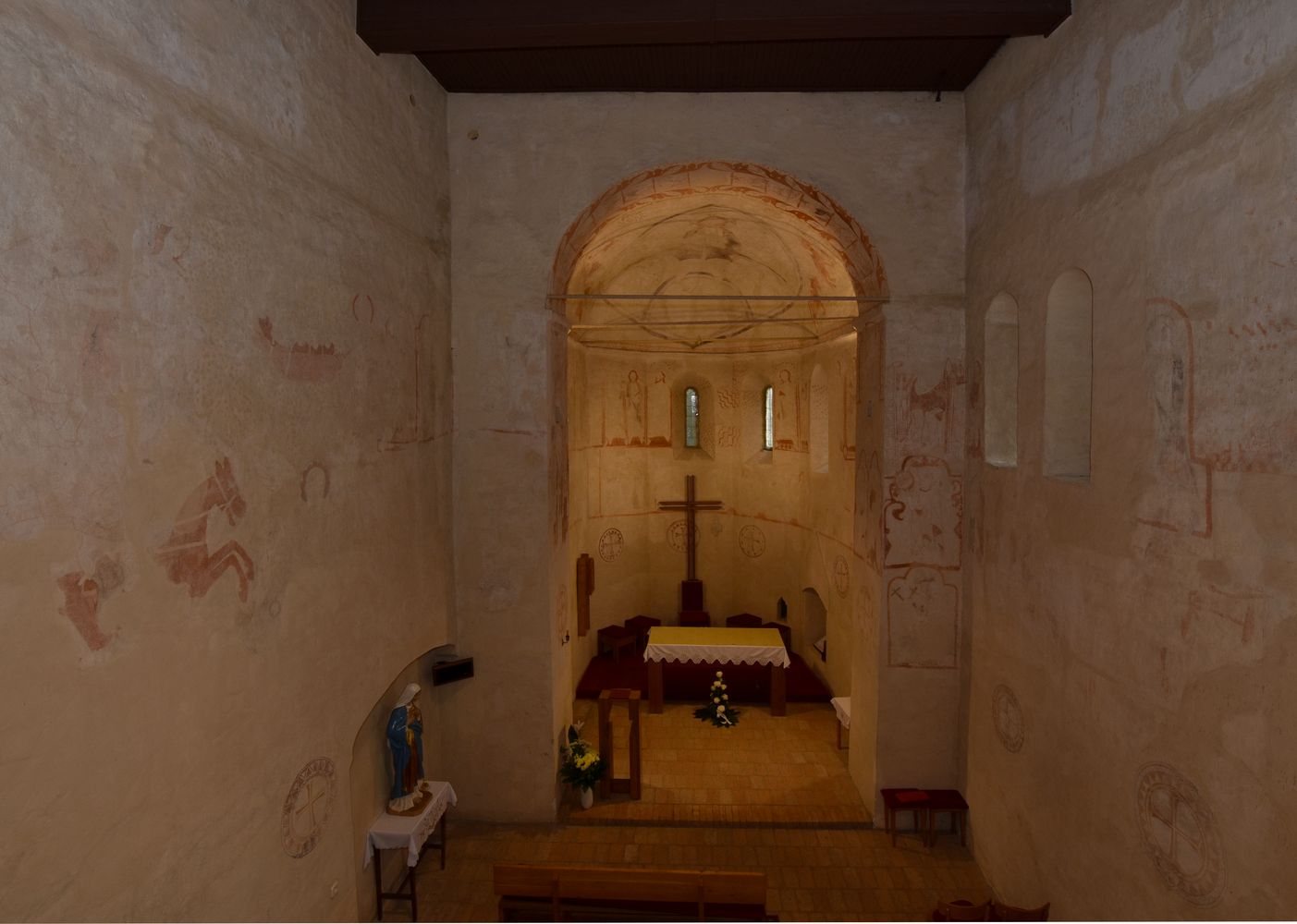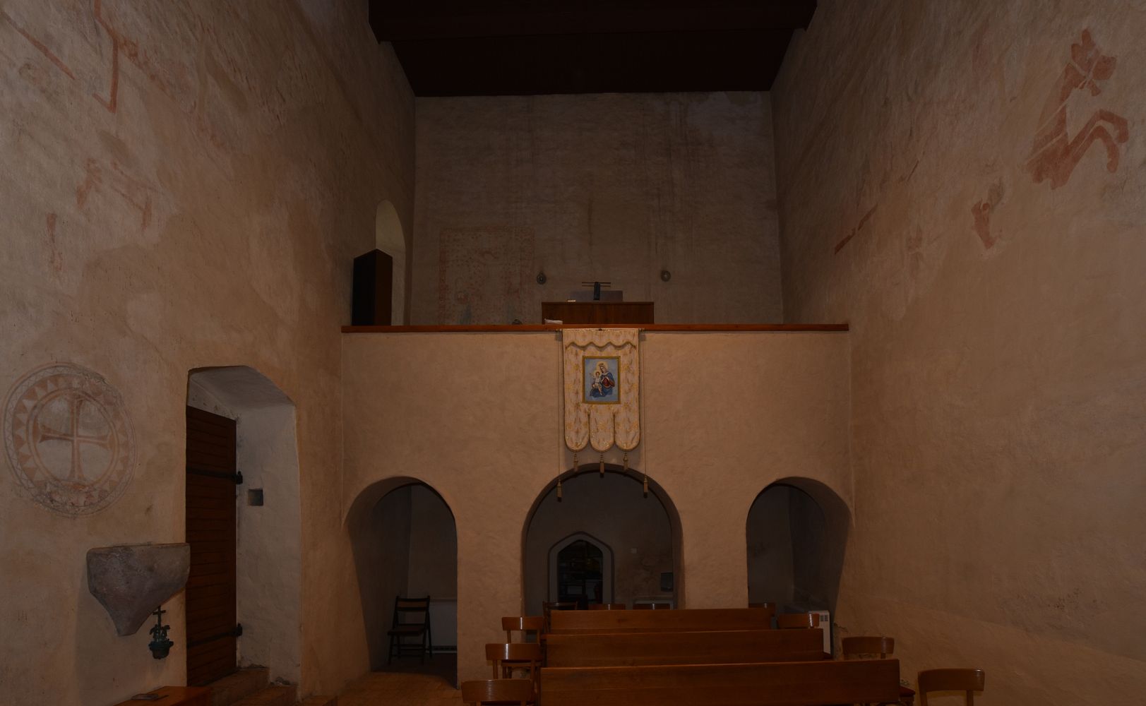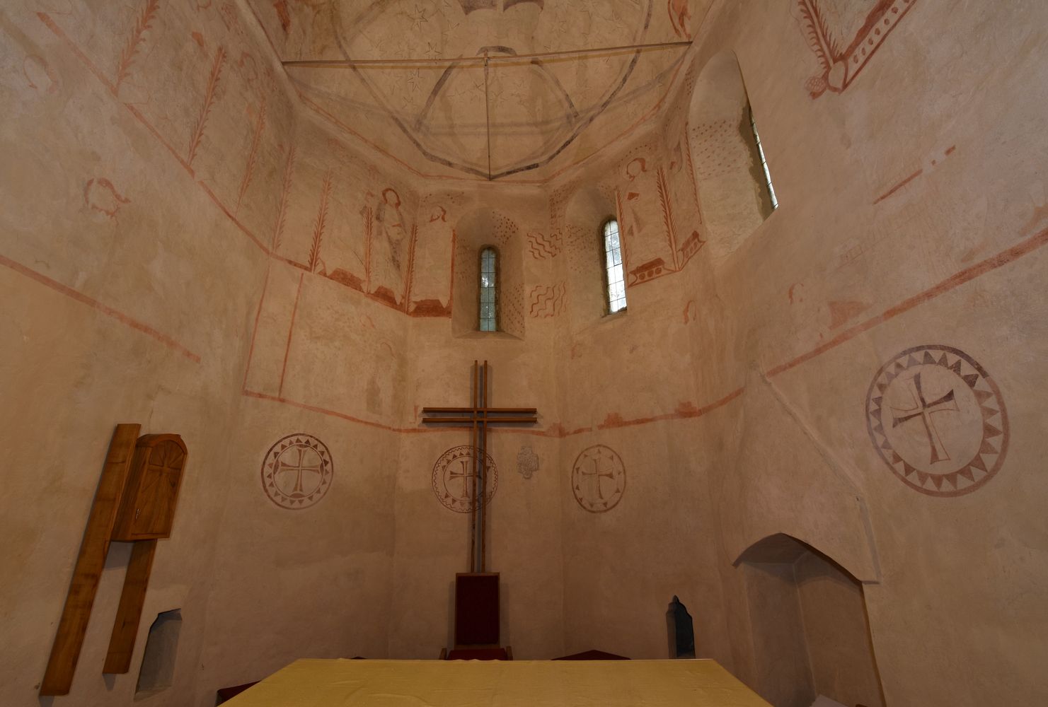 O reprezentatívnosti kostola okrem výzdoby svedčí aj nezvyčajne vysoký priestor lode i svätyne. V interiéri sa zachovali nástenné maľby z konca 13. storočia. Vo svätyni nájdeme zobrazenie Ježiša Krista v mandorle a symbolov evanjelistov na klenbe, v hornej časti stien sa nachádzajú postavy apoštolov aj so zvyškami nápisových pások. V páse pod nimi sa maľby zachovali už len veľmi fragmentárne.
