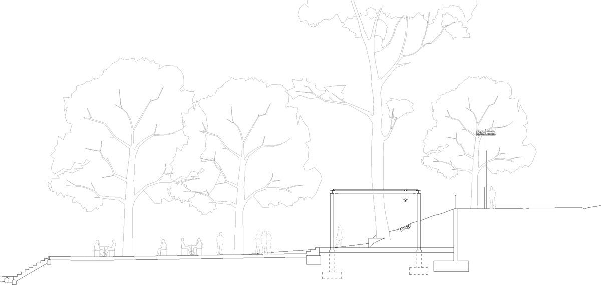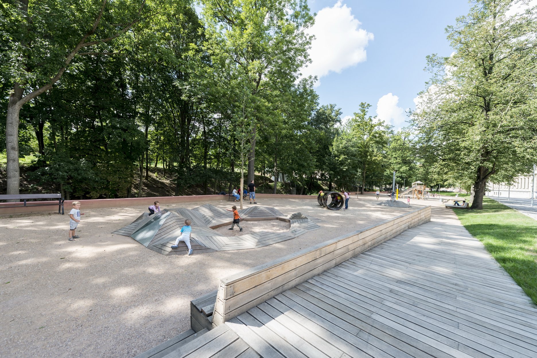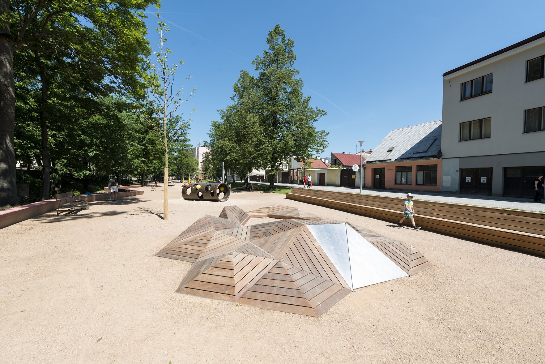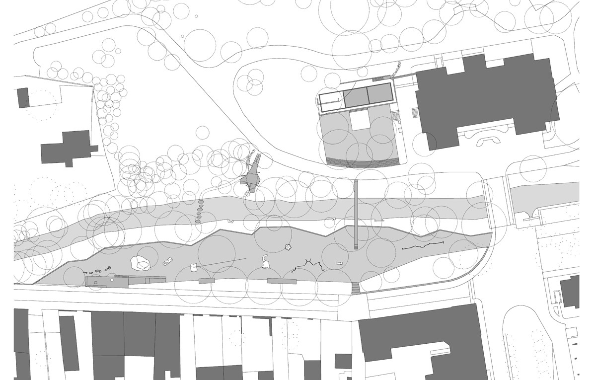 Ťažisko tvorí promenáda na nábreží s originálnym ihriskom pre návštevníkov všetkých vekových kategórií. Sochársky stvárnené ihrisko s hudobnými motívmi od sochárov Pavly Scerankovej a Dušana Zahoranského. “Herní prvky navazují na poválečnou tradici umělecky ztvárněných hřišť v Československu”, vysvetľujú architekti.